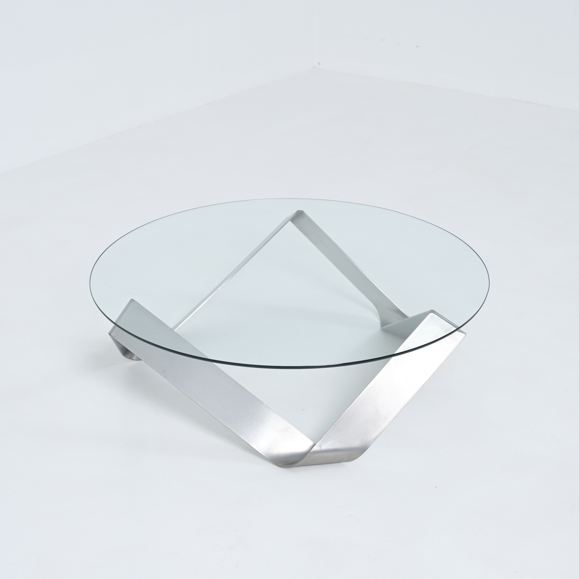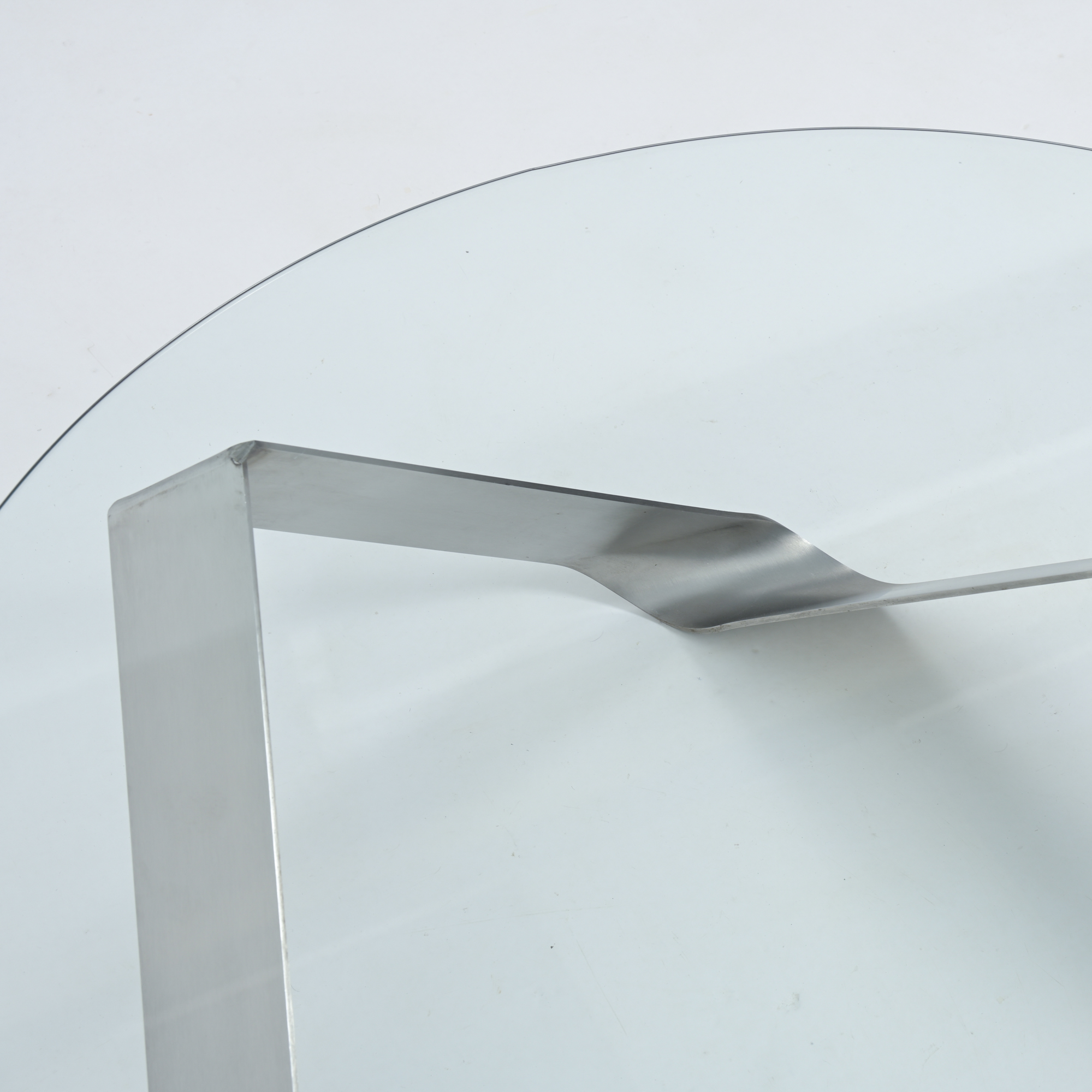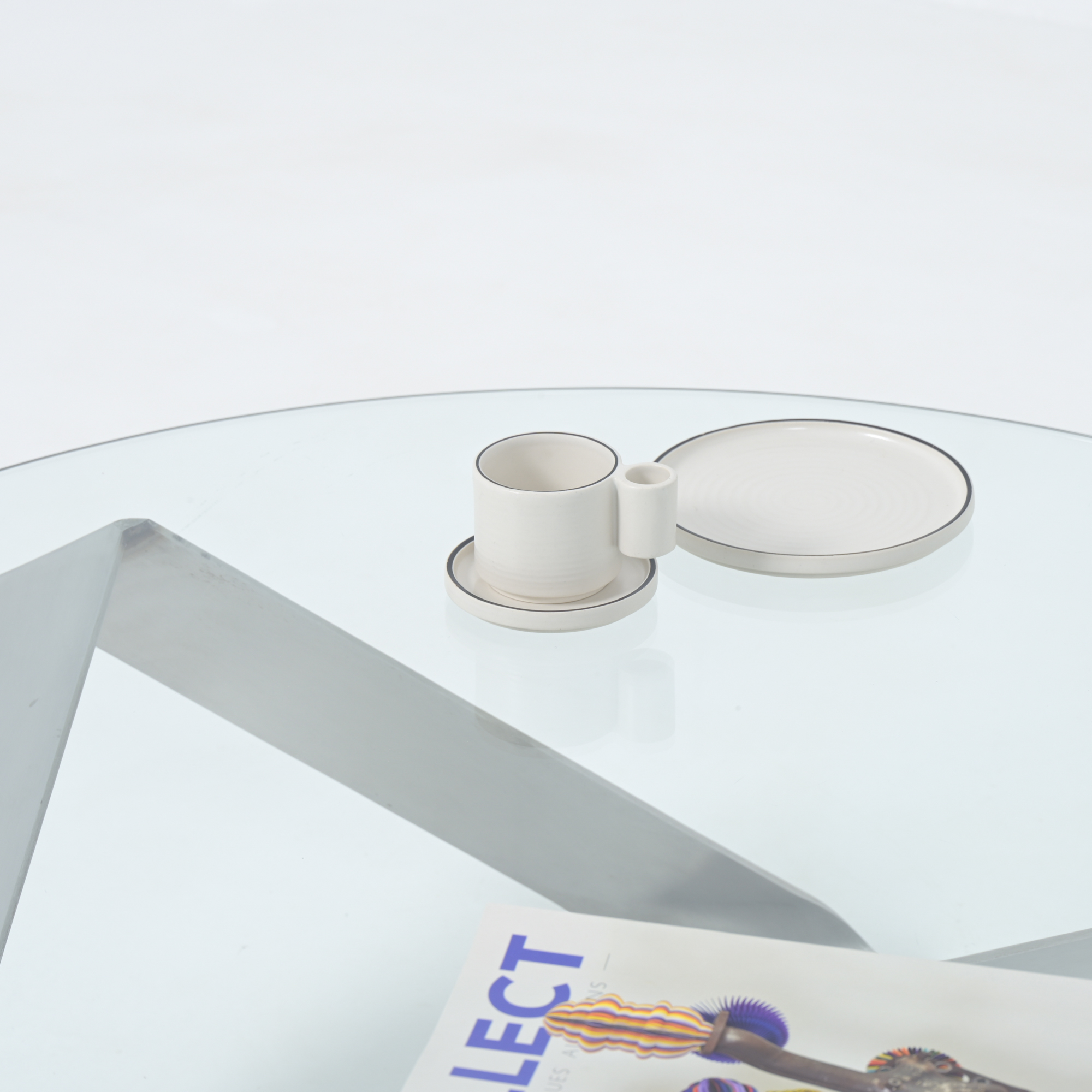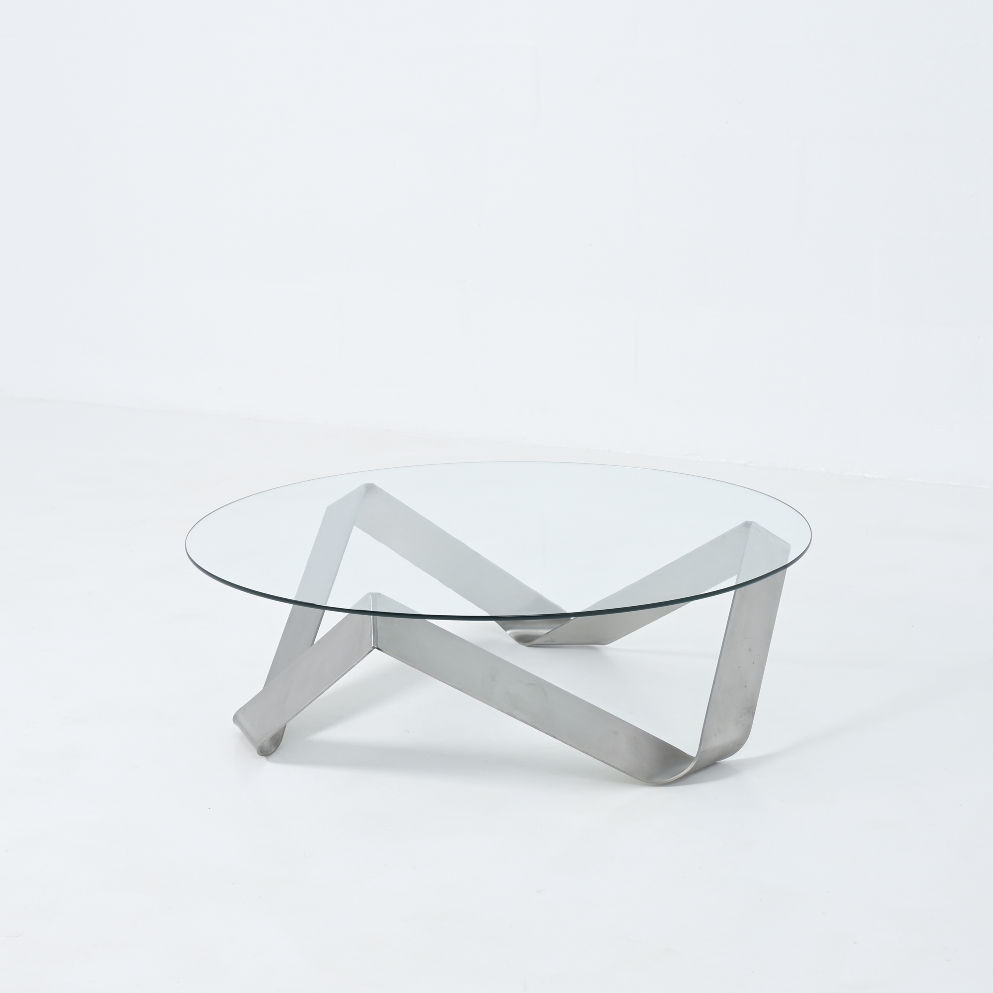 This coffee table has a glass tabletop which is supported by a coherent geometric frame.