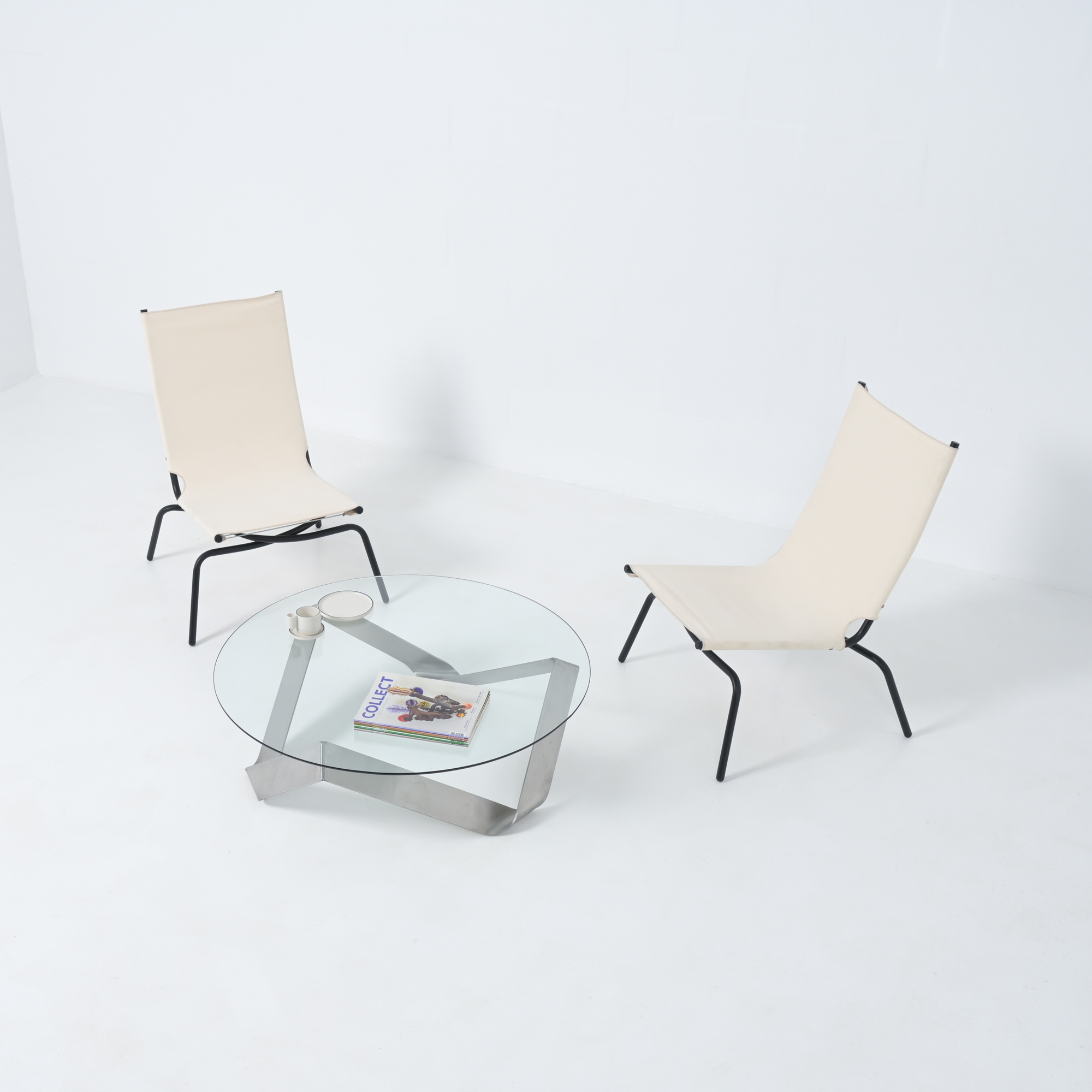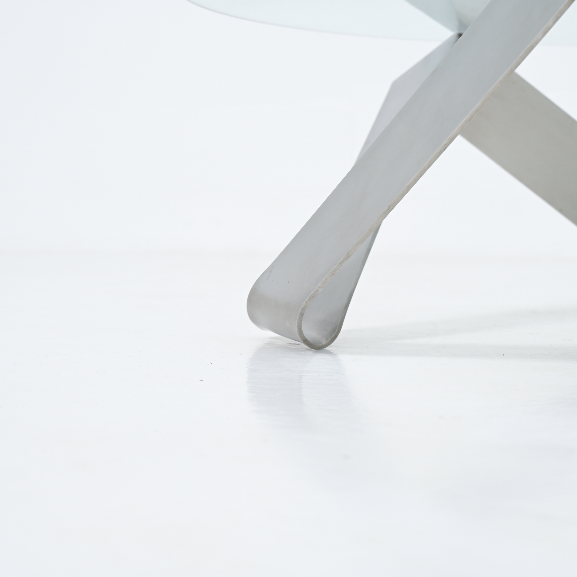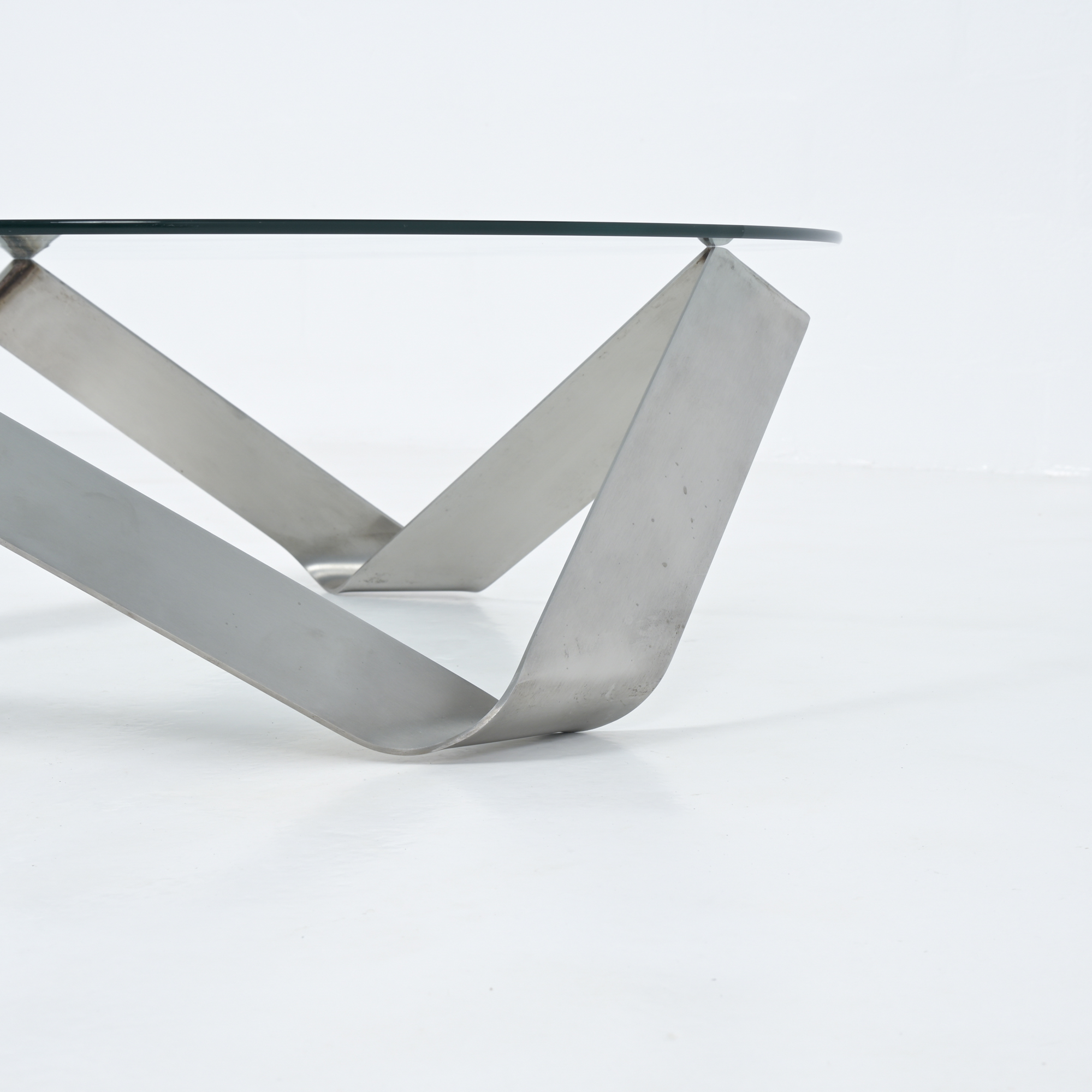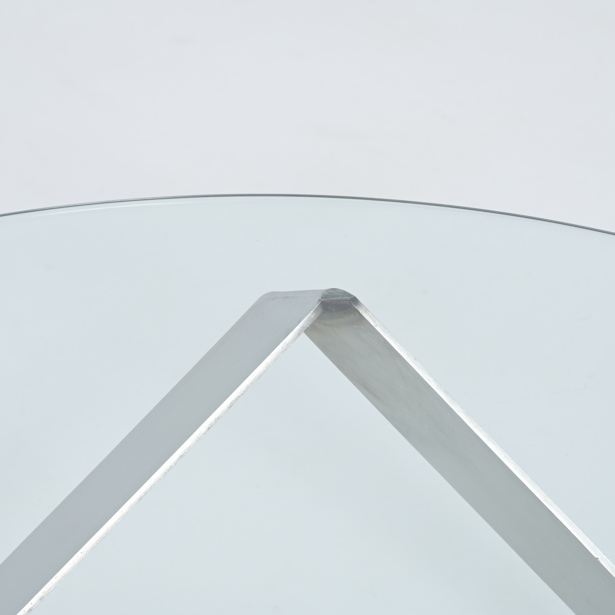 This coffee table has a glass tabletop which is supported by a coherent geometric frame.