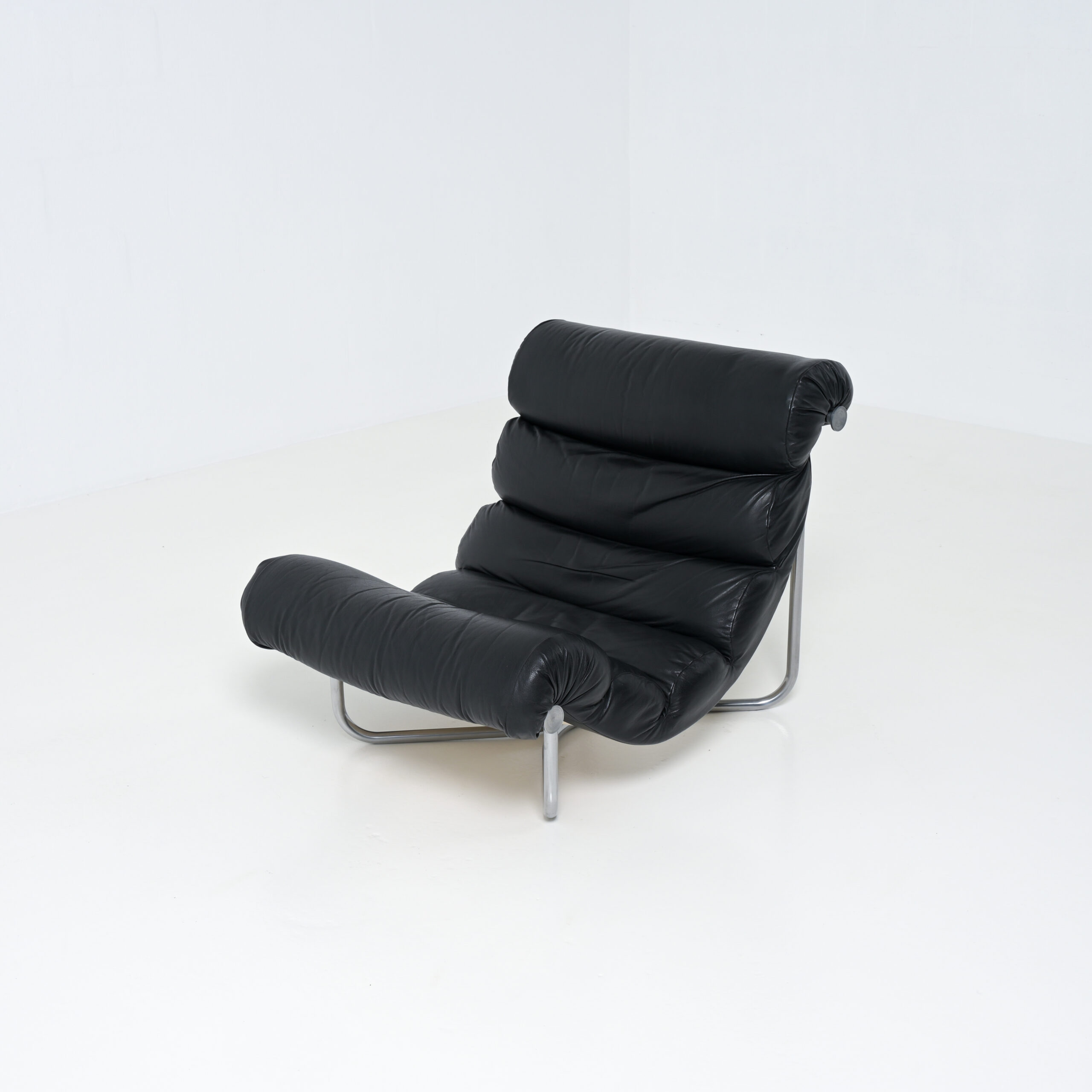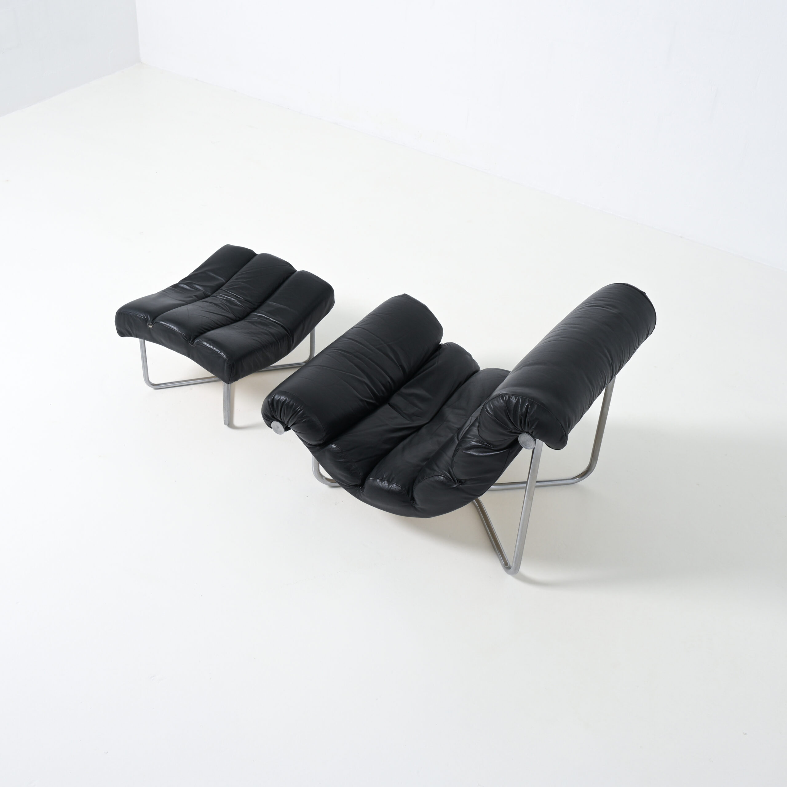 This chair is design by the Belgium designer George Van Rijck and made by Beaufort. It comes with it hard to find ottoman. The leather of the ottoman has some damage(see detailed pictures), the chair is in perfect condition. It is a marvelous looking lounge chair.
