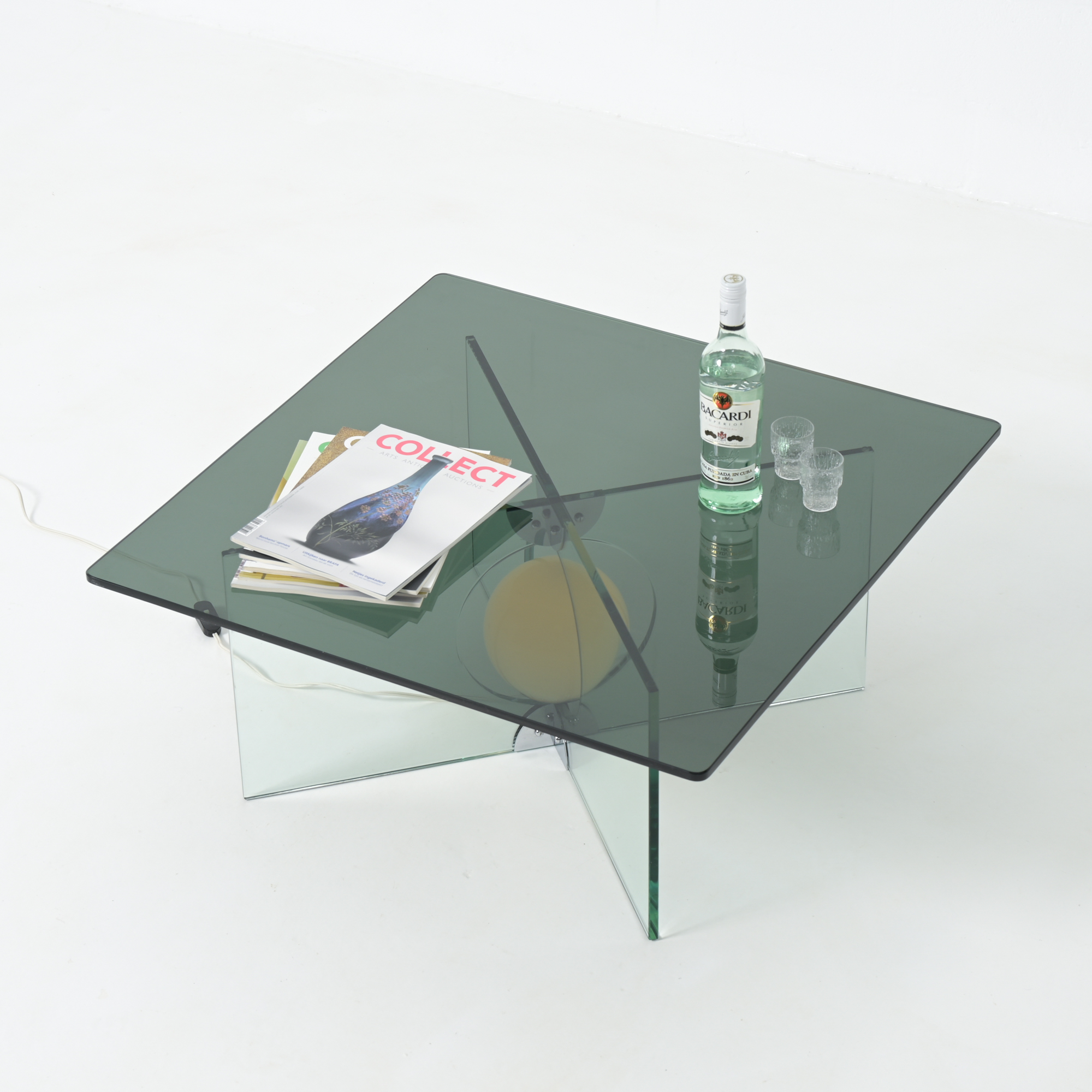 This glass coffee table was designed by Giorgio Reggiori for Gallotti & Radice. We date this piece back to the 1970s.