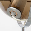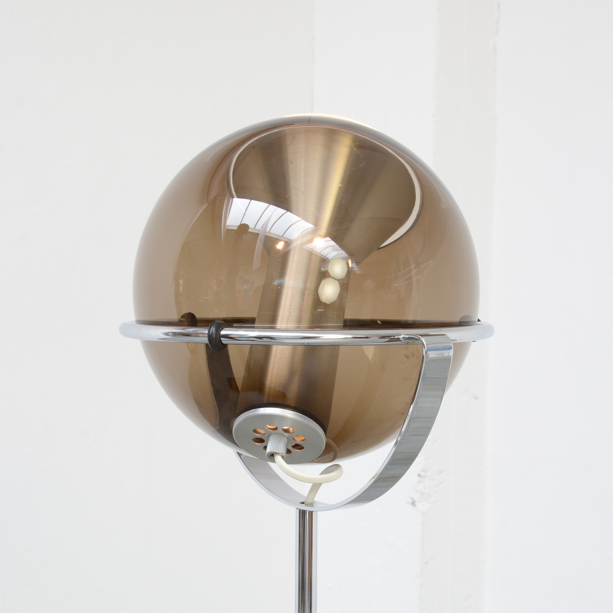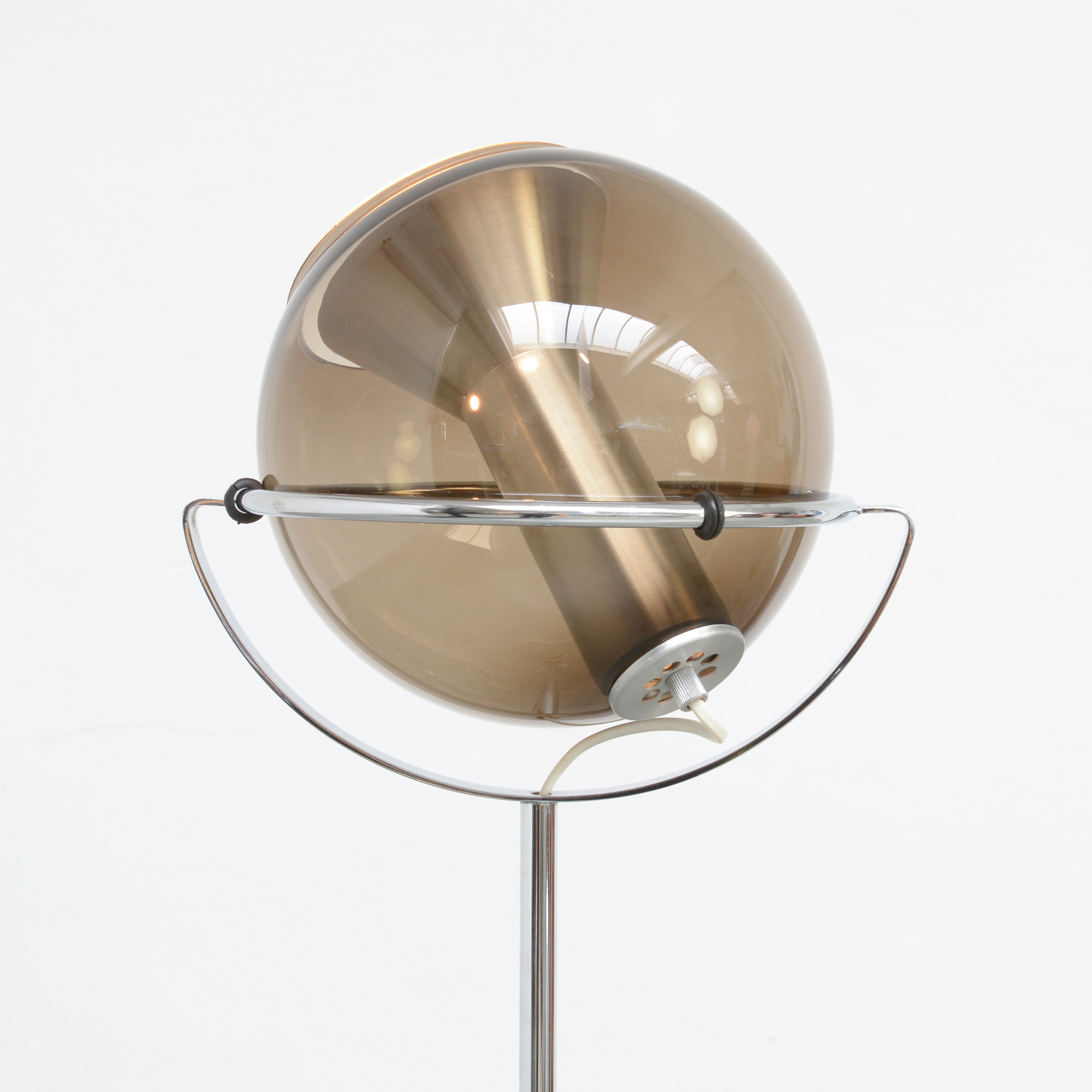 The Globe floor lamp was designed by Frank Ligtelijn for Raak in the early 1960s. The smoked glass globe with aluminum reflector rests on a chrome ring so you can turn it around. The chrome stem is adjustable in height form 120 to 165 cm. The metal base is black lacquered and finished with aluminum details. This iconic floor lamp is in very good condition, it is cleaned and checked, so ready for use.