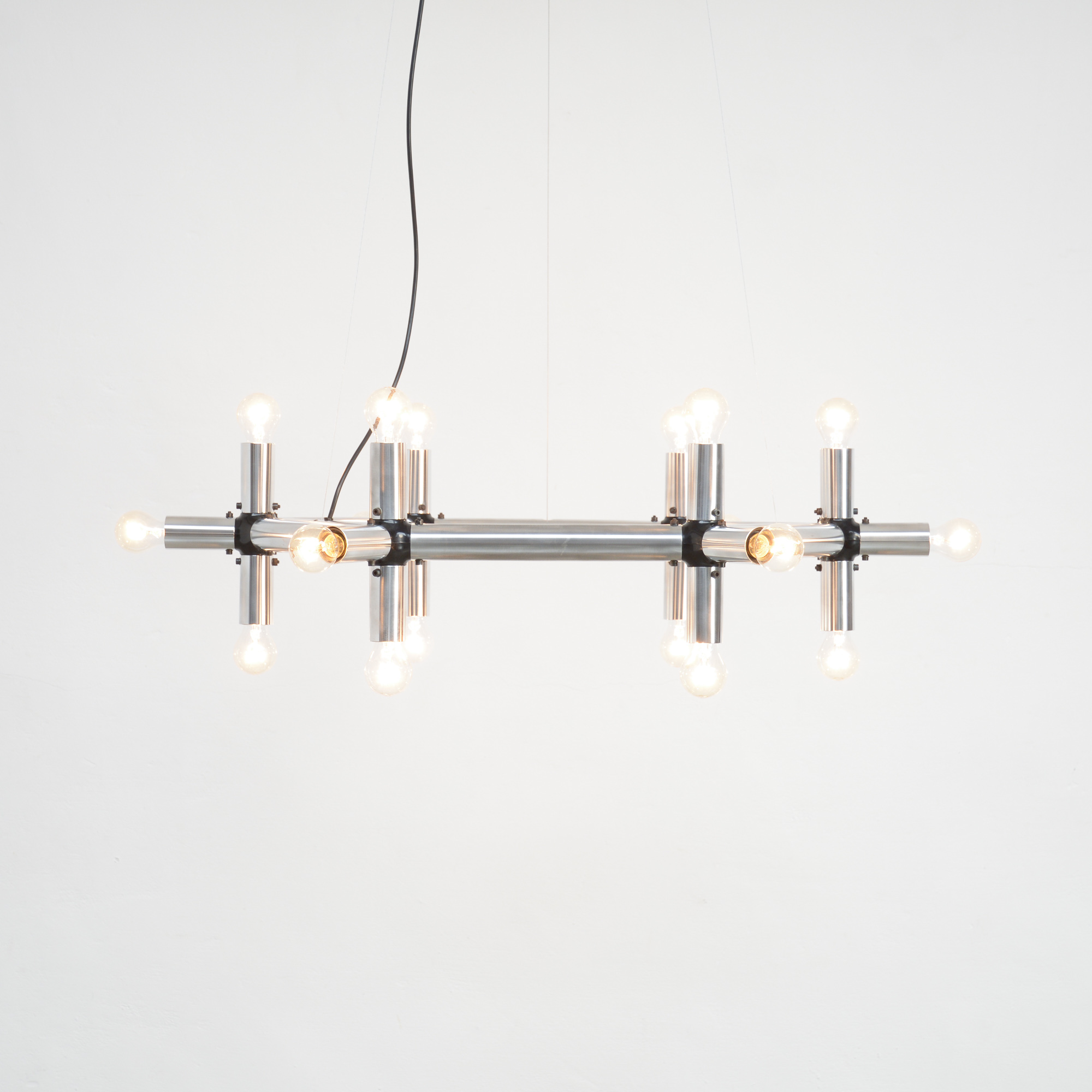 This sculptural light structure is made of anodized aluminum tubes connected with black plastic nodes. It needs 18 light bulbs of 15/20 Watt.