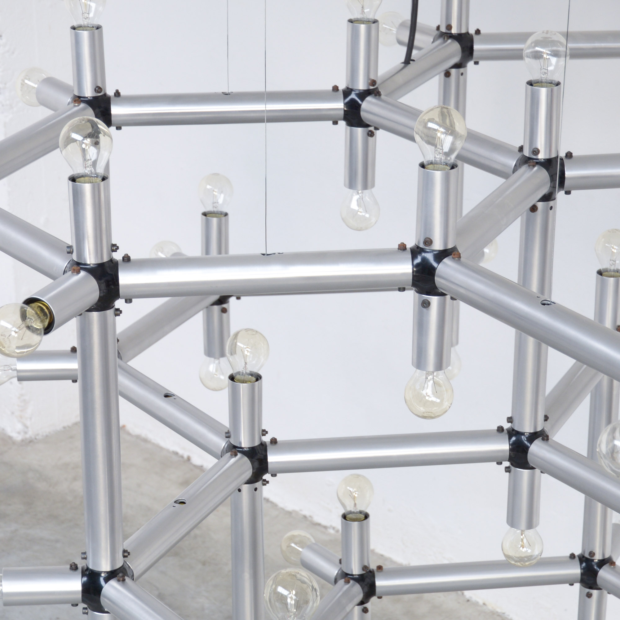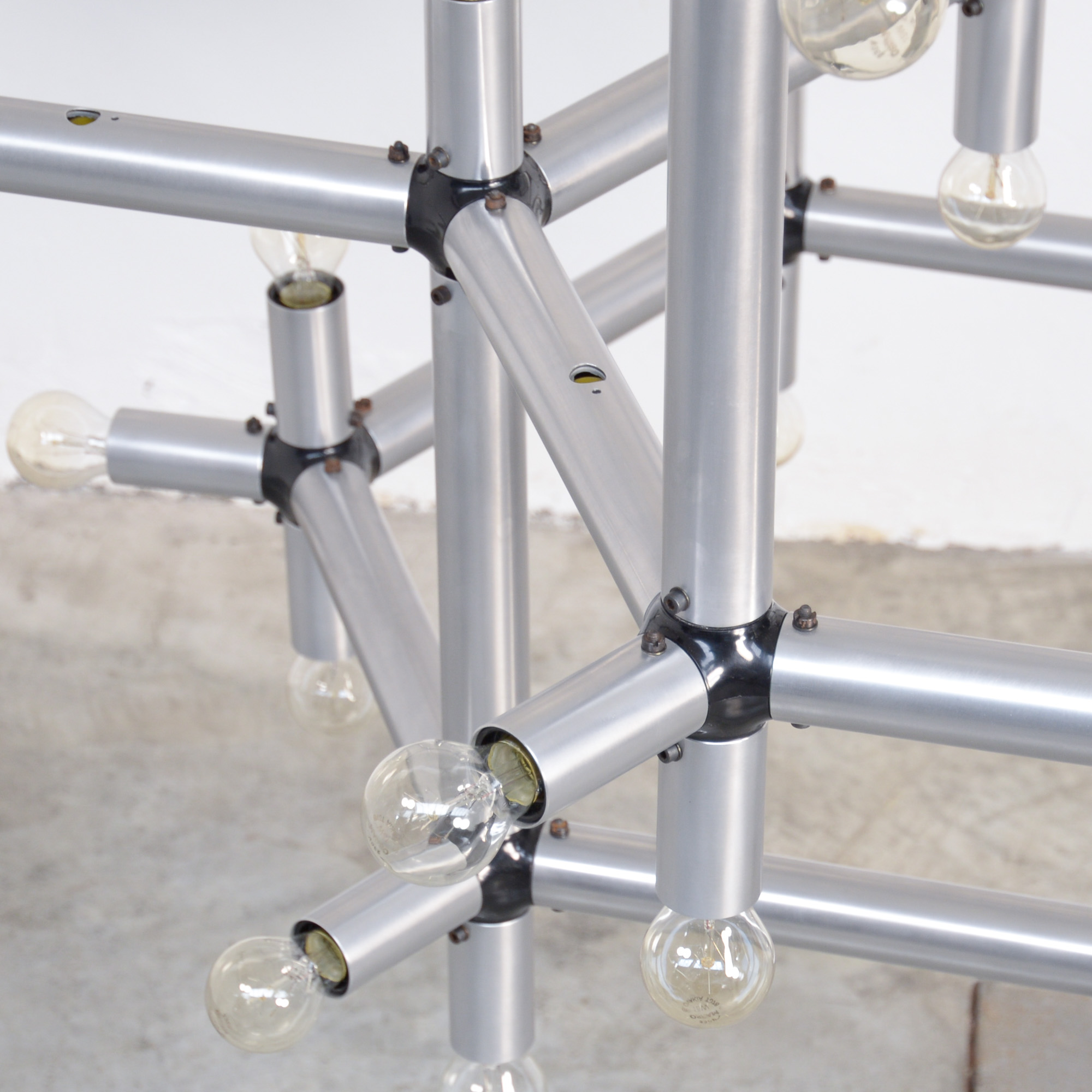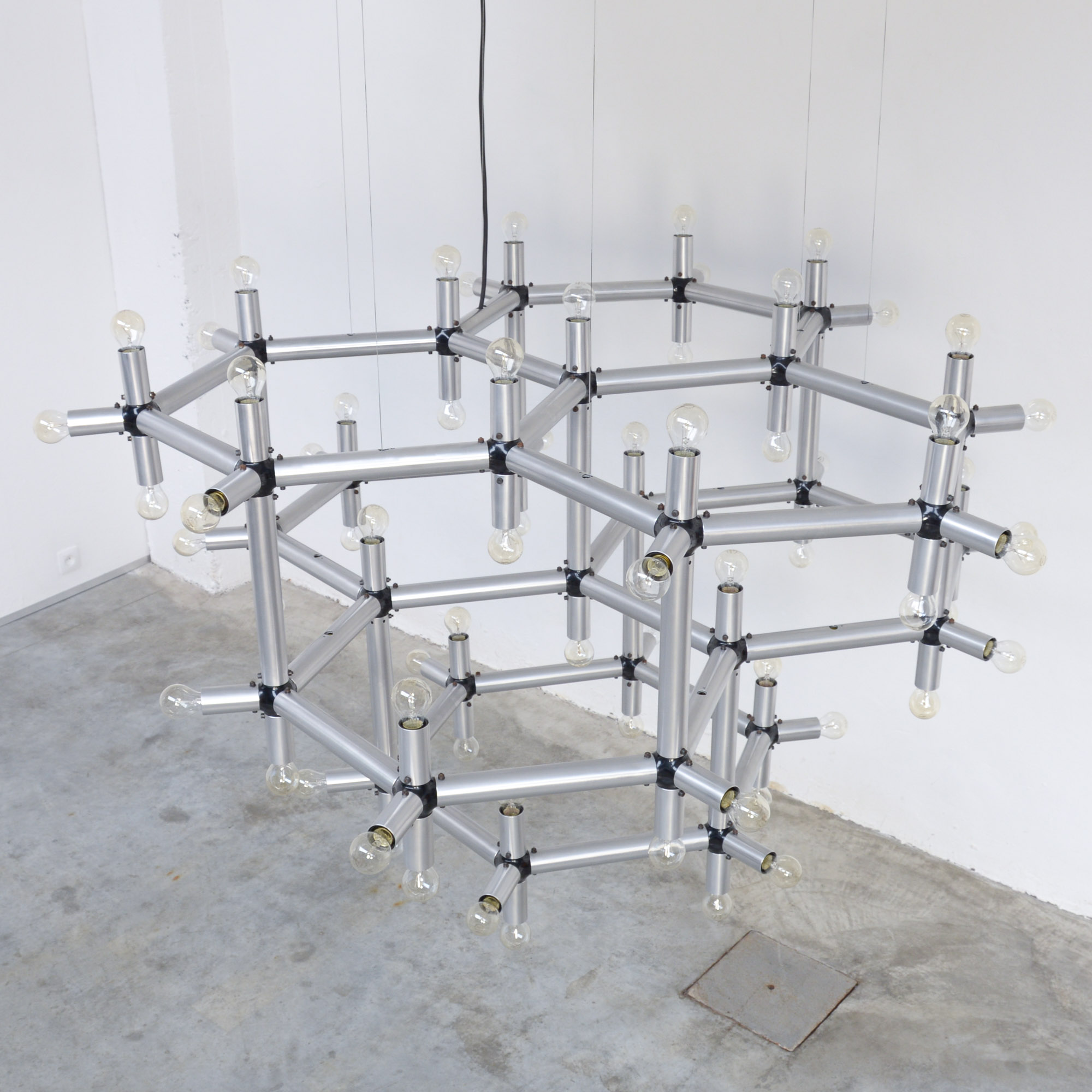 This sculptural light structure is made of anodized aluminum tubes connected with black plastic nodes. It is an impressive piece with 7 hexagons.