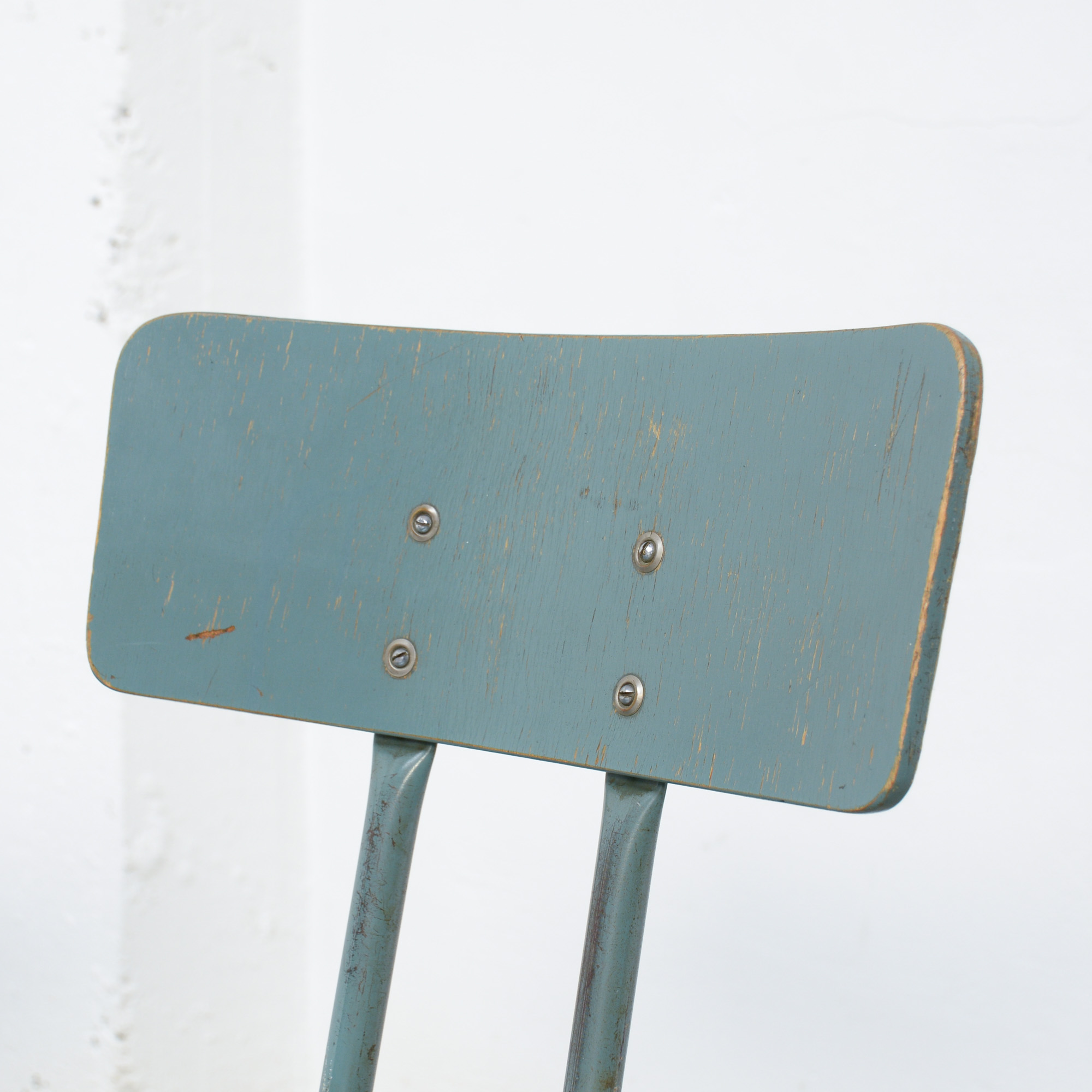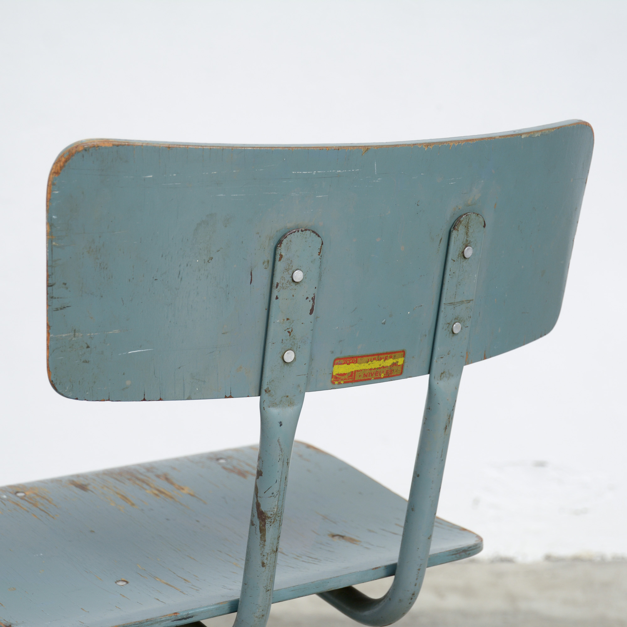 They have a bluish grey lacquered metal base and a modulated wooden seat and back, lacquered in the same bluish grey color.