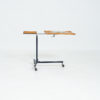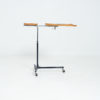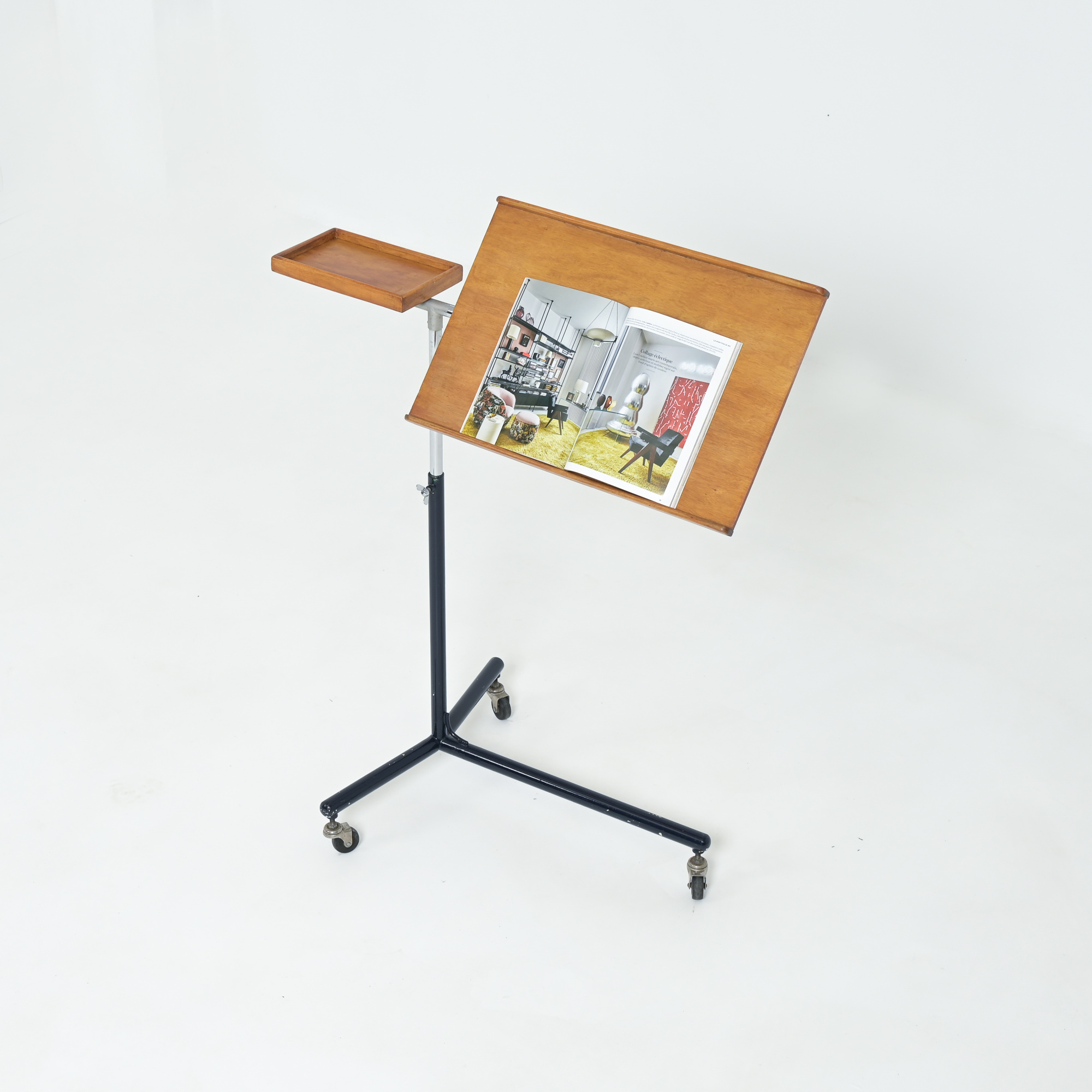 The cast iron base is blue re-lacquered by the previous owner. The wooden table top is authentic with a nice patine, it is adjustable.