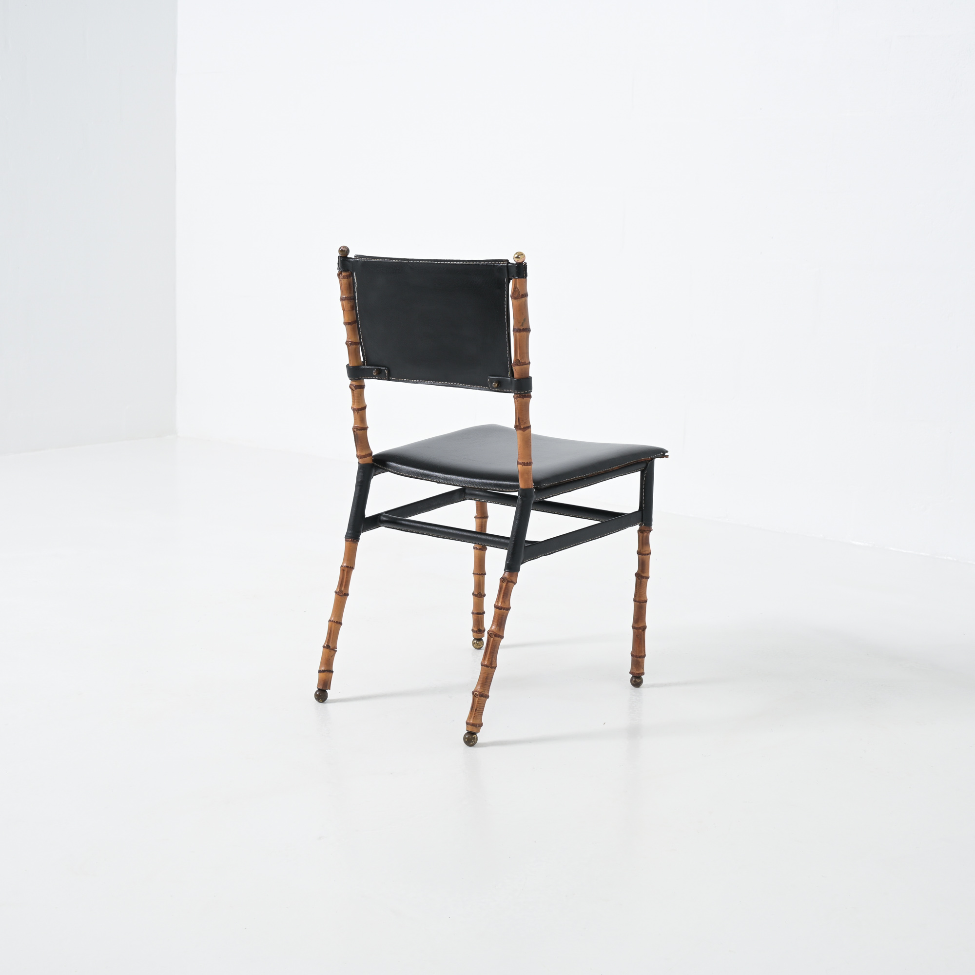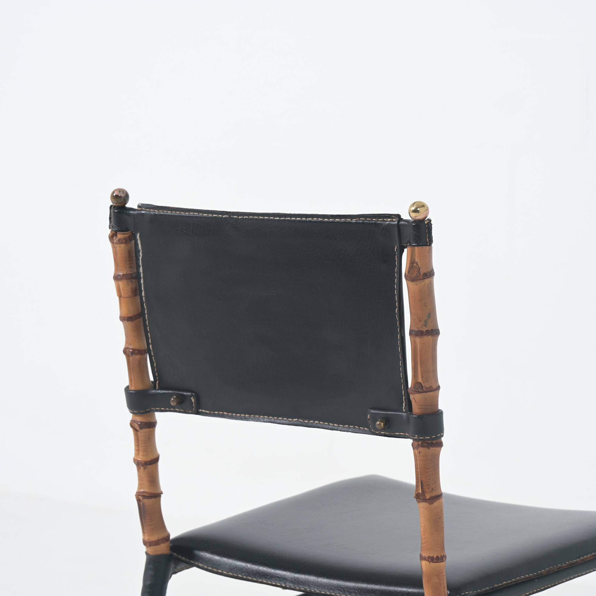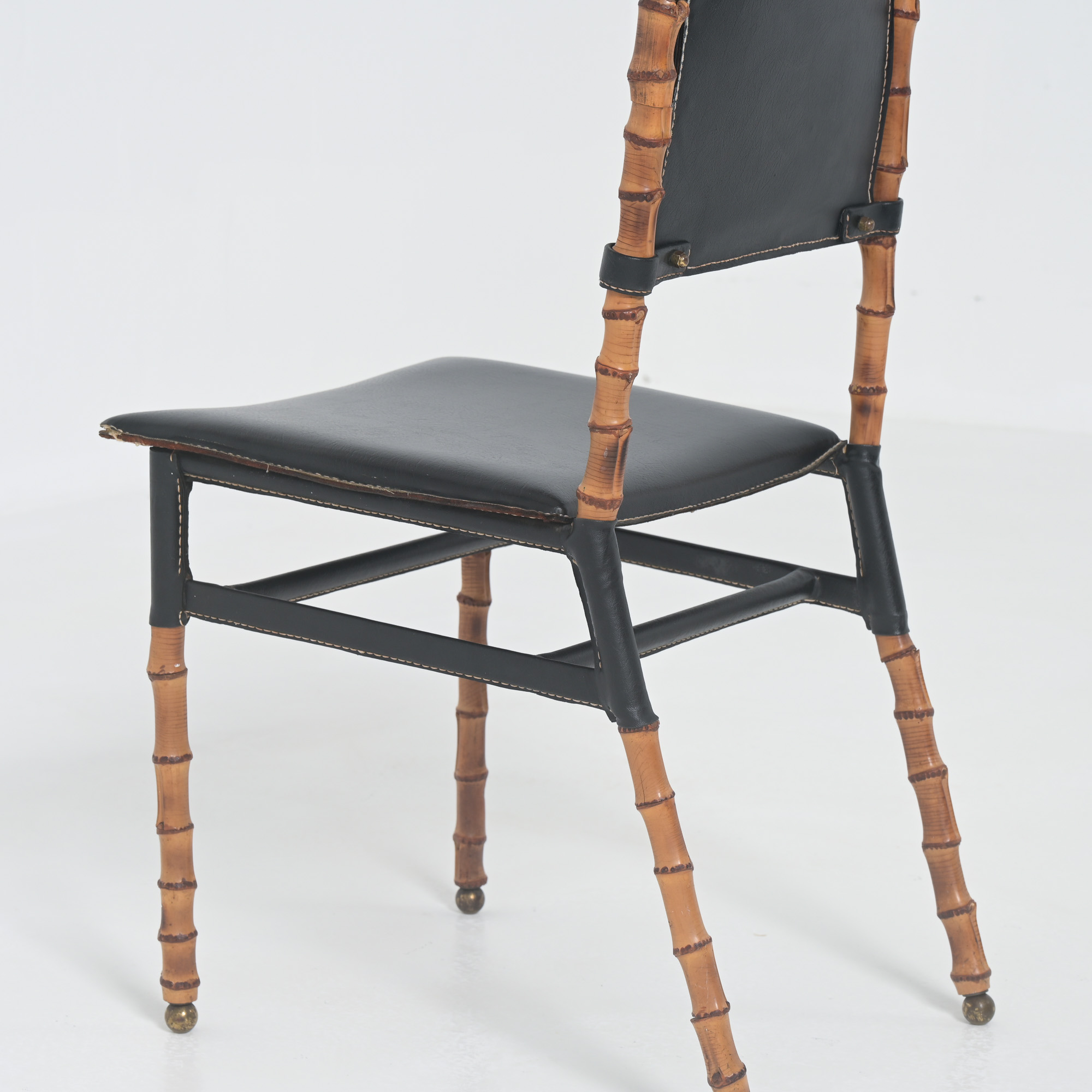 This very rare chair was designed by Jacques Adnet. The chair has a metal frame over which the bamboo poles are slid. The bamboo only has a decorative function. The leatherette of the seat has worn through at the corners. The filling of the seat is still good, the filling of the back has become hard. We offer this chair as it is and it is up to the new owner to decide whether the upholstery needs to be reupholstered or not. We can help you with this. The chair seems very light and fragile, but in reality it is very heavy and solid.