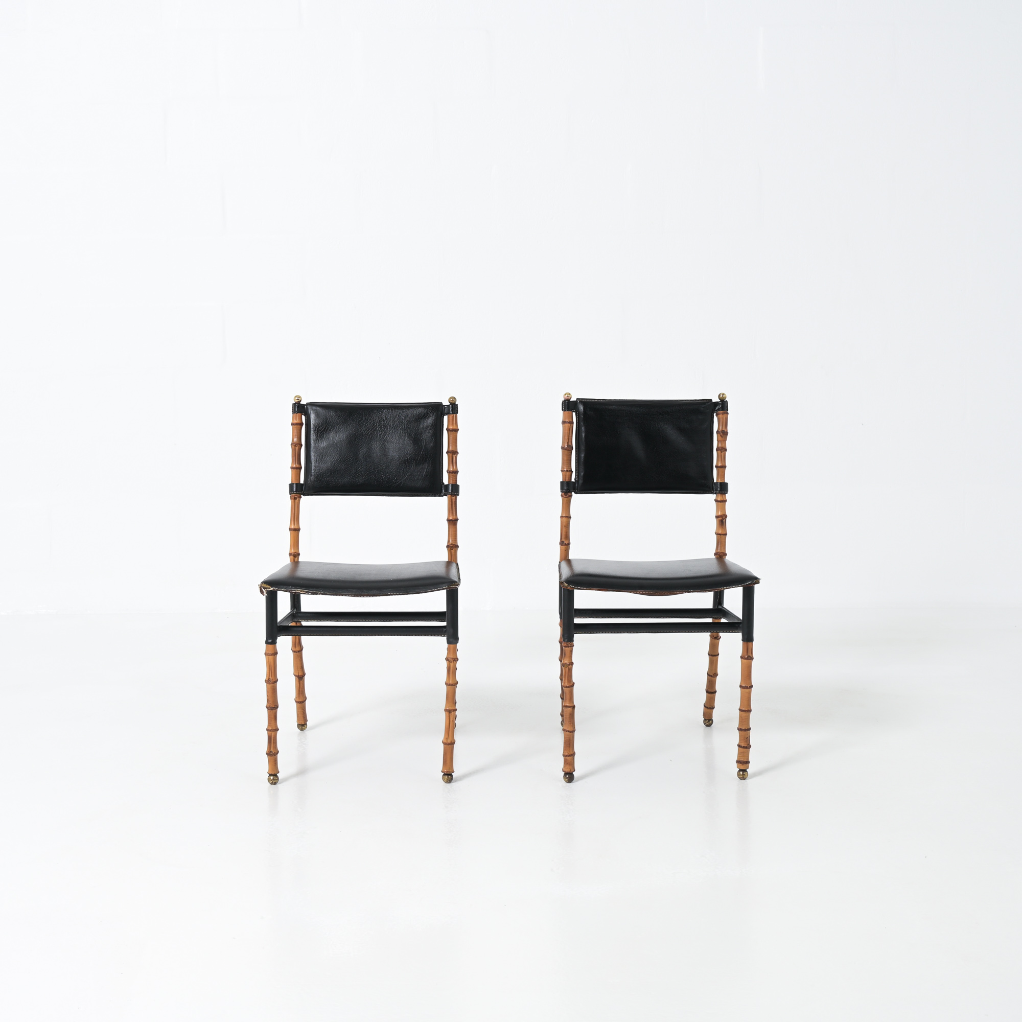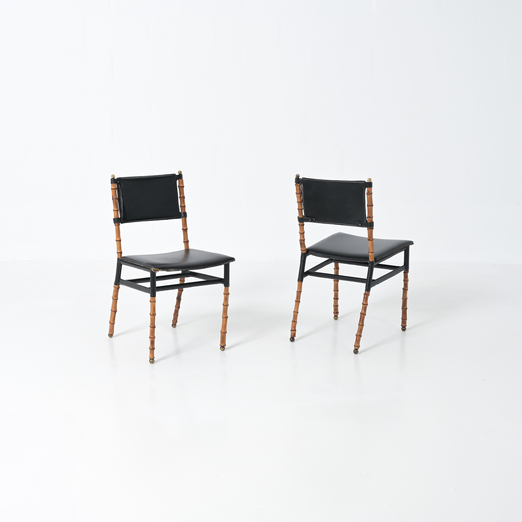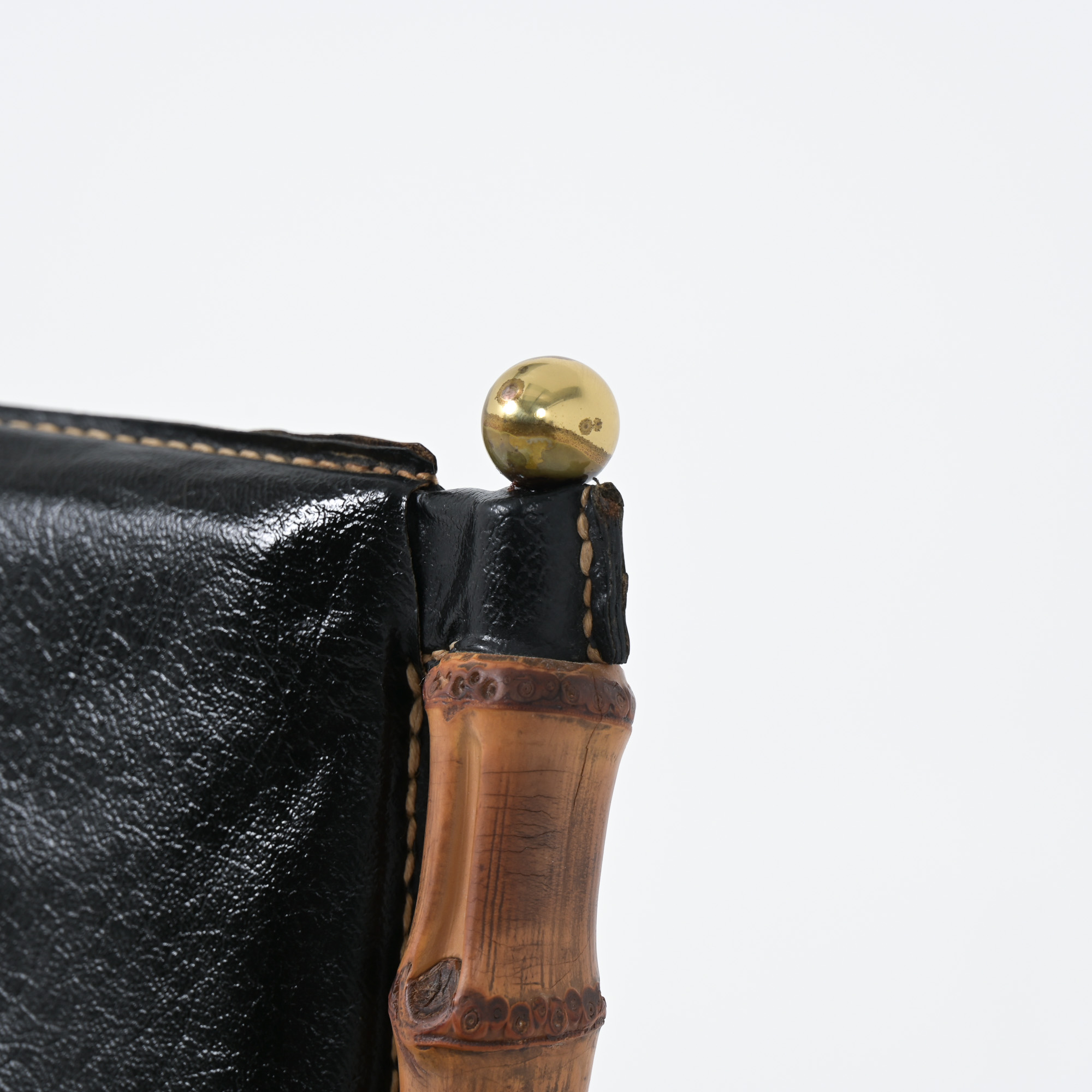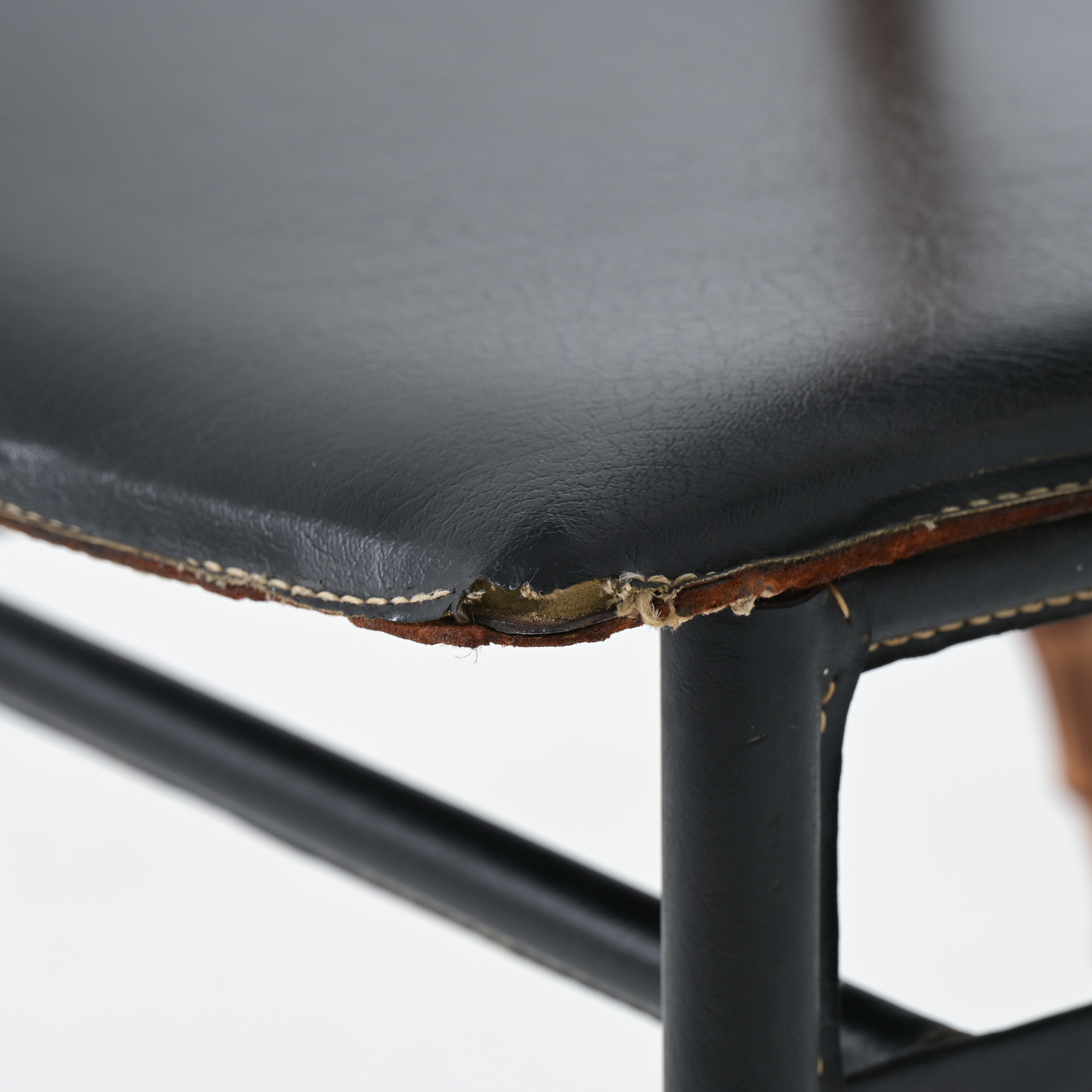 This very rare chair was designed by Jacques Adnet. The chair has a metal frame over which the bamboo poles are slid. The bamboo only has a decorative function. The leatherette of the seat has worn through at the corners. The filling of the seat is still good, the filling of the back has become hard. We offer this chair as it is and it is up to the new owner to decide whether the upholstery needs to be reupholstered or not. We can help you with this. The chair seems very light and fragile, but in reality it is very heavy and solid.