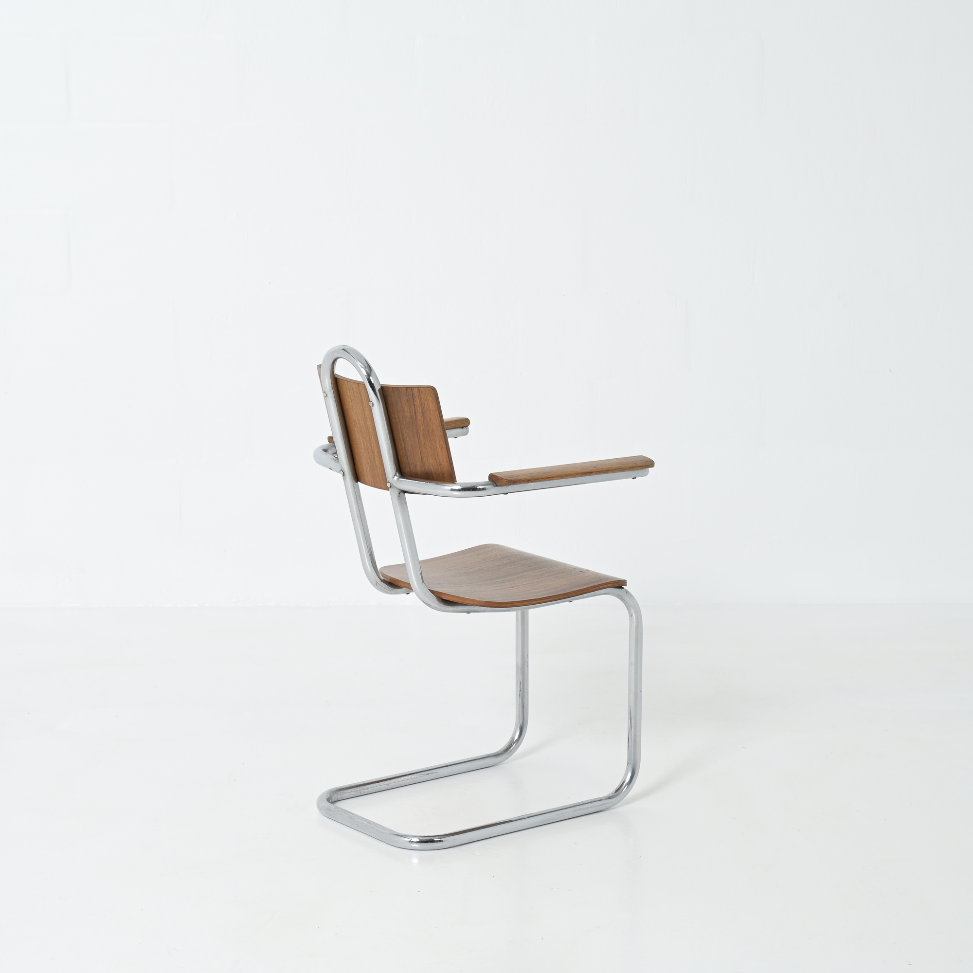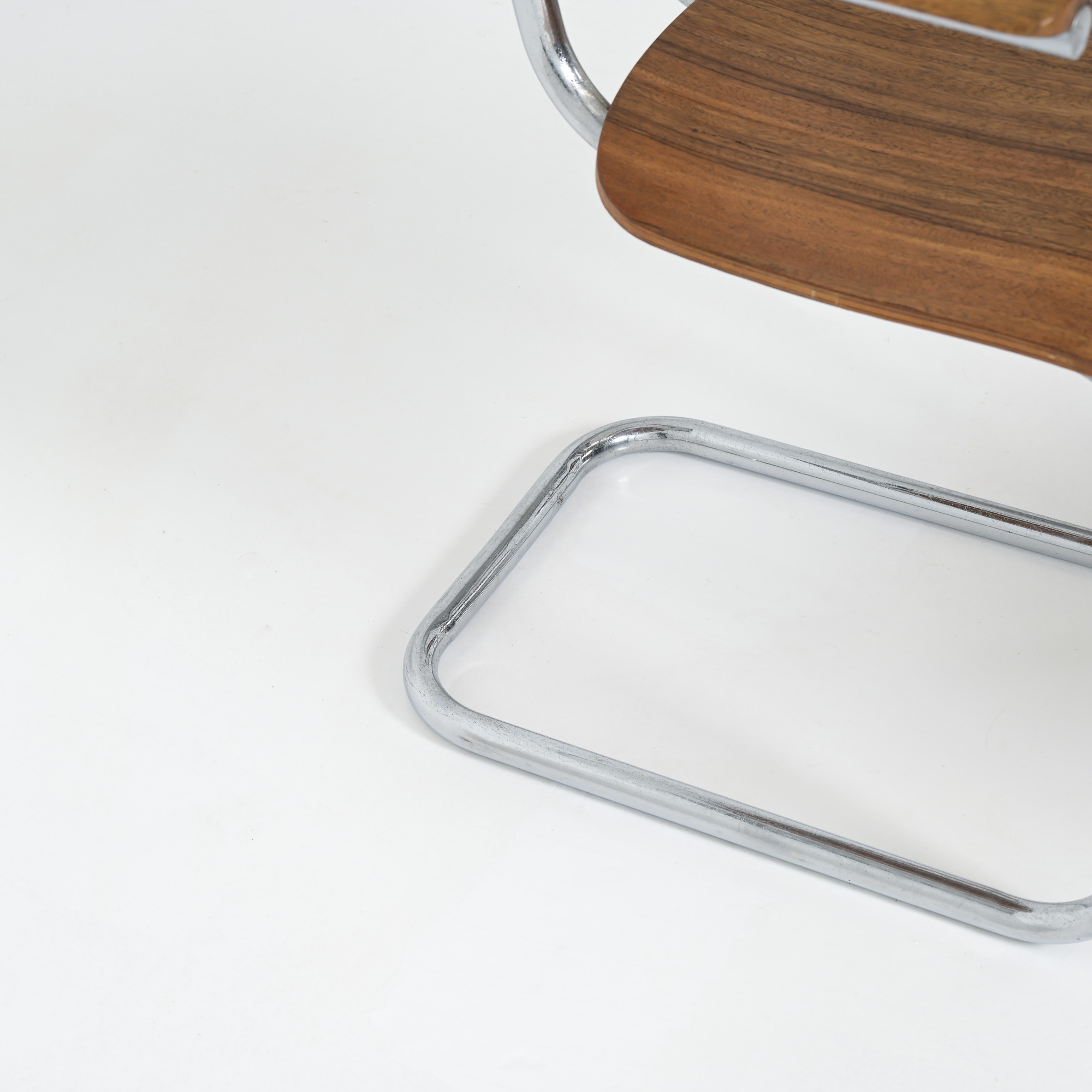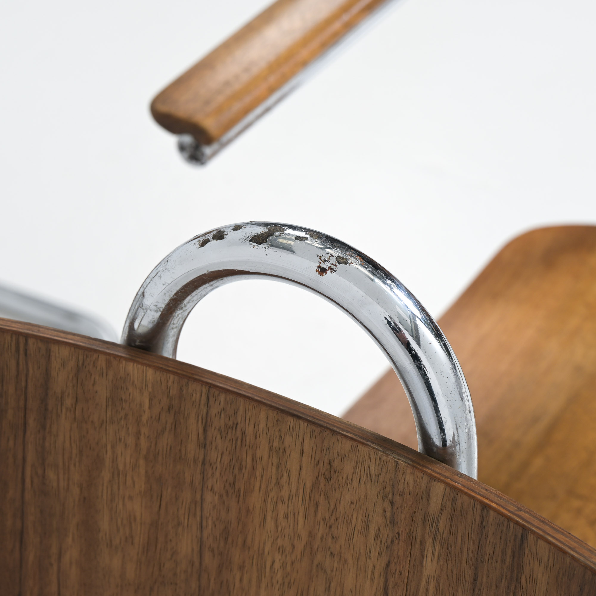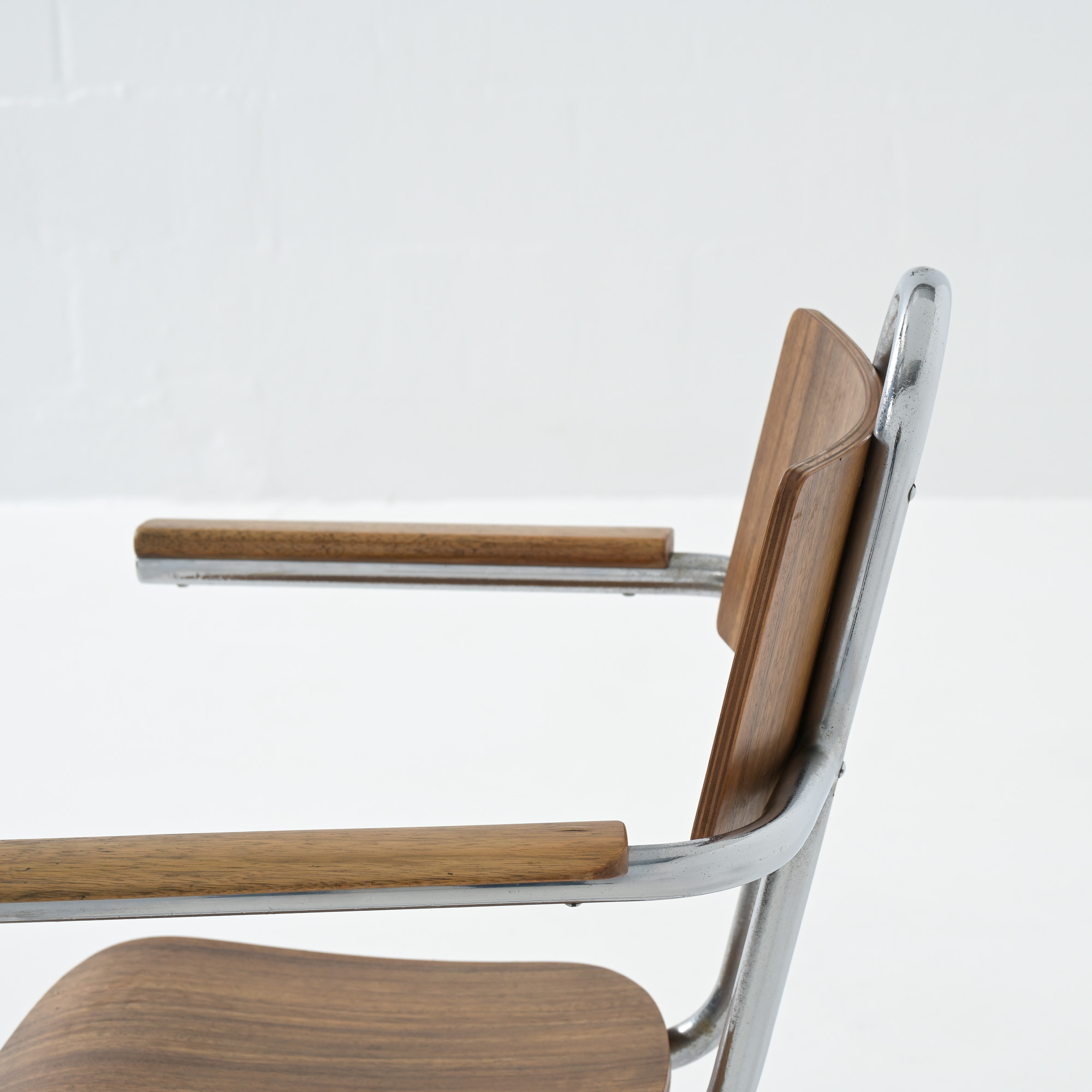 This chair is a great example of craftsmanship: the nice detailed chrome tubular metal base with special screws, the plywood seat and back rest, the armrests finished with solid wood.