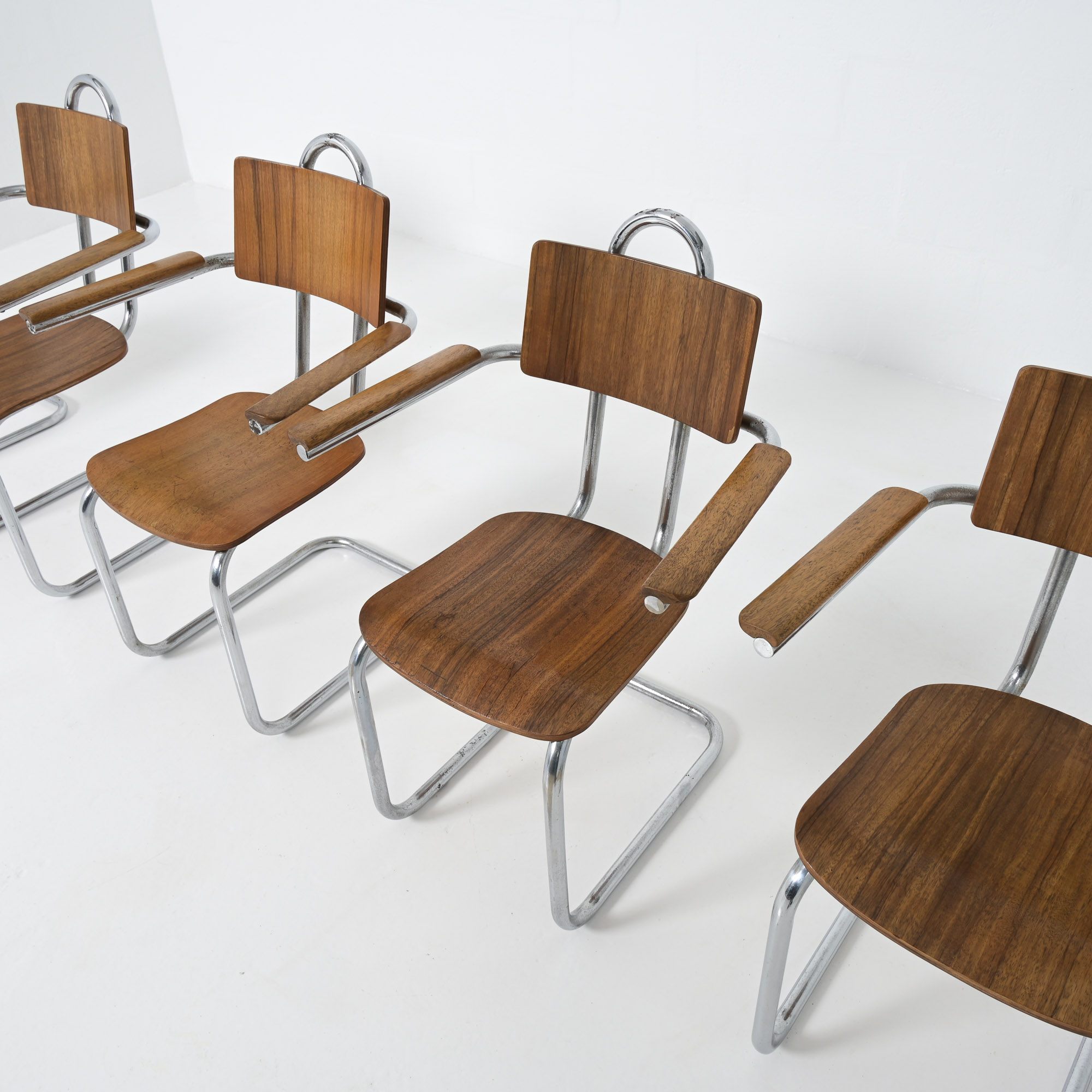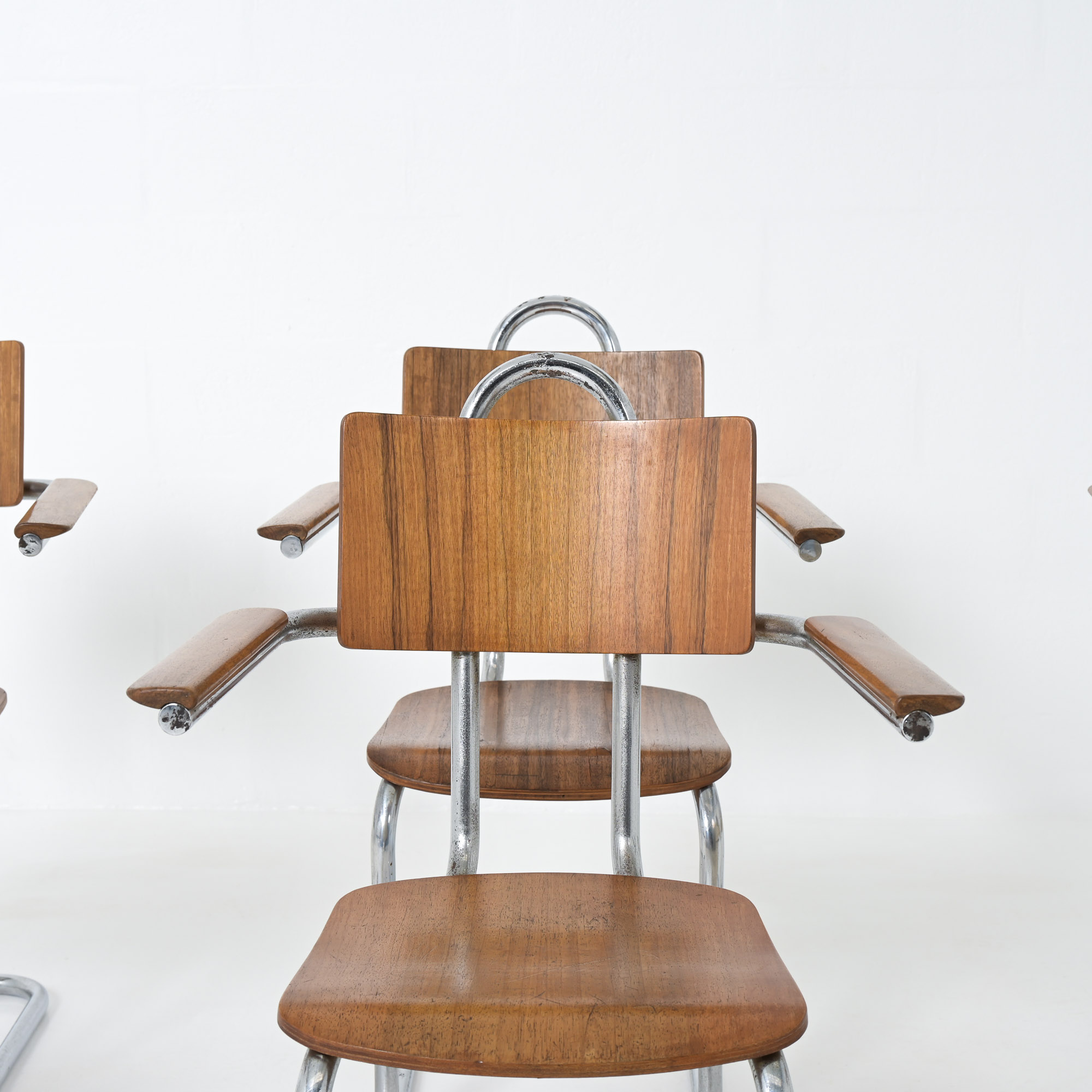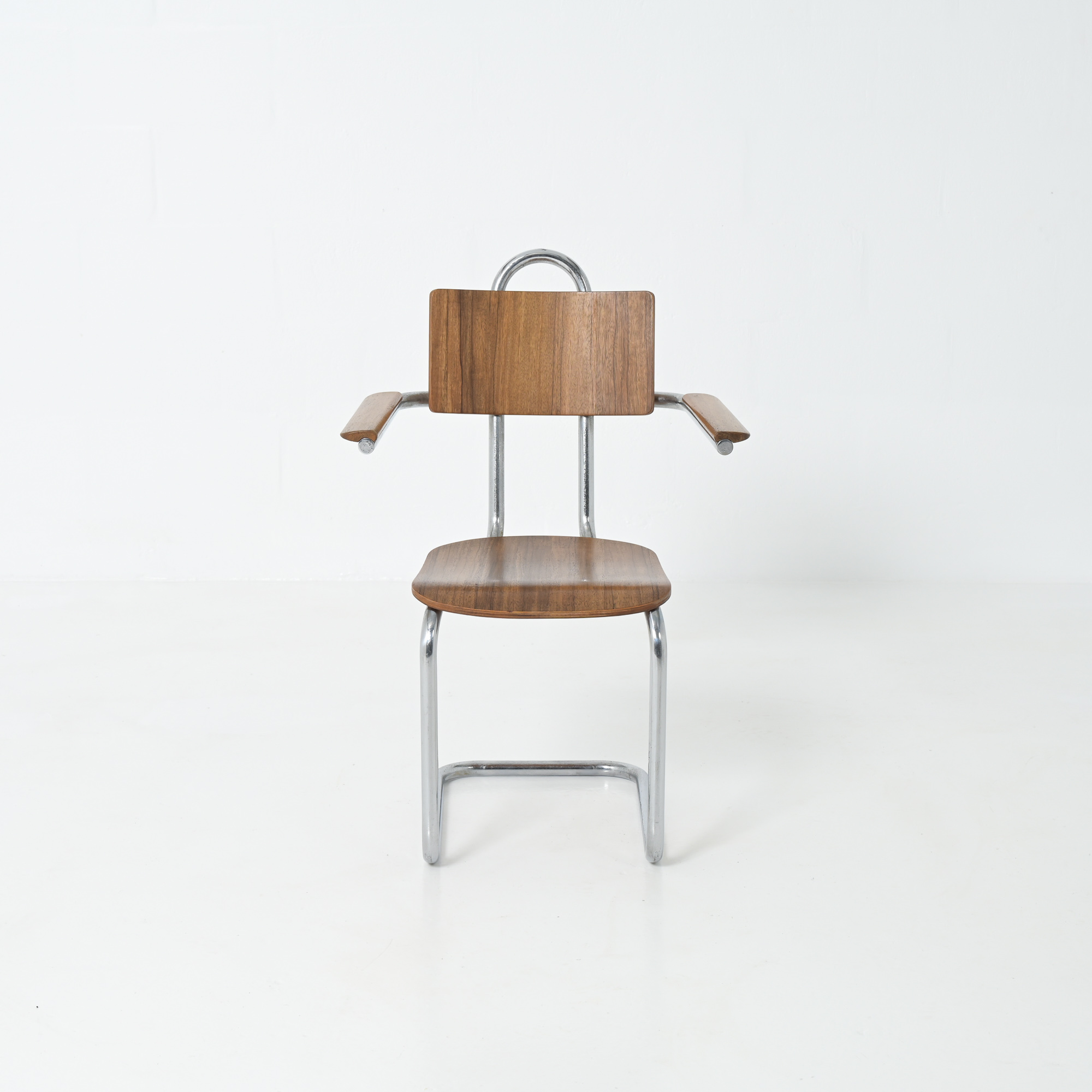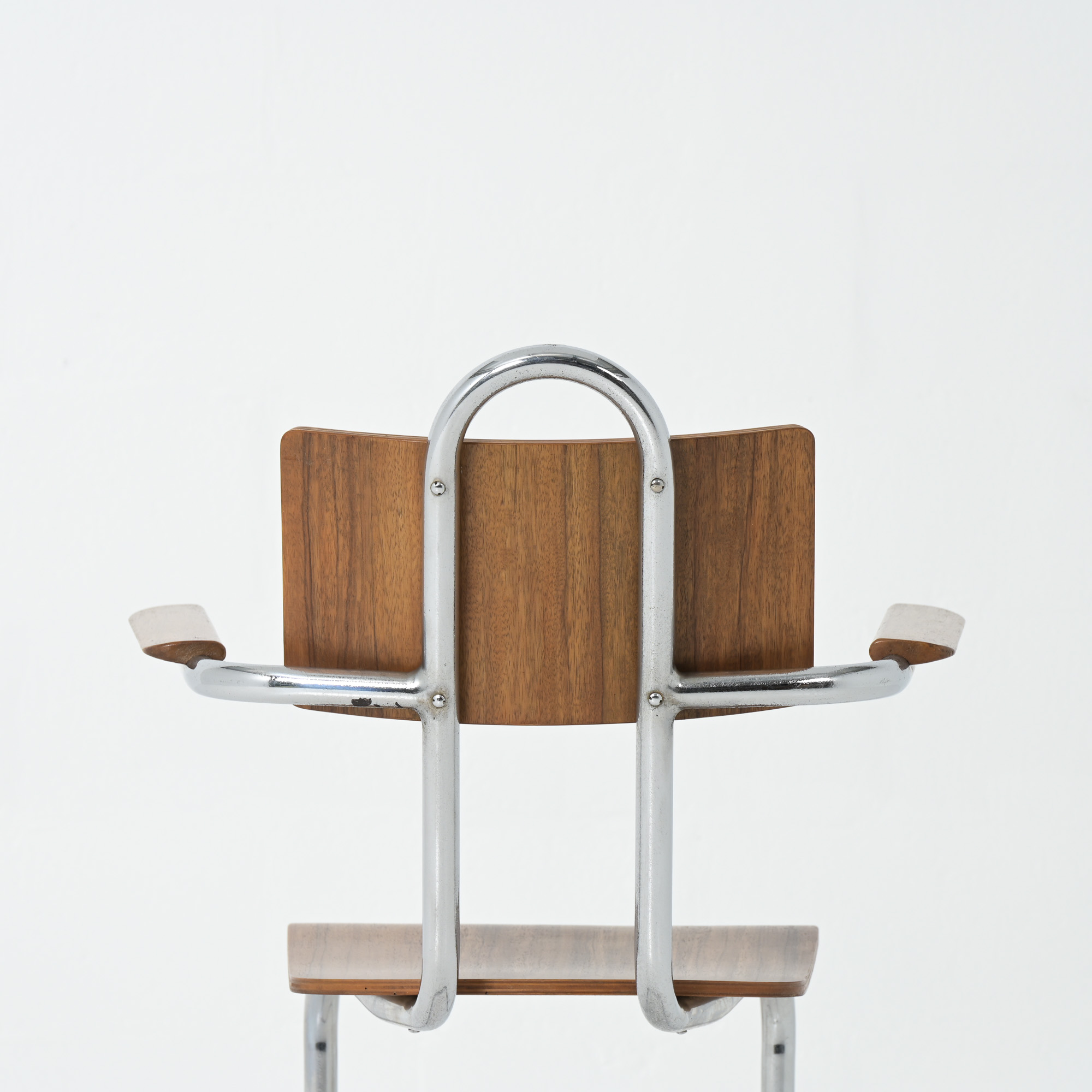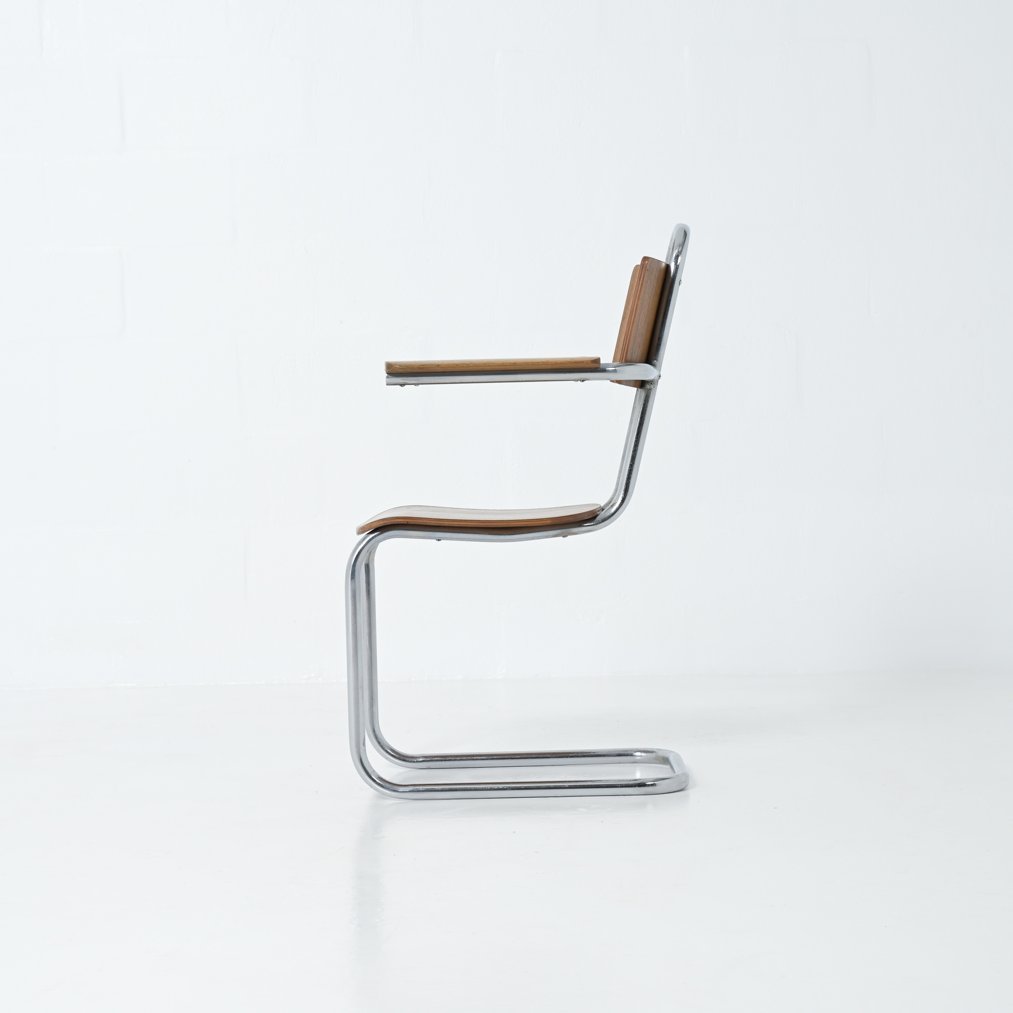 This chair is a great example of craftsmanship: the nice detailed chrome tubular metal base with special screws, the plywood seat and back rest, the armrests finished with solid wood.