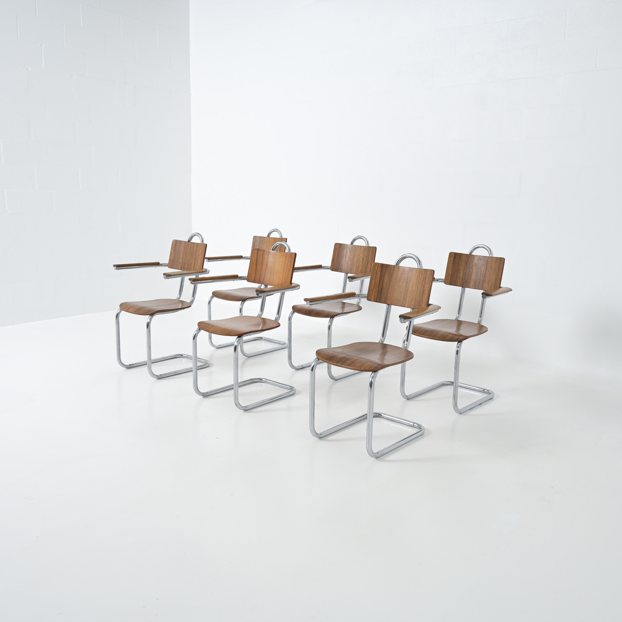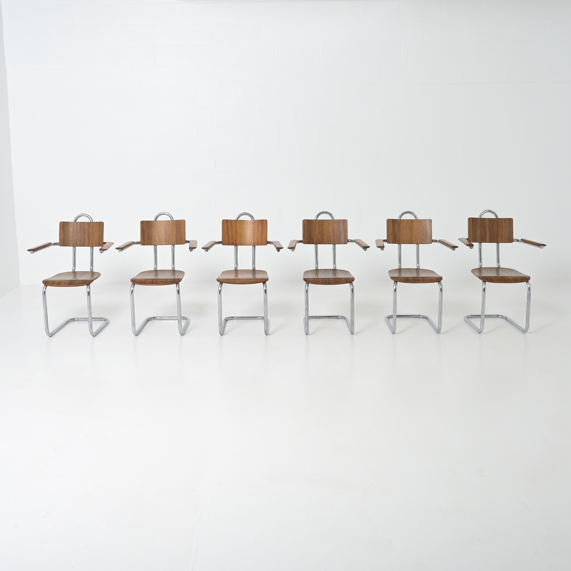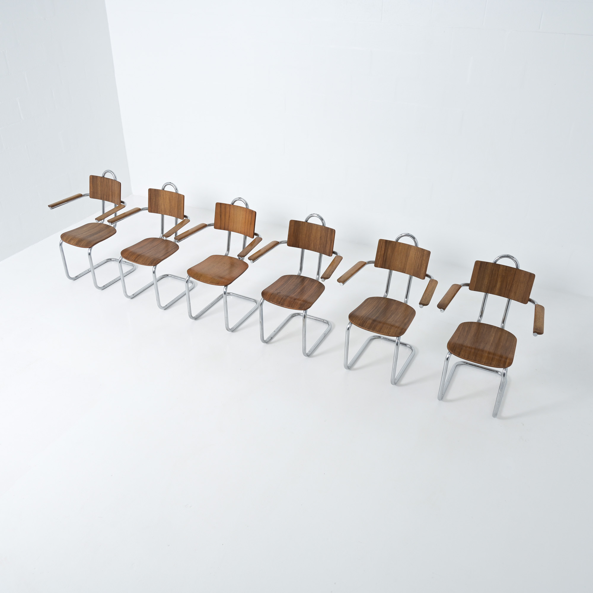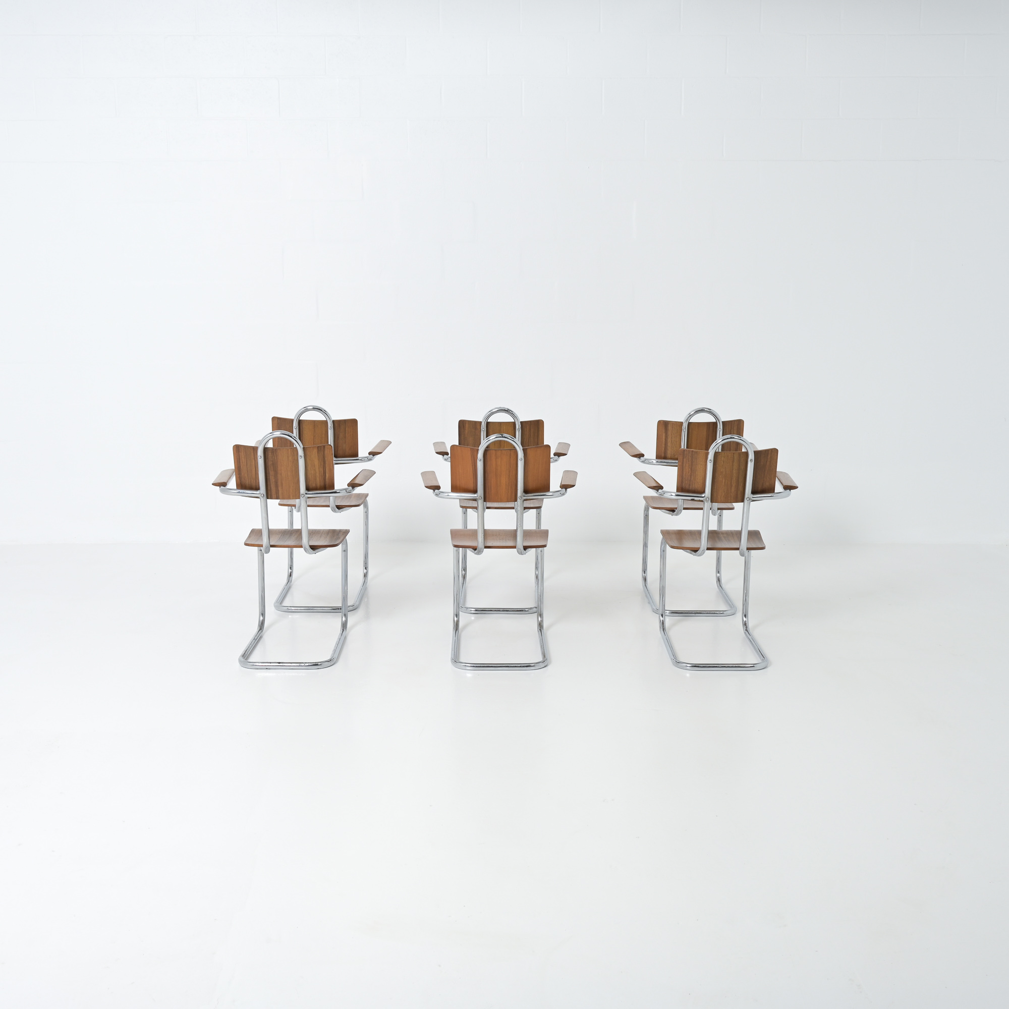 This chair is a great example of craftsmanship: the nice detailed chrome tubular metal base with special screws, the plywood seat and back rest, the armrests finished with solid wood.