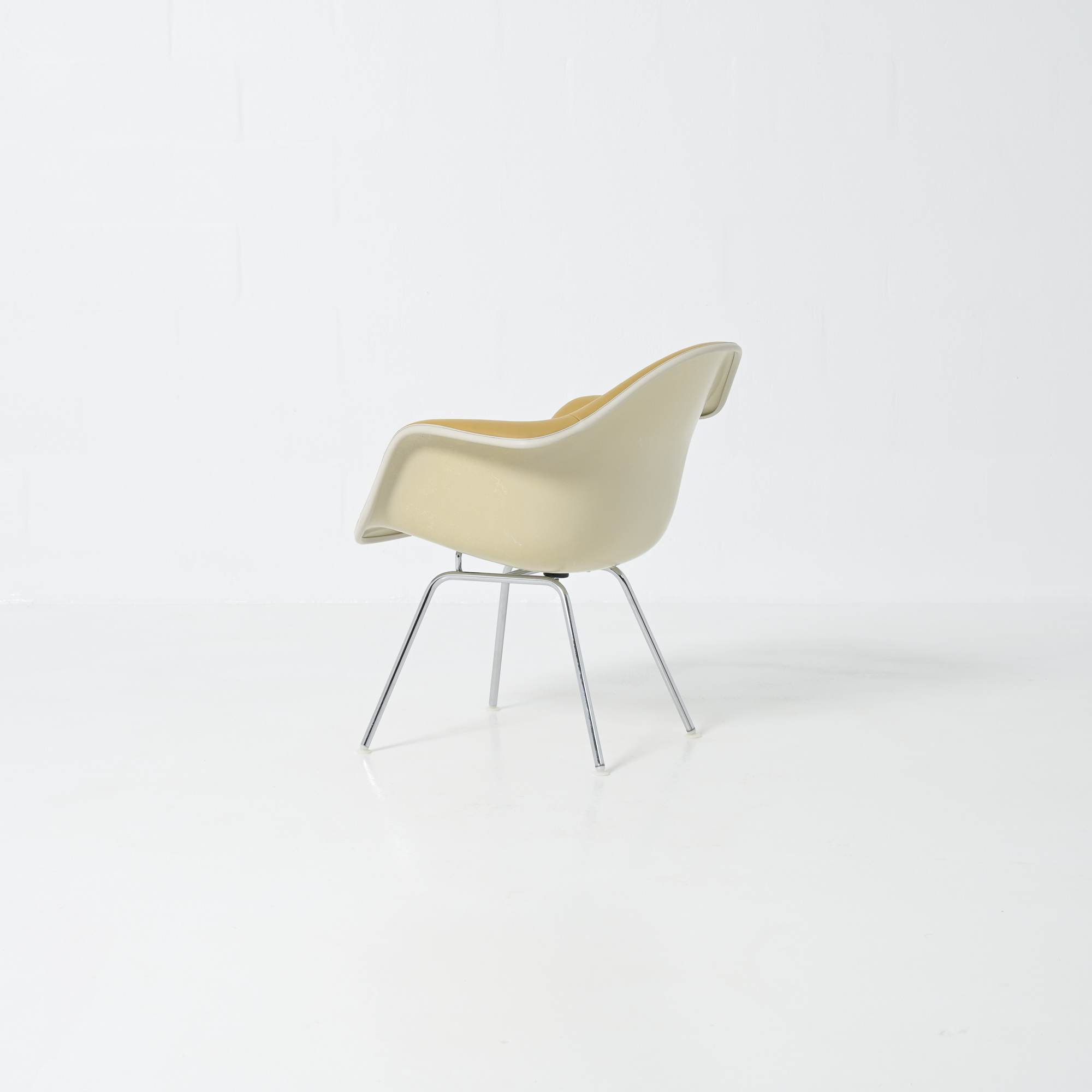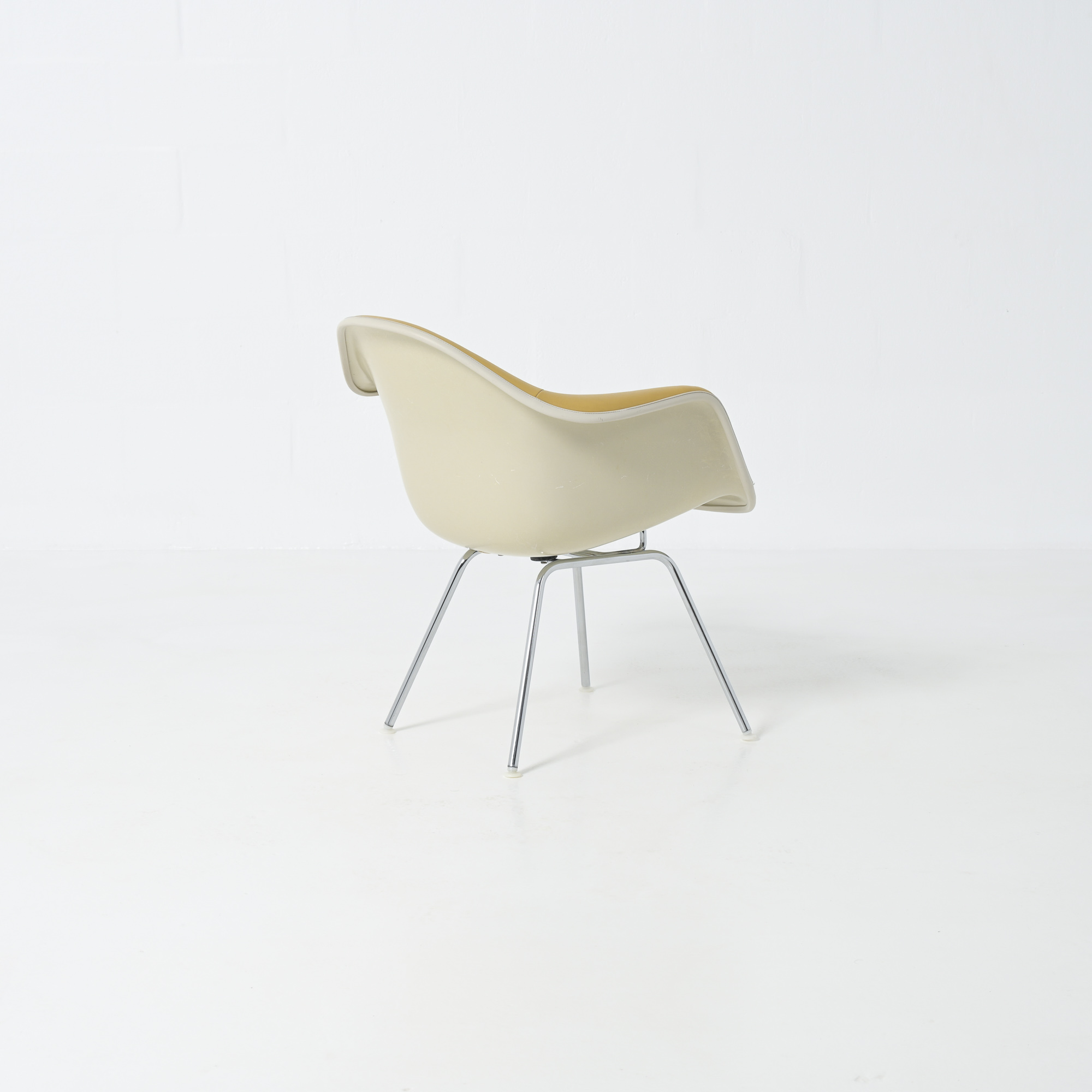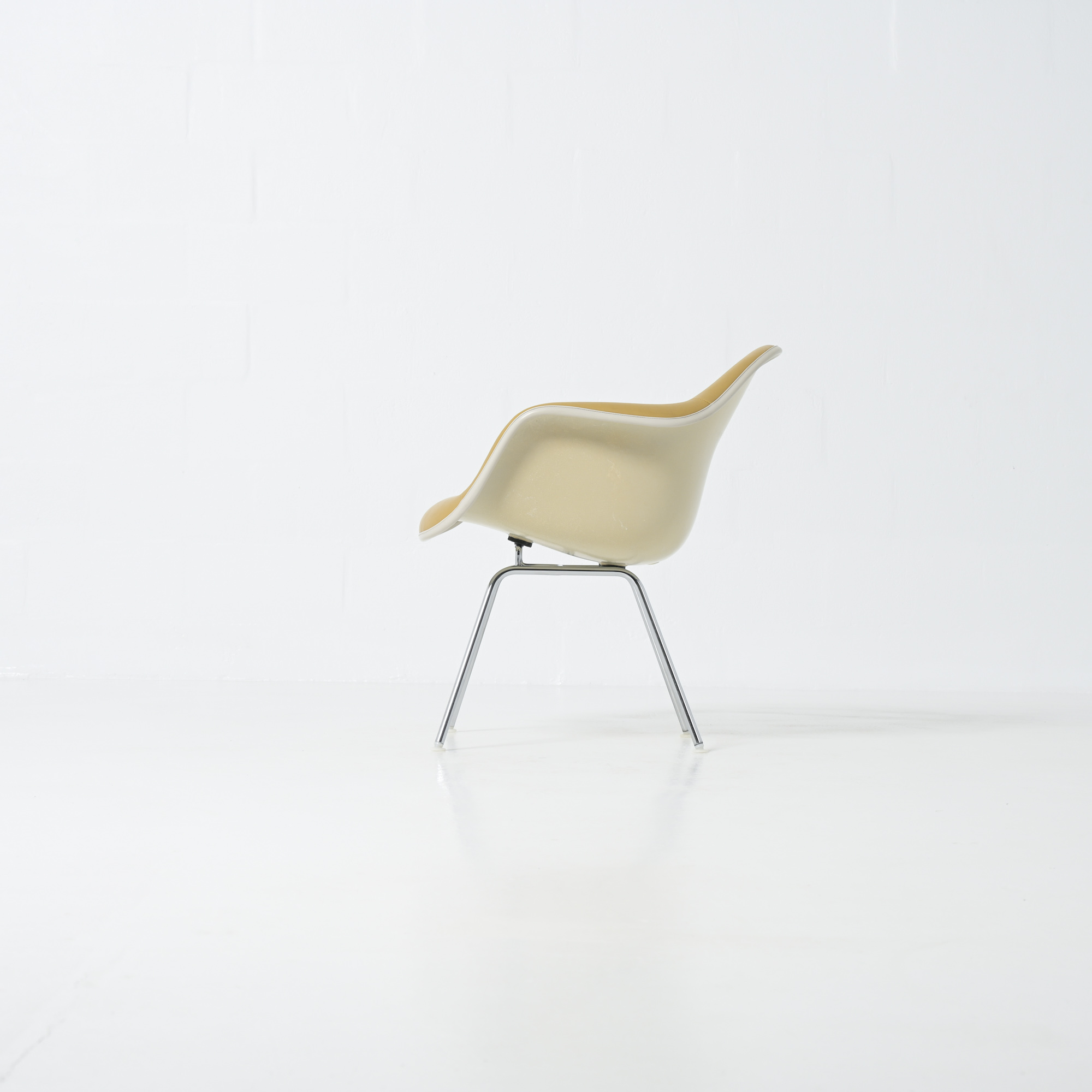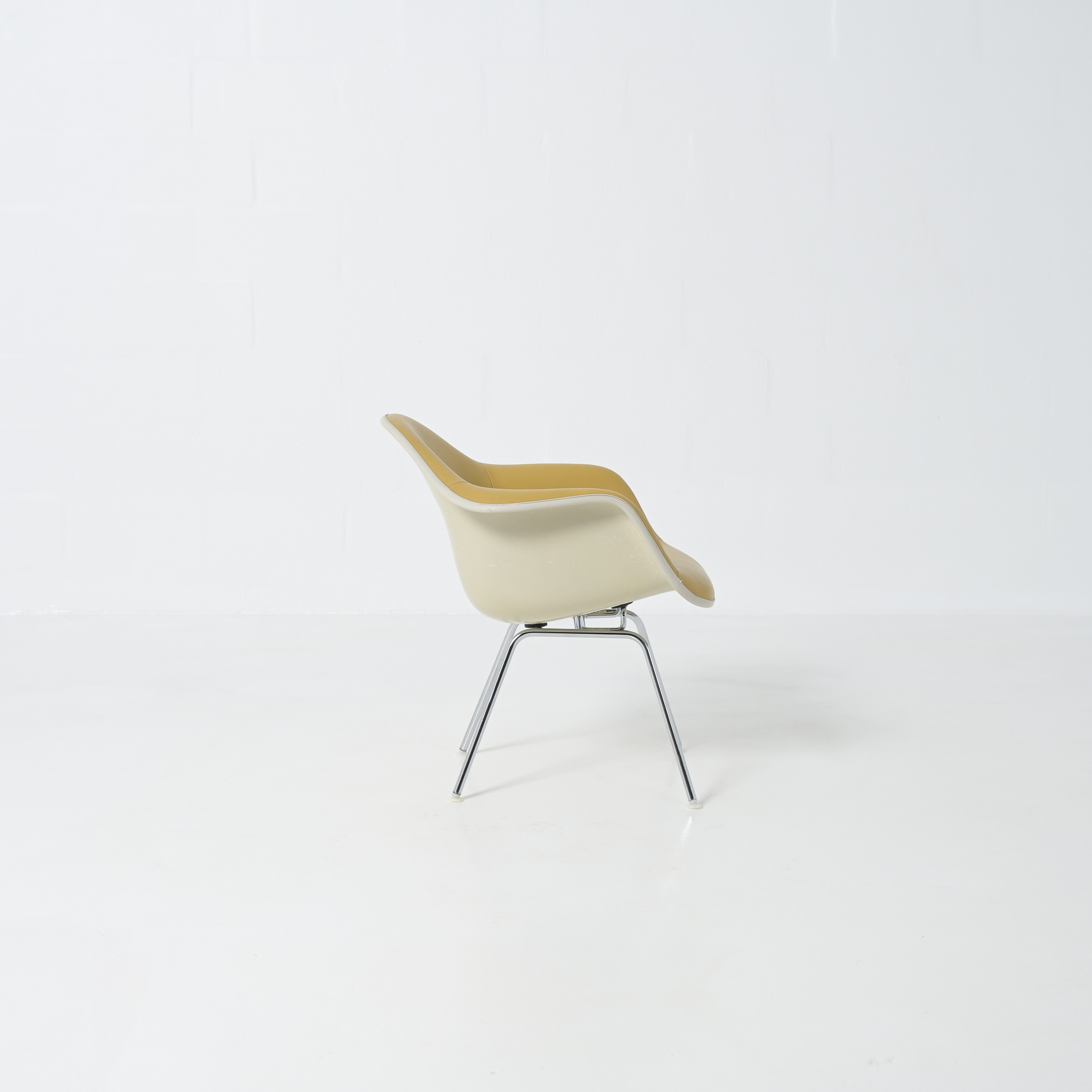 This LAH (low Armchair H base) armchair has a leatherette seat and a fiberglass shell. This chair is the lounge version of the DAH or DAX.