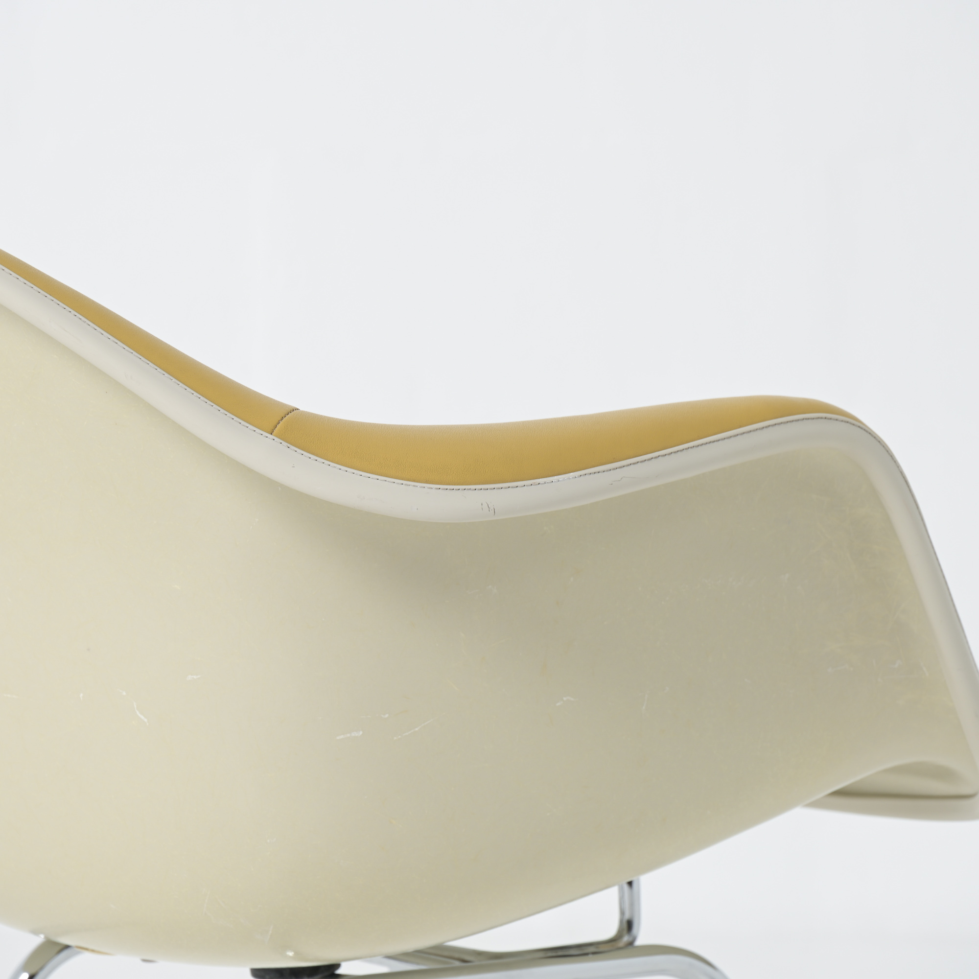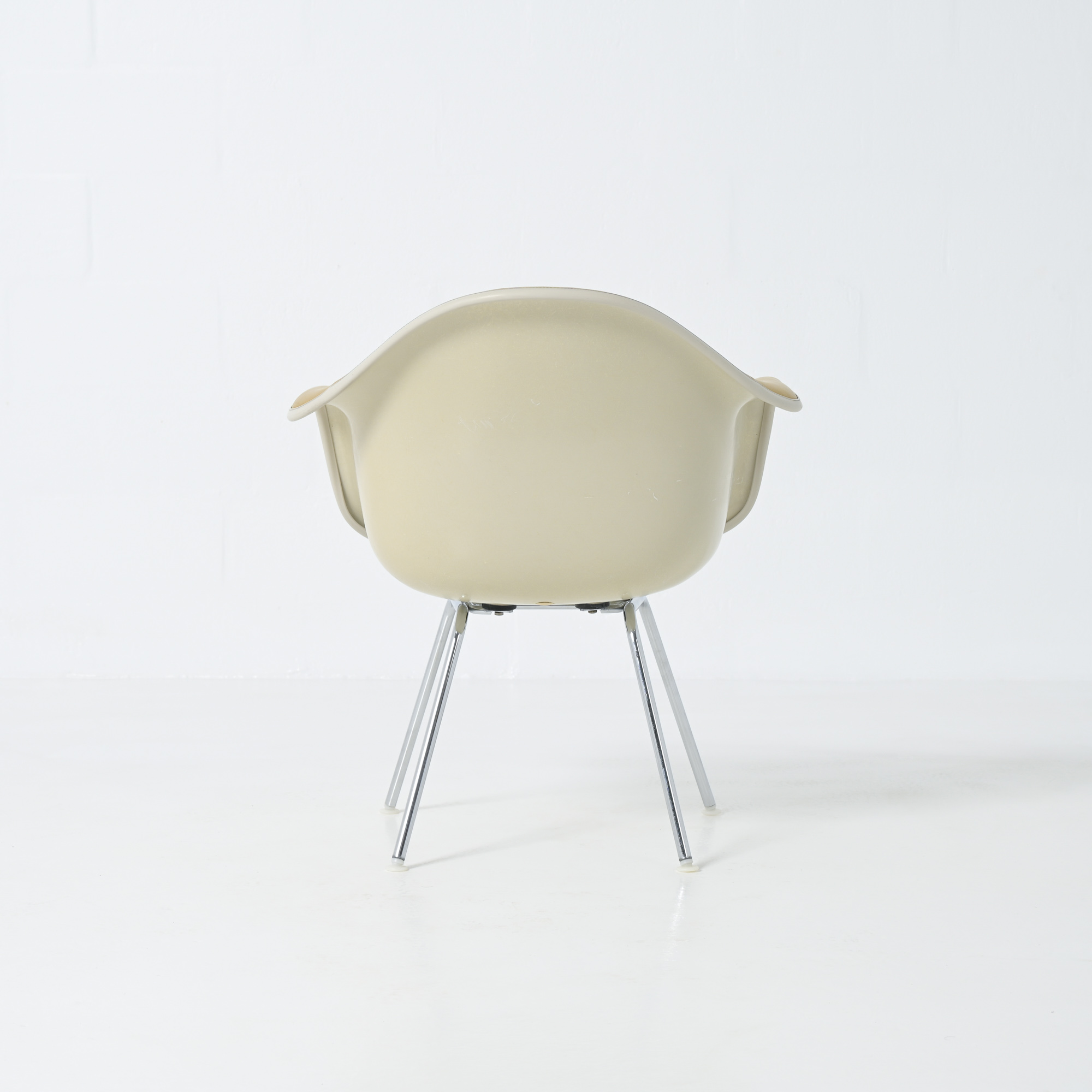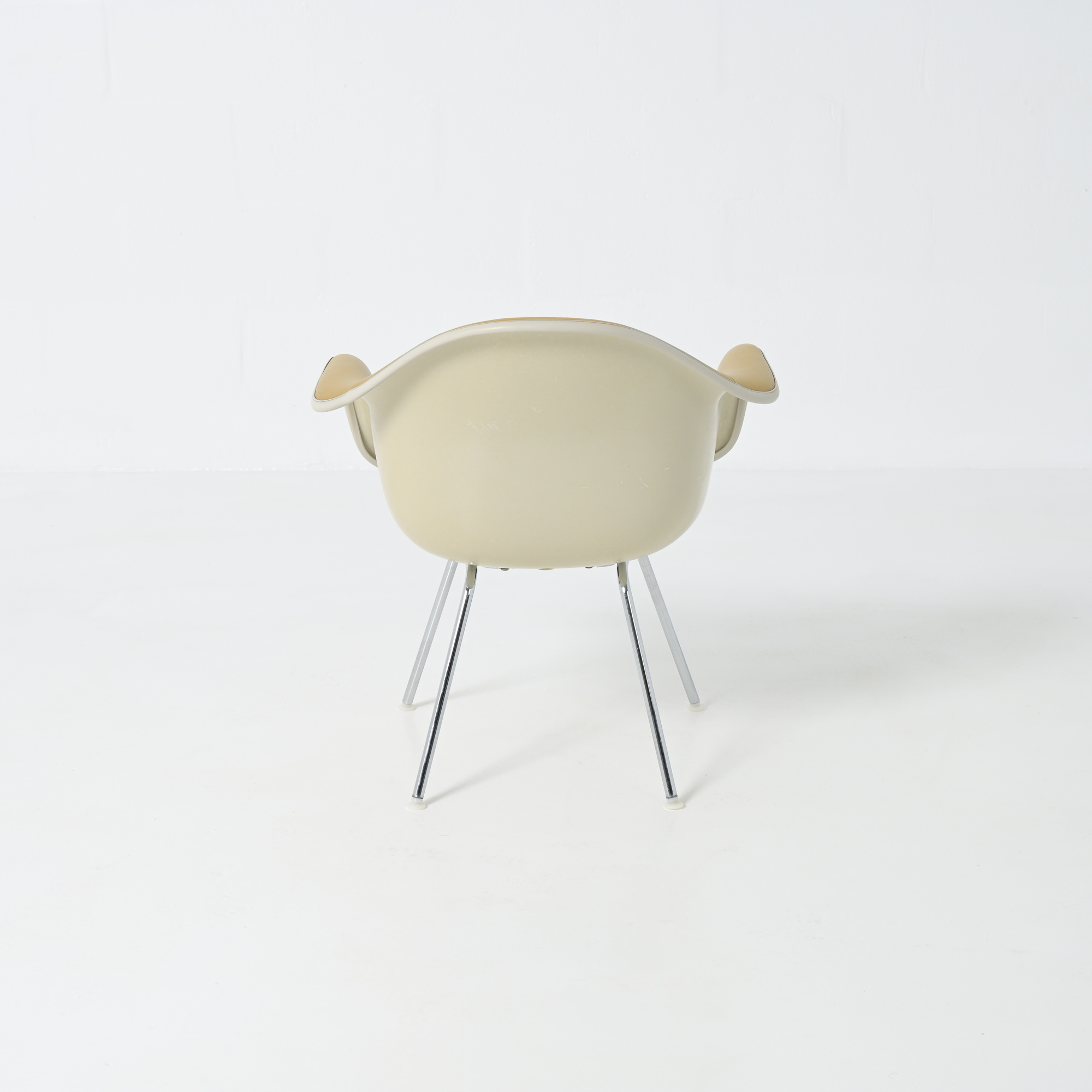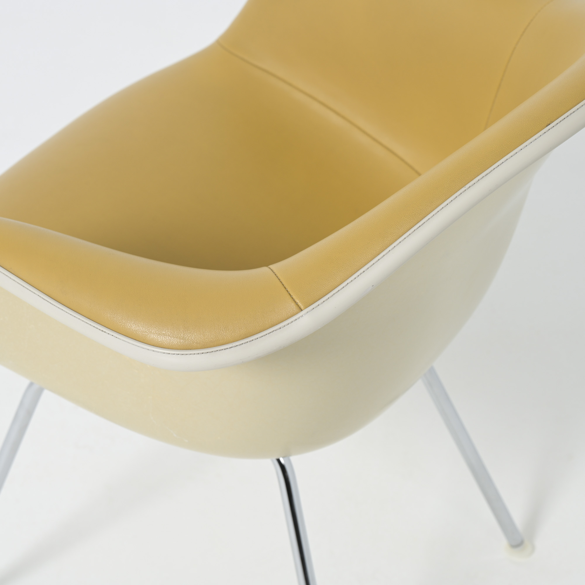 This LAH (low Armchair H base) armchair has a leatherette seat and a fiberglass shell. This chair is the lounge version of the DAH or DAX.