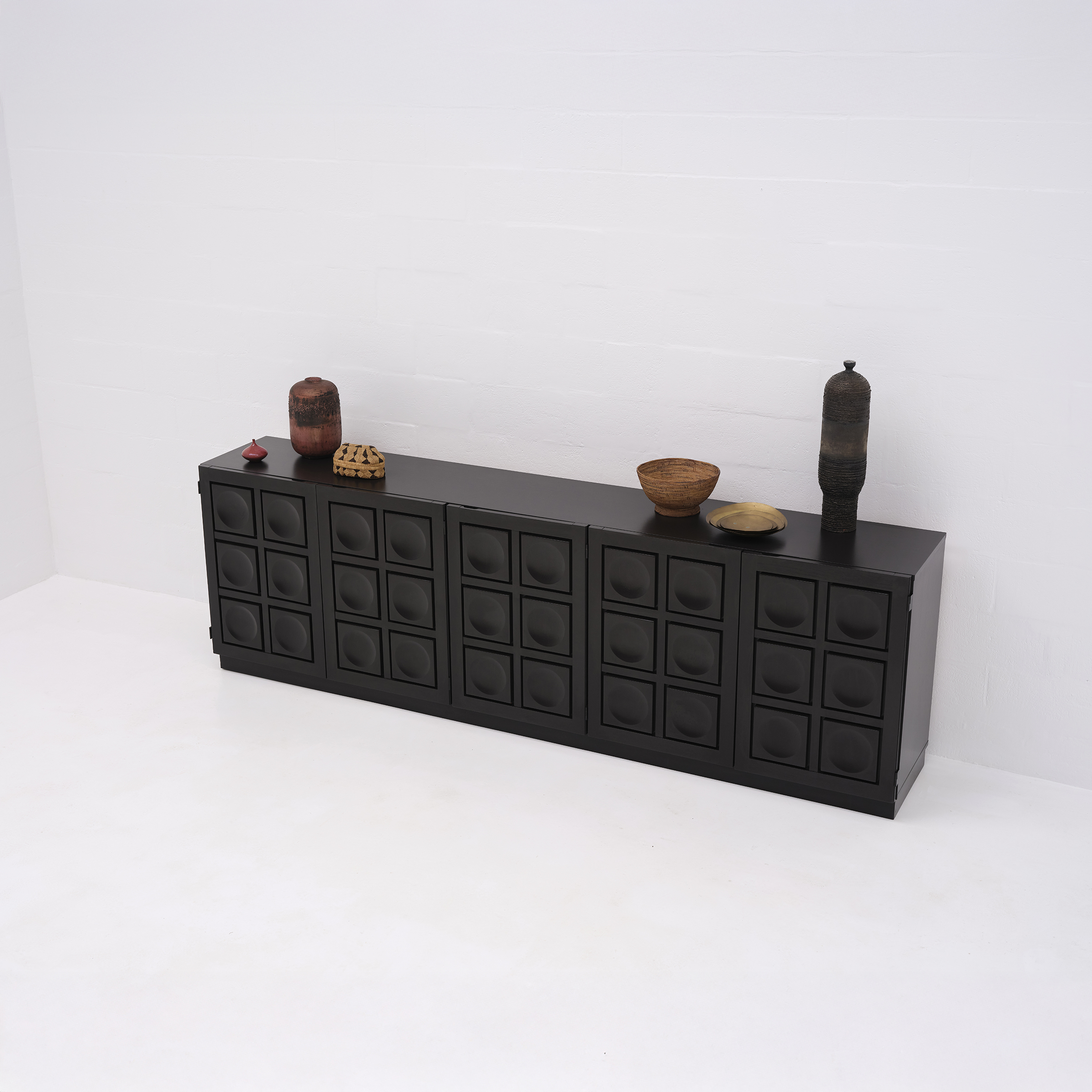 This black brutalist sideboard dates from the 1970s and is made in Belgium. This sideboard has 5-doors. The repetitive geometric pattern on the wooden doors makes it a strong design.