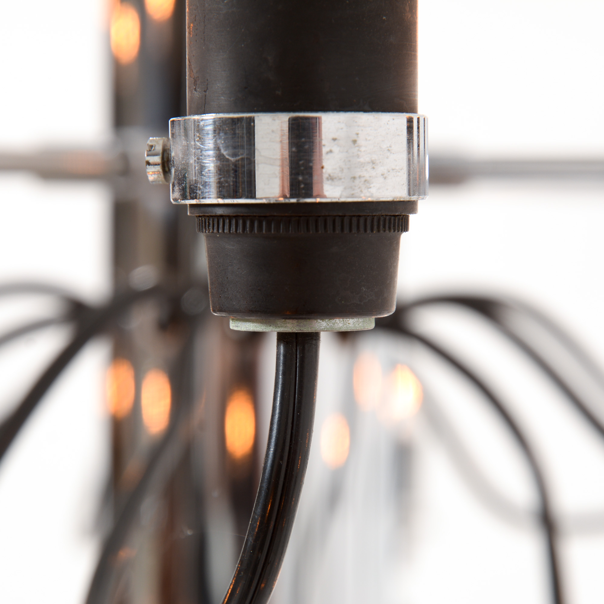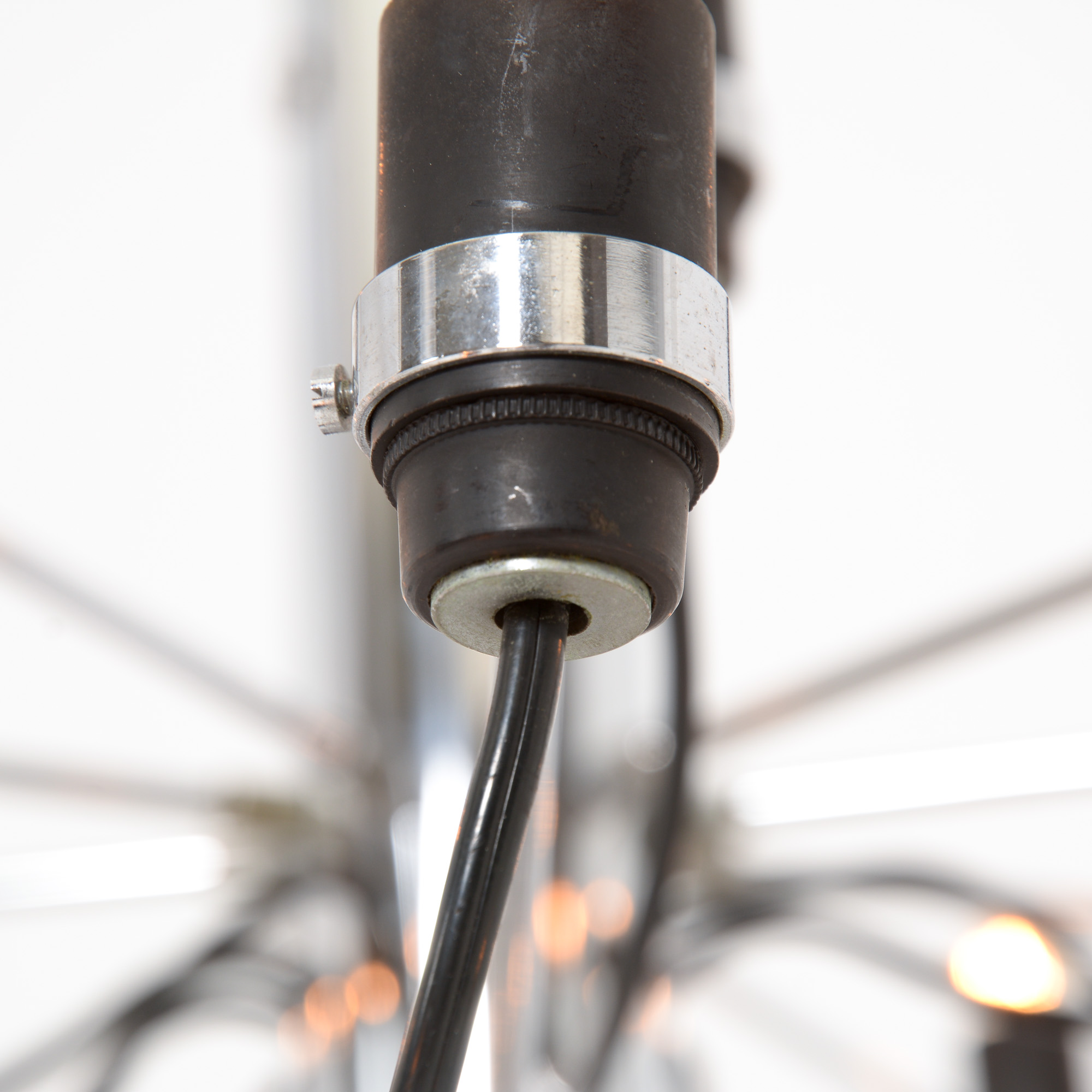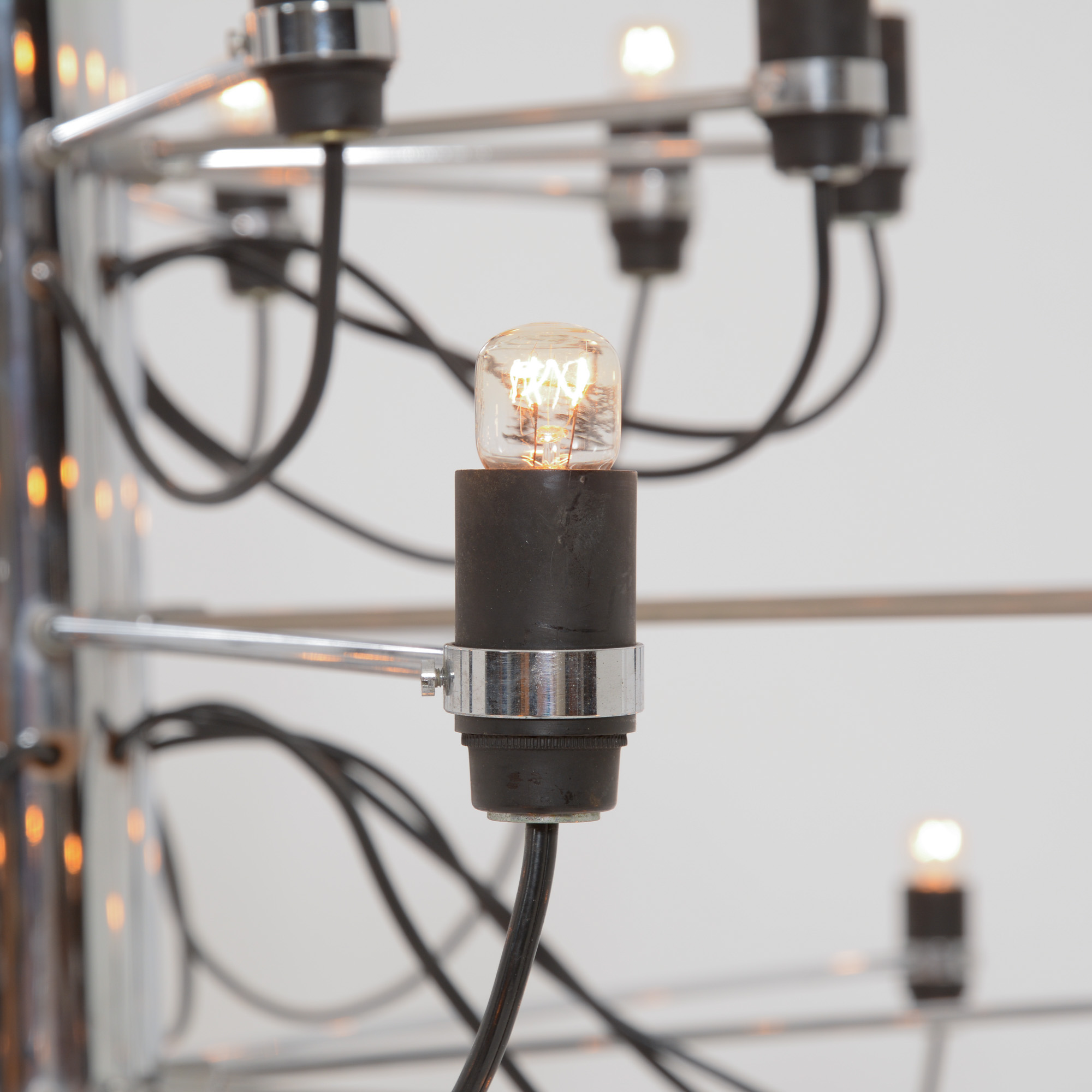 The many chrome-plated steel arms are screwed directly to the central stem which is also chrome-plated. The sockets are made of bakelite.