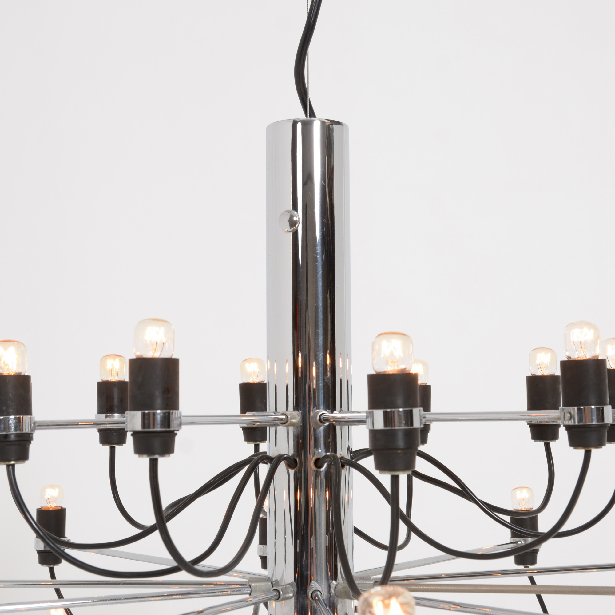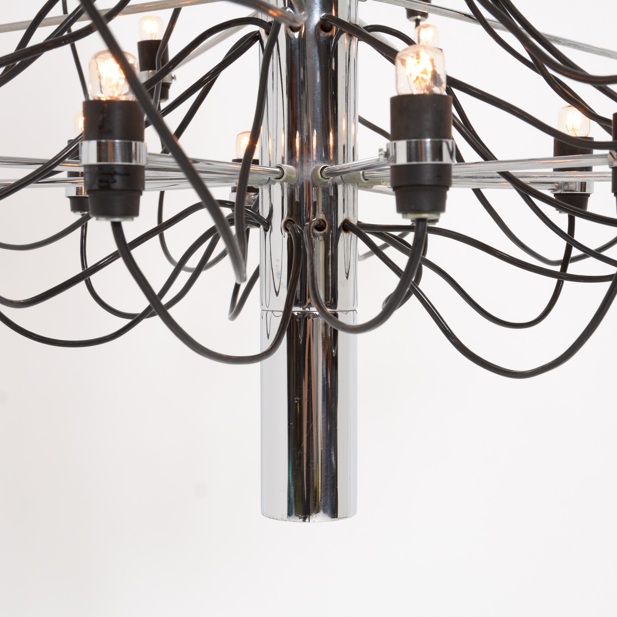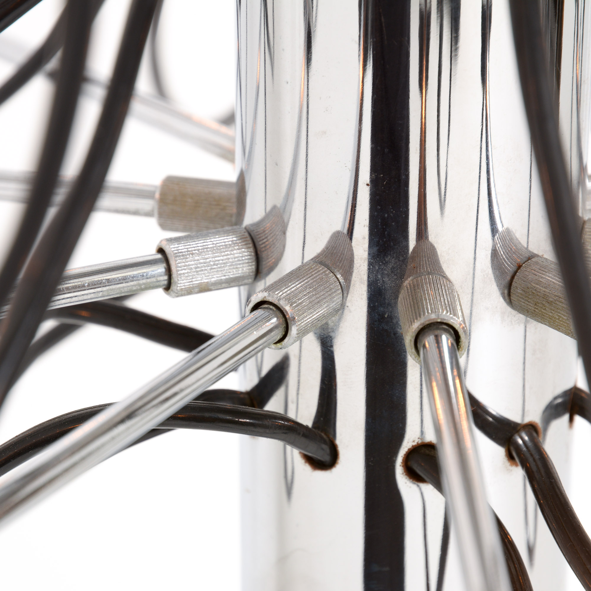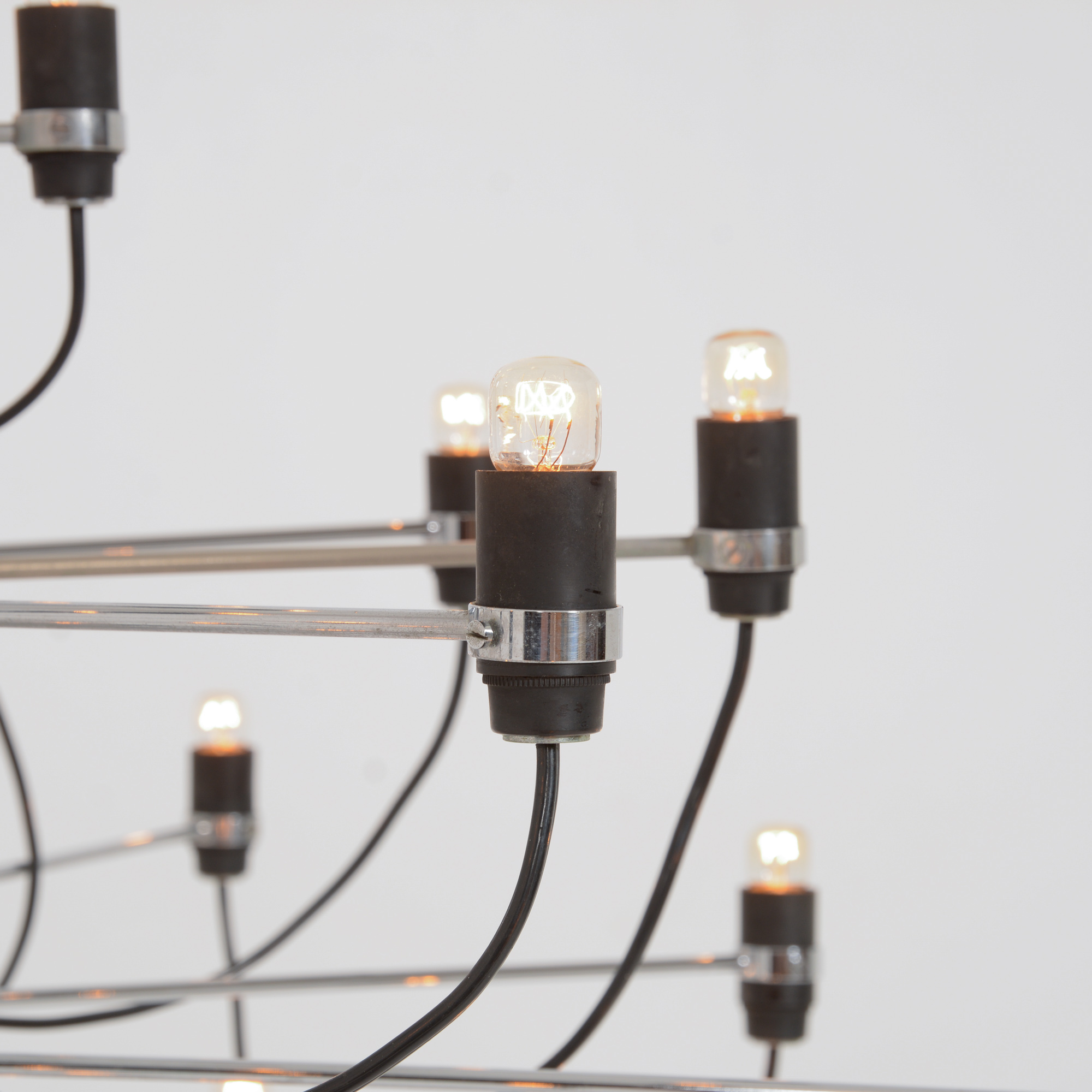 The many chrome-plated steel arms are screwed directly to the central stem which is also chrome-plated. The sockets are made of bakelite.