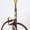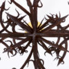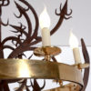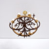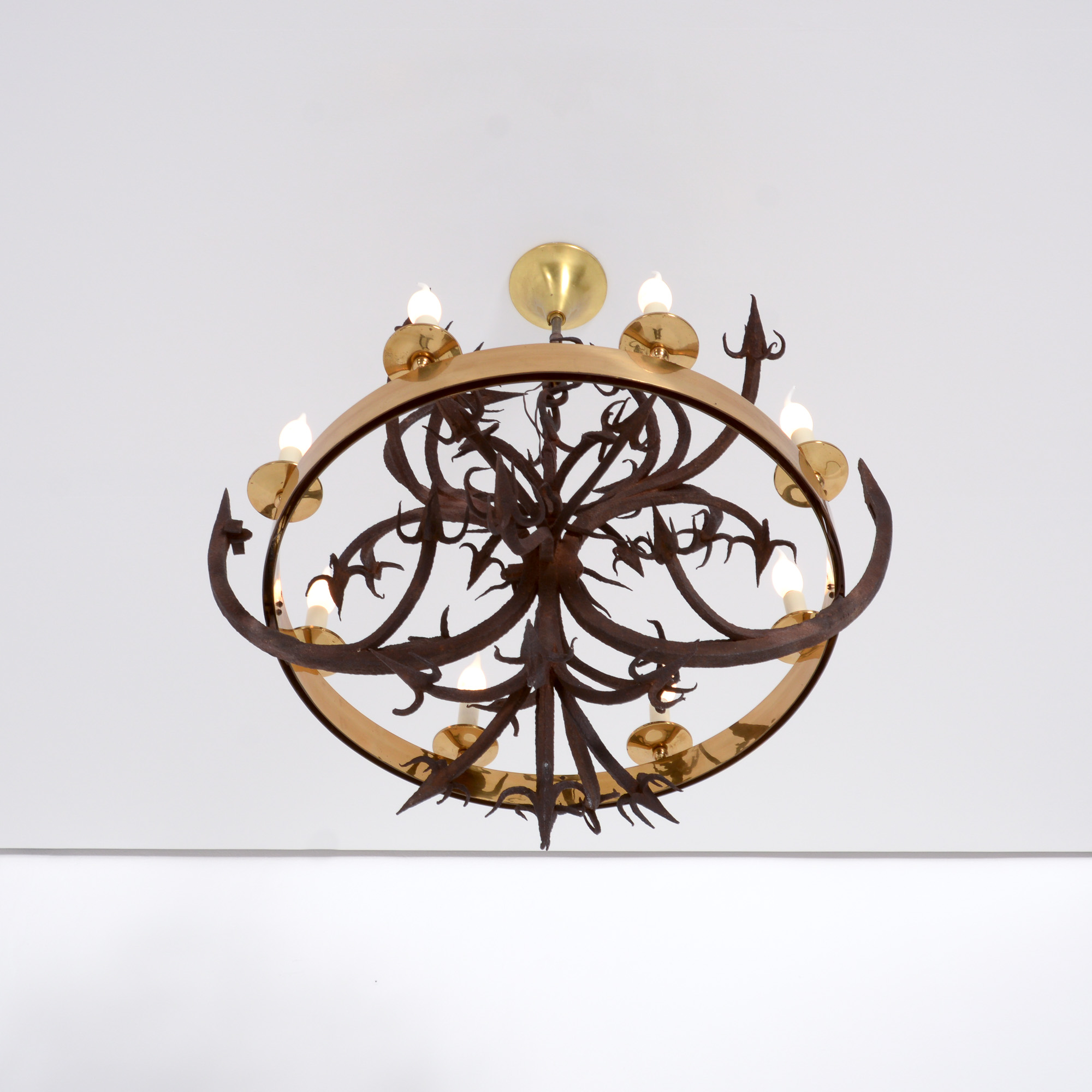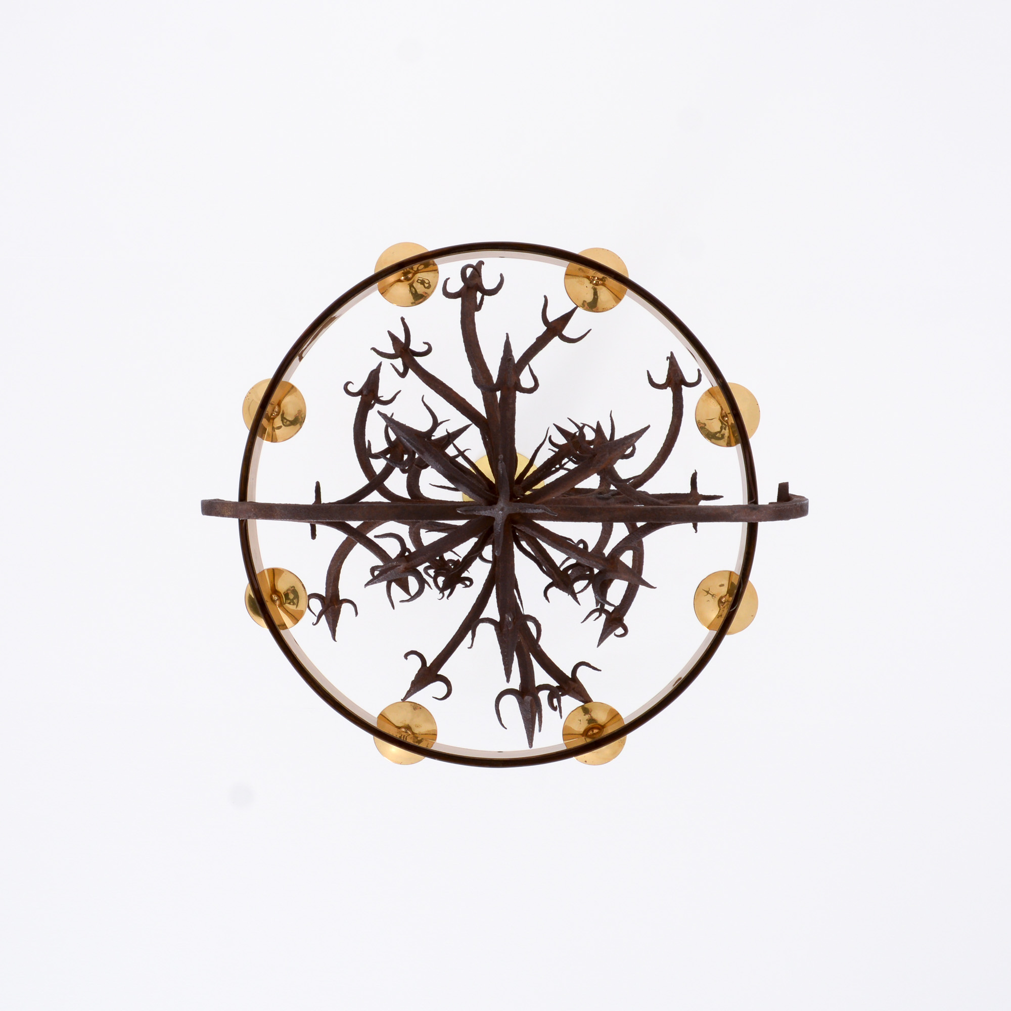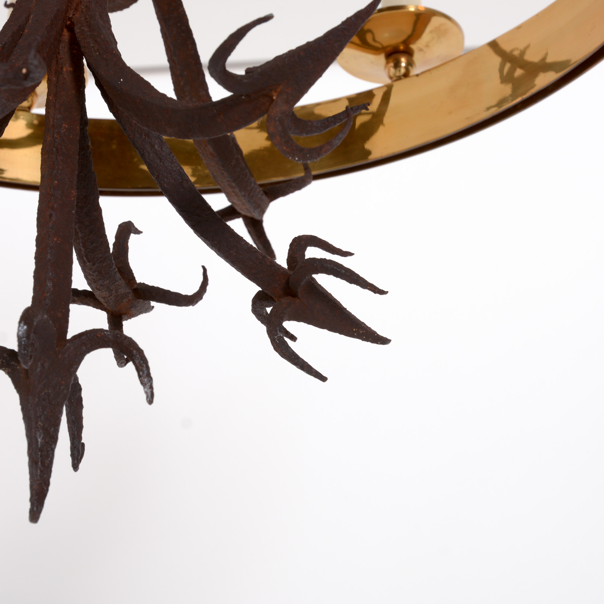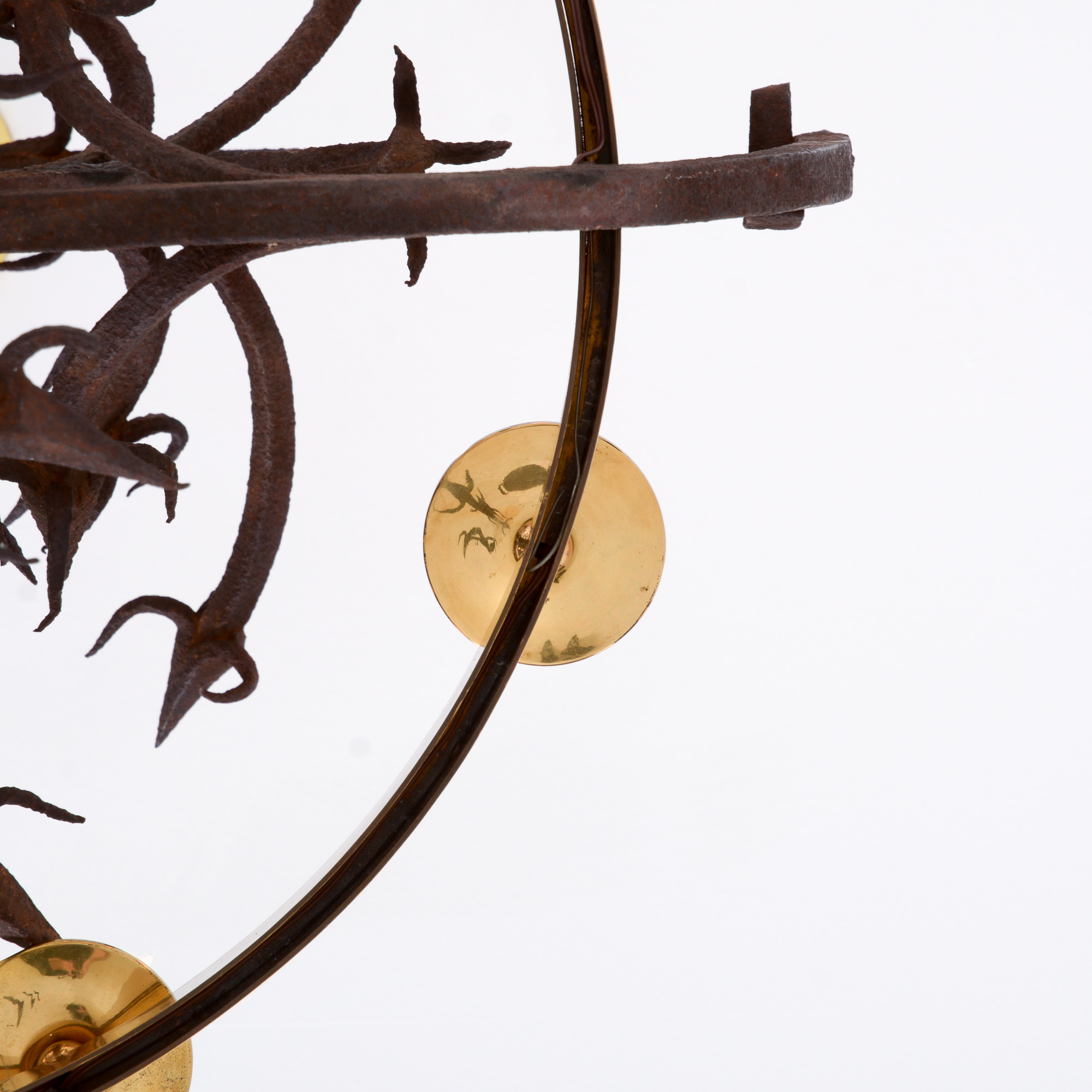 The wrought metal decorative frame of the chandelier is an old antique piece (18th century) decorated with a brass ring and elevated to a unique piece.