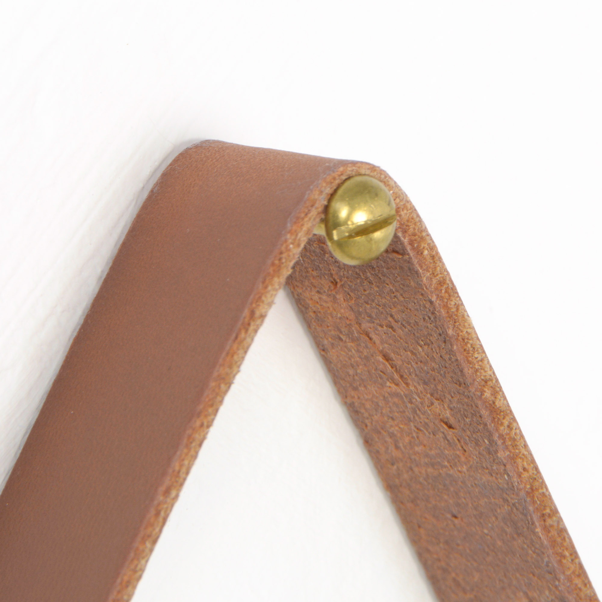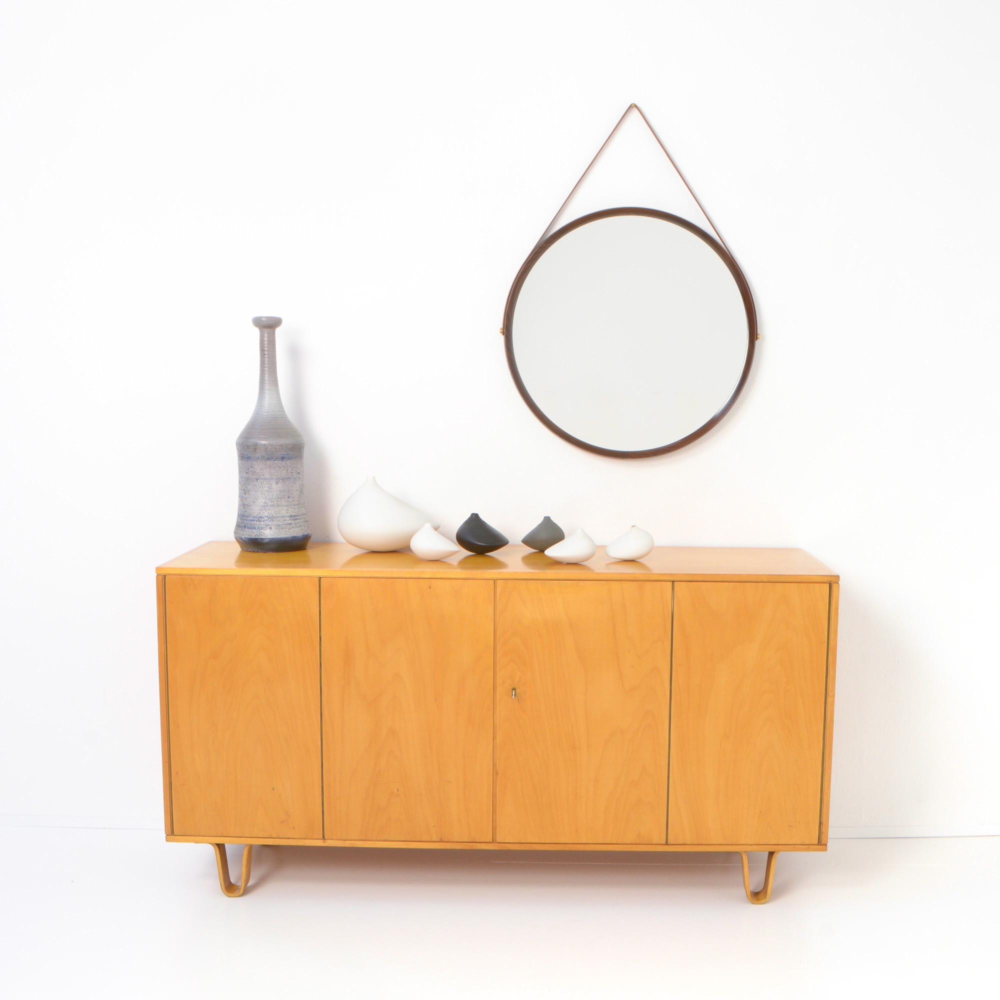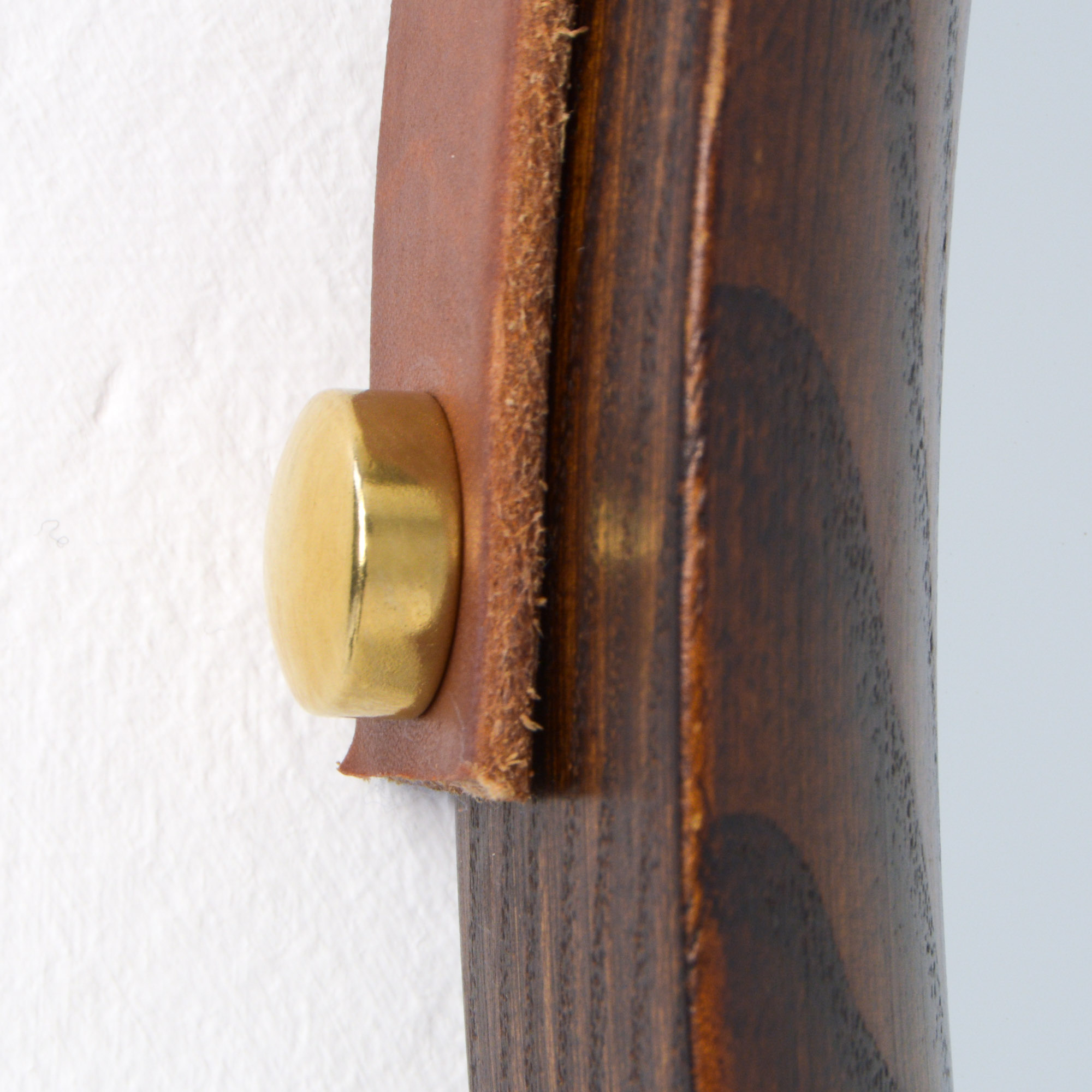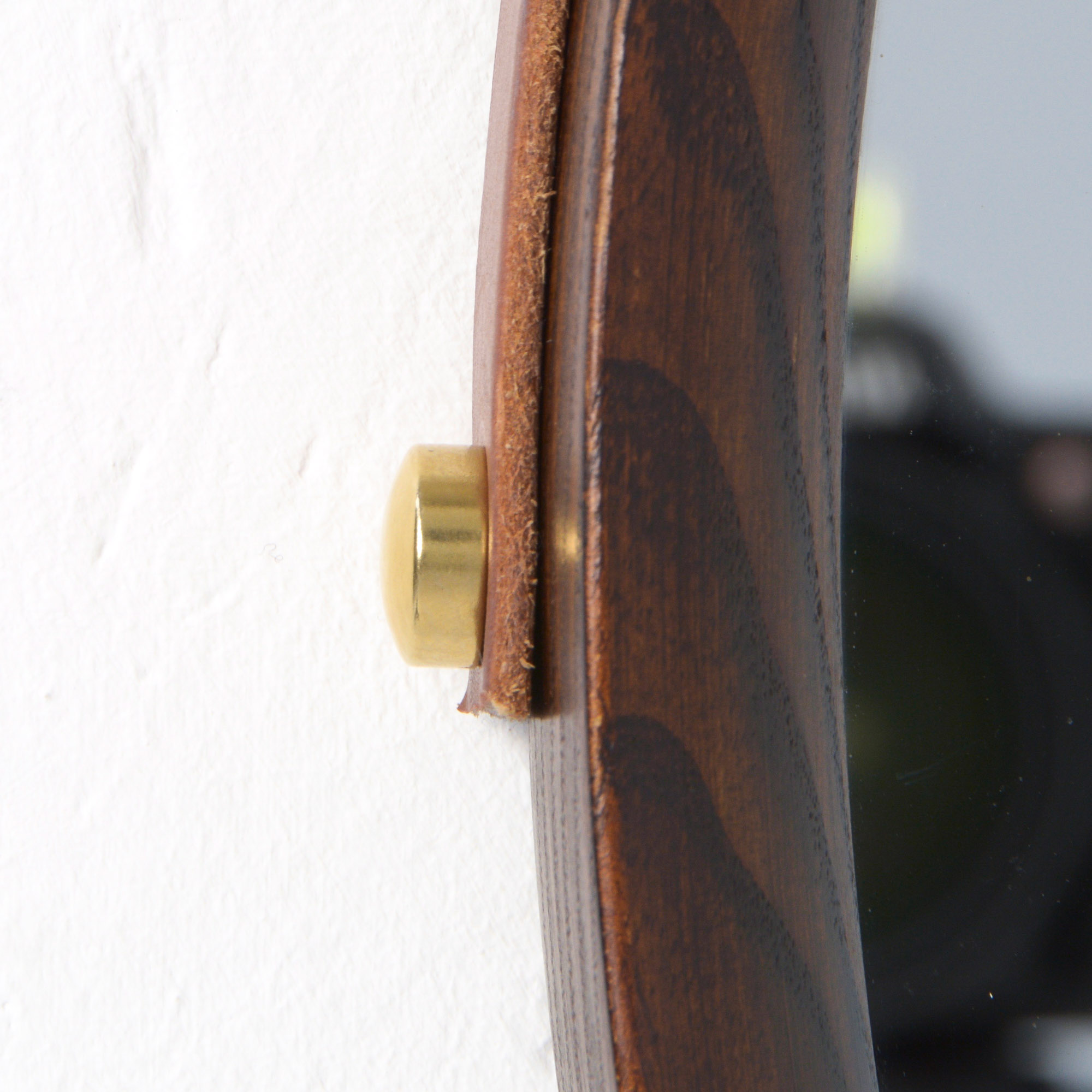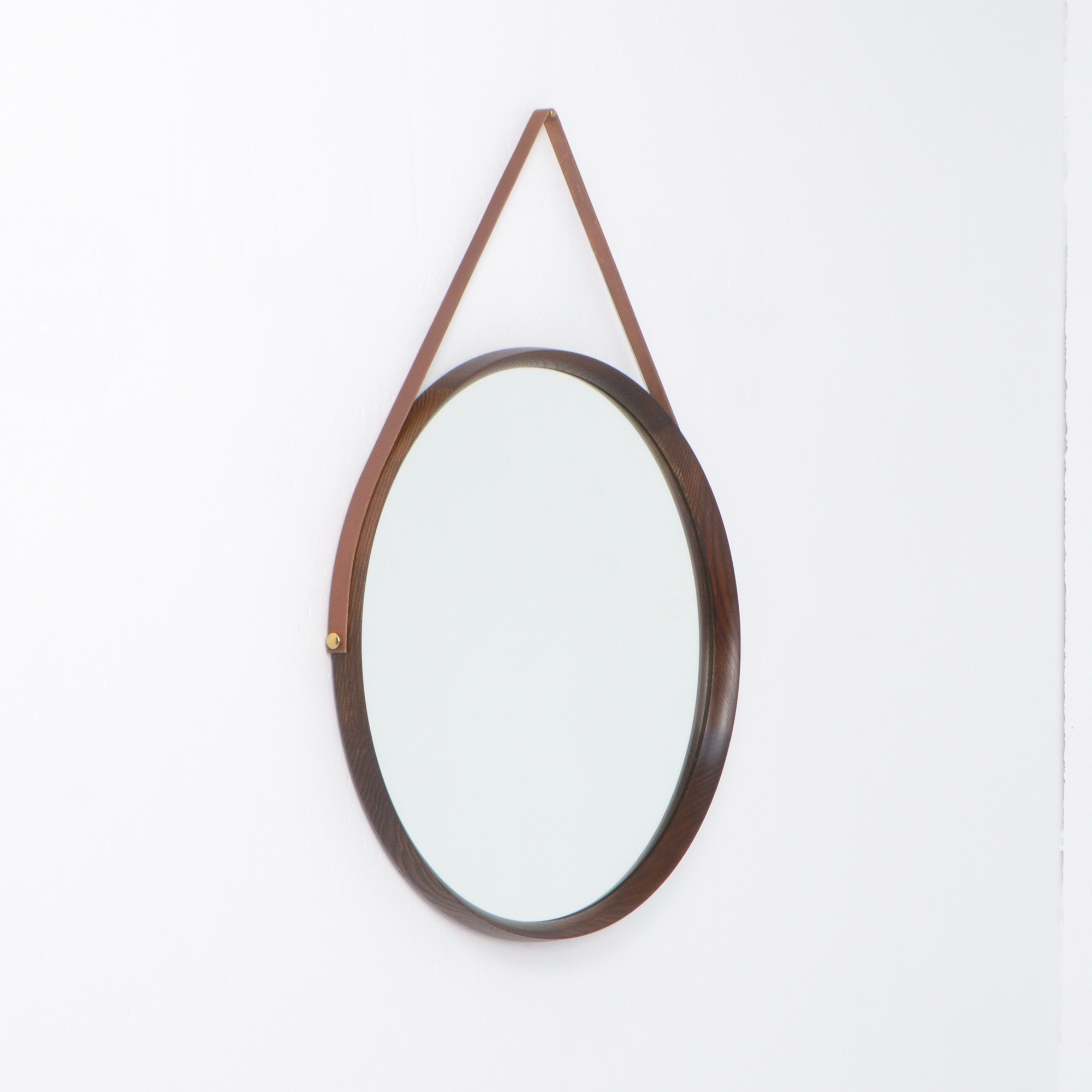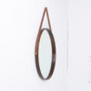 The mirror is made of oak and hangs on a leather strap. This strap is renewed. This solid oak mirror is very nicely detailed and well crafted with nice connections in the rim.