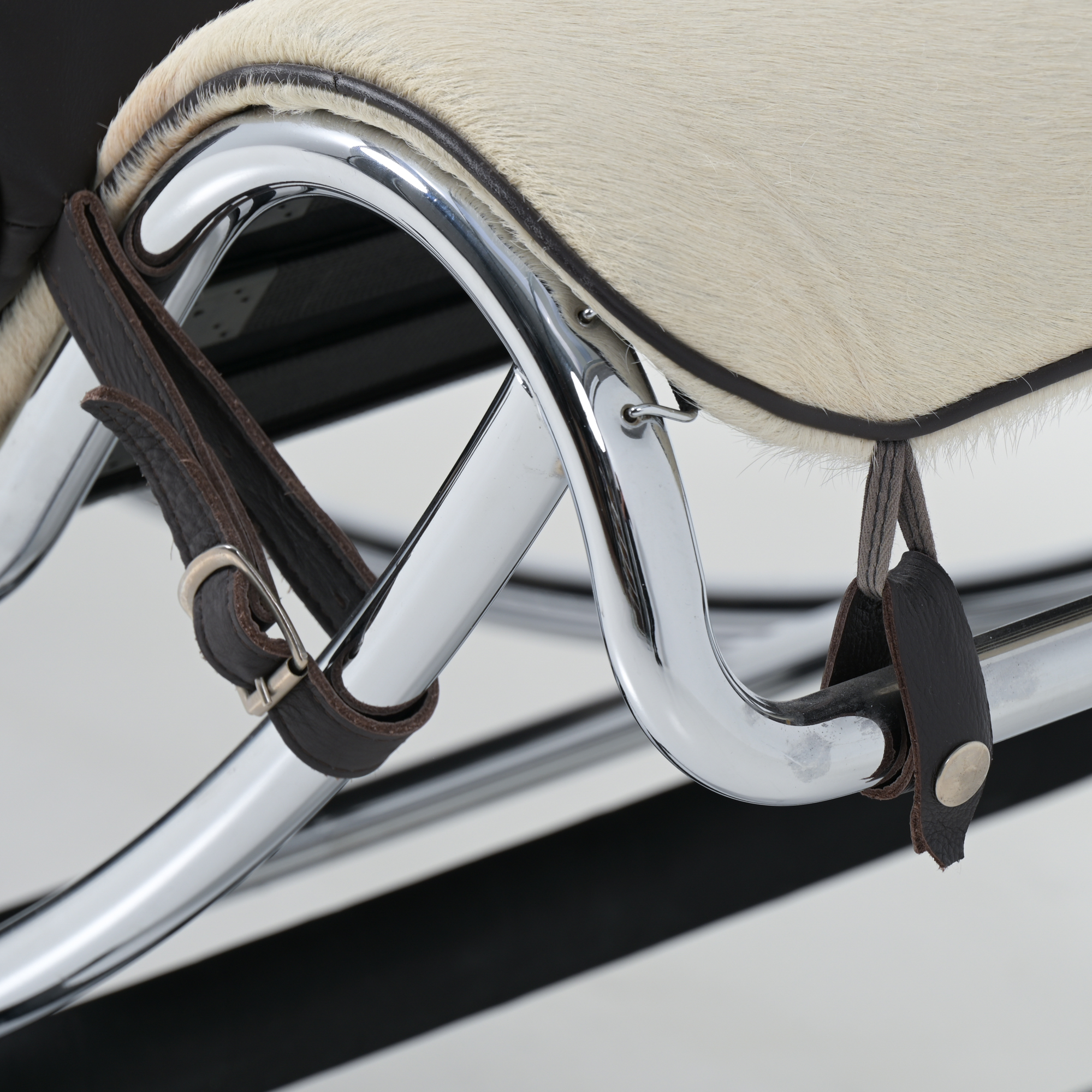 This lounge chair with a black steel base, an adjustable polished chrome plated metal tubular frame and a headrest in black leather is made by Cassina. The seating is covered with bovine fur from the ‘Blond d’aquitaine’. It is in perfect condition.