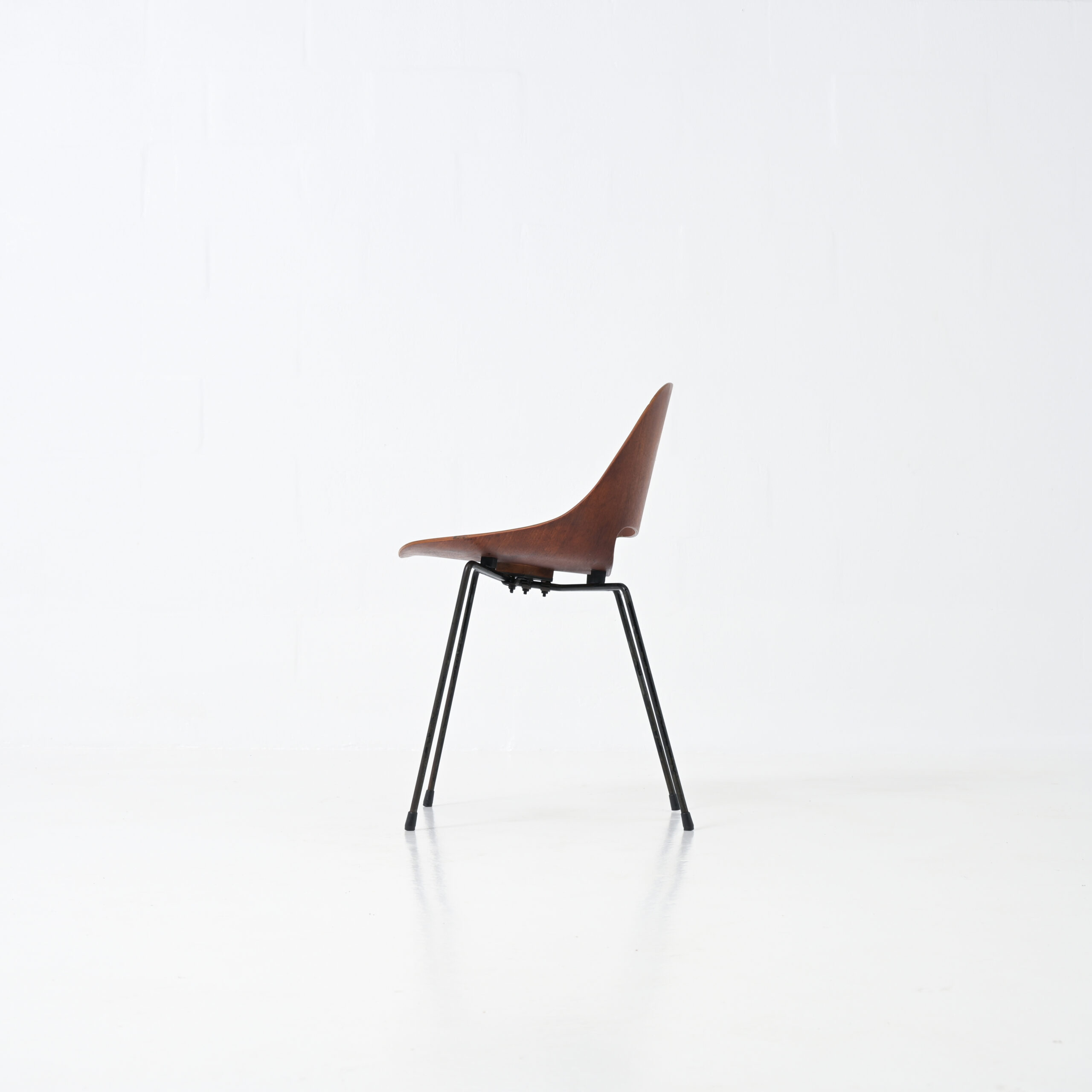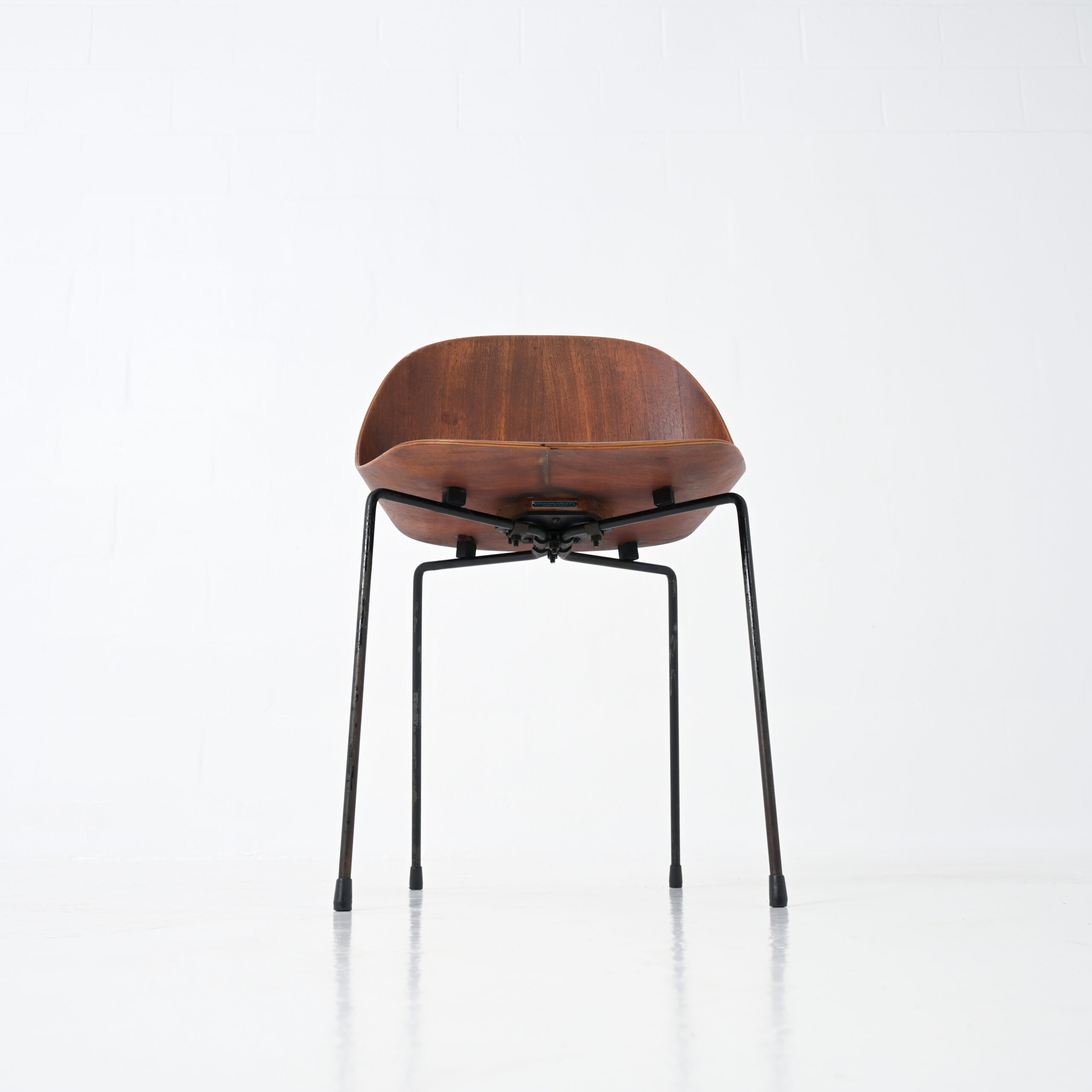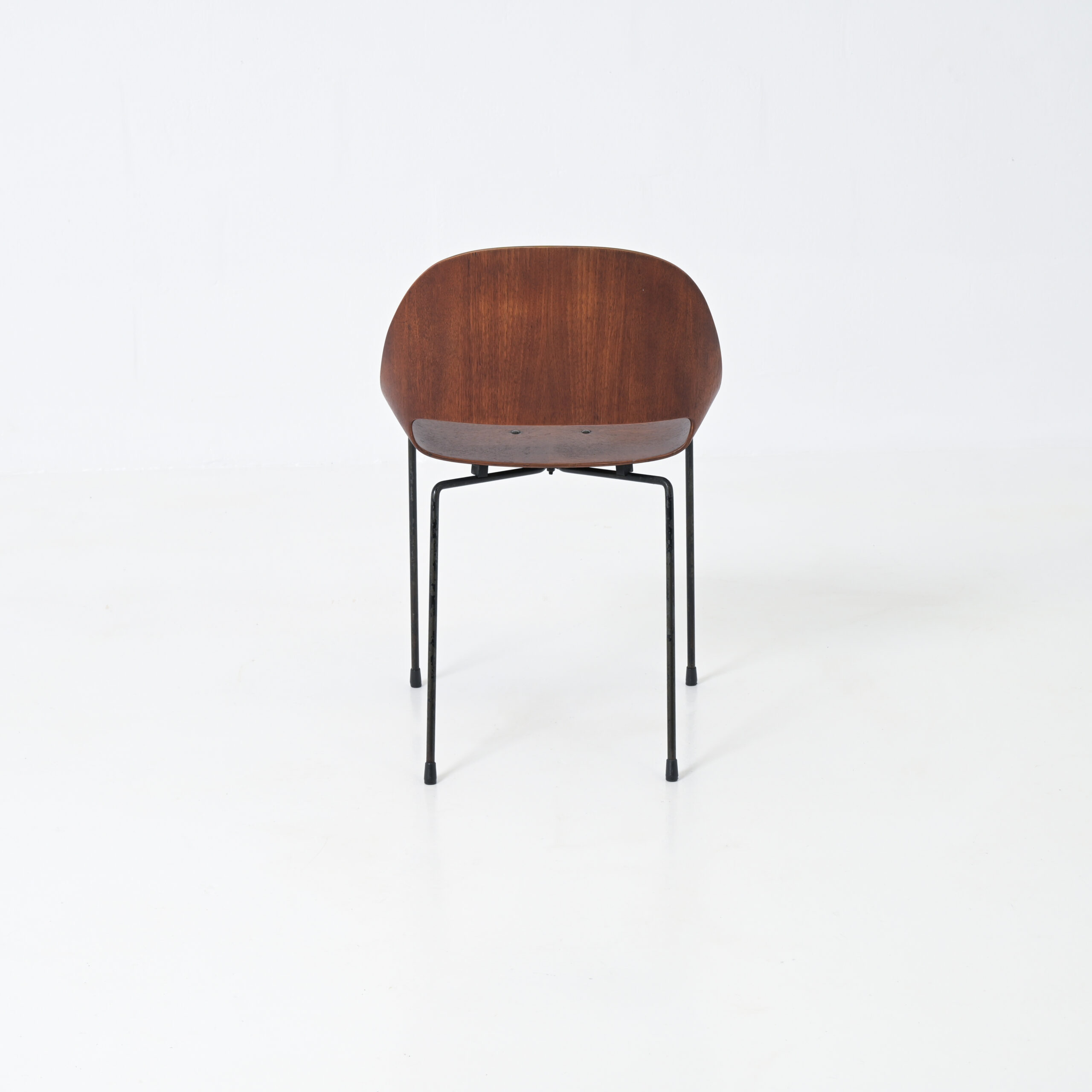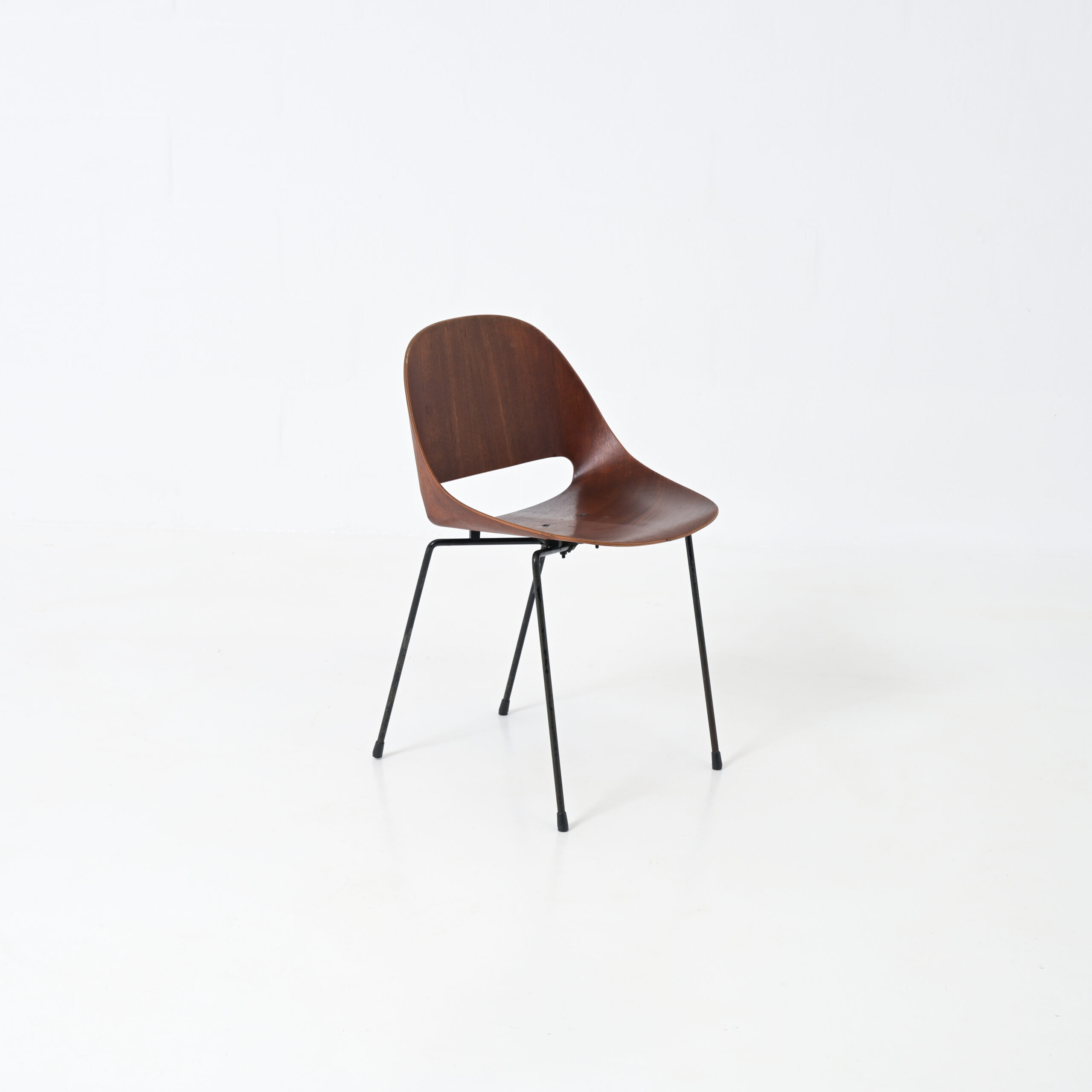 This is the most famous design of Stynen, which he realized together with his assistant Paul de Meyer. The chair was brought onto the market on the occasion of Expo 58 by the Antwerp company Straatman, Loral en Cie. An elegant chair with steel legs and a seat made of pleated plywood.