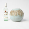 The vase is asymmetrical shaped and the light blue glaze makes it very tactile.
