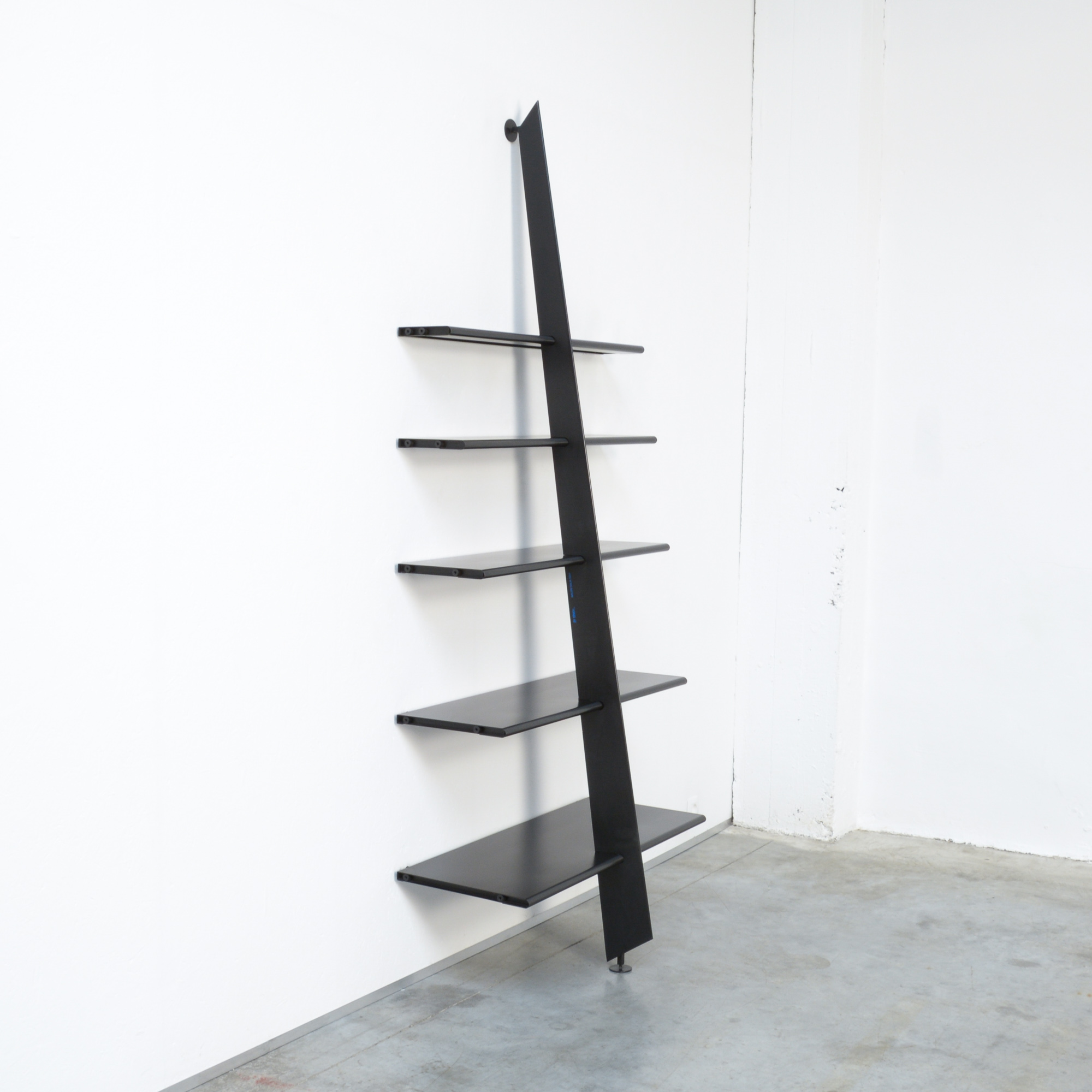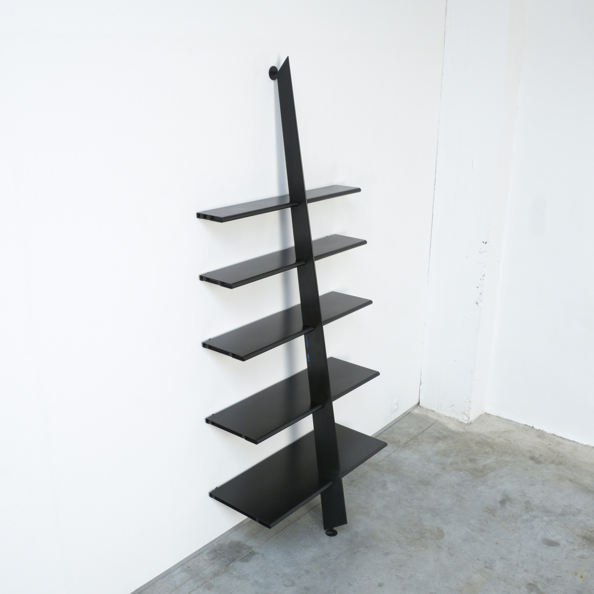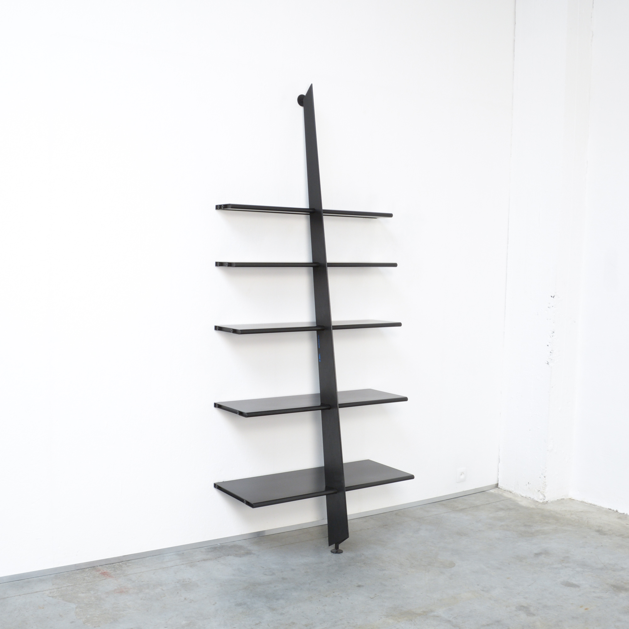 The Mac Gee book shelf was designed by Philippe Starck in cooperation with Baleri Italia in 1984 in the beginning of his career. This Mac Gee book shelf is made of black metal. The central pillar has to be fixed on the wall. The five shelves of decreasing depth are inspired by the blade profile of an airplane.