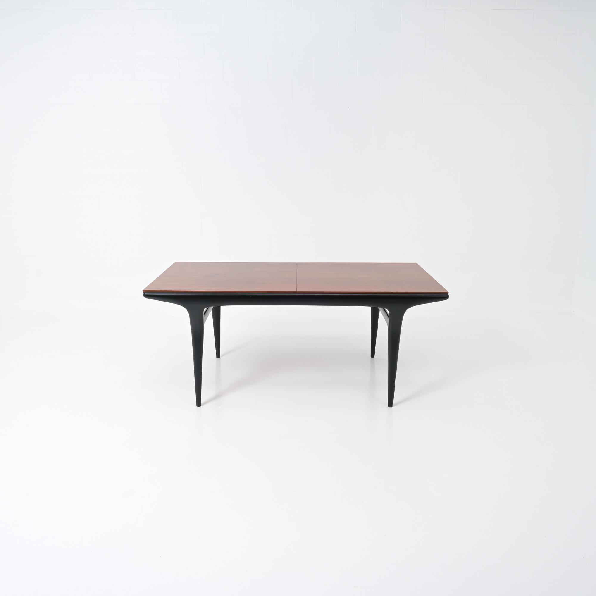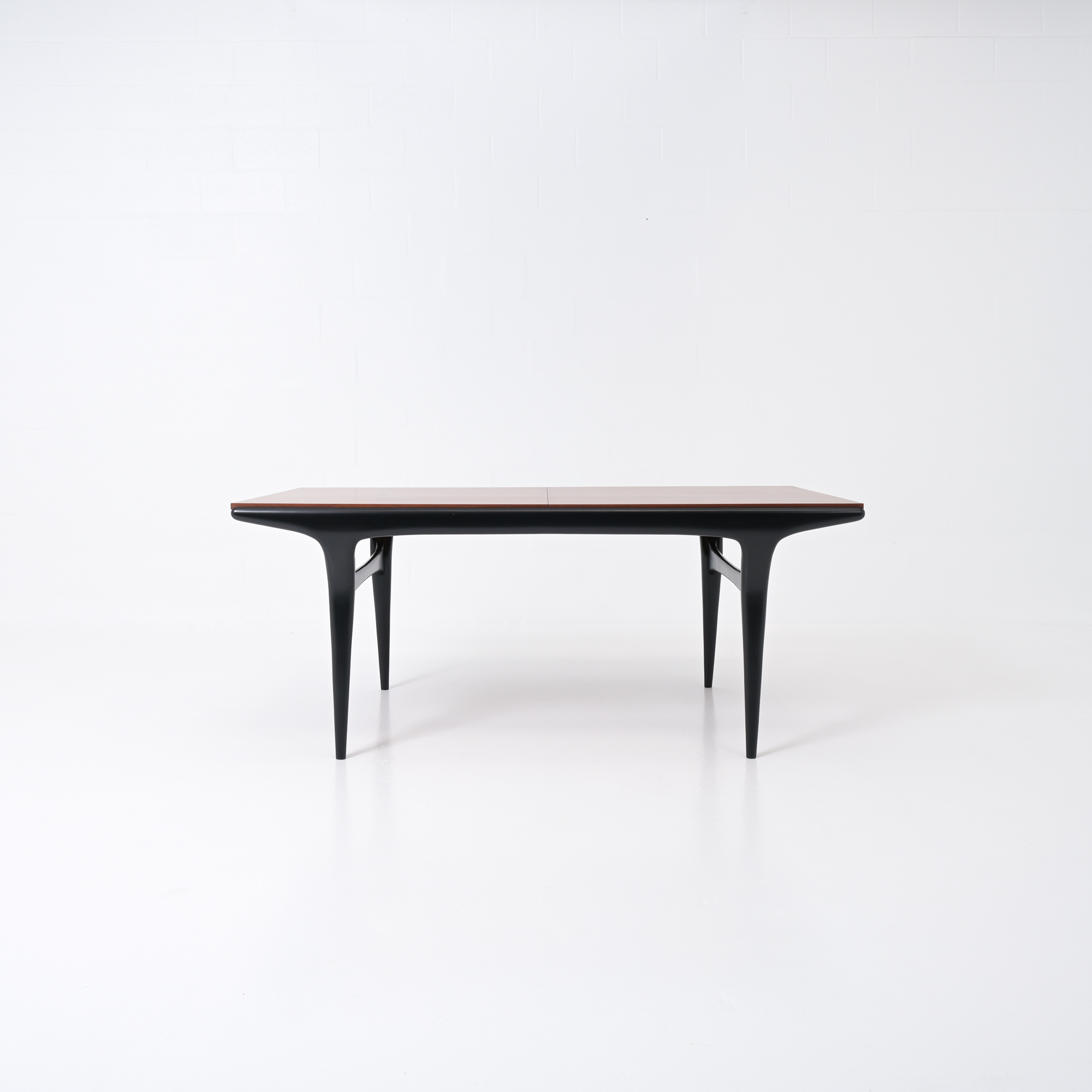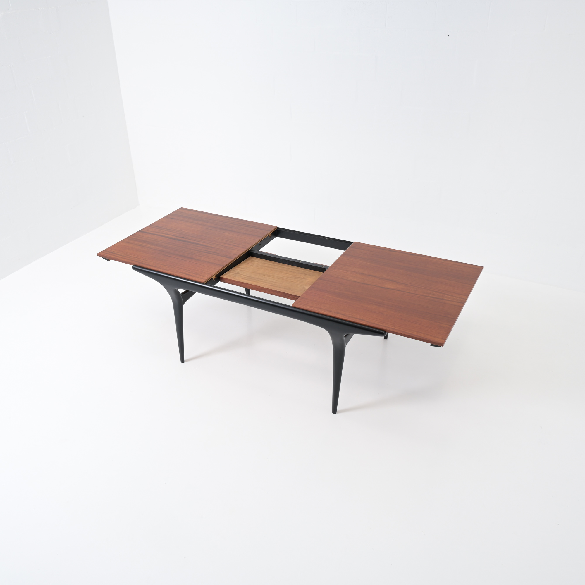 The organic shaped black lacquered base is pure elegancy. The table top is extendable(60cm) and in perfect condition, the table is professional refinished by Master Meubel..