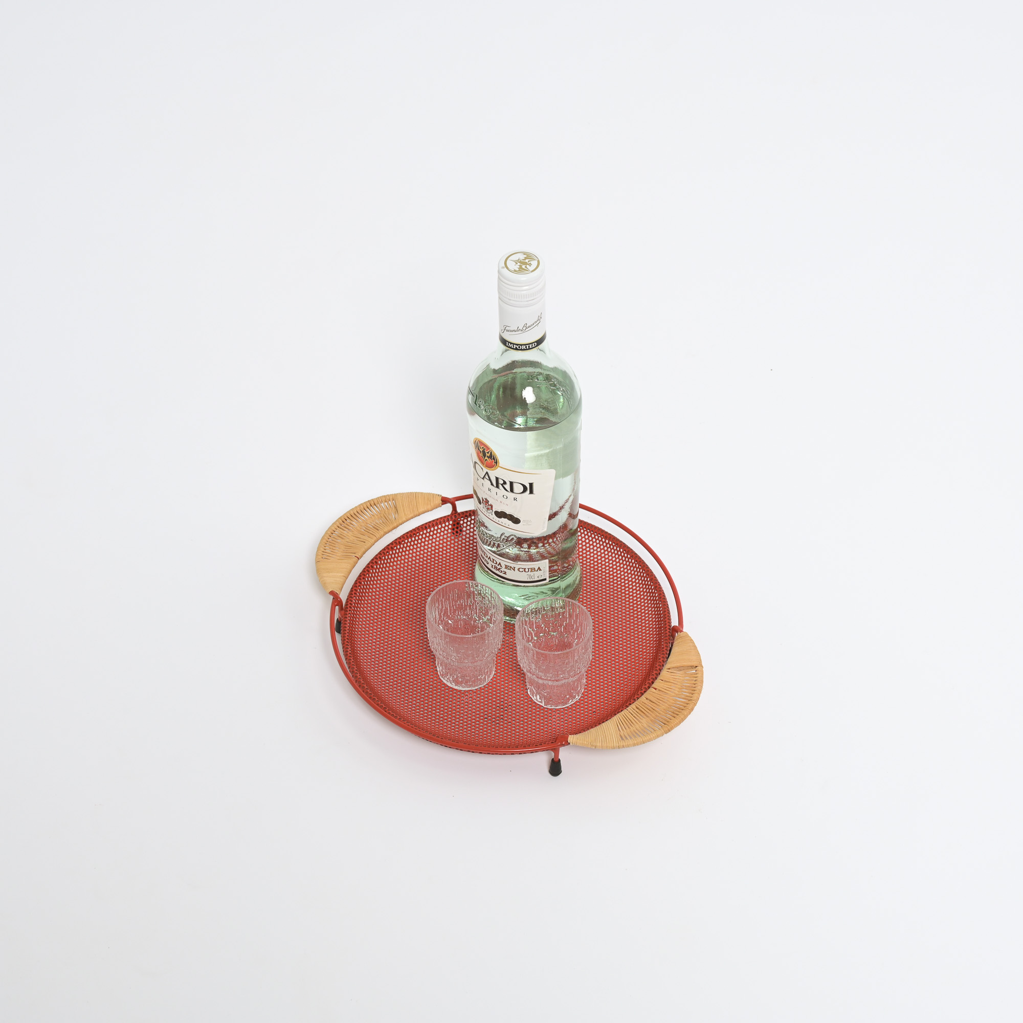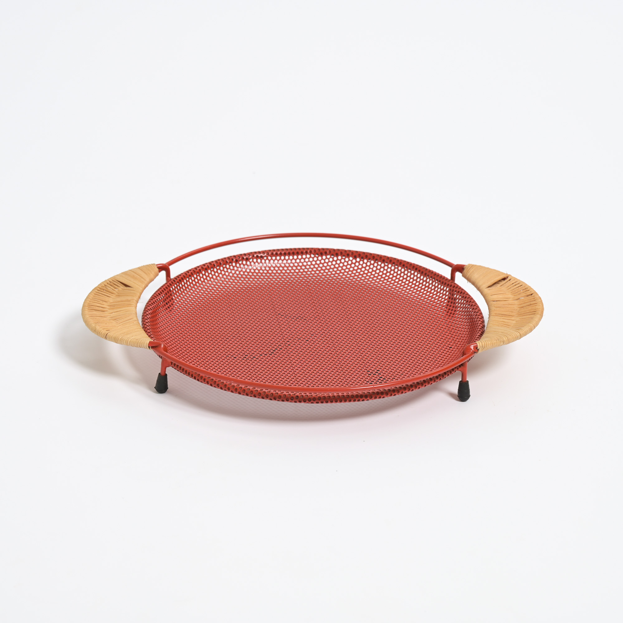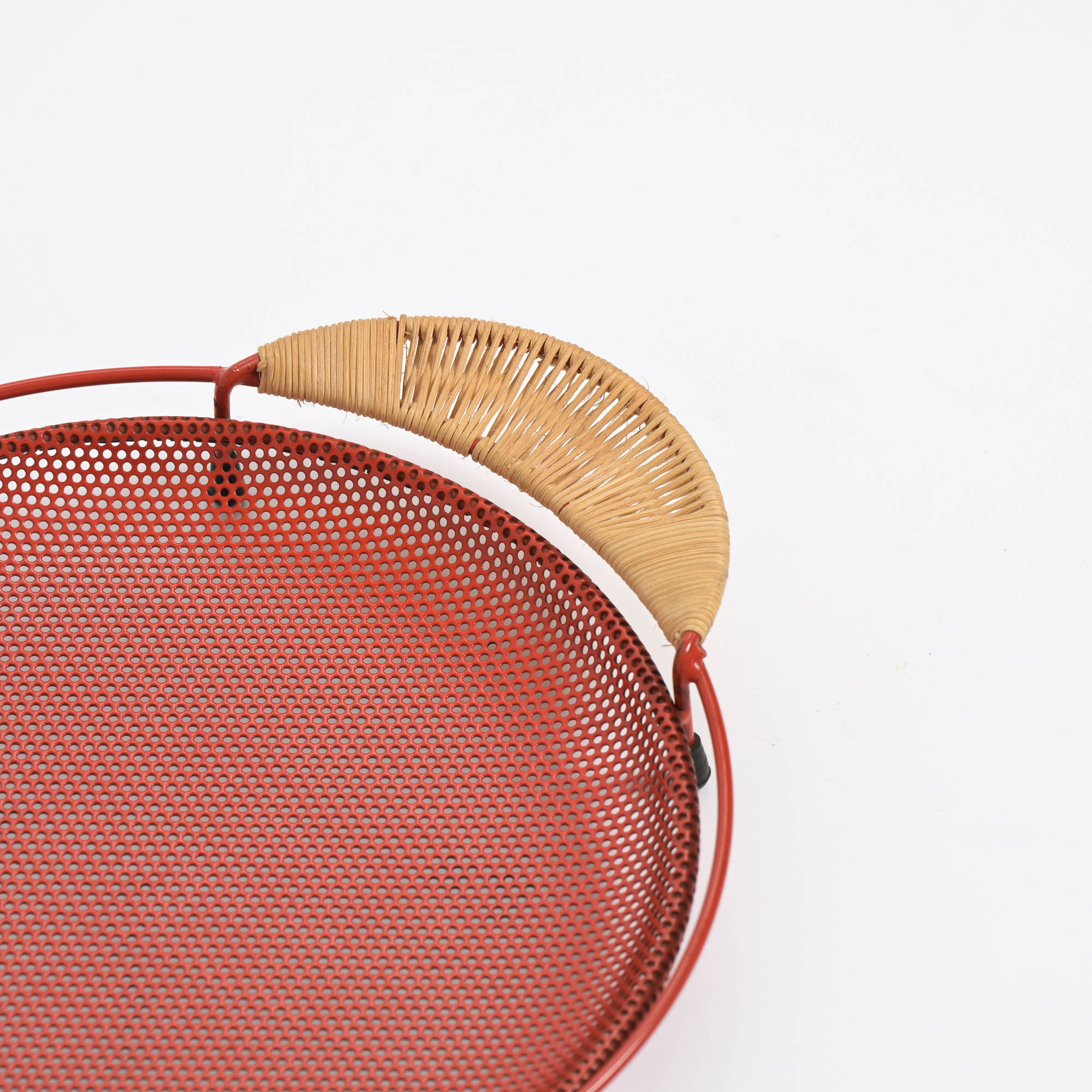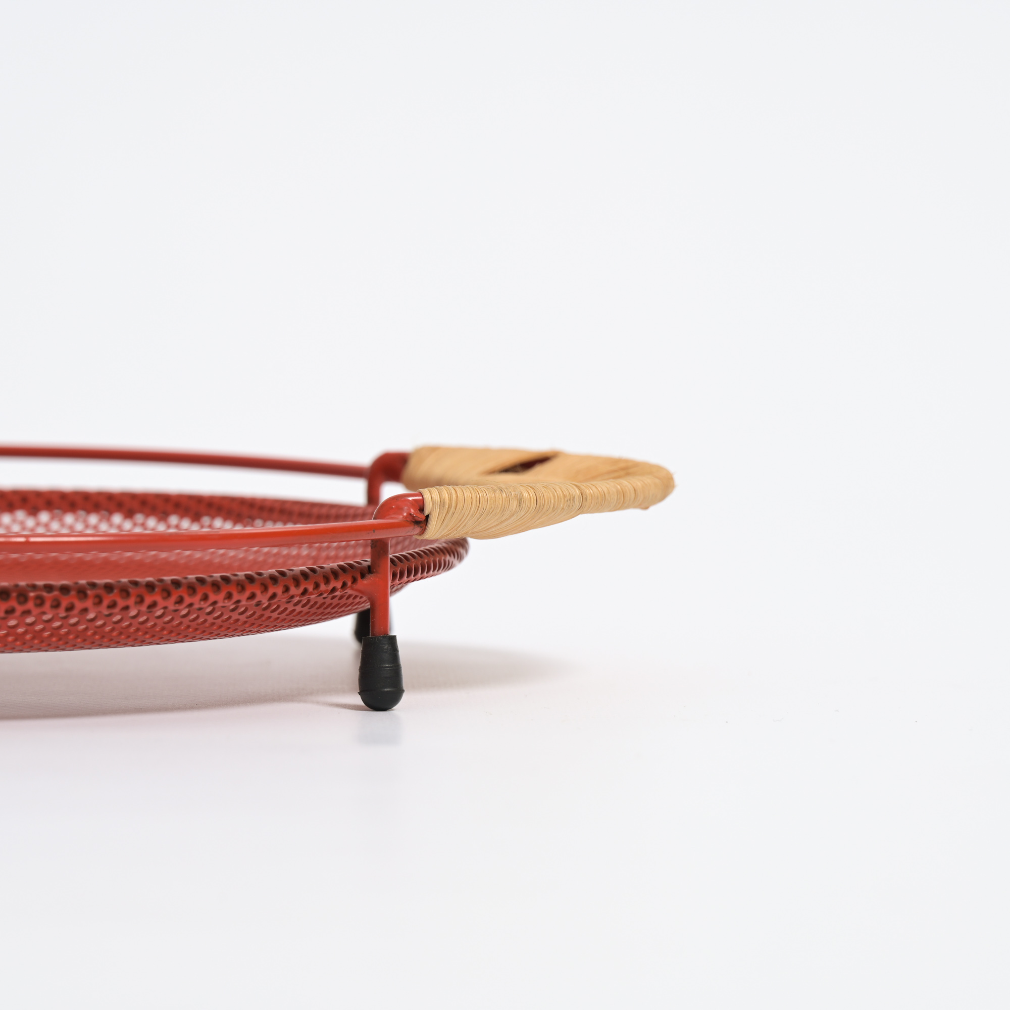 This serving tray is designed by Mathieu Matégot in the 50ties. It has beautiful handels finished with wicker which perfectly match with the red perforated metal round plate. It has 4 rubber feet.