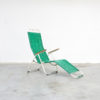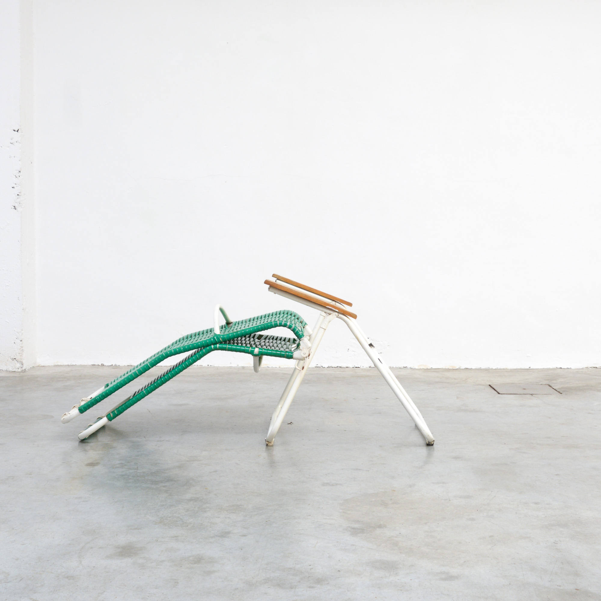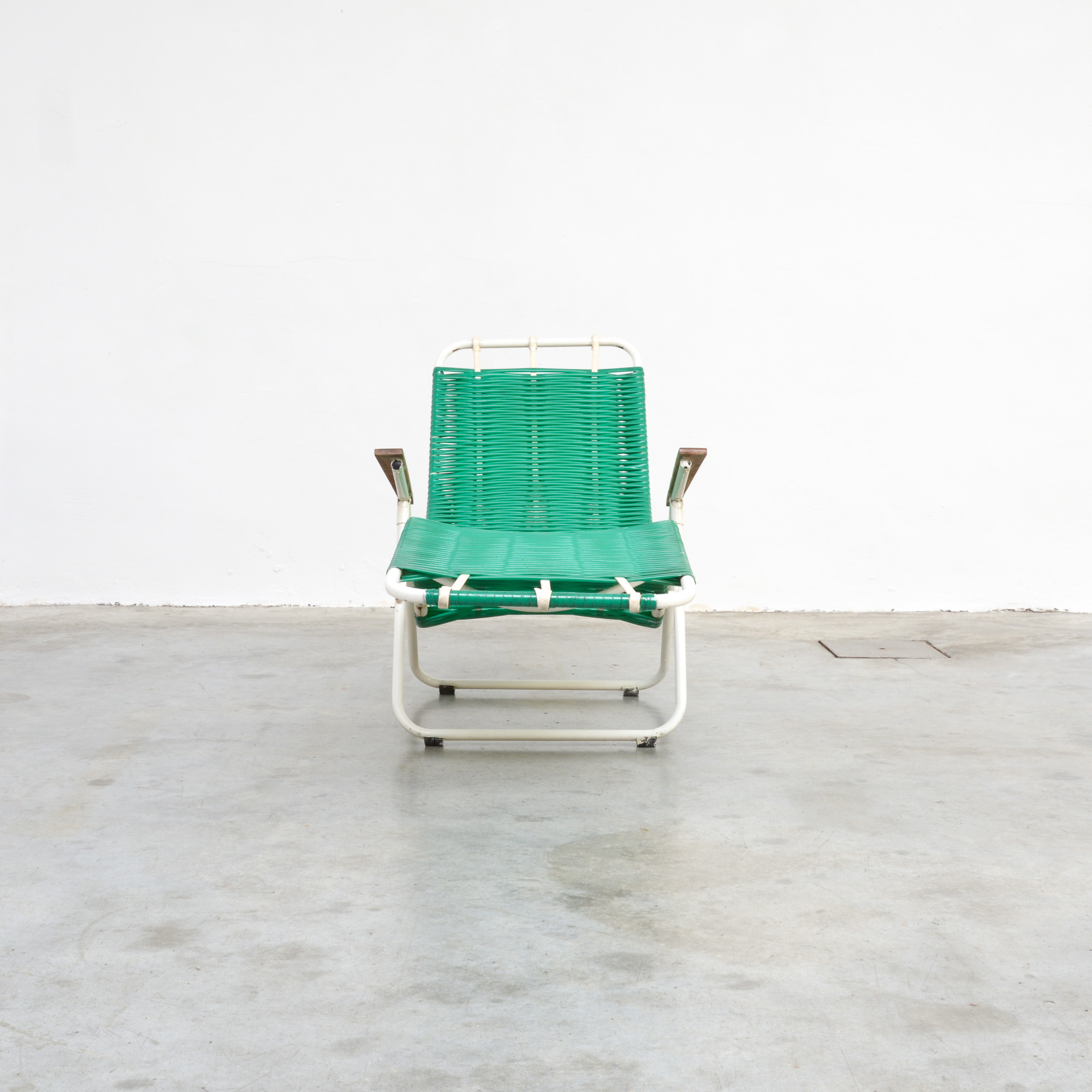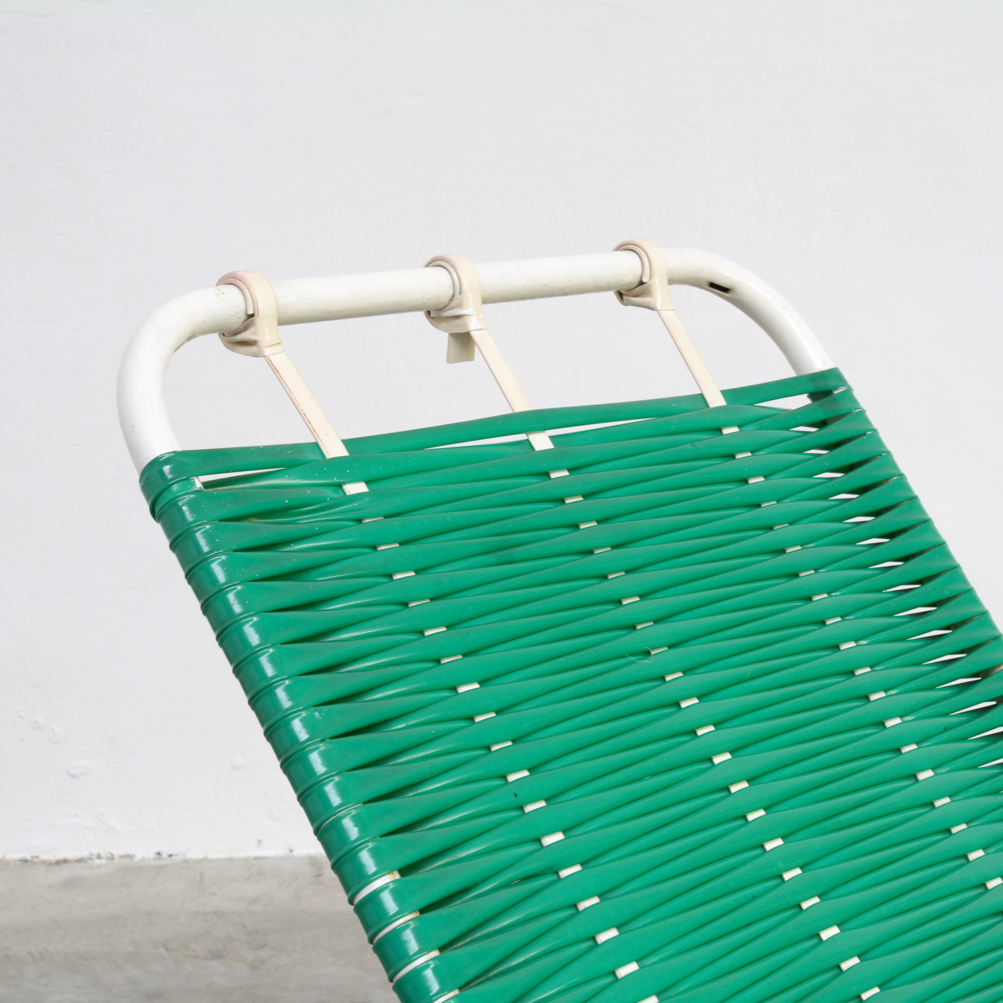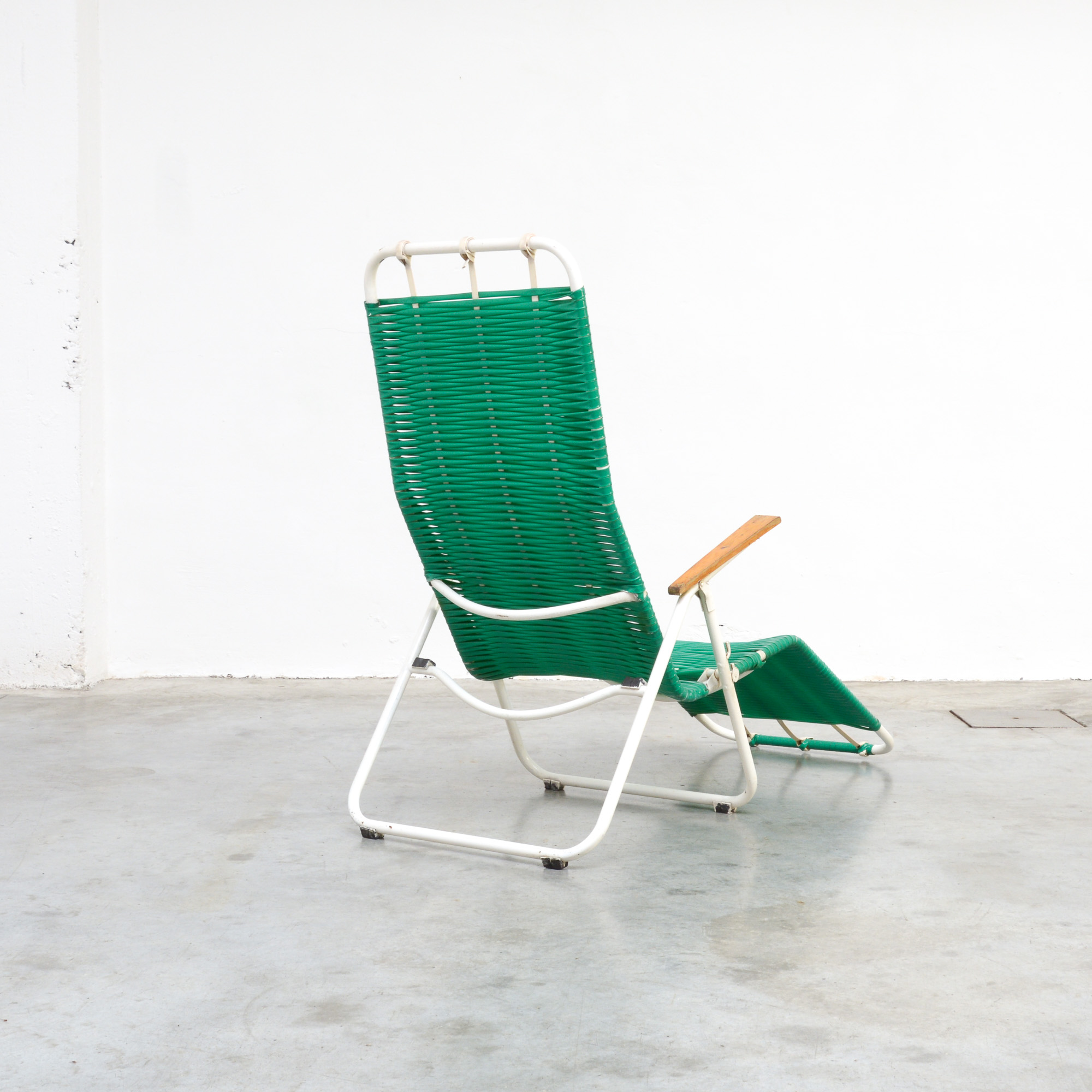 This green garden lounge chair can be dated in the 1950s. The white lacquered frame is finished with woven green plastic cords and wooden armrests.