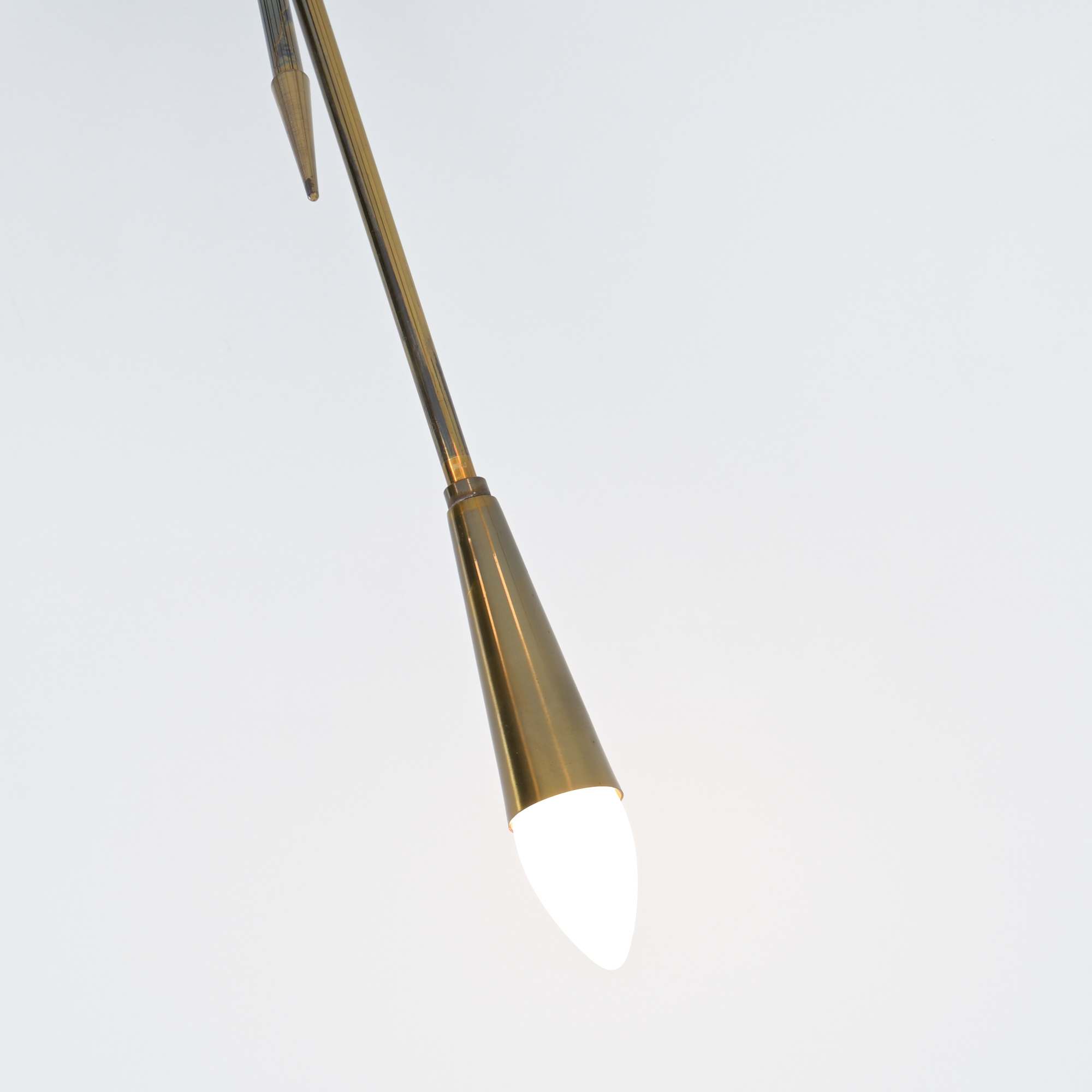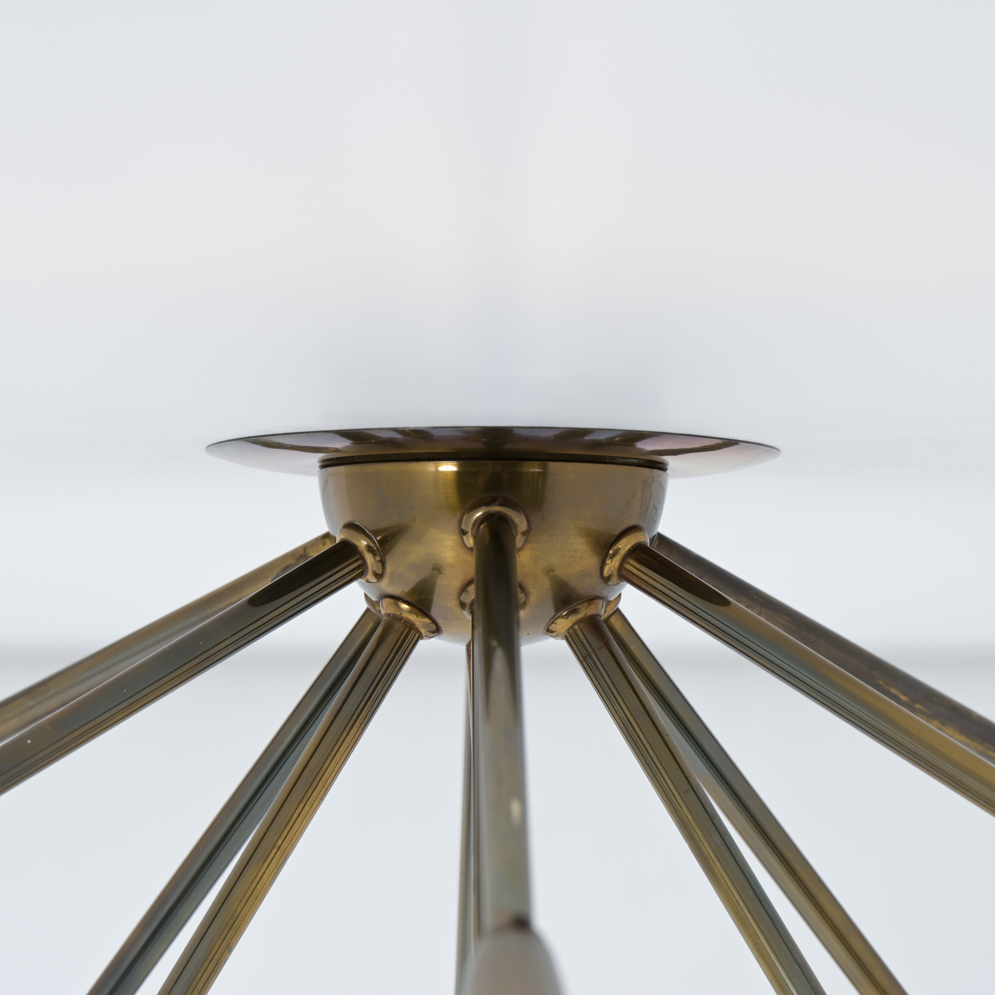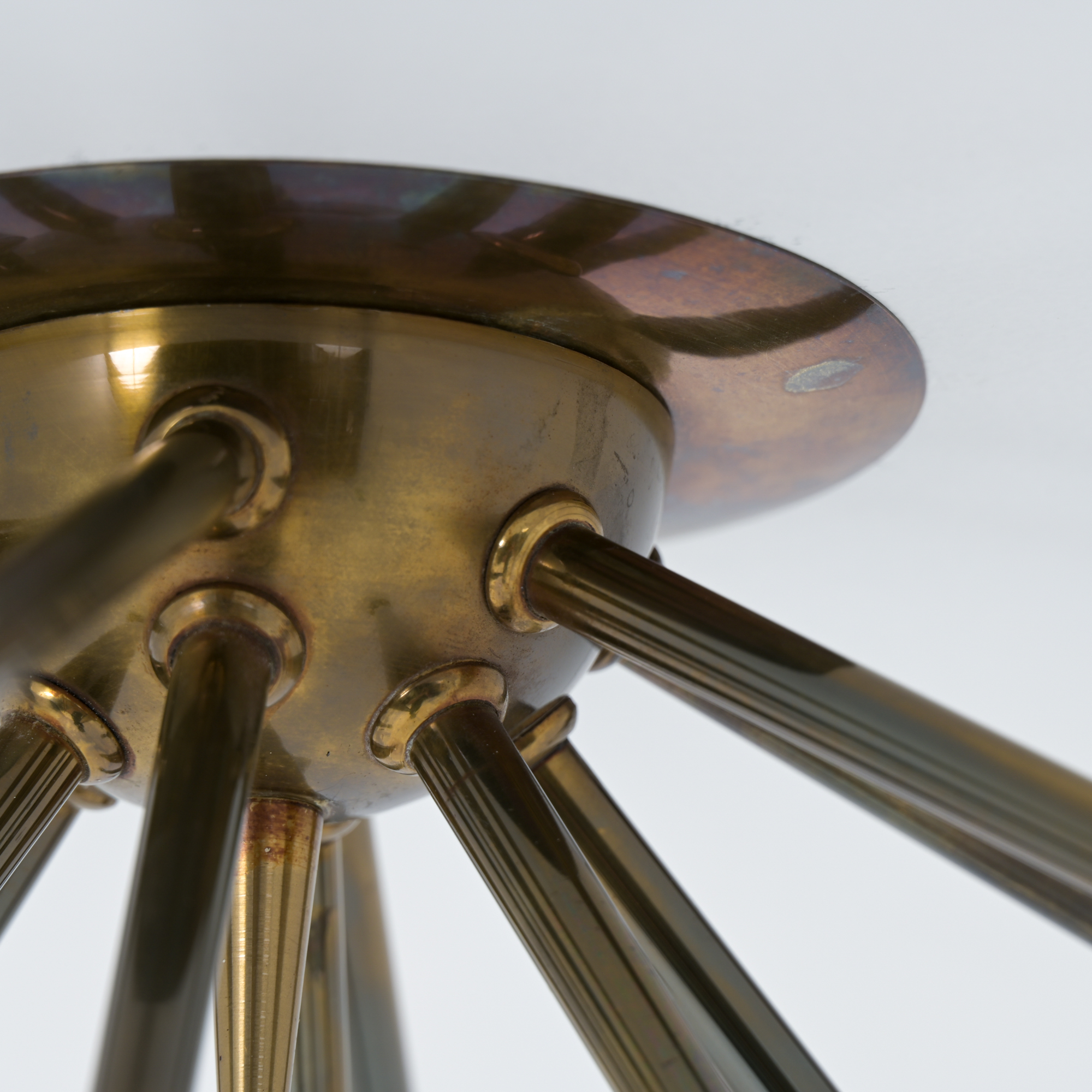 This sputnik chandelier dates back to the 1960s. Its casing is made of brass elements with several arms and legs, either decorative or providing lamp sockets.
