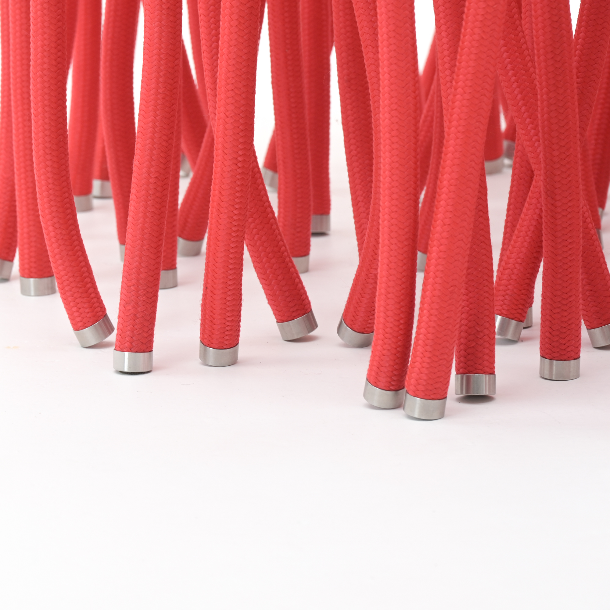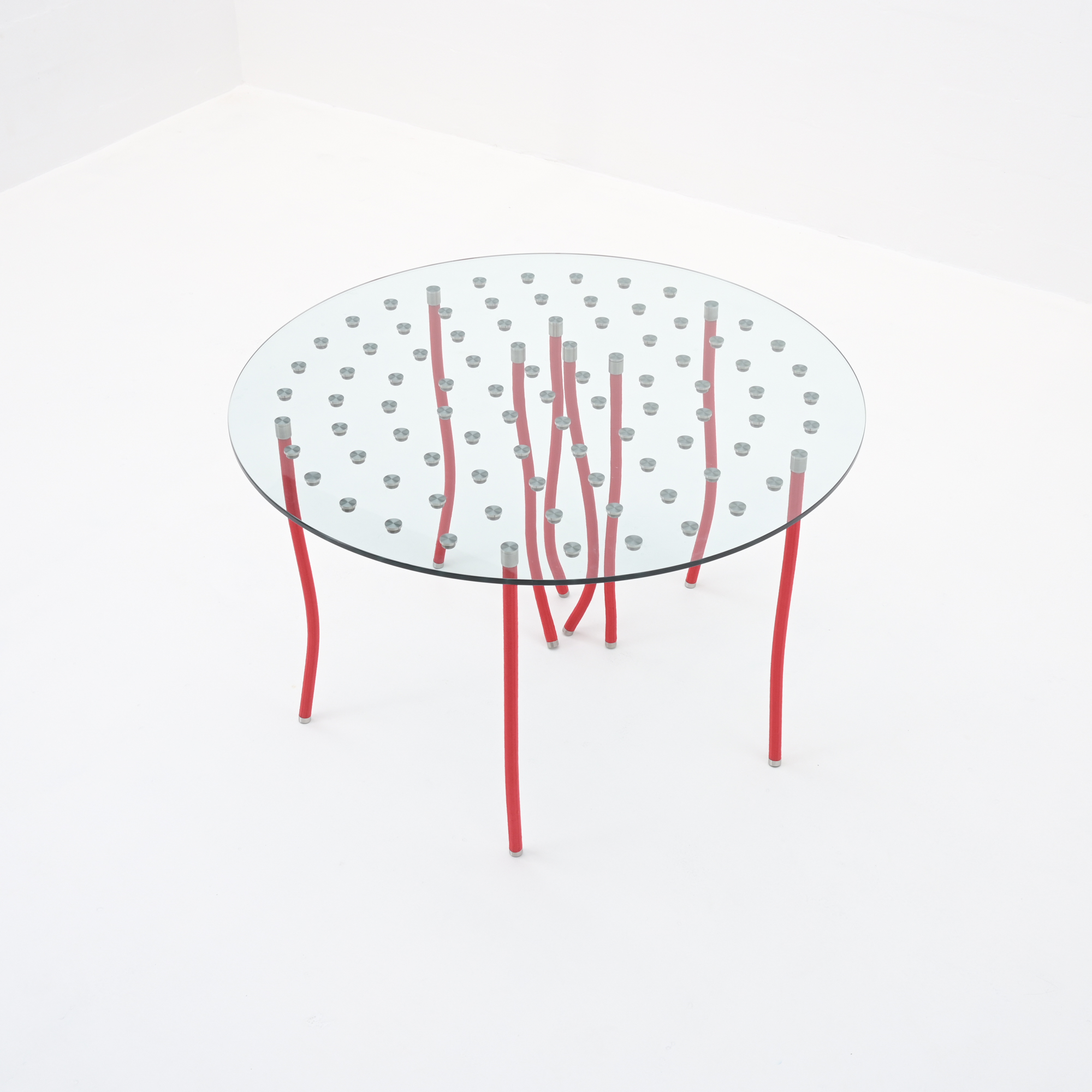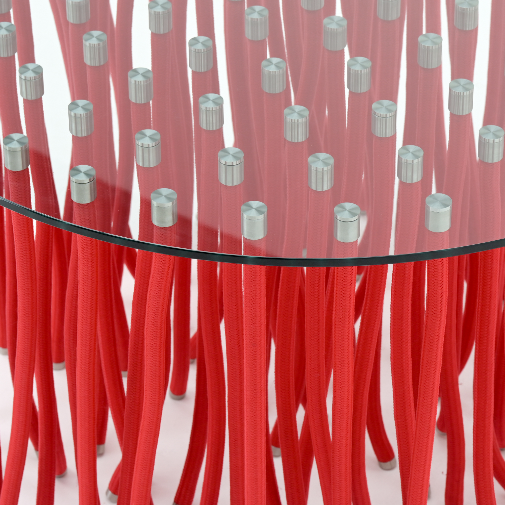 This red ORG dining table was designed by Fabio Novembre in 2001 for Cappellini. This amazing table is made of a crystal glass top supported by polypropylene rope-covered steel with exposed stainless-steel fitting. Only 5 legs support the table top. The other legs have no load-bearing function, they are just free hanging and create a trompe l’oeil effect, a visual delusion.