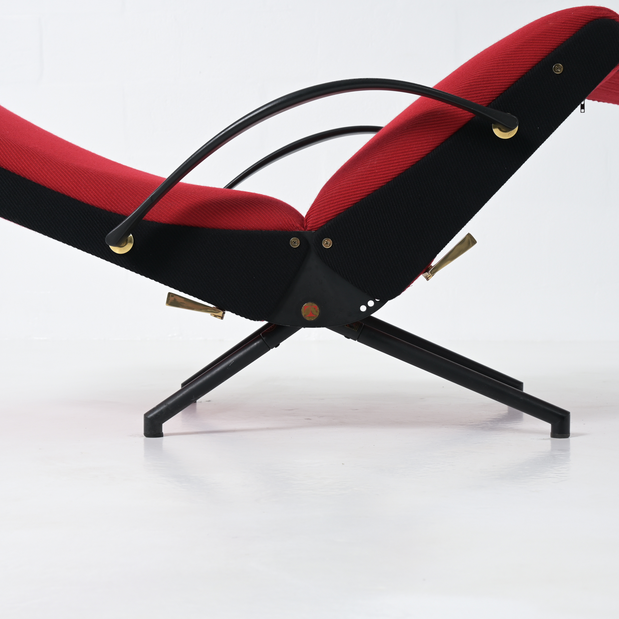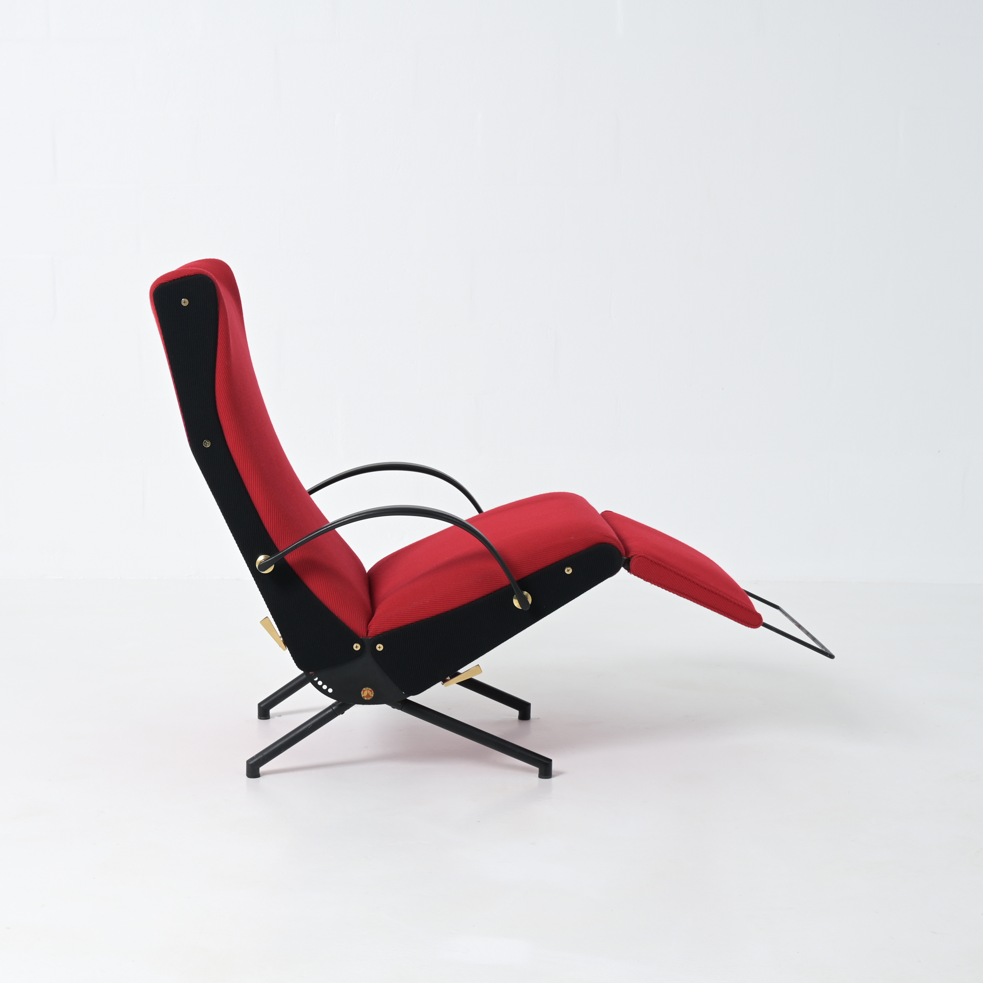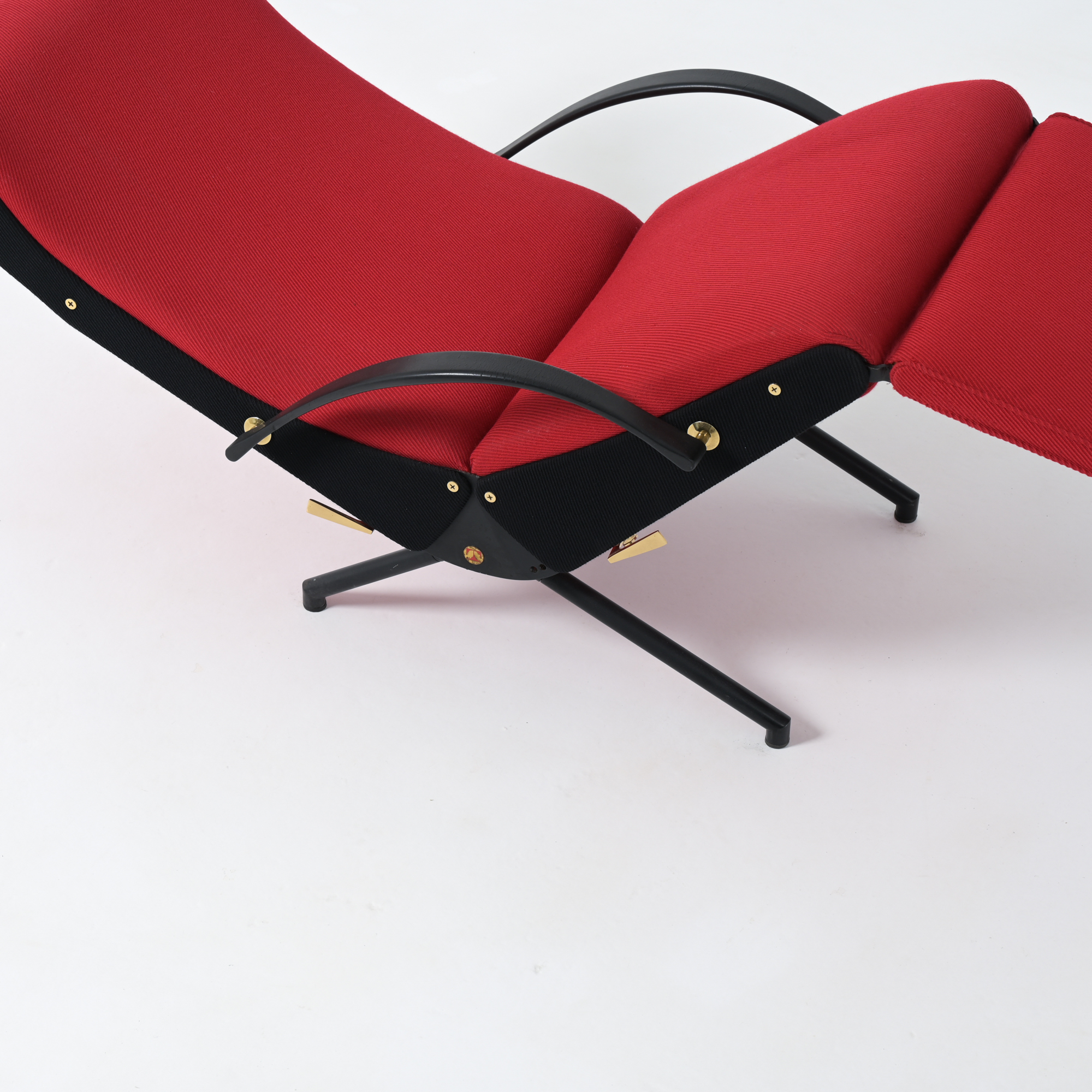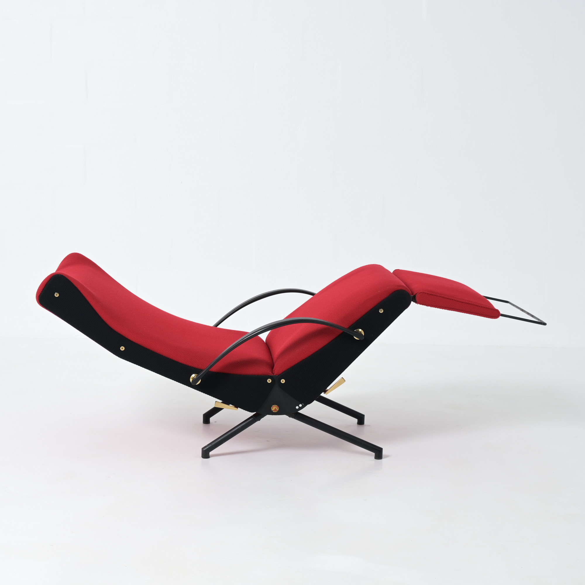 This is the first edition of the P40. Its upholstery has been renewed with vibrant red fabric complemented by black fabric. The armrests are made of steel and rubber. All structural parts are black lacquered metal.