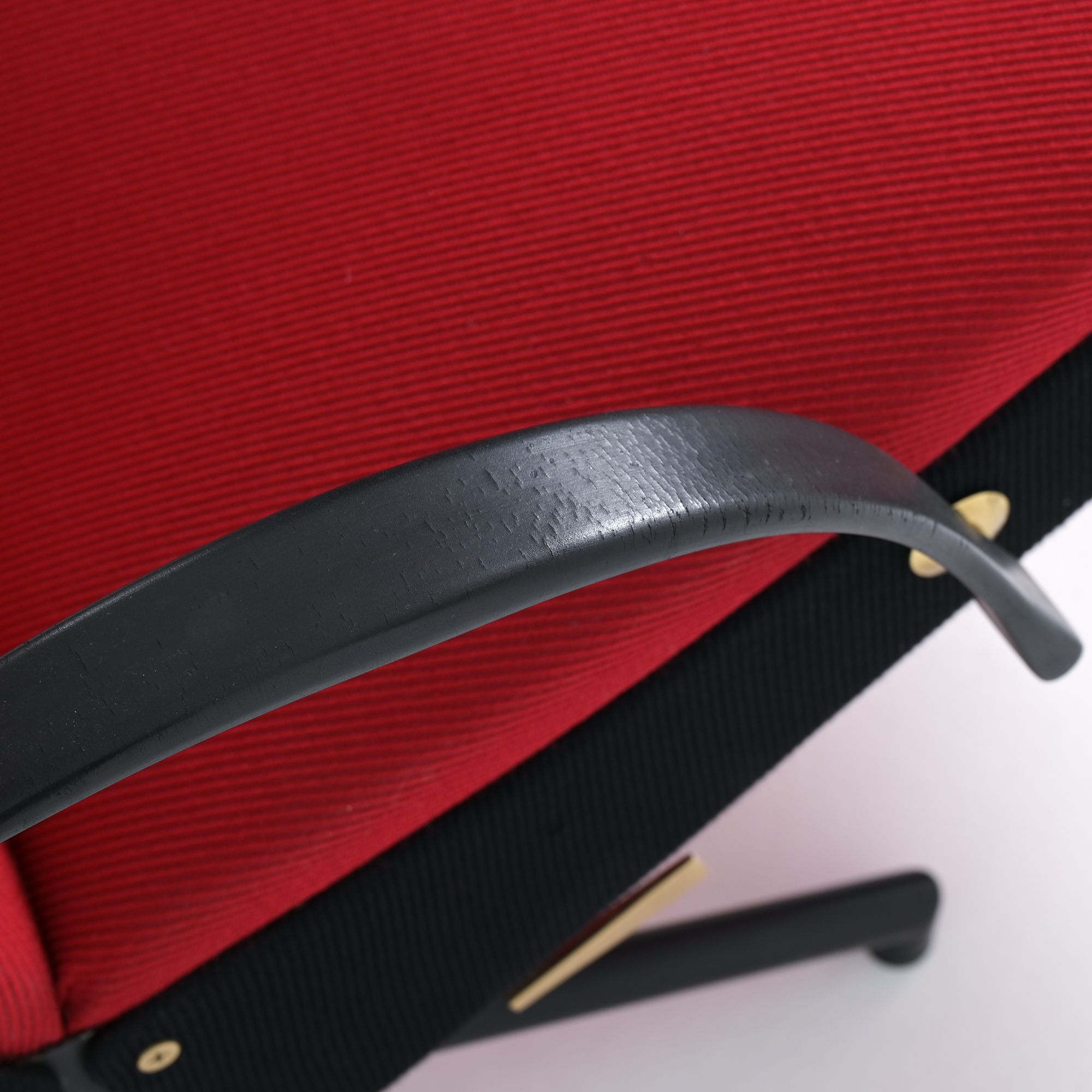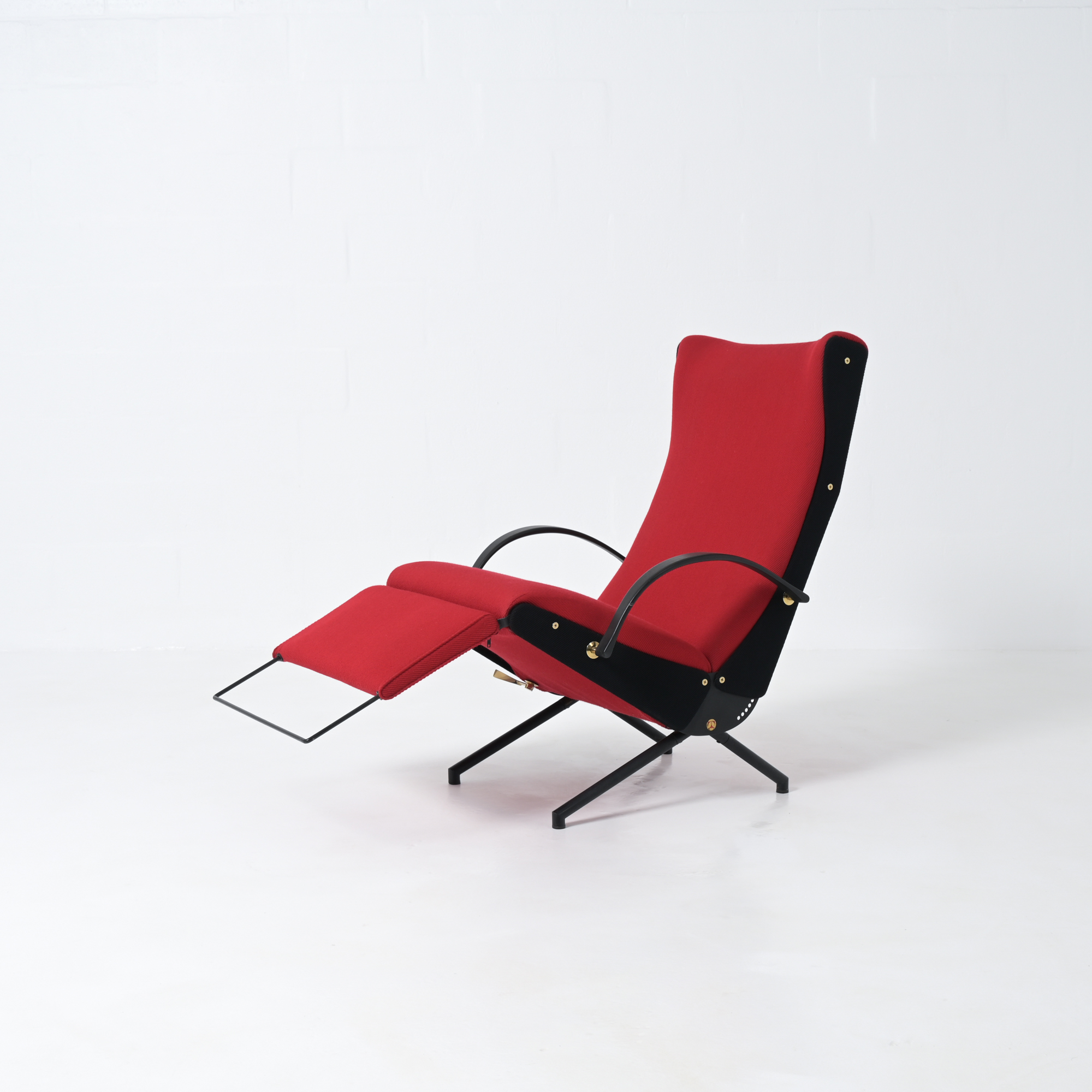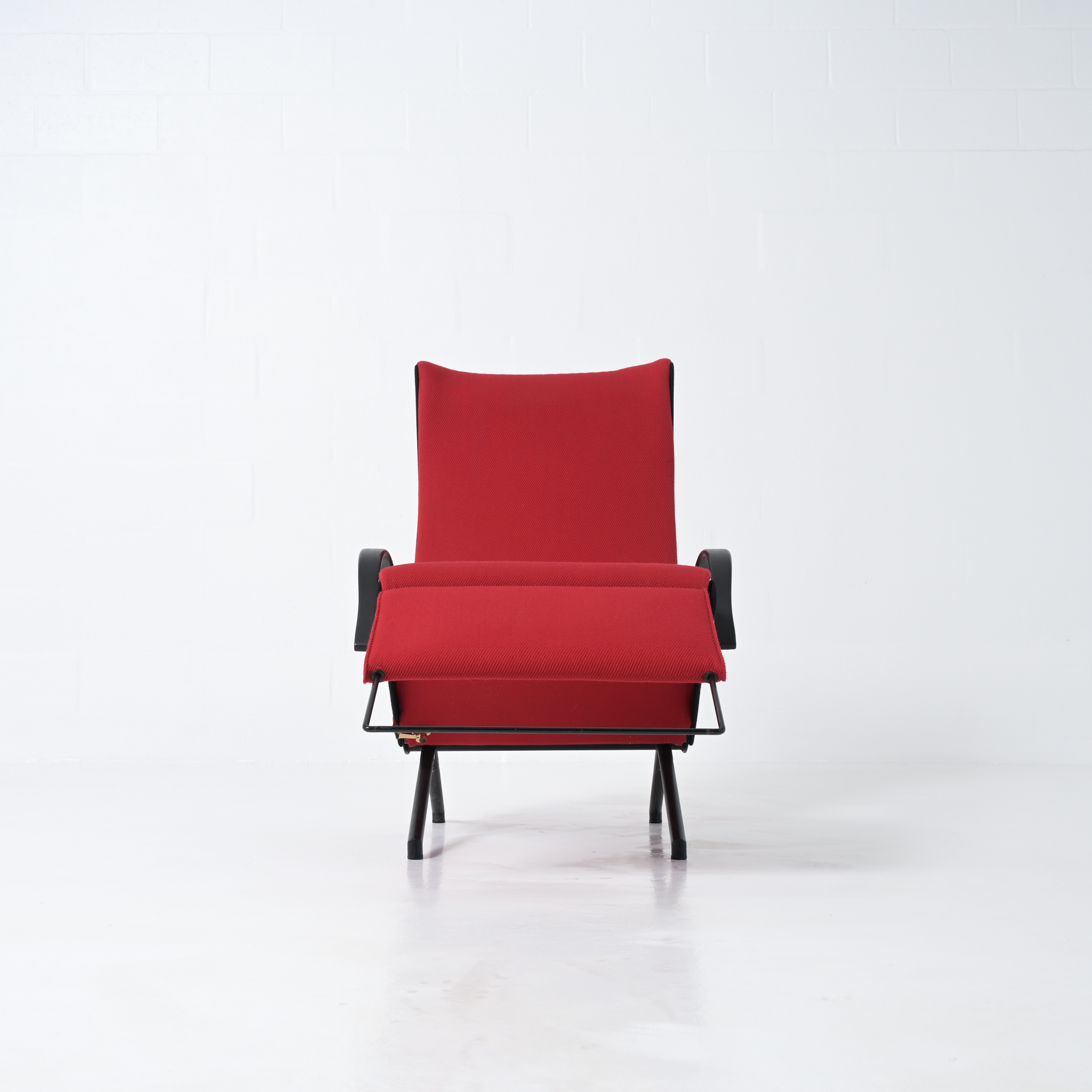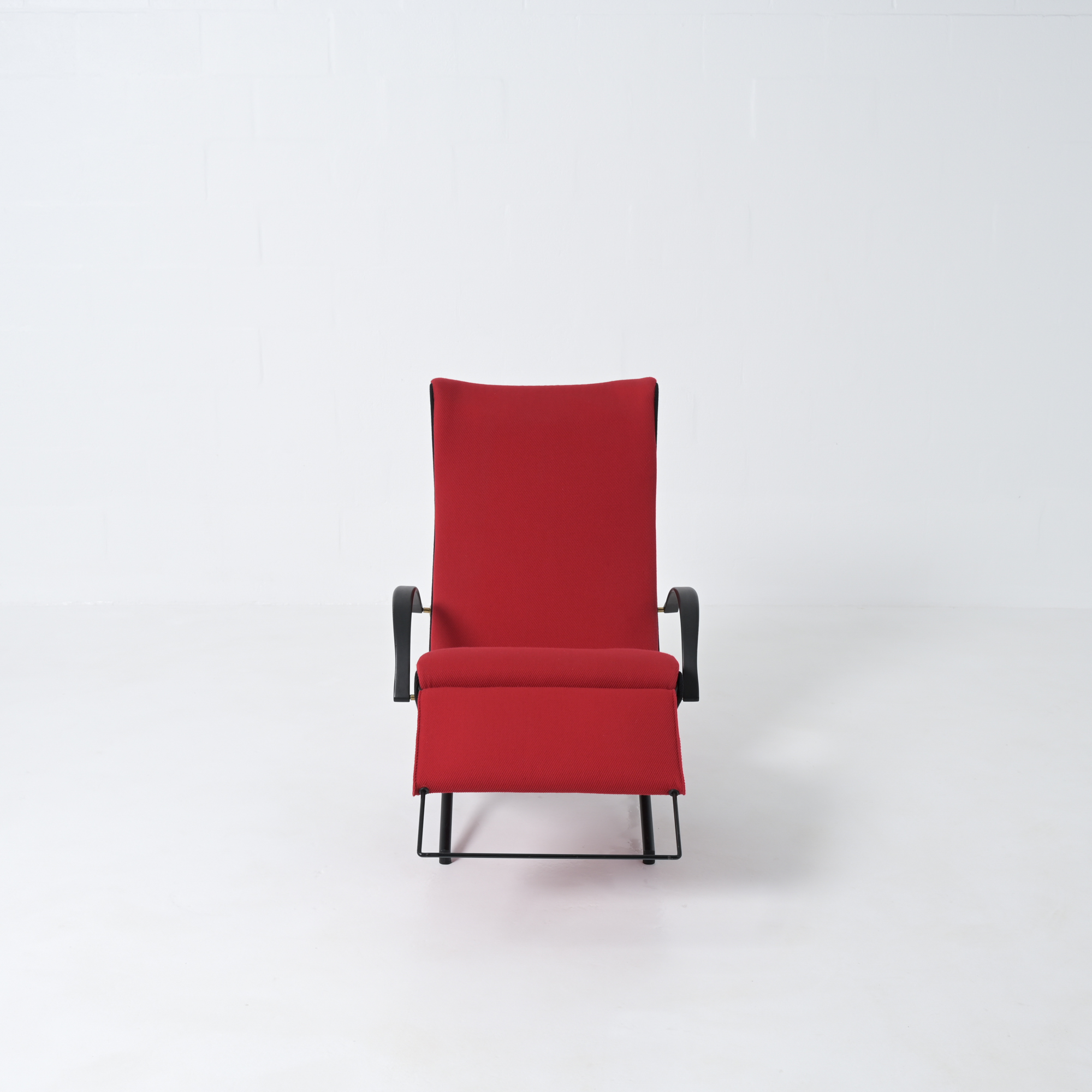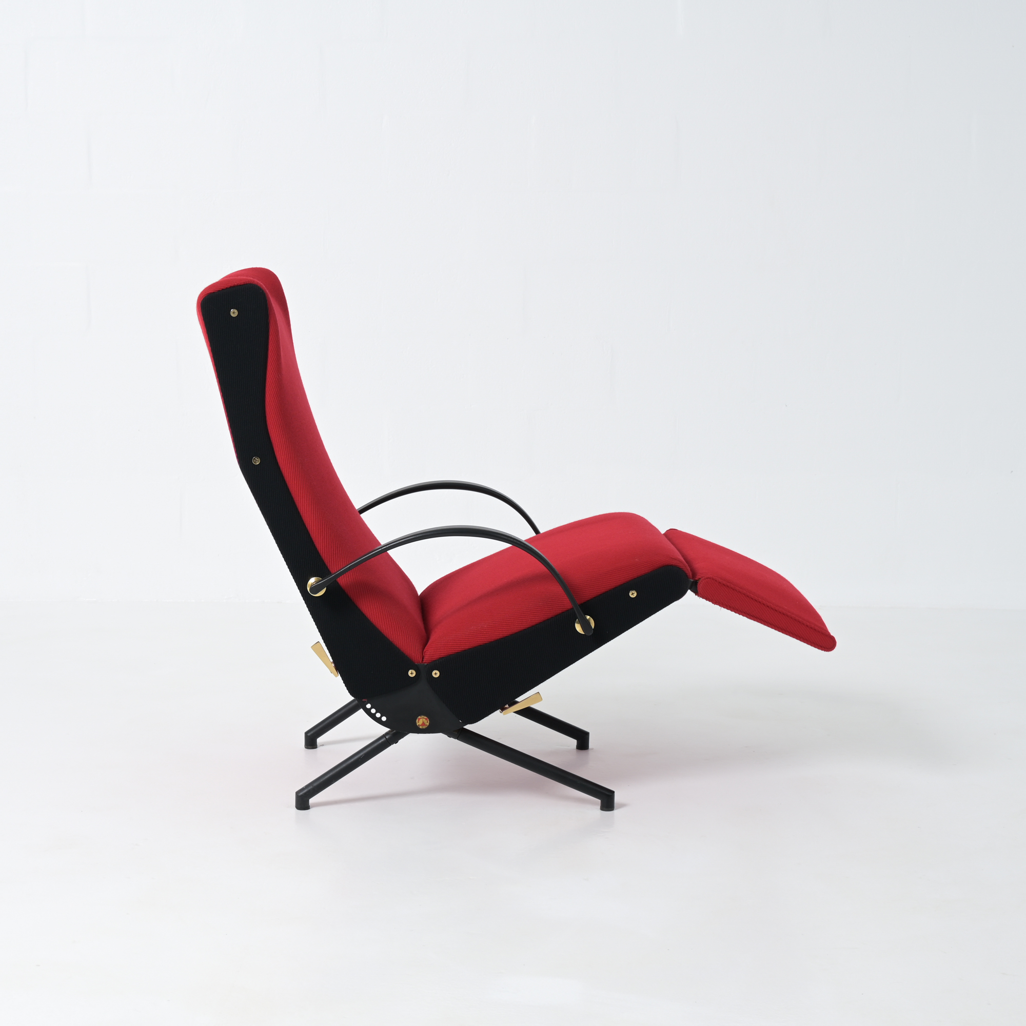 This is the first edition of the P40. Its upholstery has been renewed with vibrant red fabric complemented by black fabric. The armrests are made of steel and rubber. All structural parts are black lacquered metal.