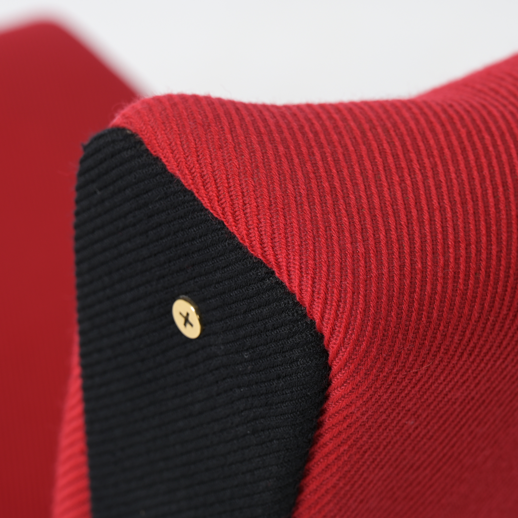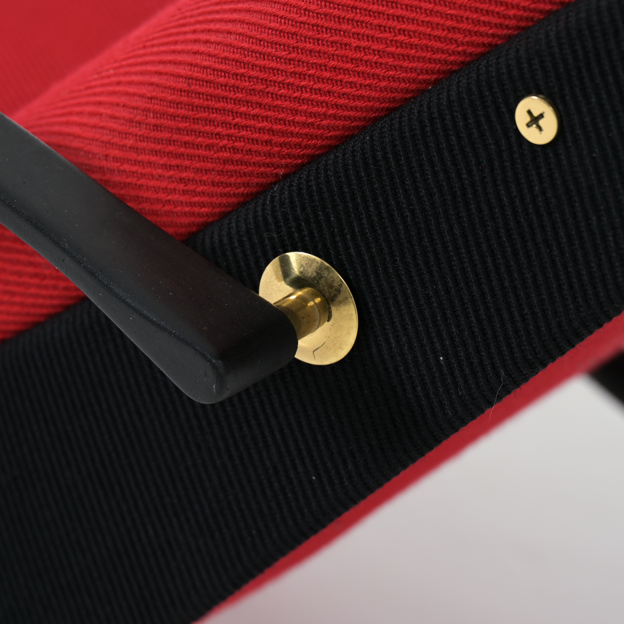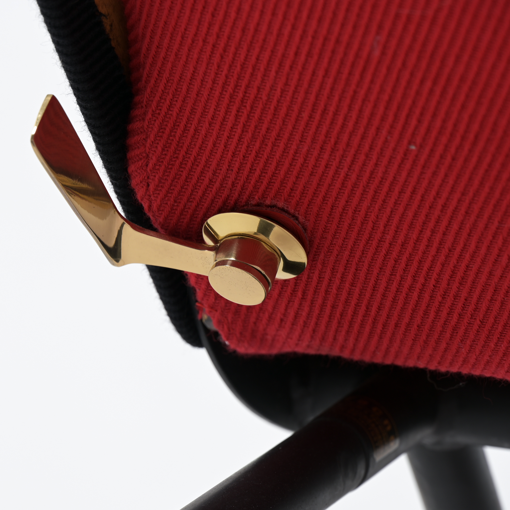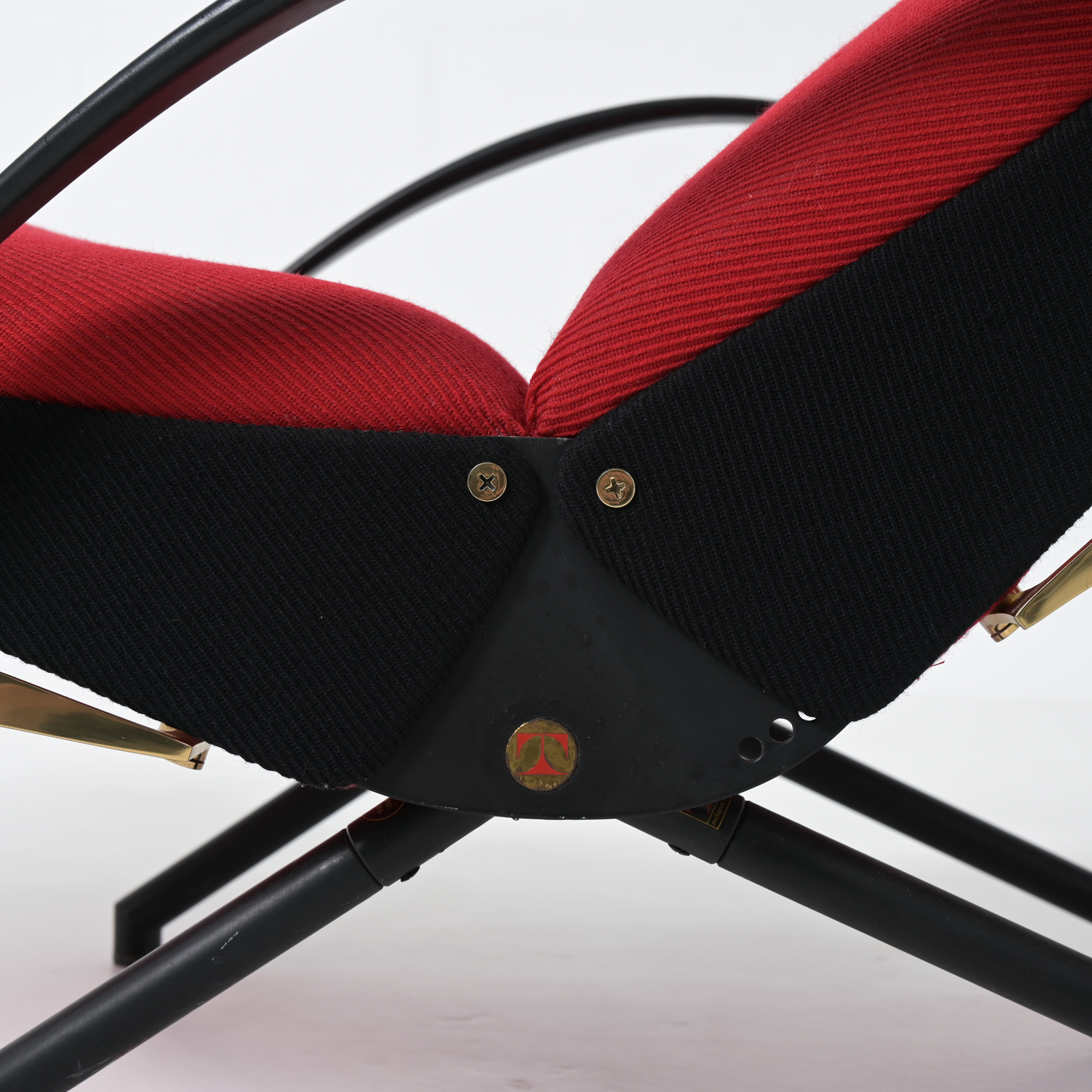 This is the first edition of the P40. Its upholstery has been renewed with vibrant red fabric complemented by black fabric. The armrests are made of steel and rubber. All structural parts are black lacquered metal.
