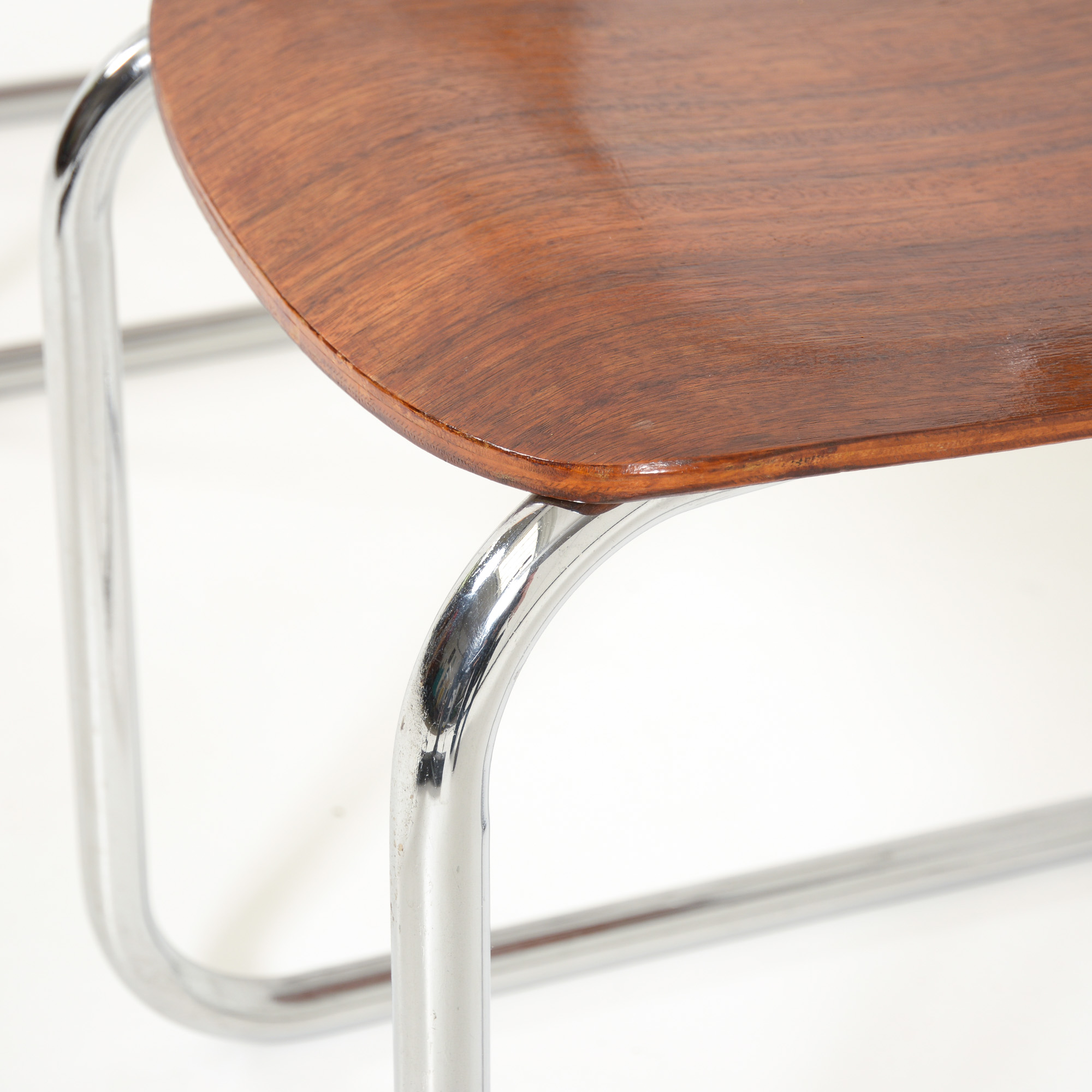 This anonymous design is a great example of craftsmanship: the nice detailed chrome tubular metal base with special screws, the plywood seat and back rest, the armrests finished with solid wood.