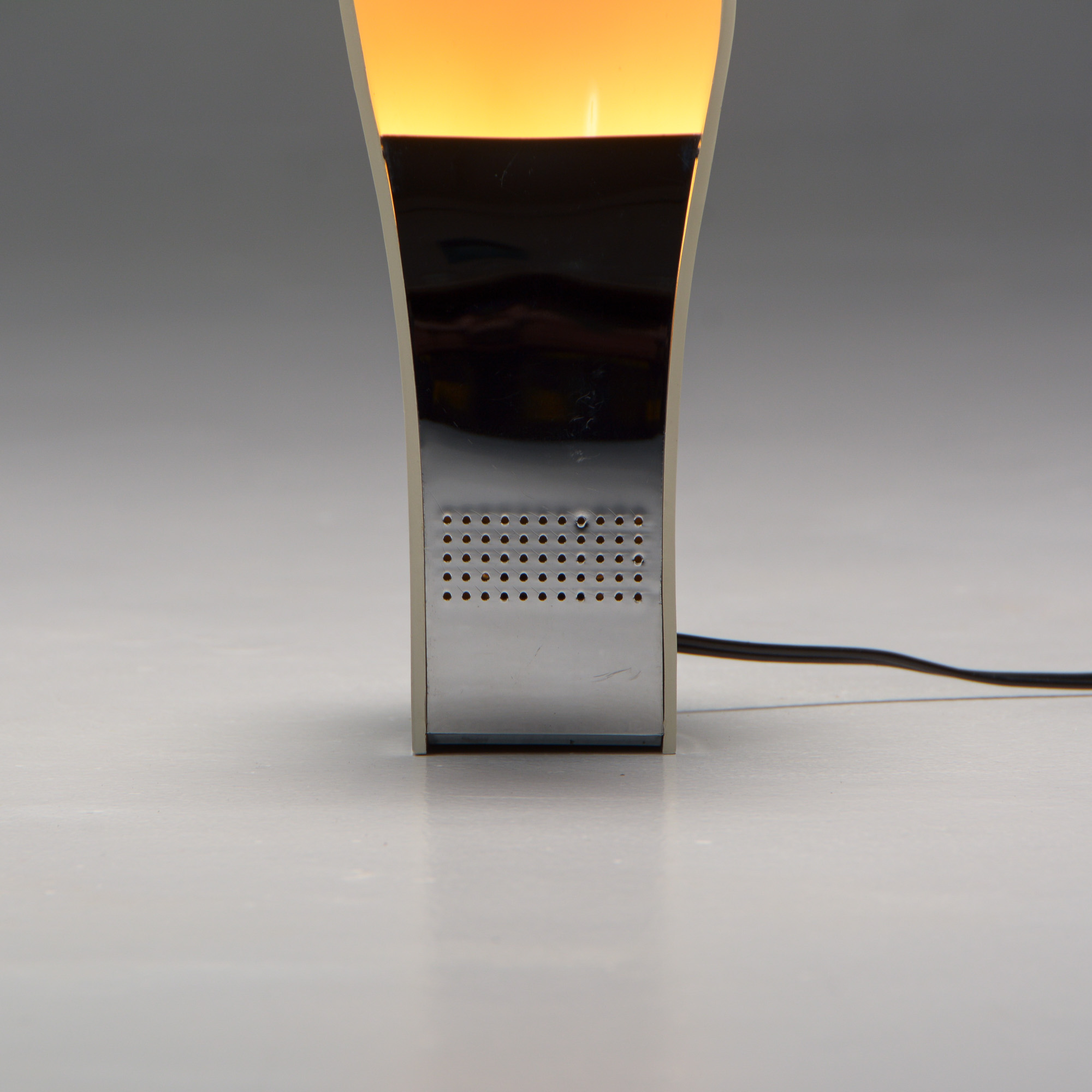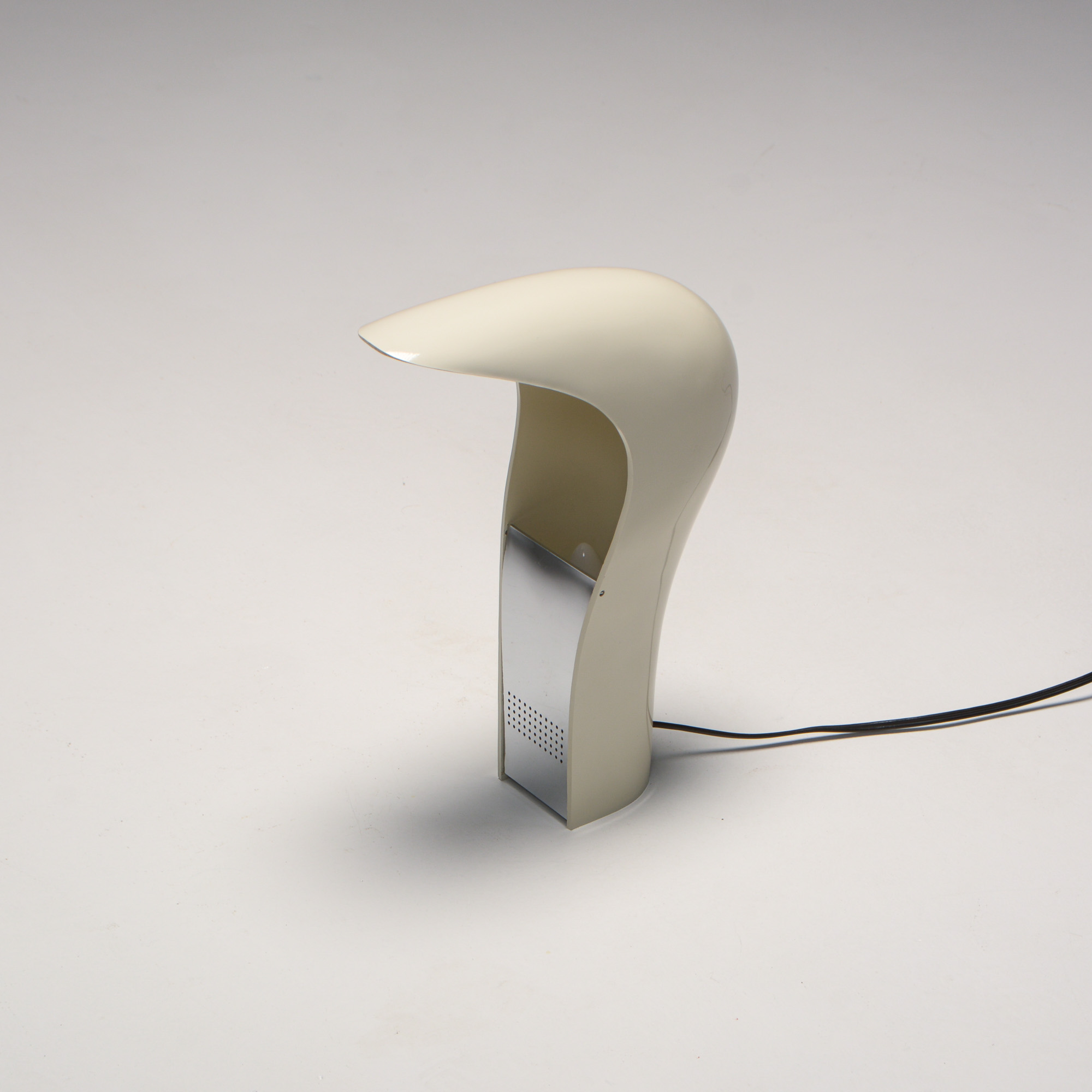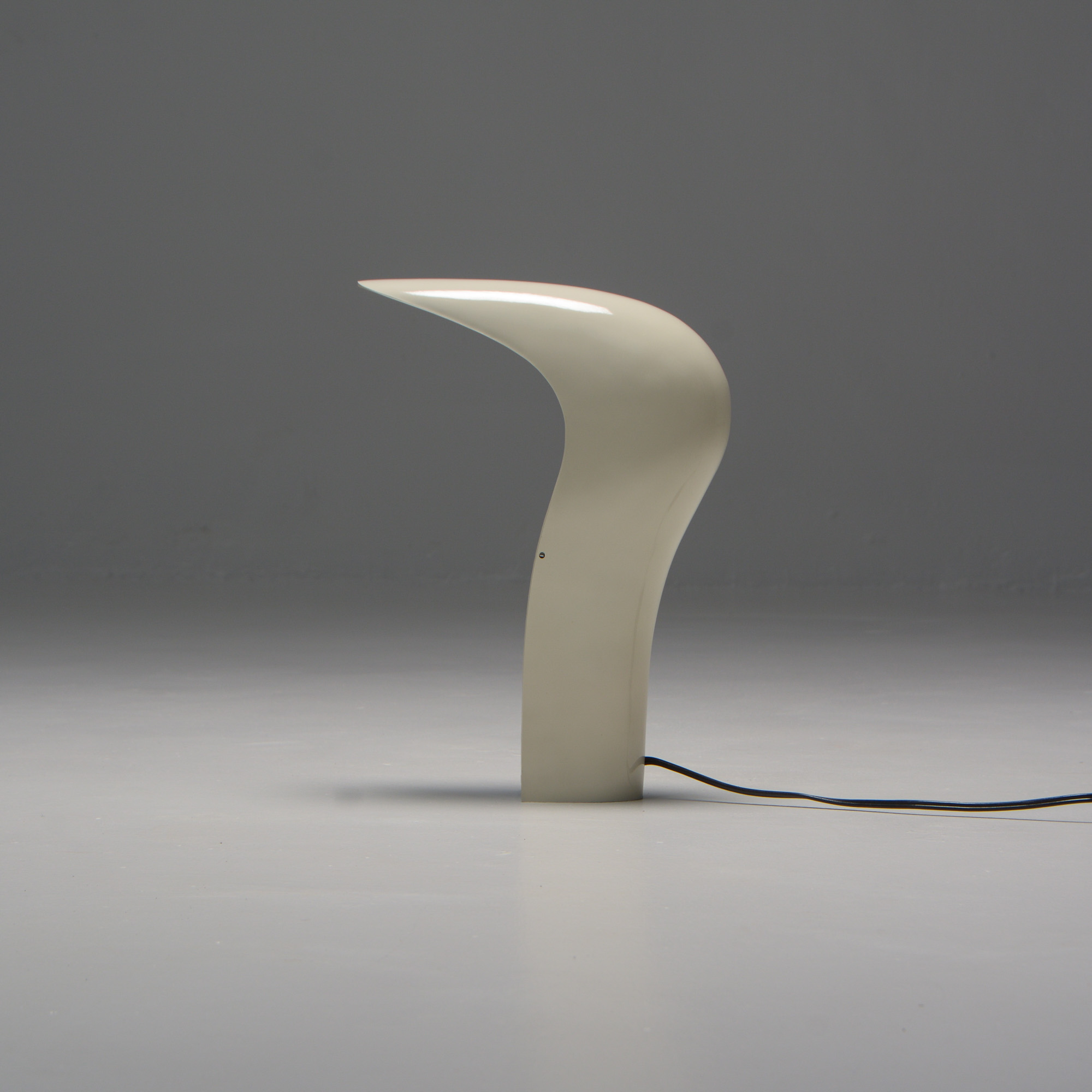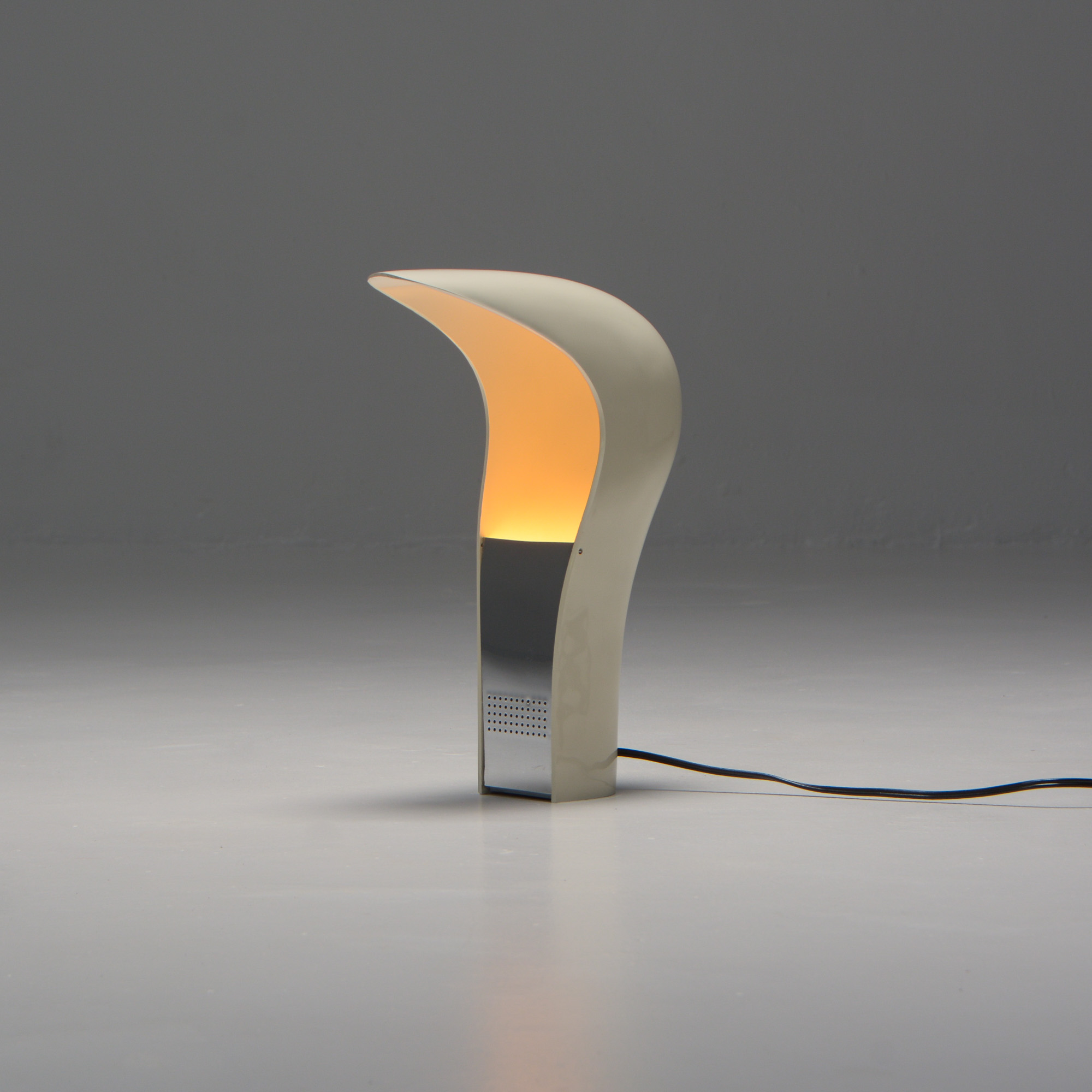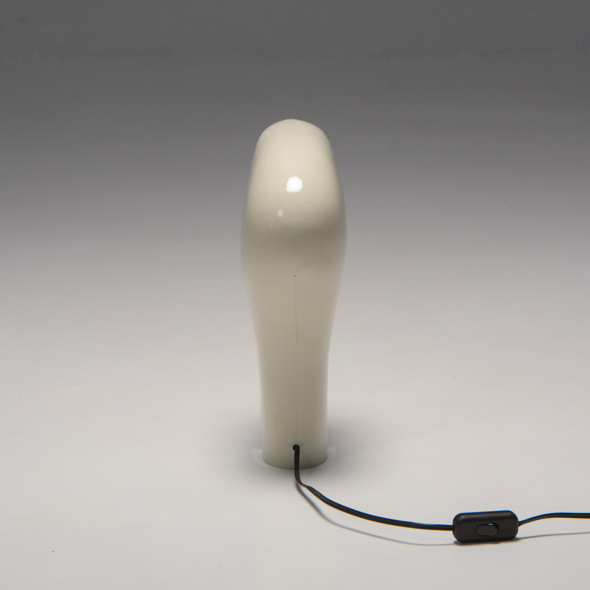 It is made of white ABS plastic. It is a special lamp with a futuristic sculptural shape. This table lamp is in good vintage condition and marked.