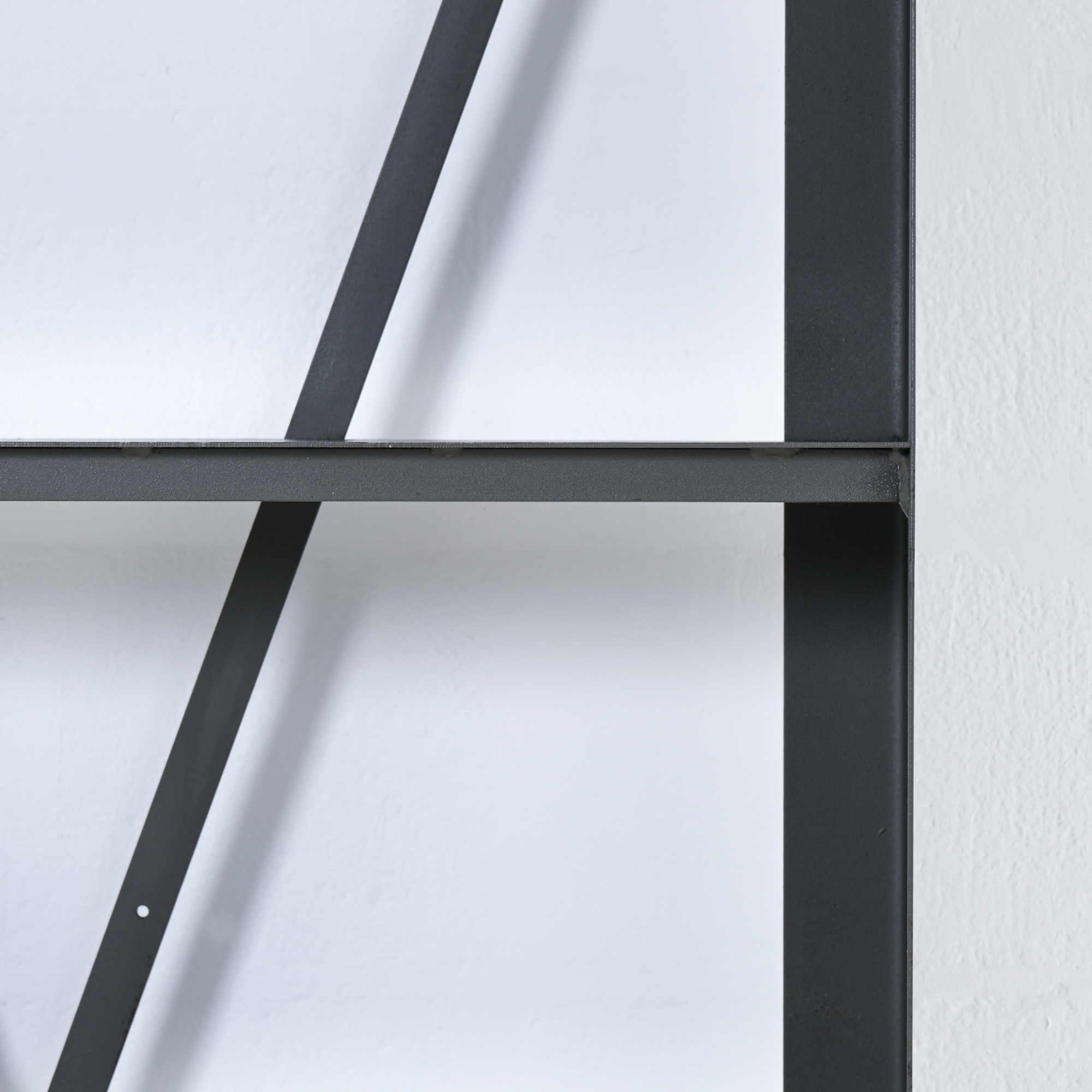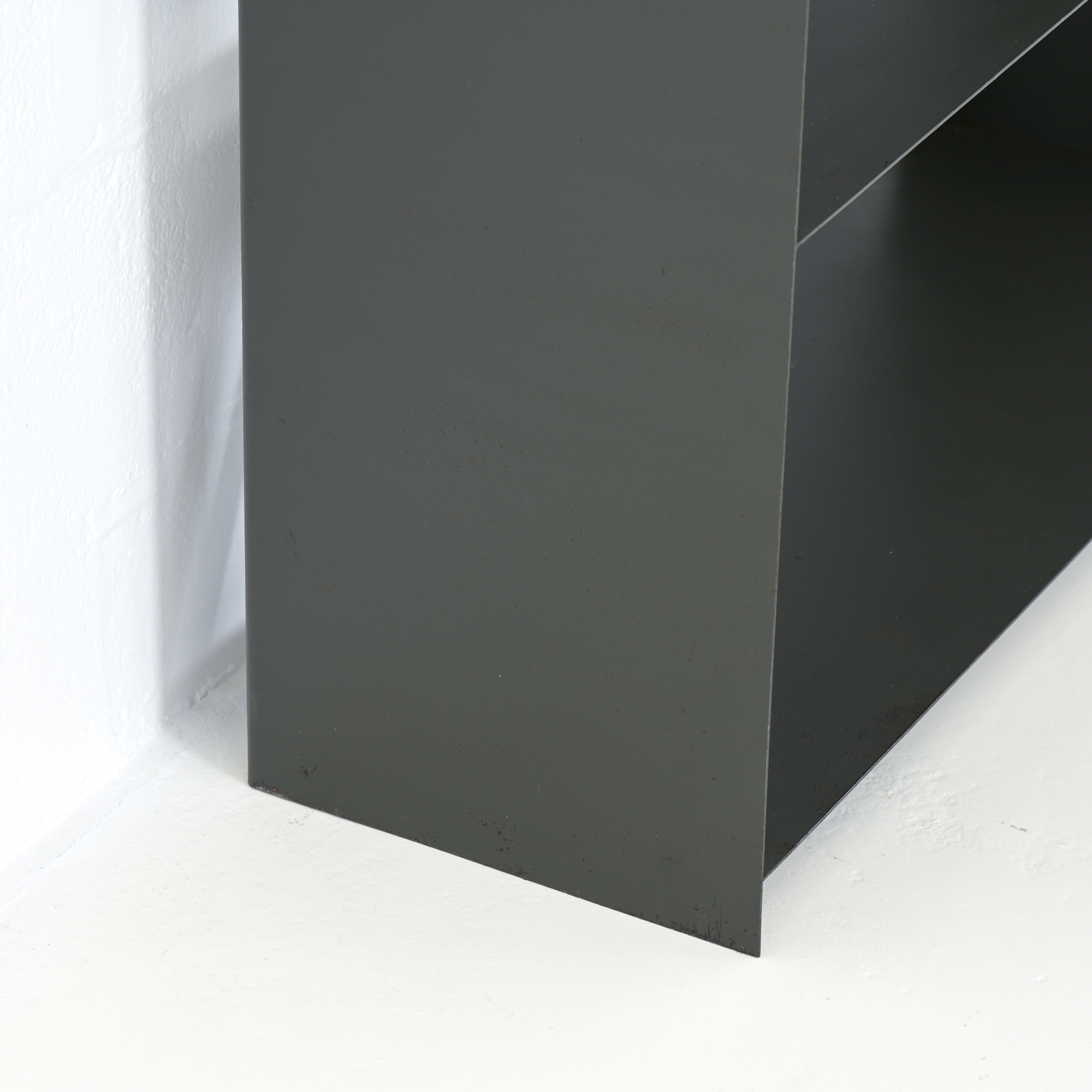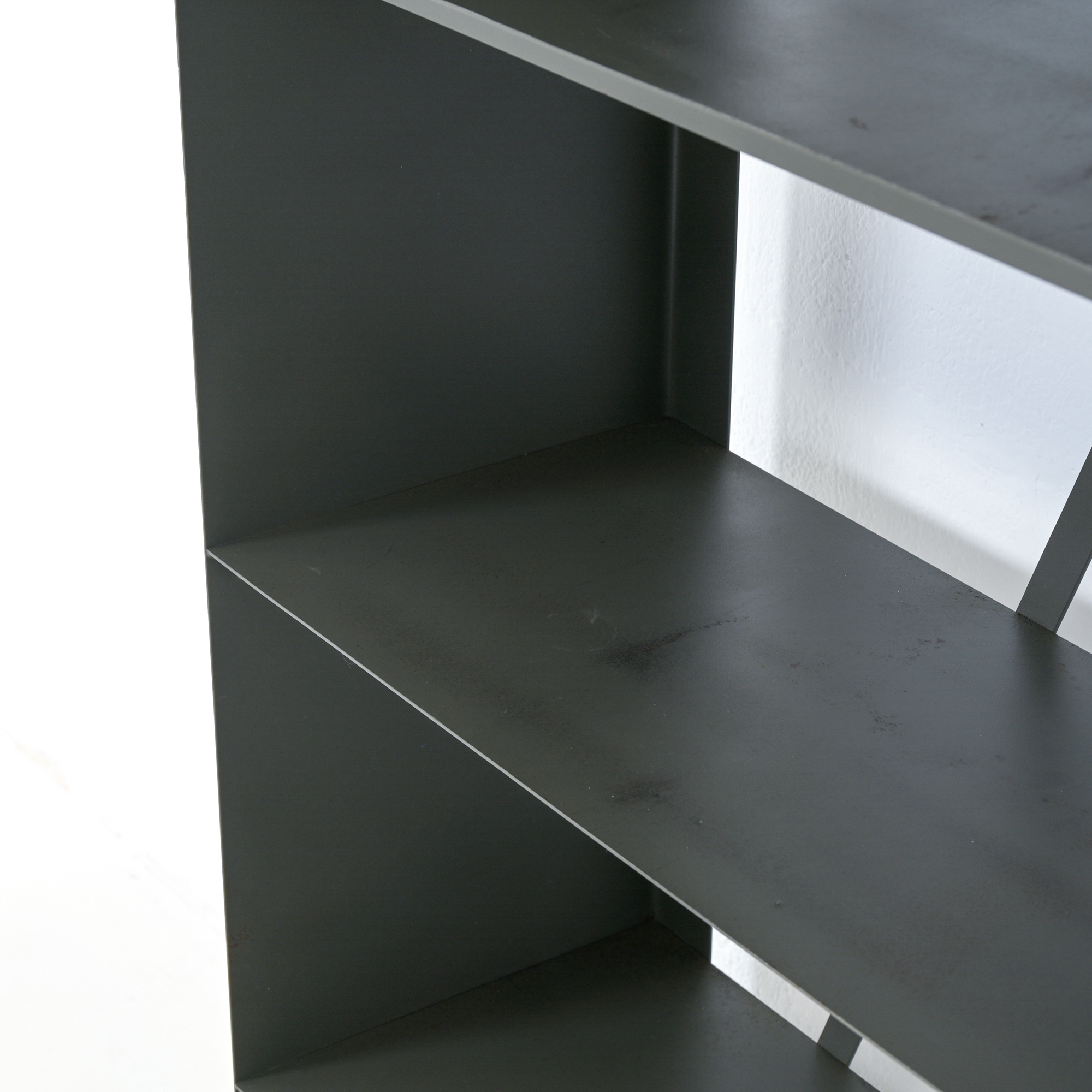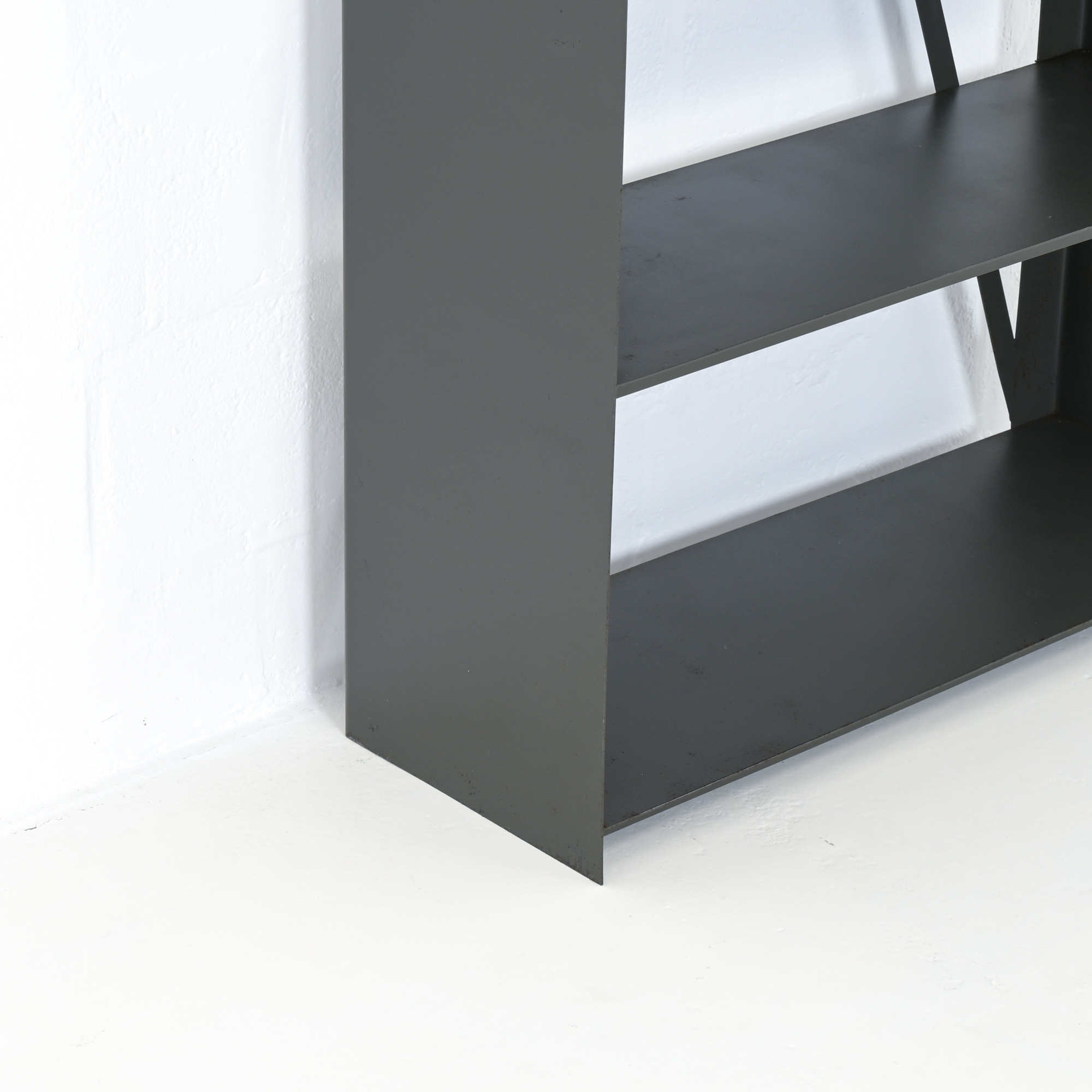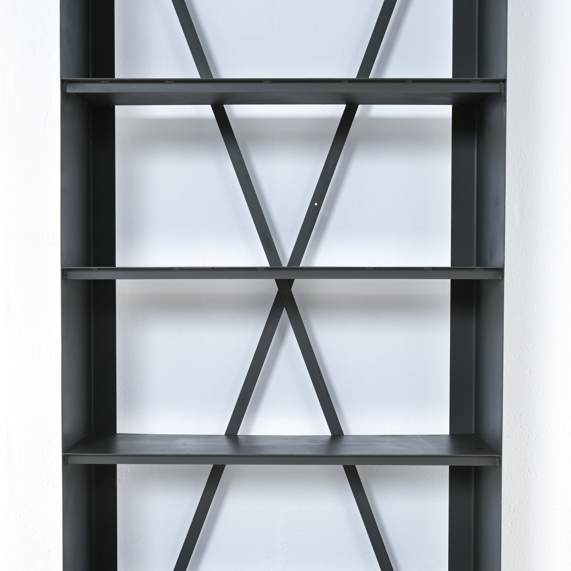 The metal bookcase is pure design in good authentic condition, with normal signs of age and use, visible on the detail photos.