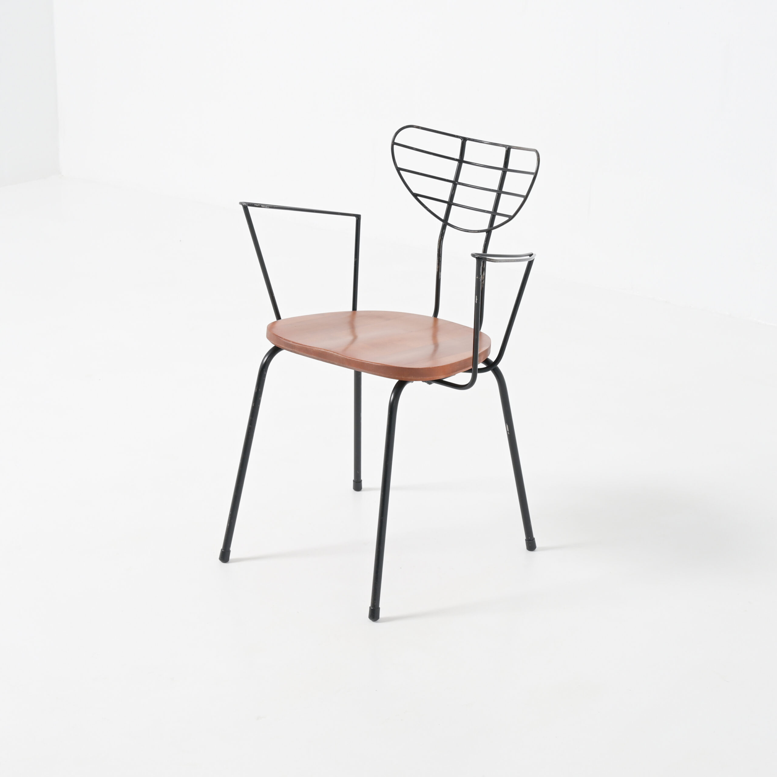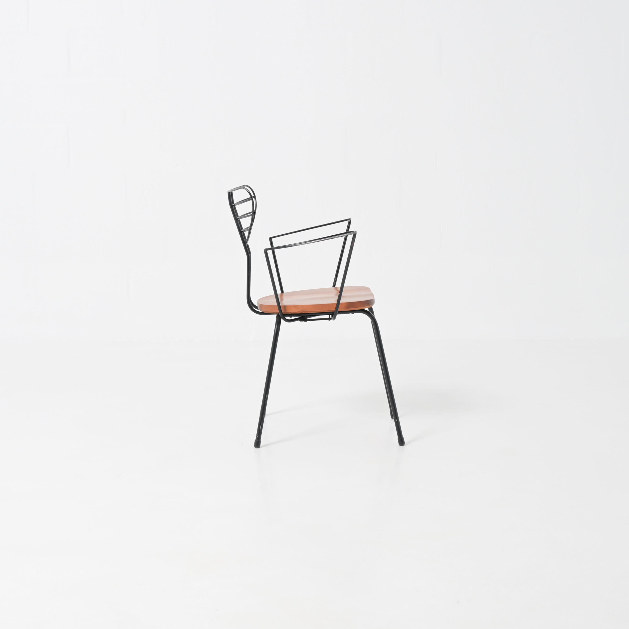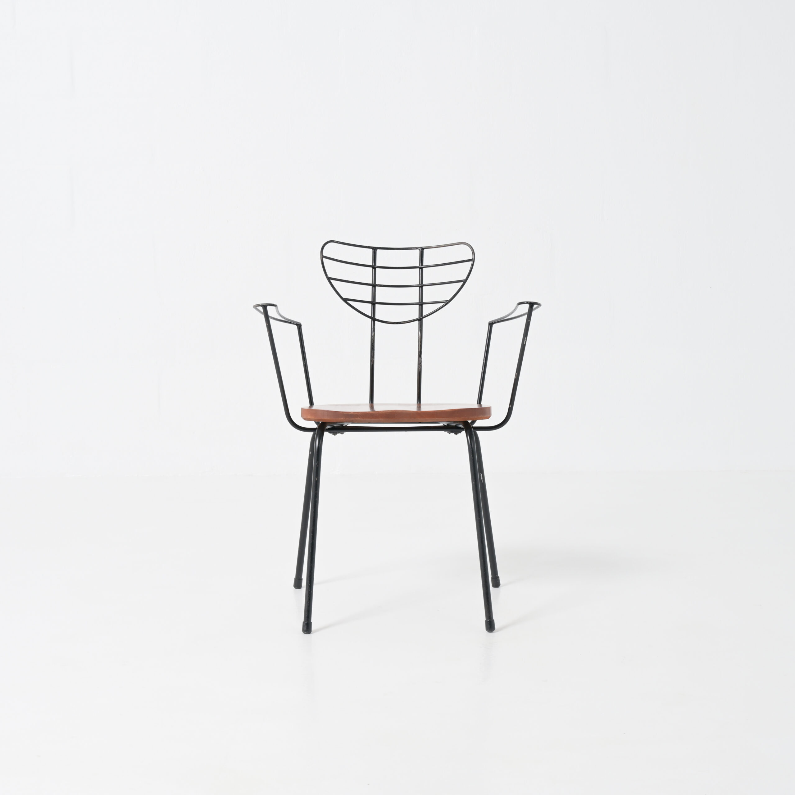 The Radar chair is often attributed to the Belgian designer Willy Van Der Meeren and dates from the 1950s. This mid-century modern chair is made of black painted metal and wood.