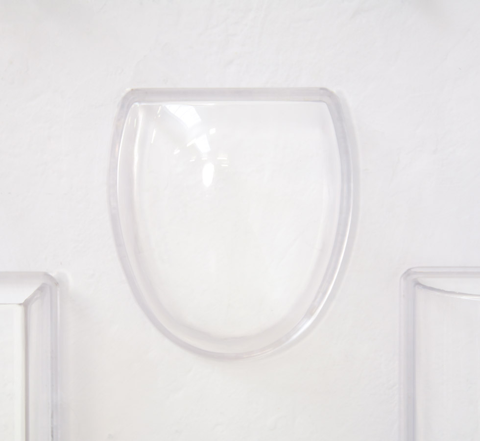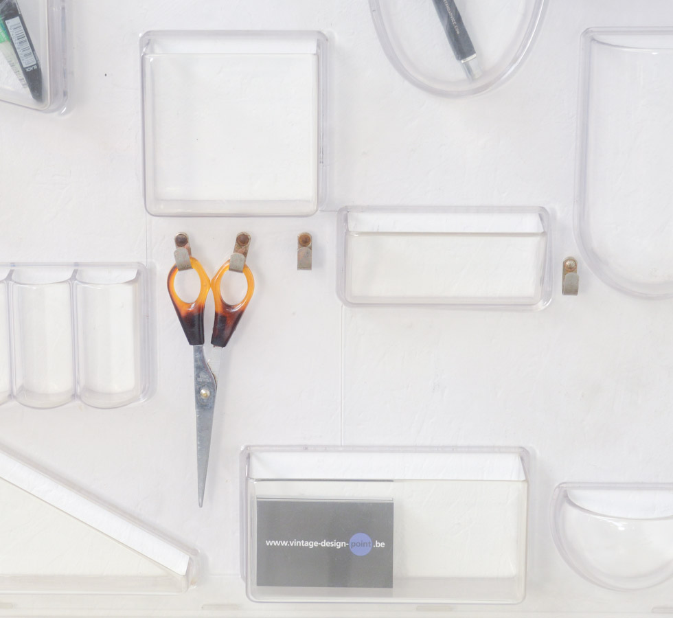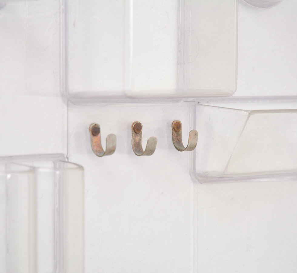 This UTEN.SILO is the small version II. It is made of transparent plastic and the hooks are in metal.