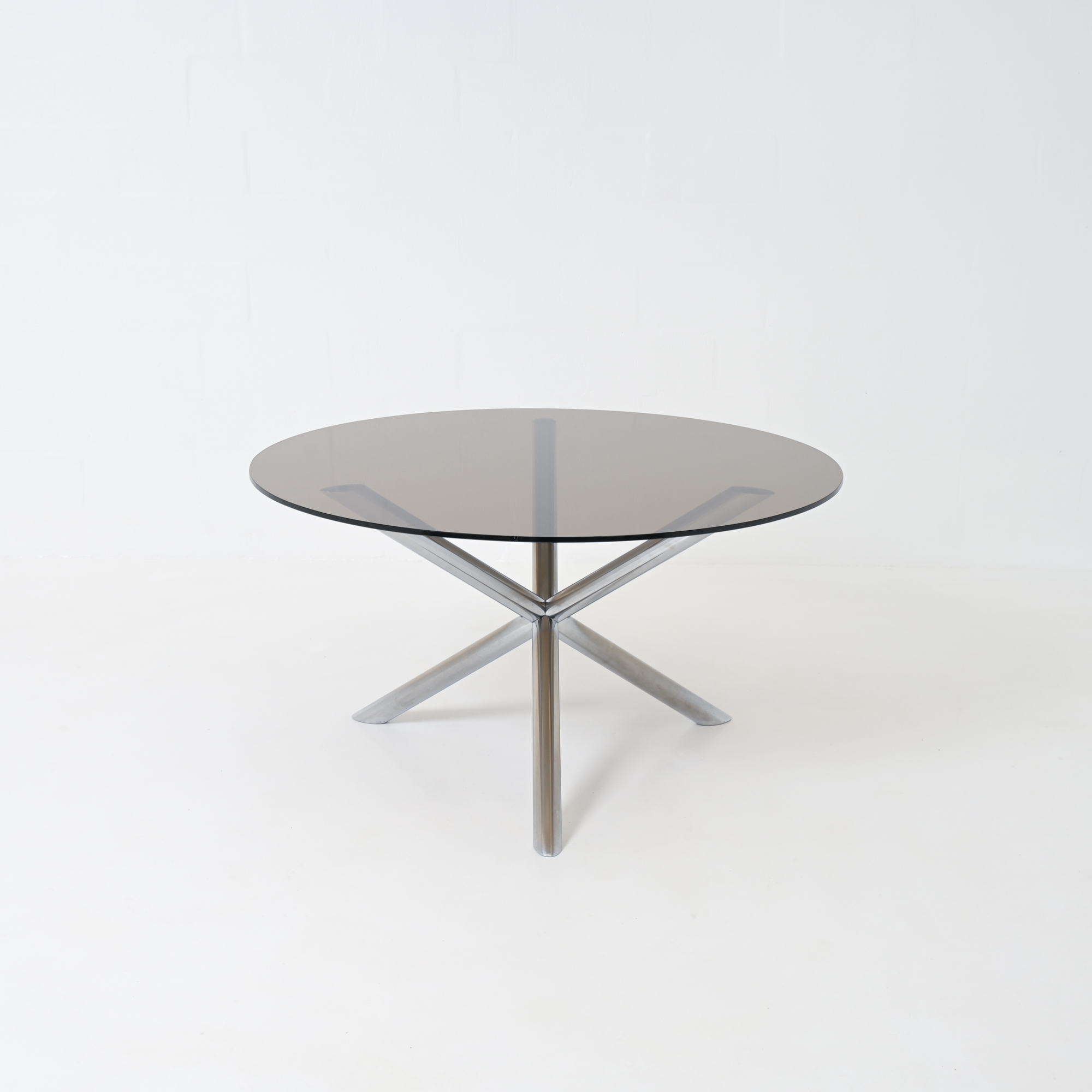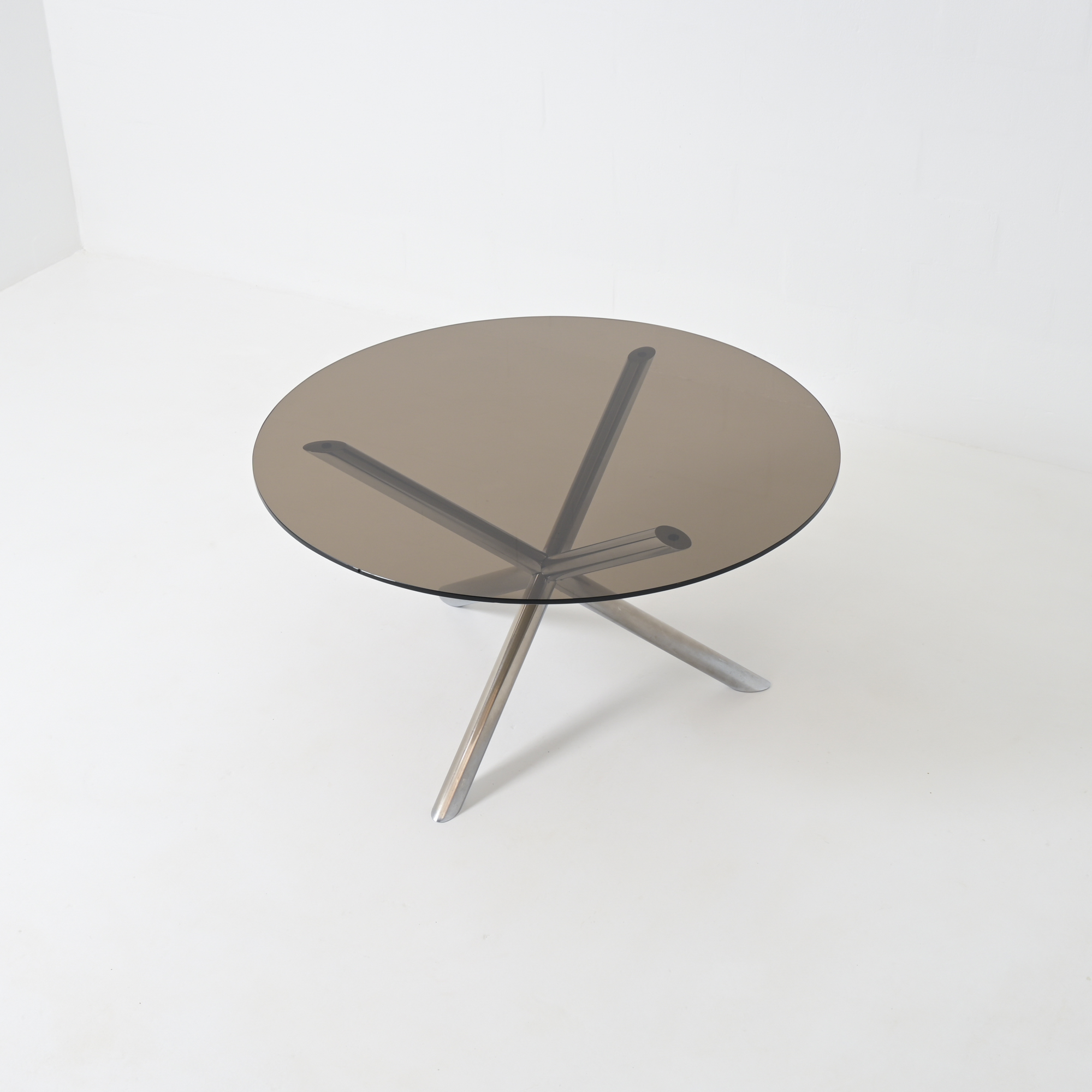 The table consists of two parts, both looking for contrast and symmetry in design. A sturdy chrome structure shapes a tripod to support a gray-smoked glass tabletop.