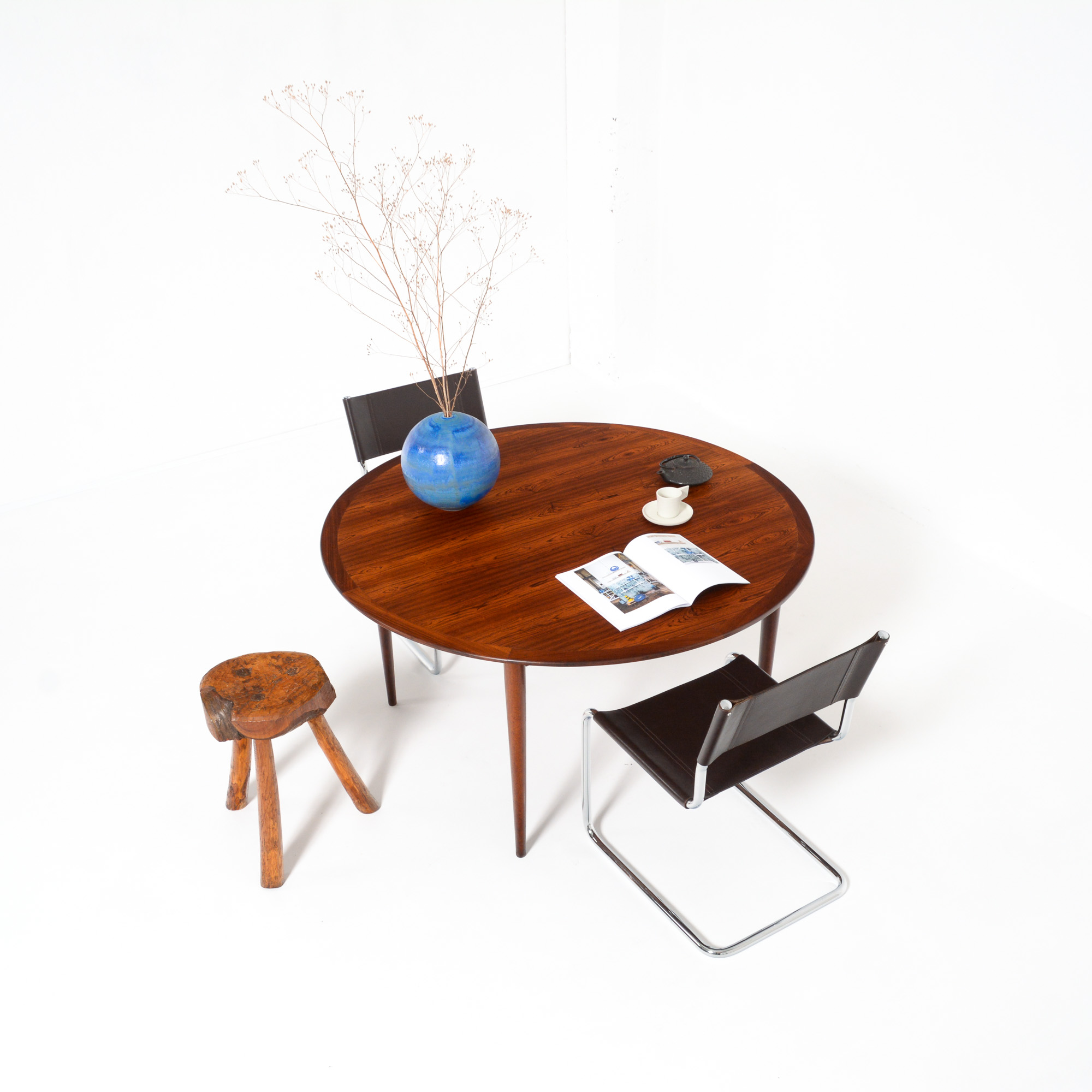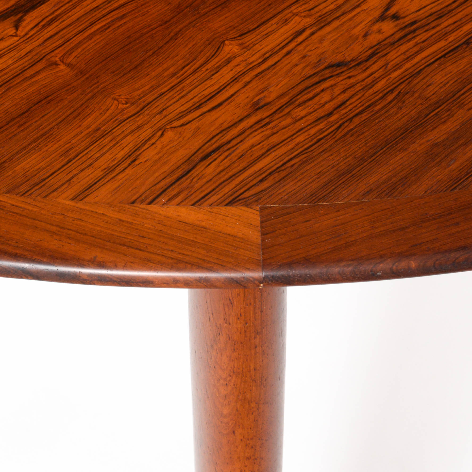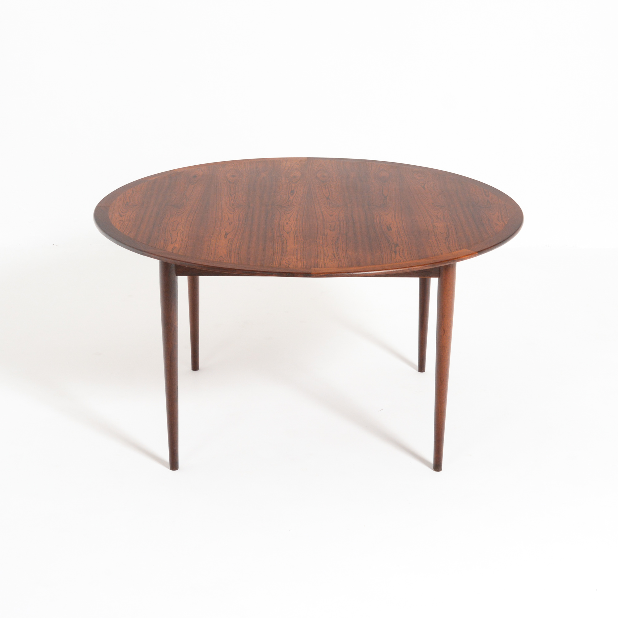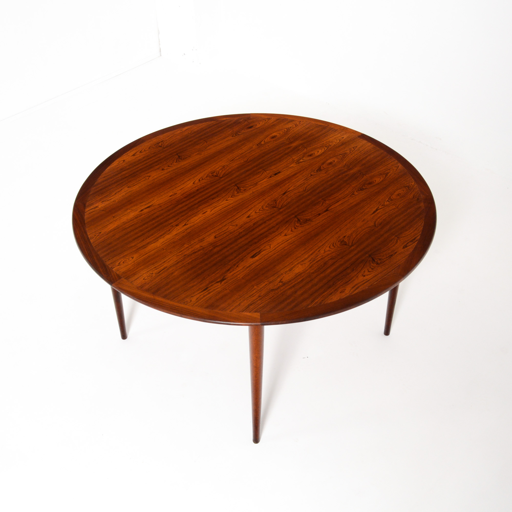 This rare round dining table in rosewood was designed by Grete Jalk for P. Jeppesen’s møbelfabrik in Denmark, Store Heddinge. It can be dated in the early 1960s.