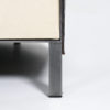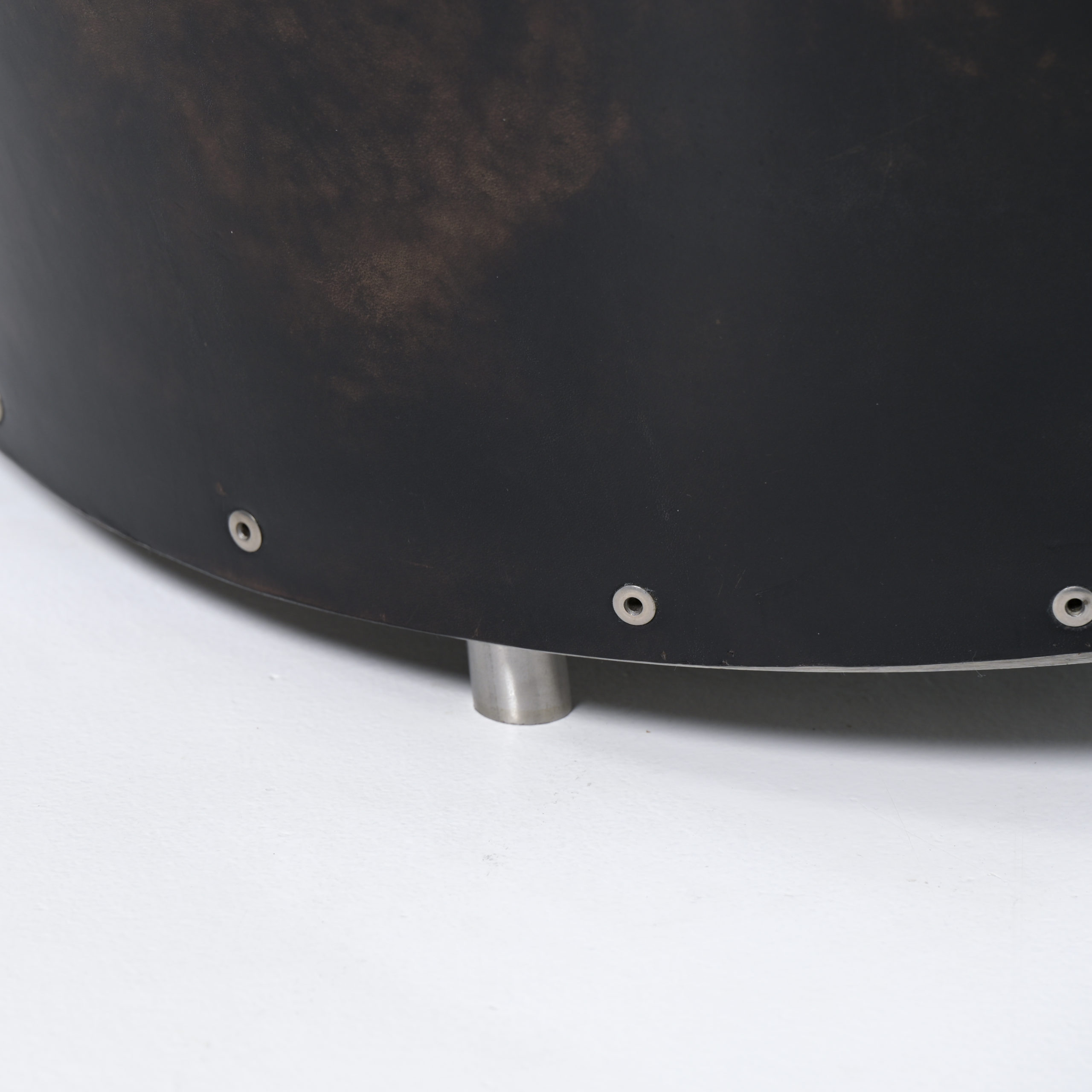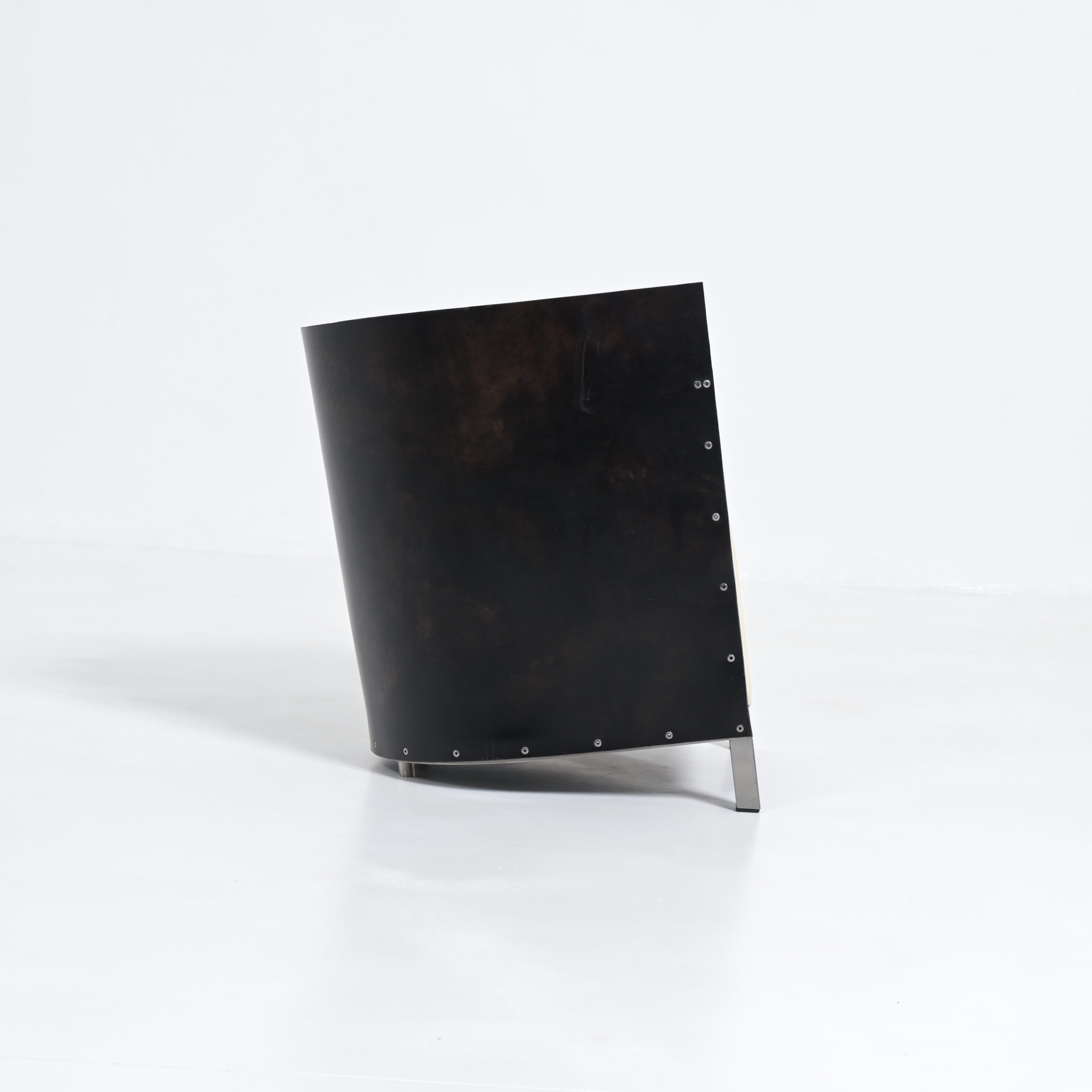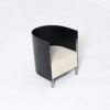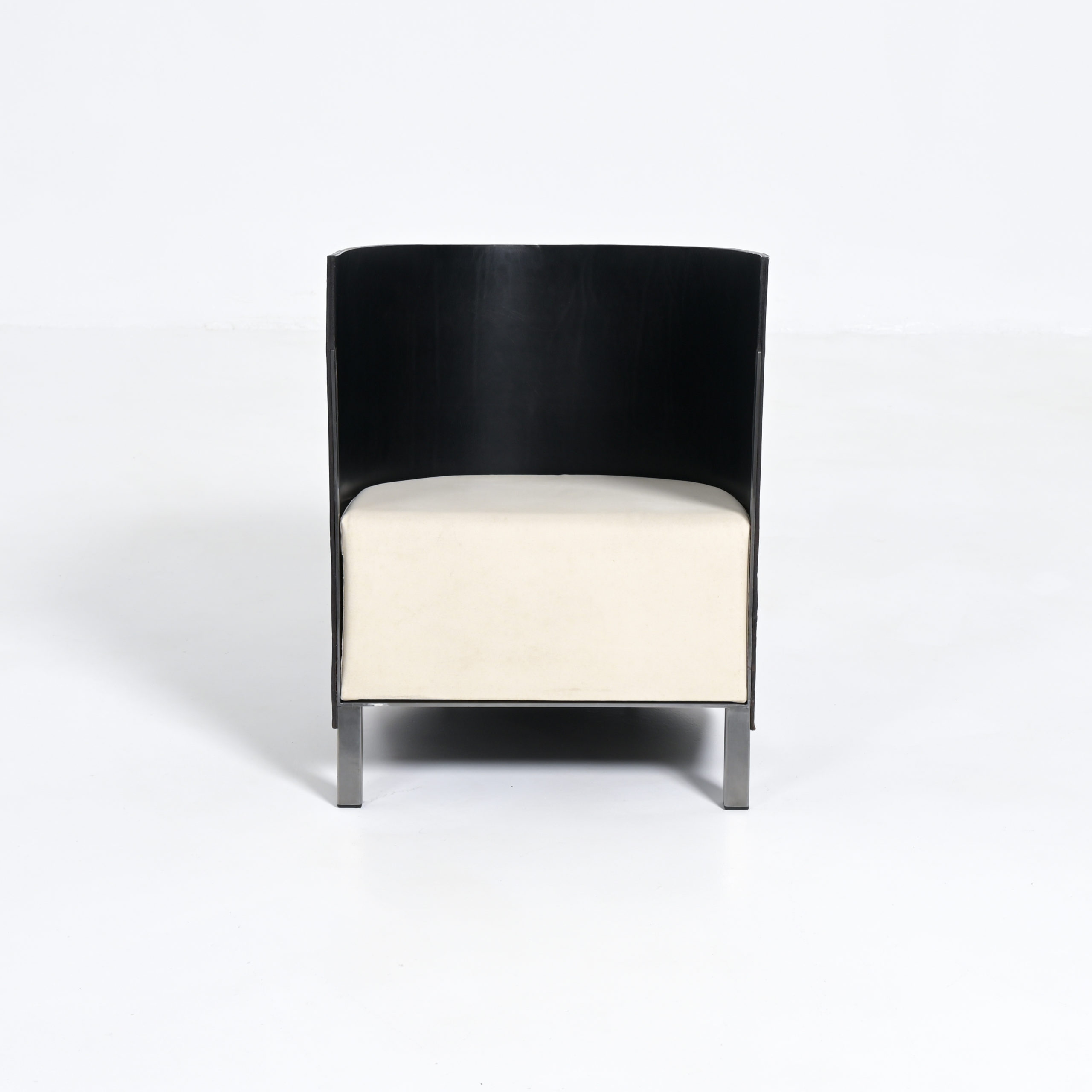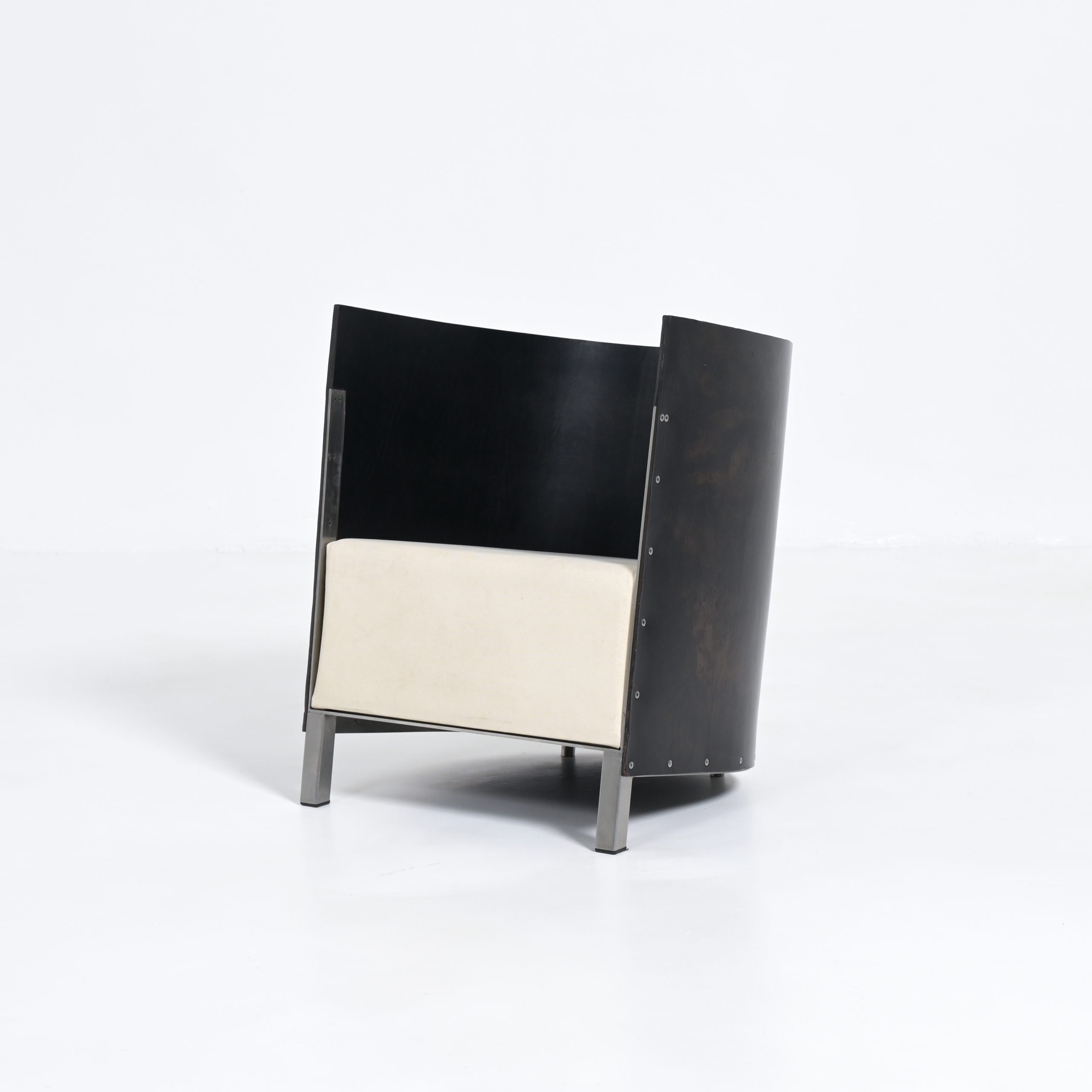 This chair is an early Top Mouton production, in a different color combination. The strong black saddle leather back fits perfectly in the steel strips and the low base. The thick white canvas cushion provides a comfortable seating height.