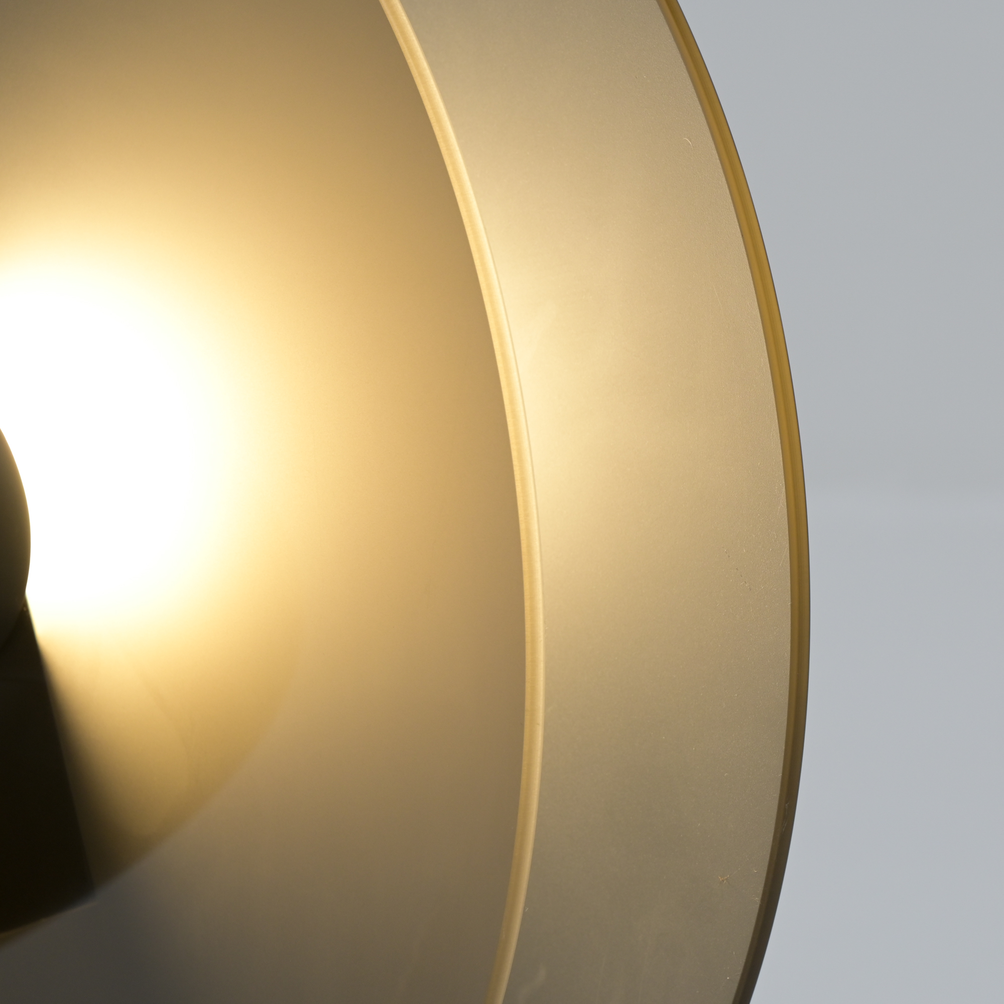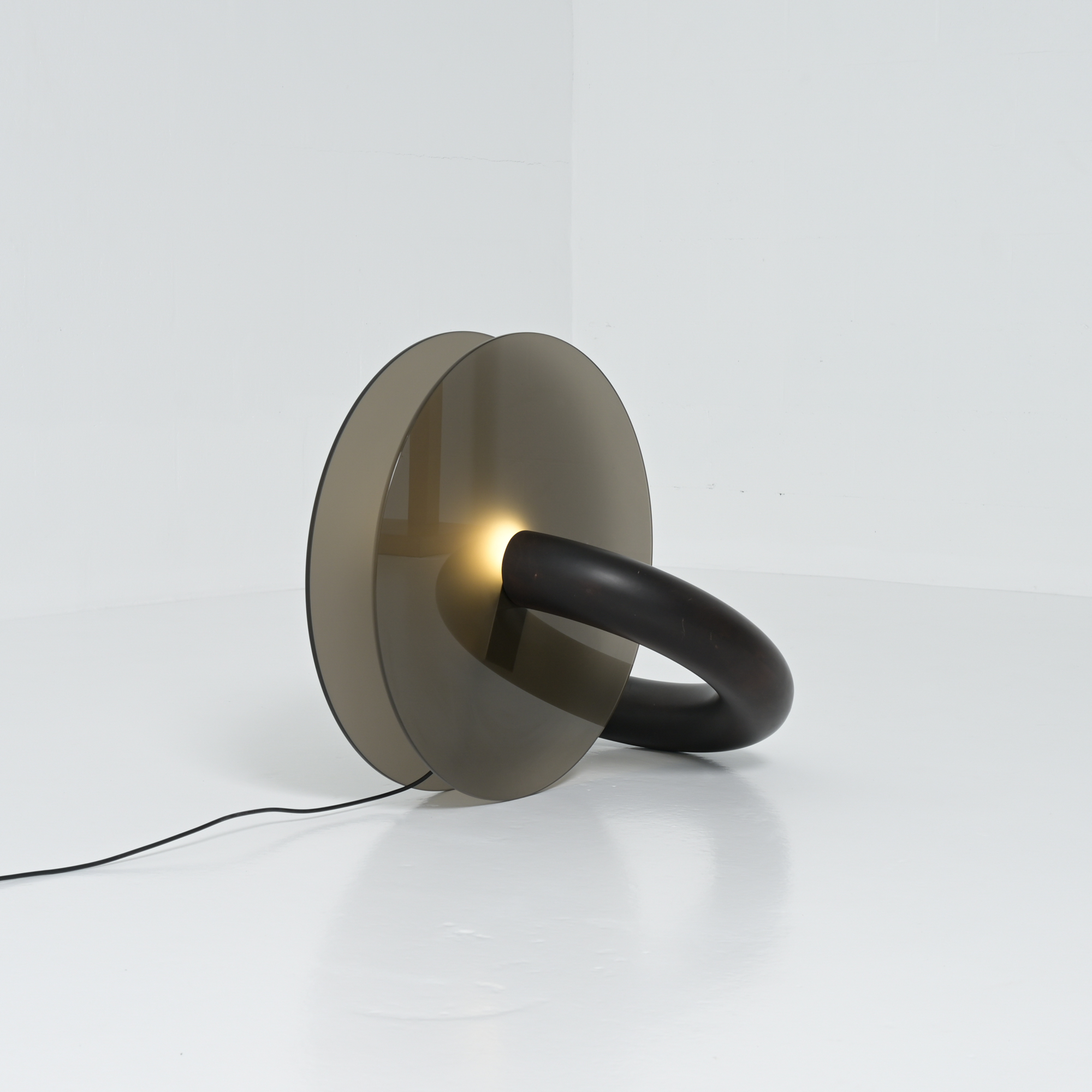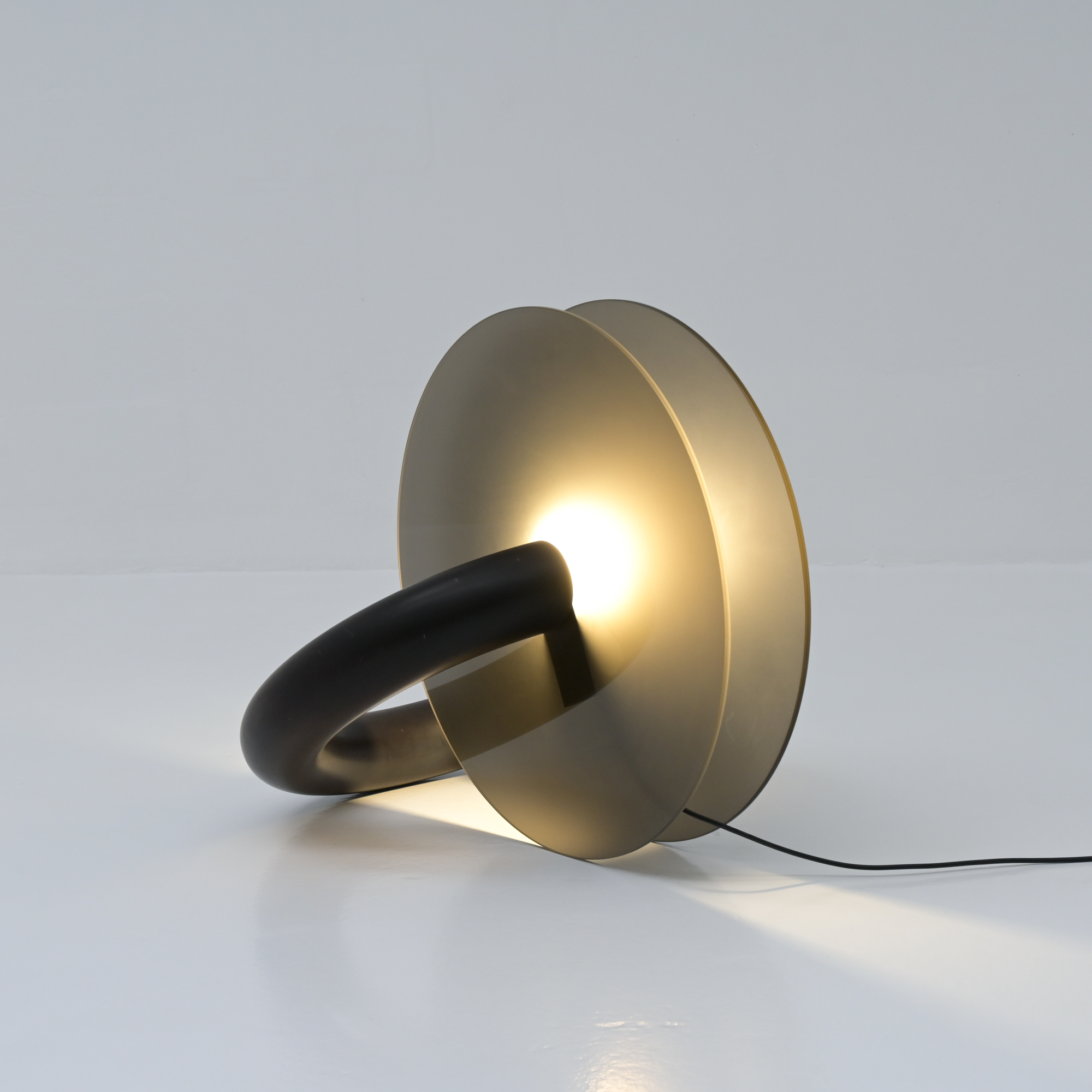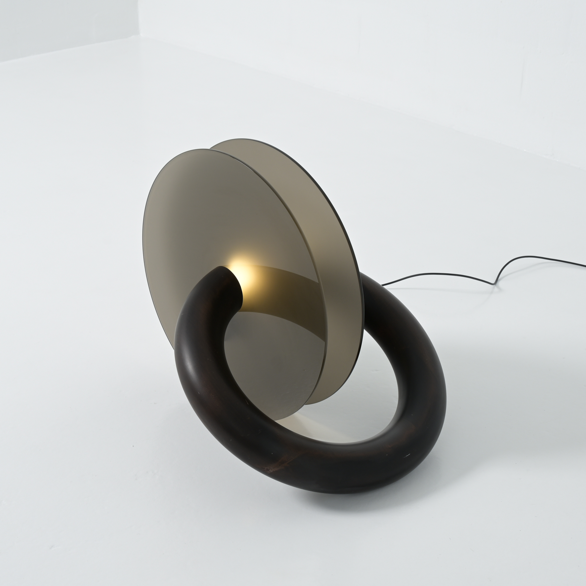 It consists of two bronzed glass discs with sandblasted finishes on the inside.