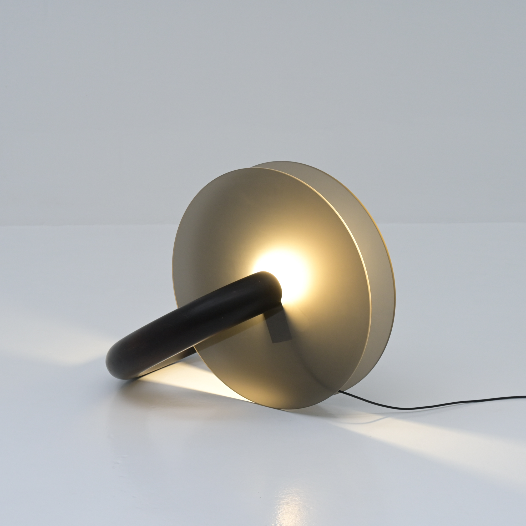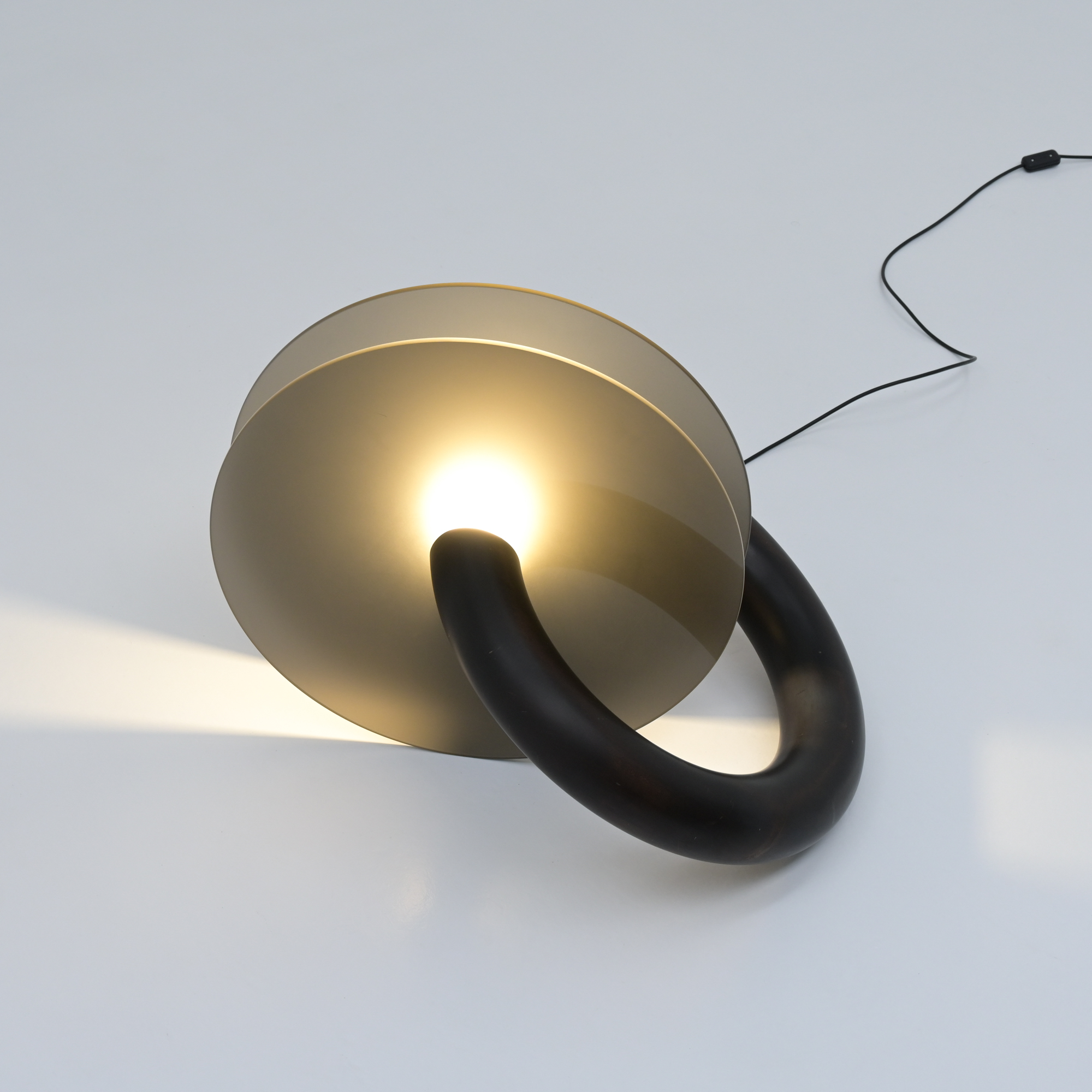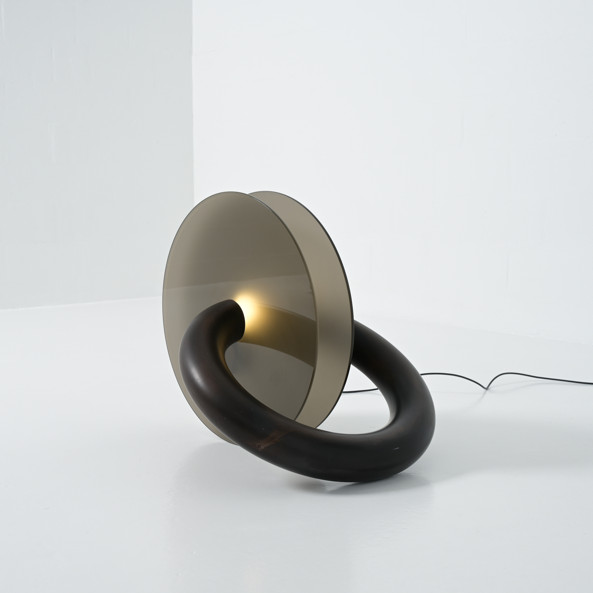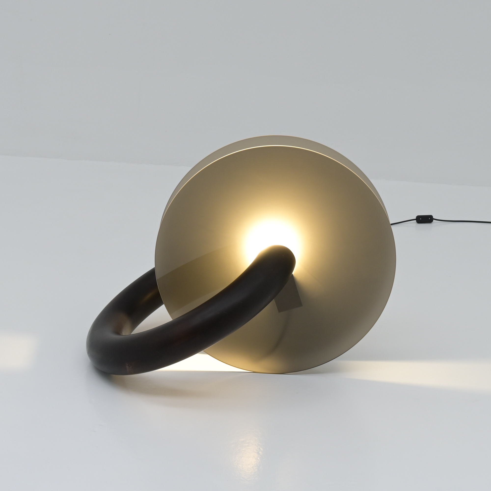 It consists of two bronzed glass discs with sandblasted finishes on the inside.