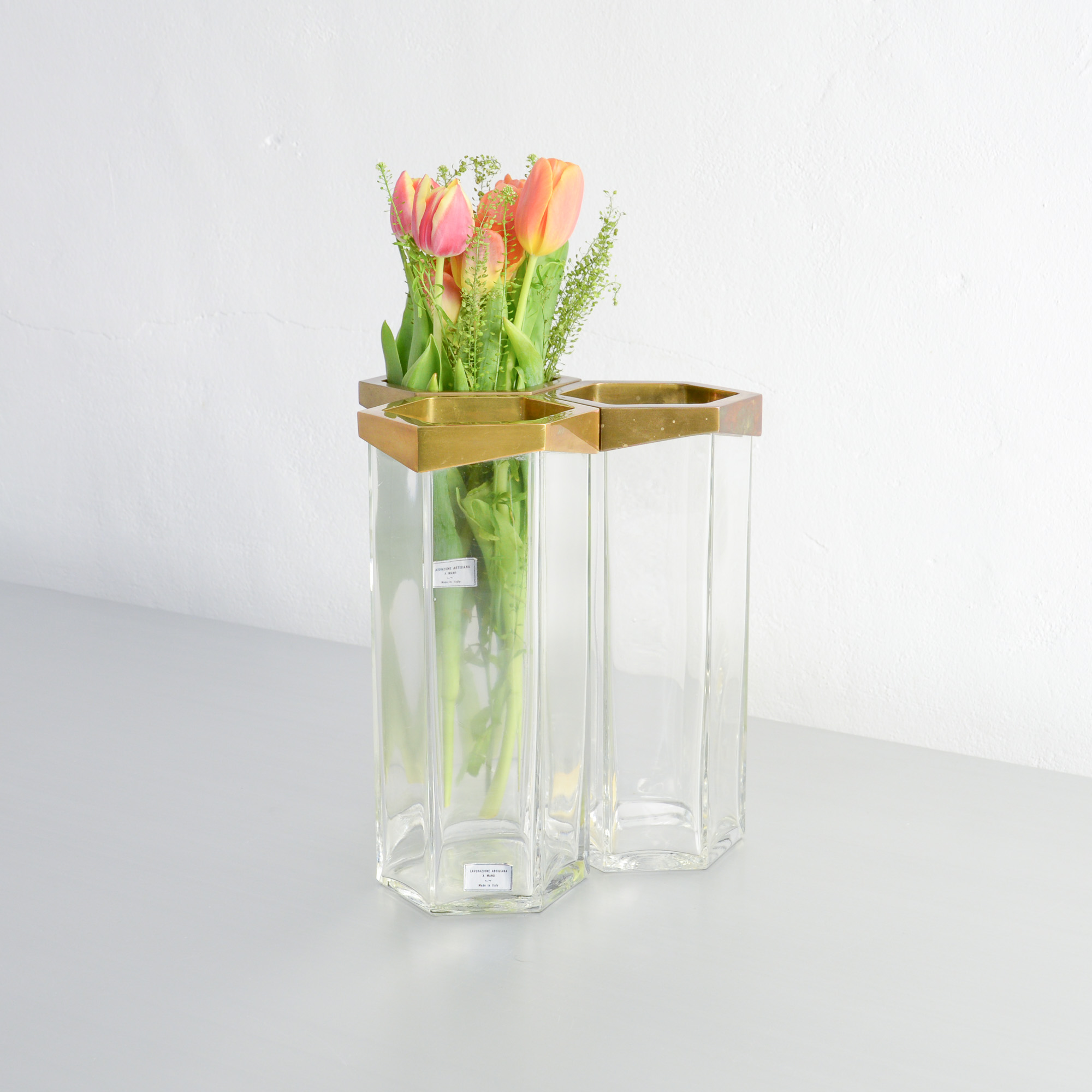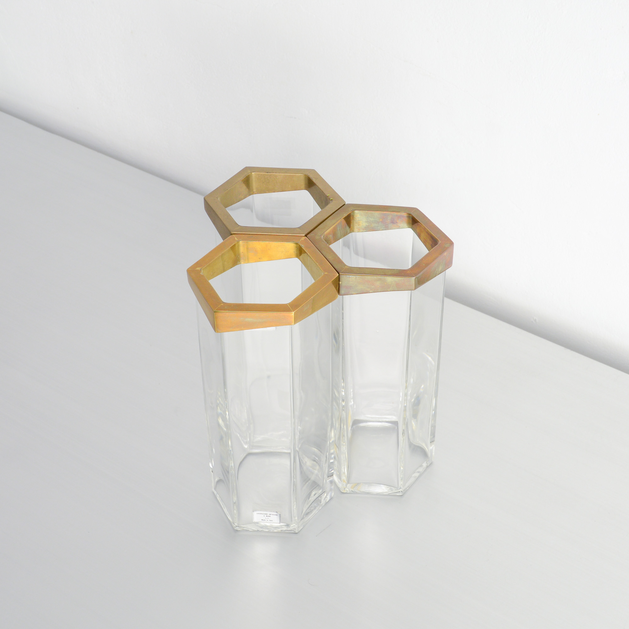 Set of 3 Hexagonal Italian Crystal and Brass Vases