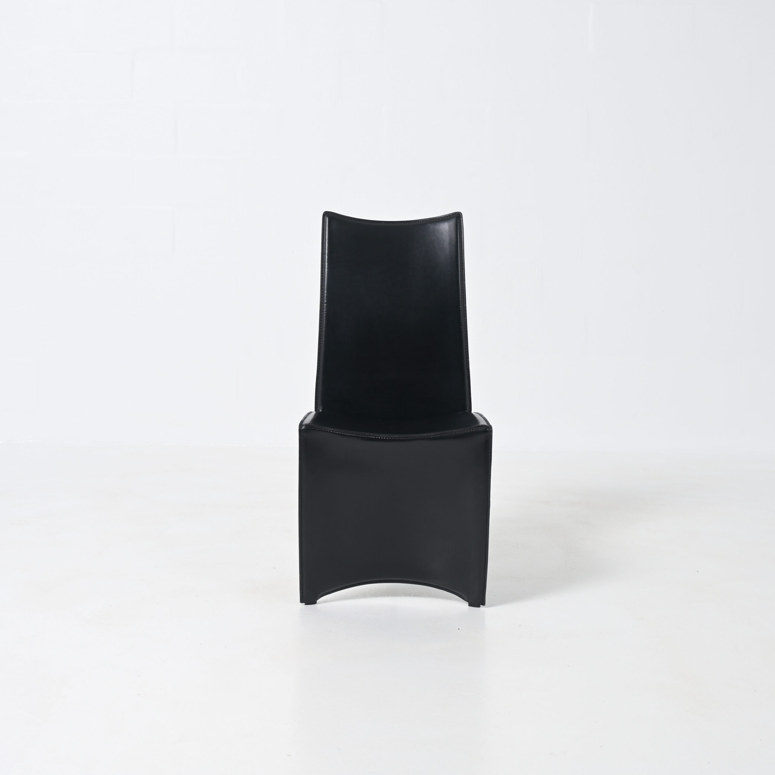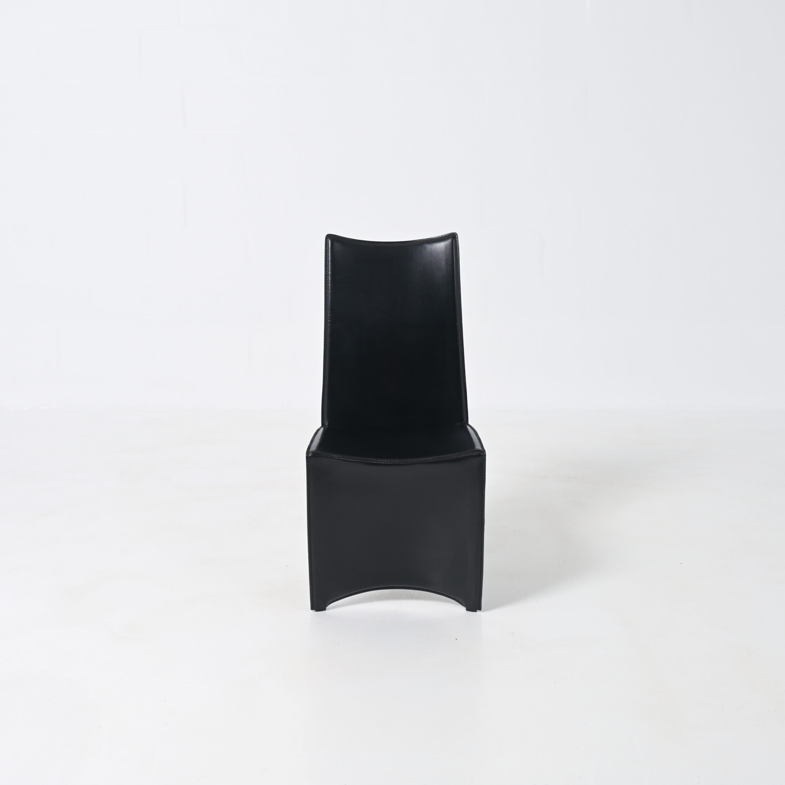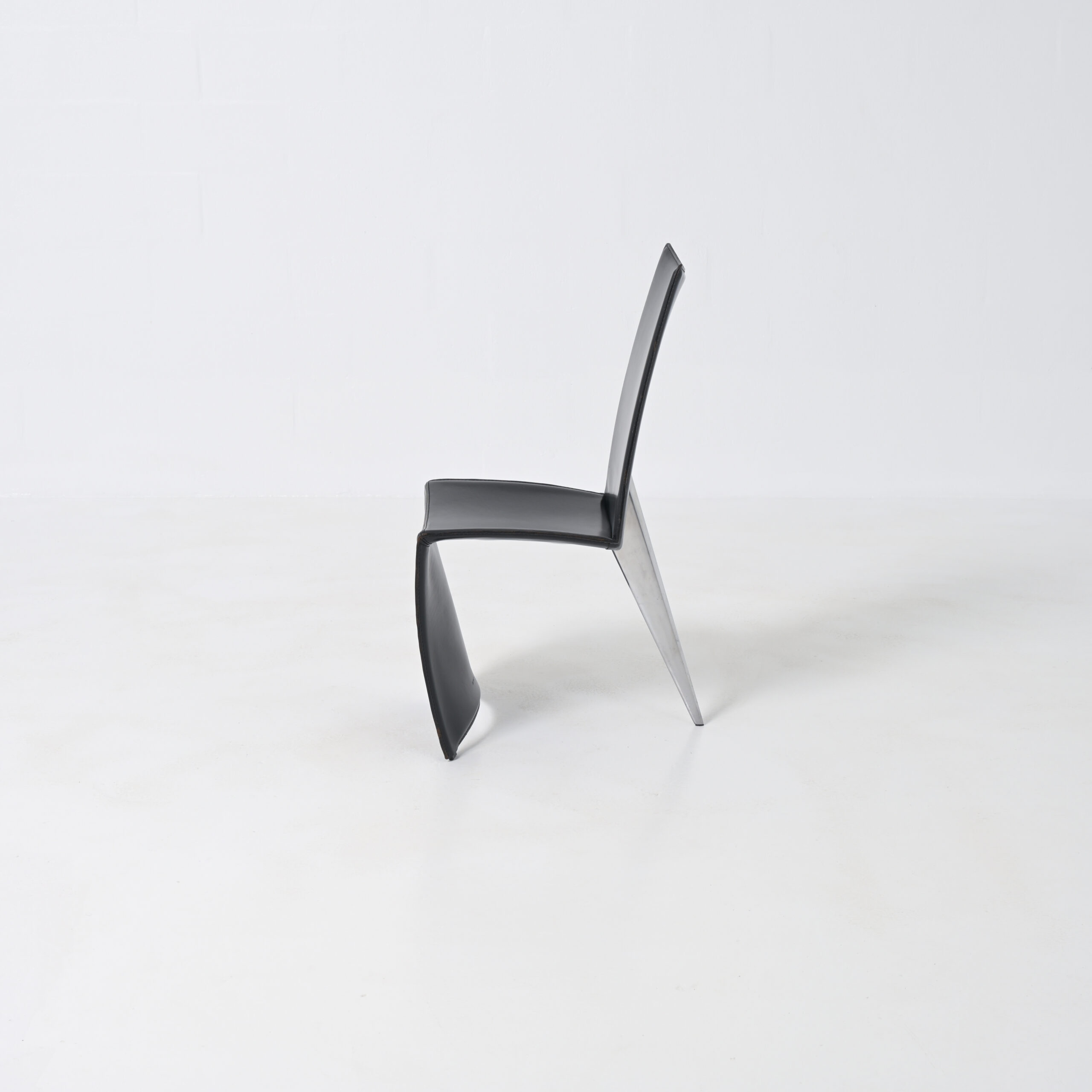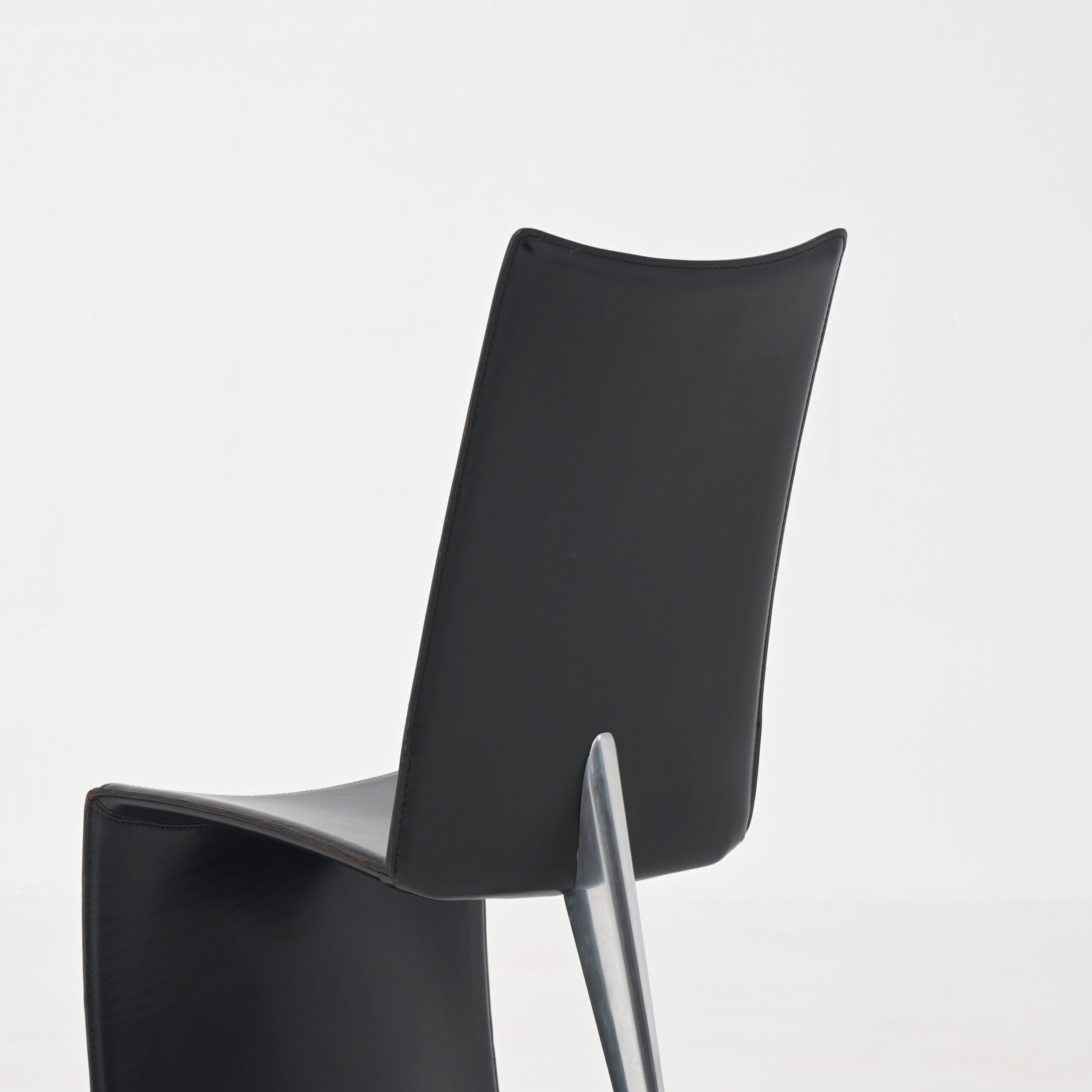 The black leather “full dress”, that reaches the floor, strongly opposes to the only polished metal “shark finned” back leg.