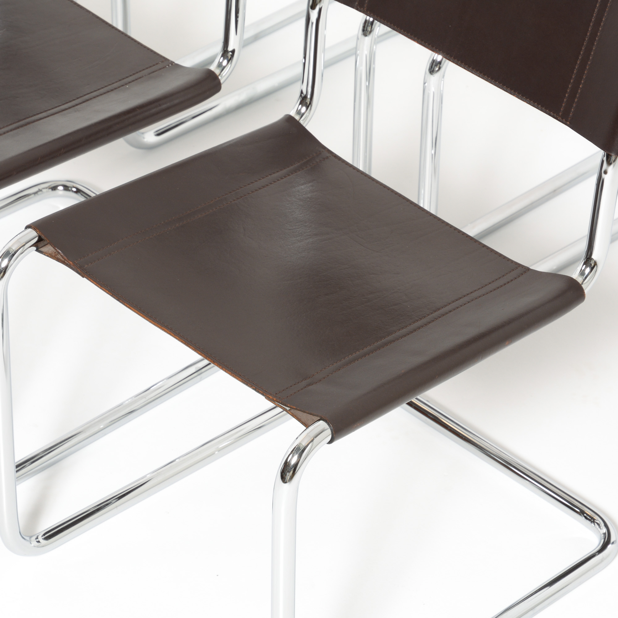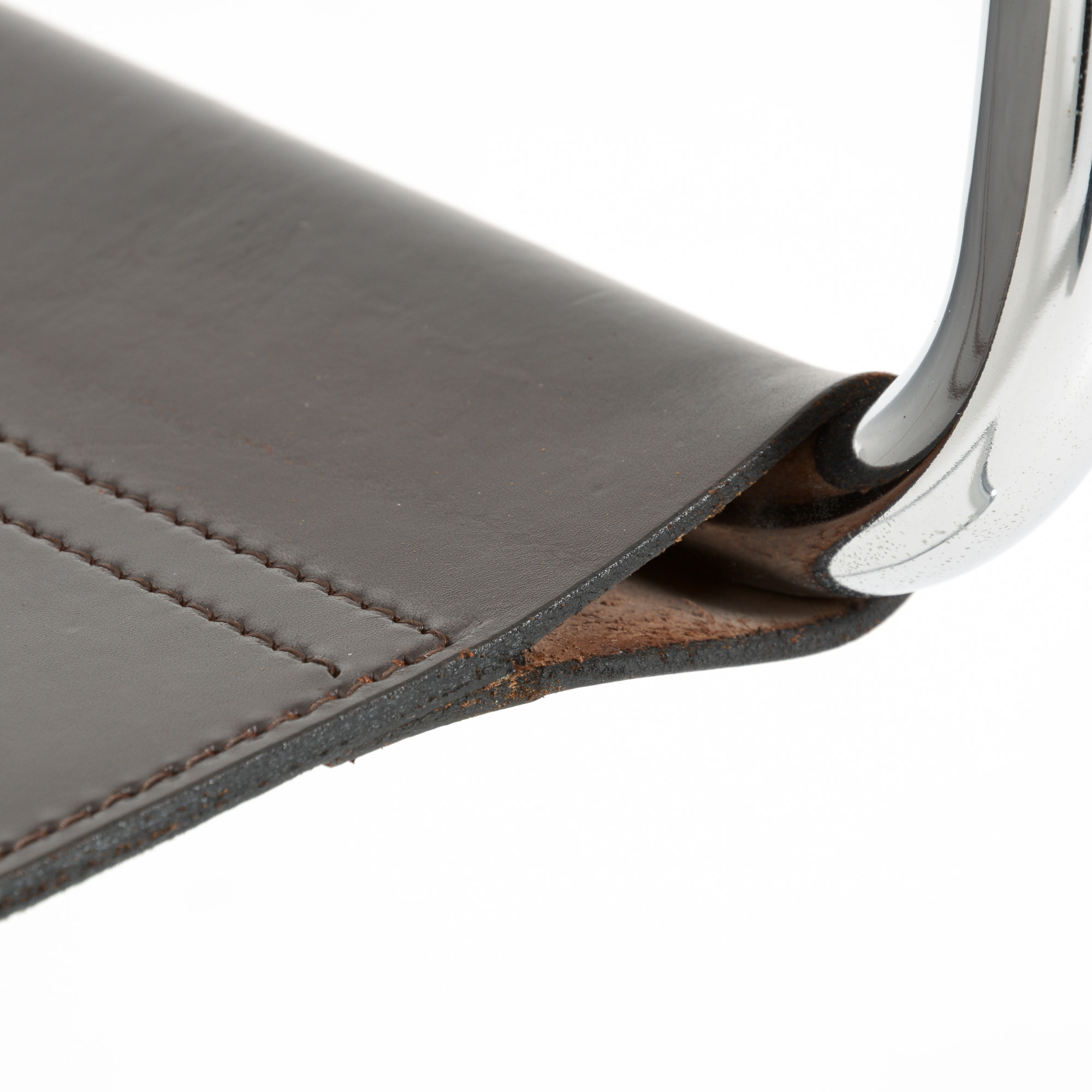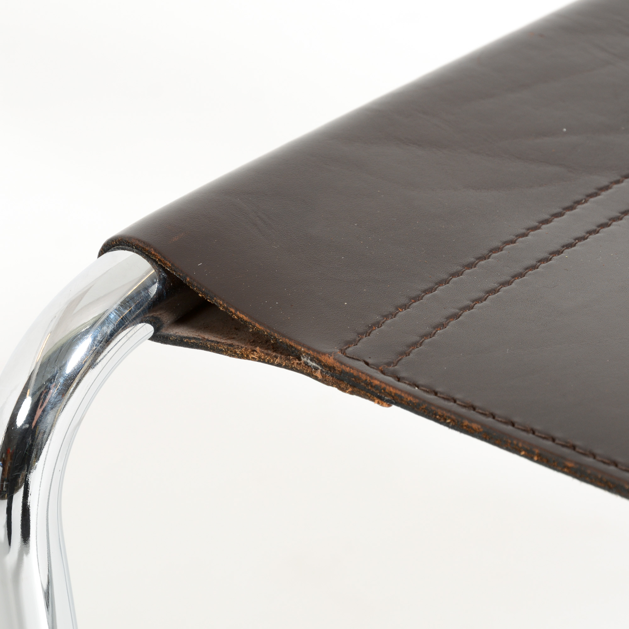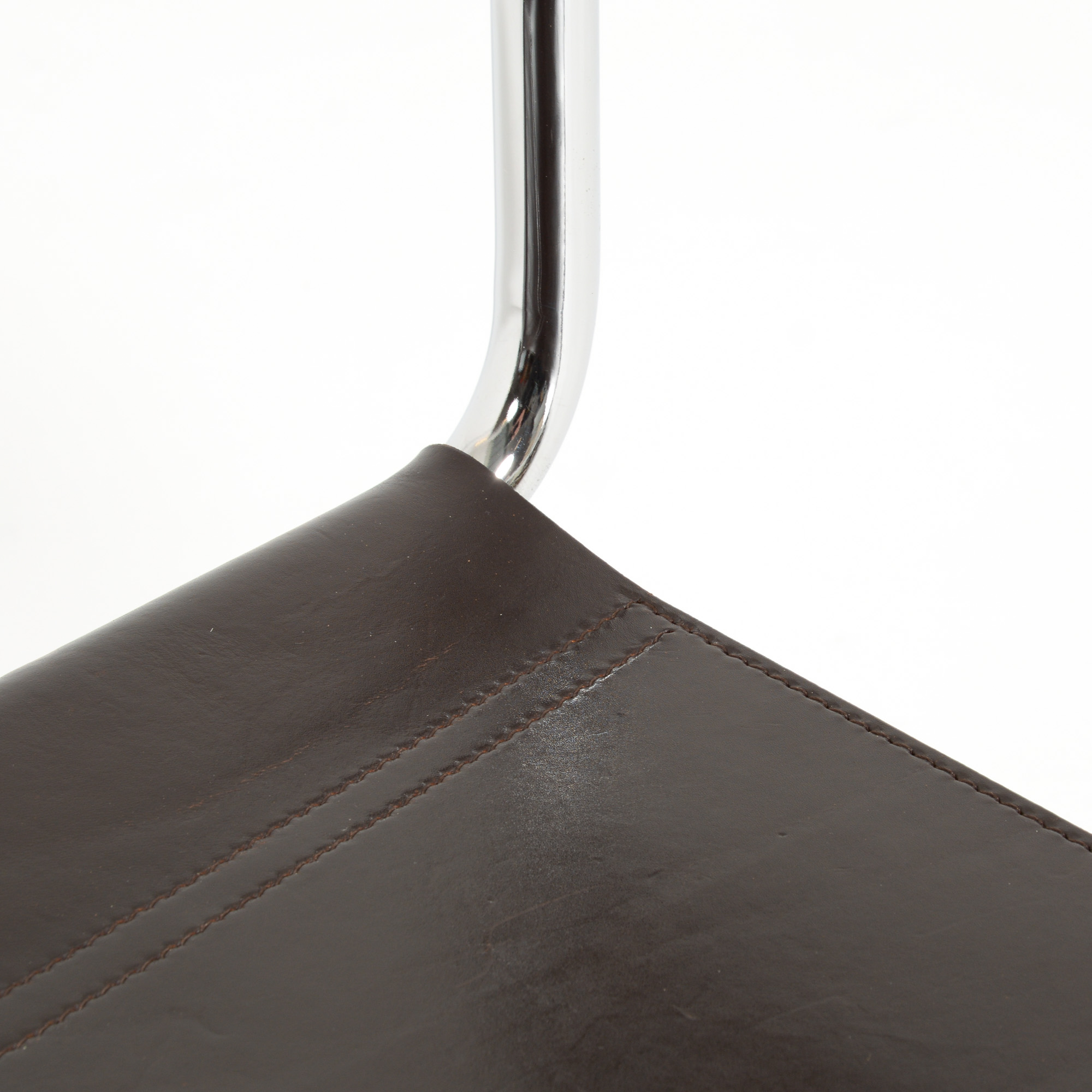 In the 1970s there was a revival of the tubular cantilever chair. These chrome cantilever chairs with dark brown leather seat and back can be dated in this period. They are made of high quality chrome and thick leather.
