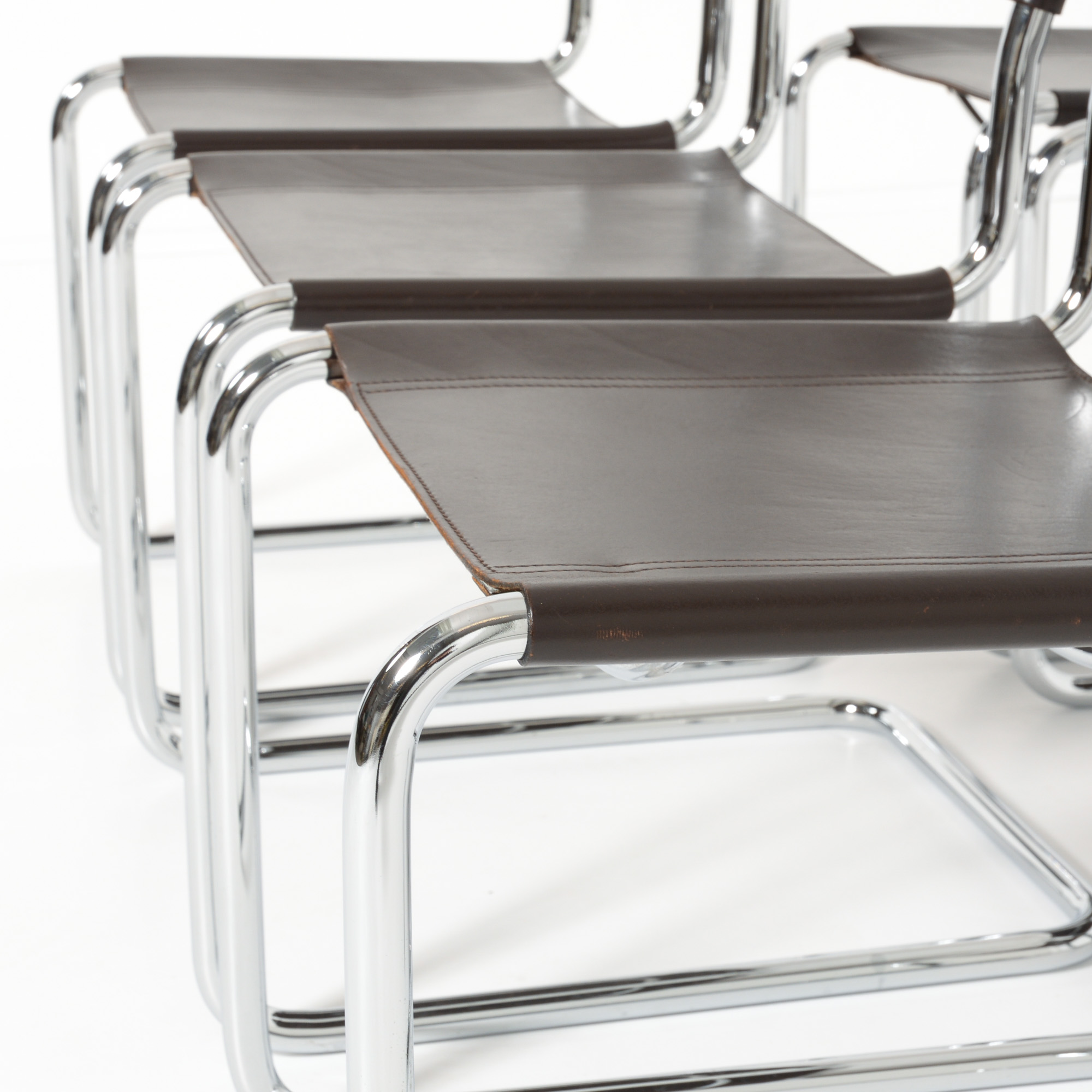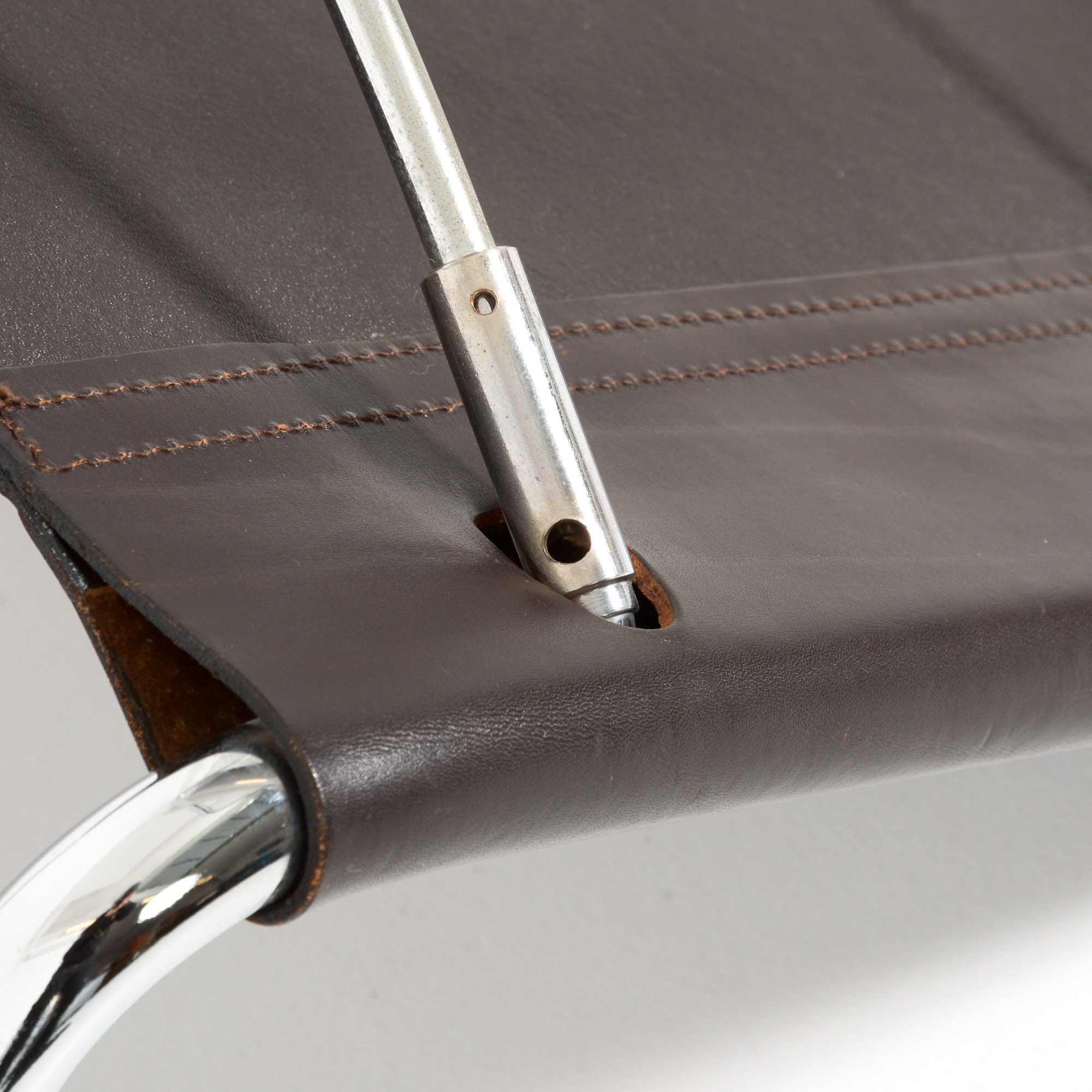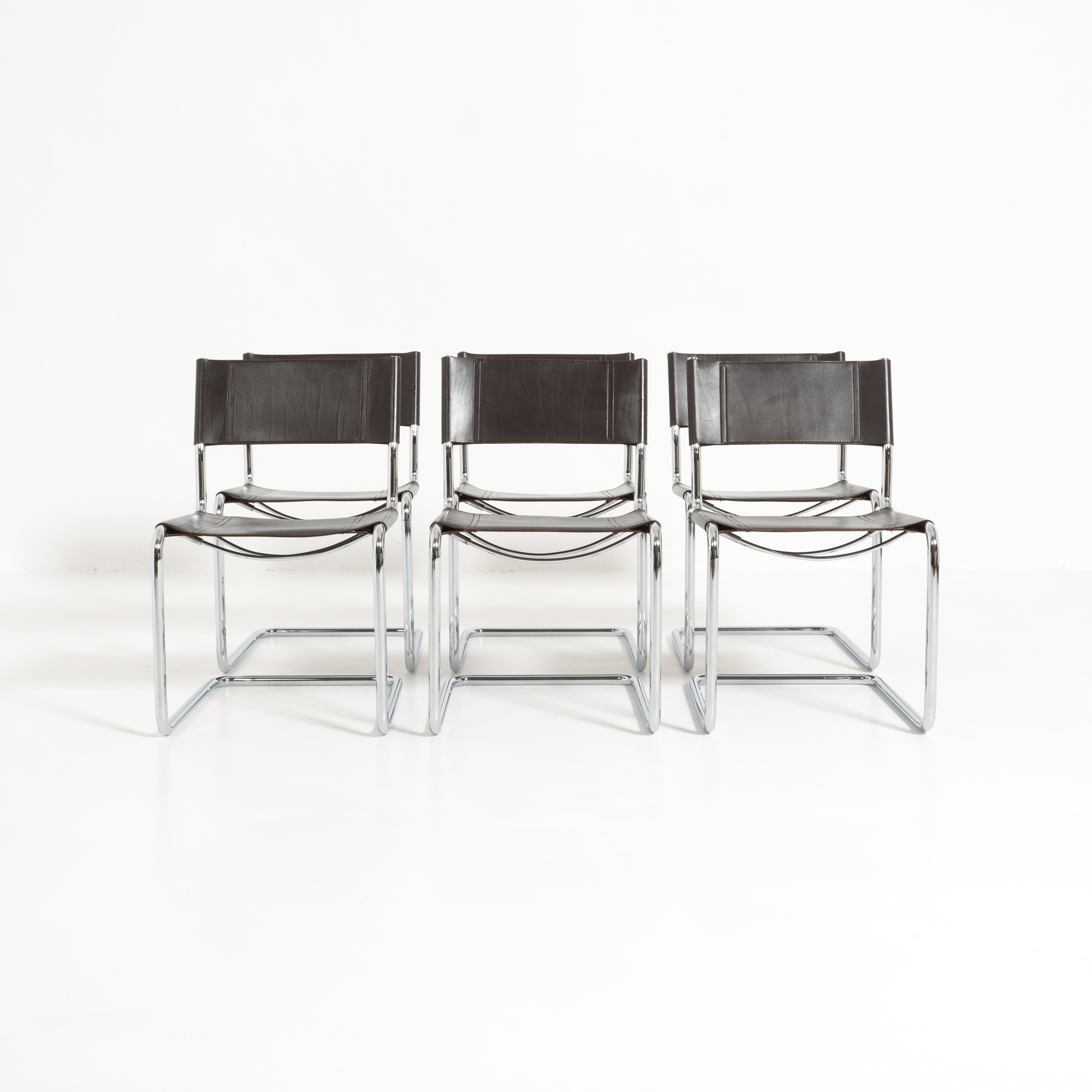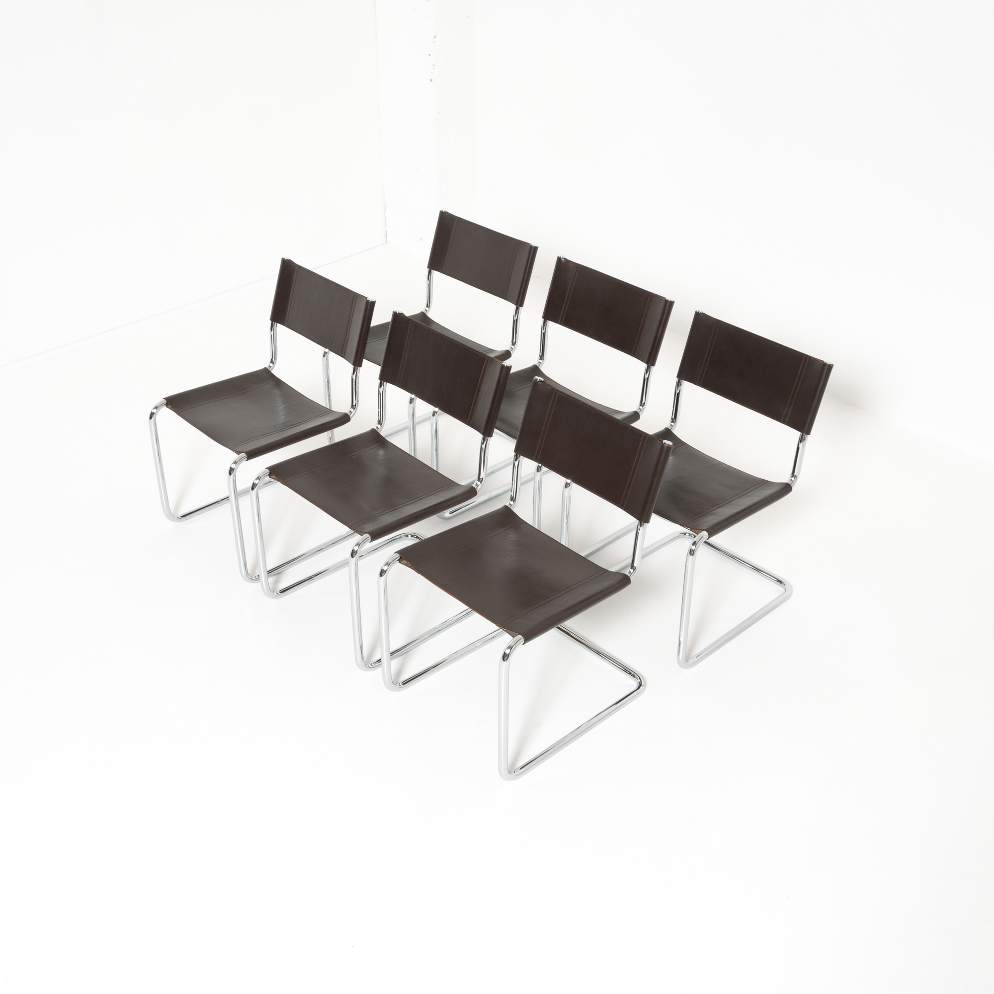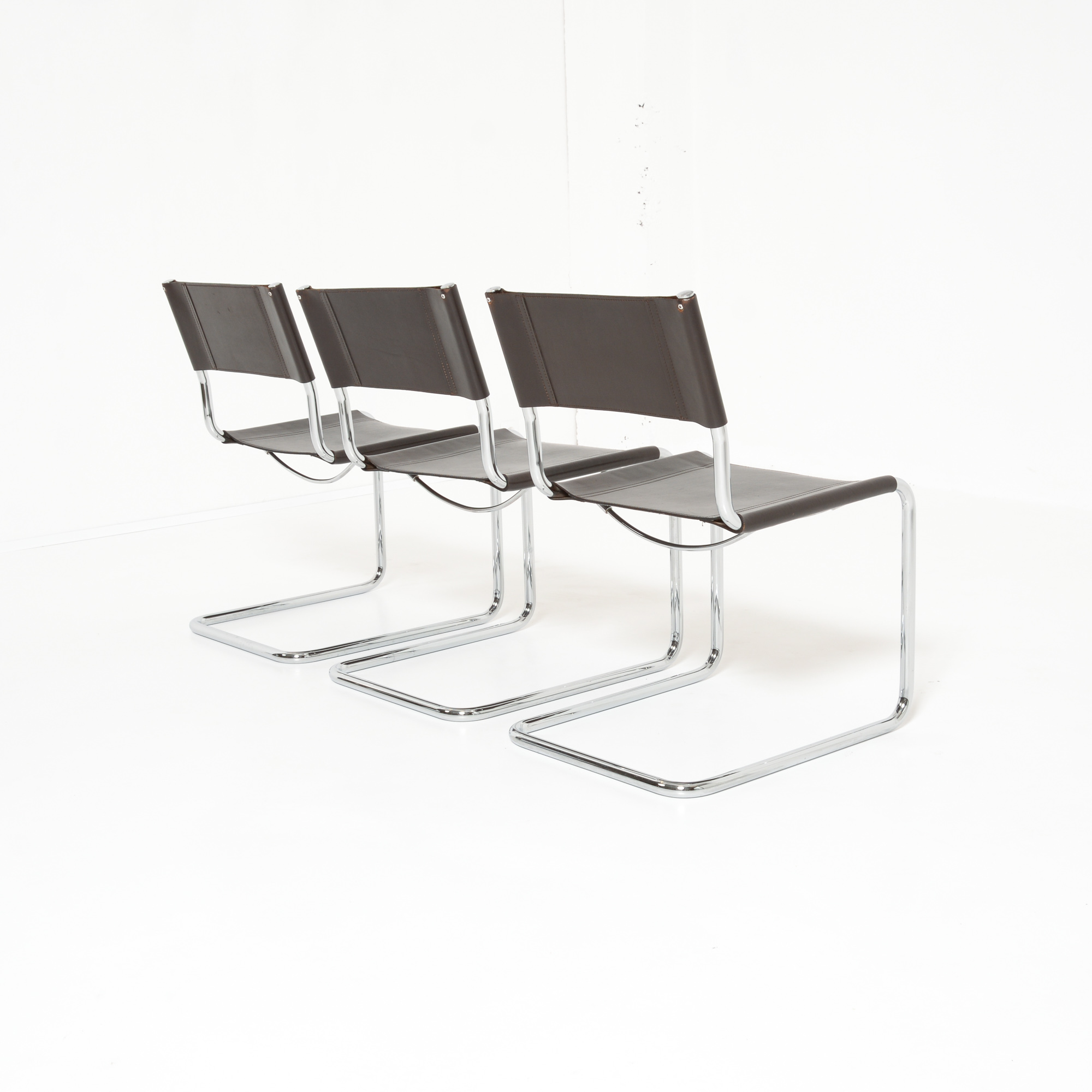 In the 1970s there was a revival of the tubular cantilever chair. These chrome cantilever chairs with dark brown leather seat and back can be dated in this period. They are made of high quality chrome and thick leather.