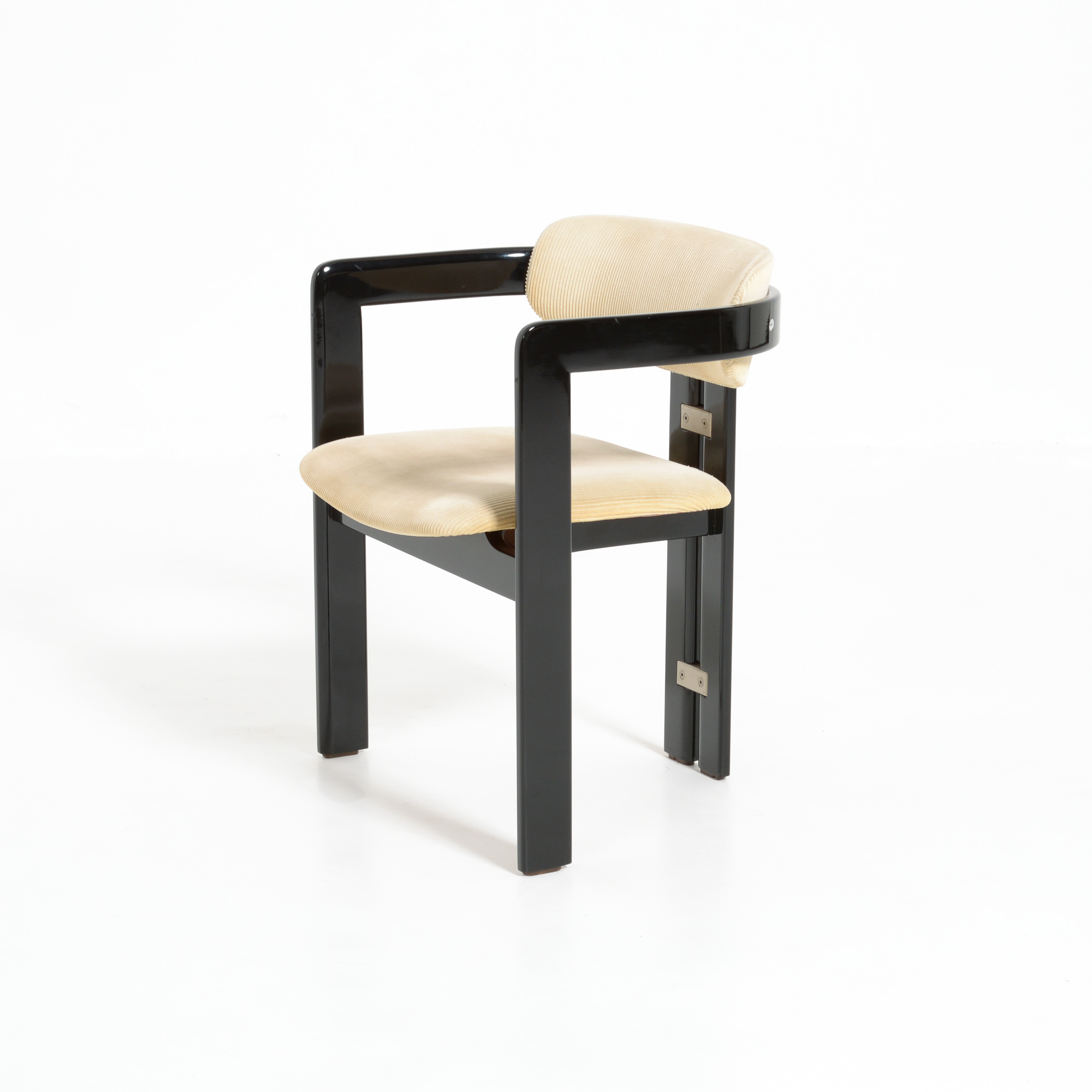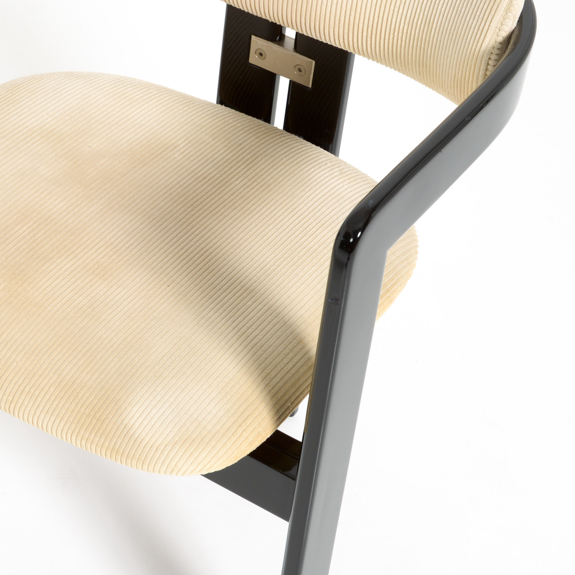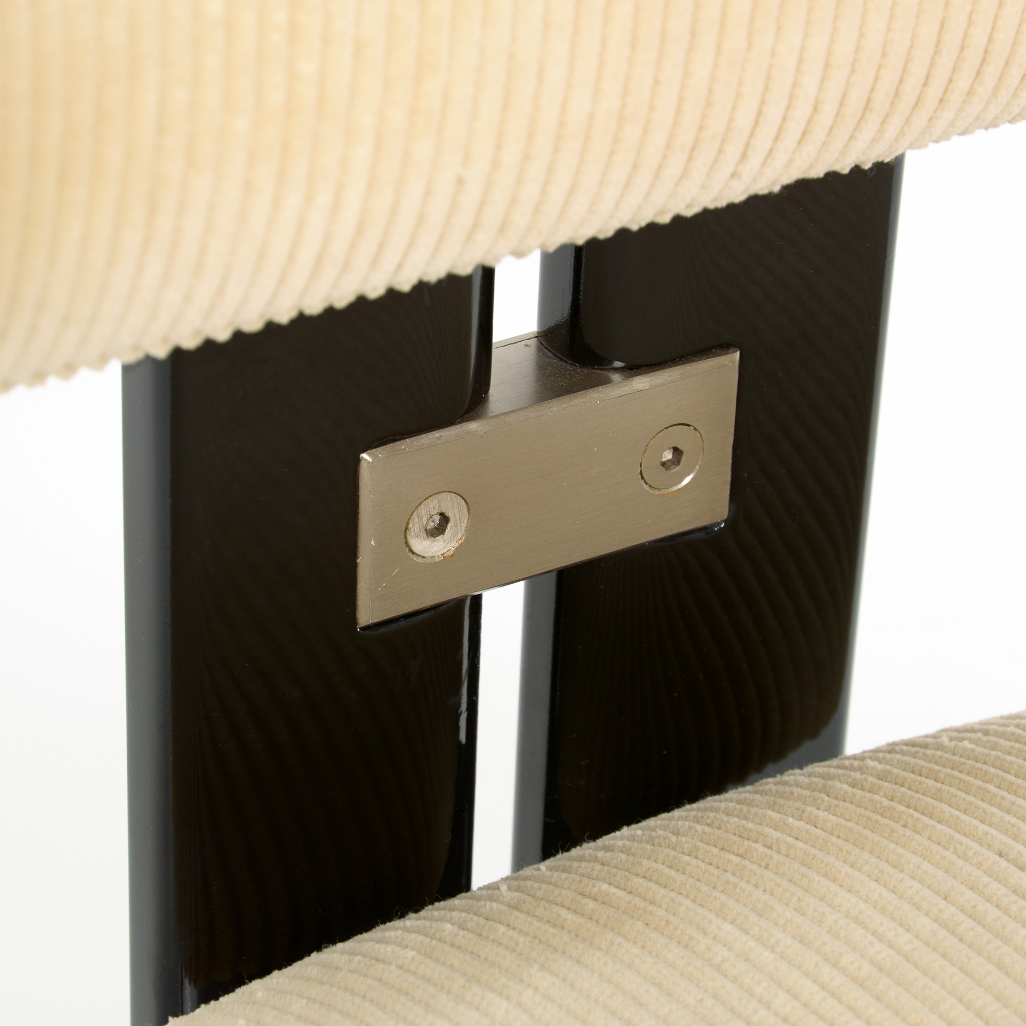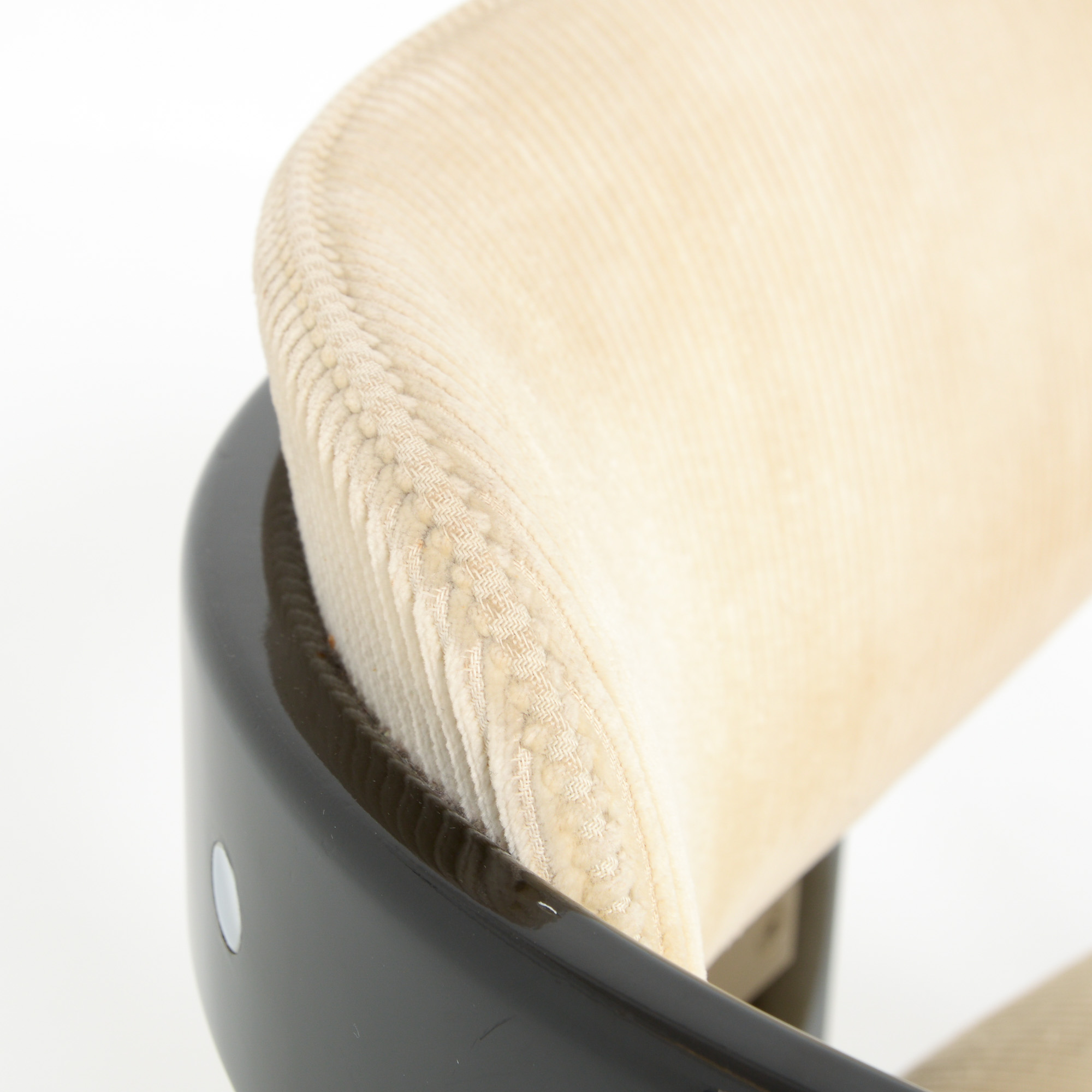 The glossy black lacquered base is finished with aluminum details. The seats in creamy white fabric are still authentic, here and there they have some small stains and there’s some discoloration.