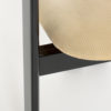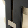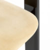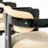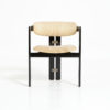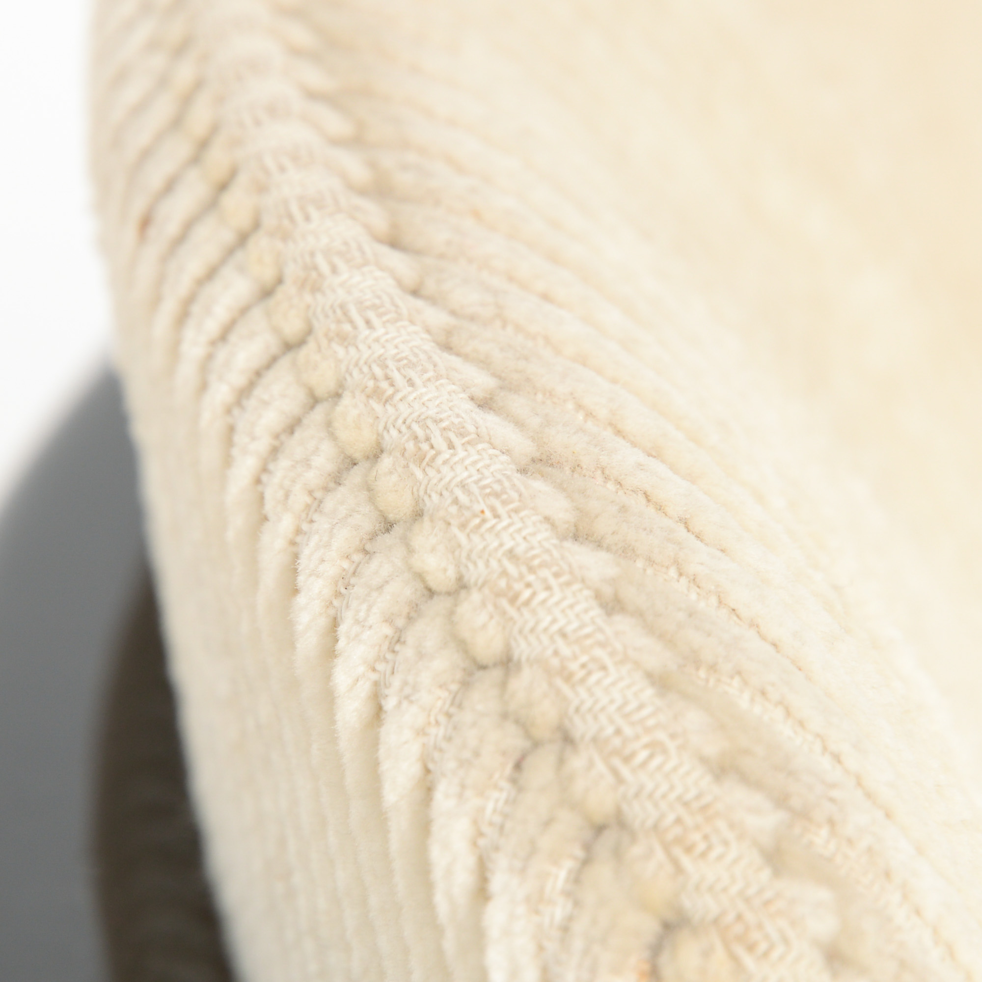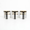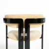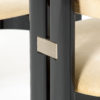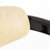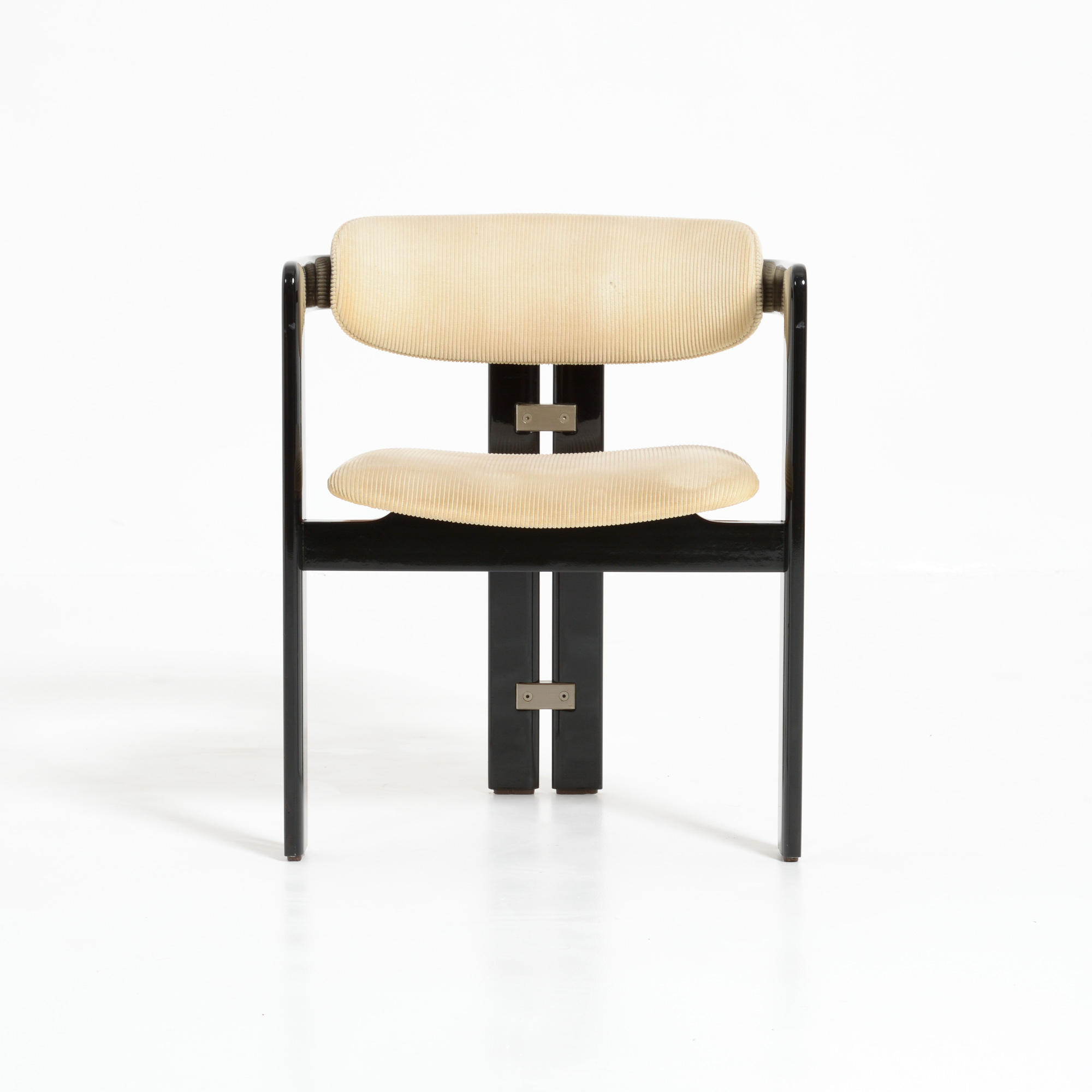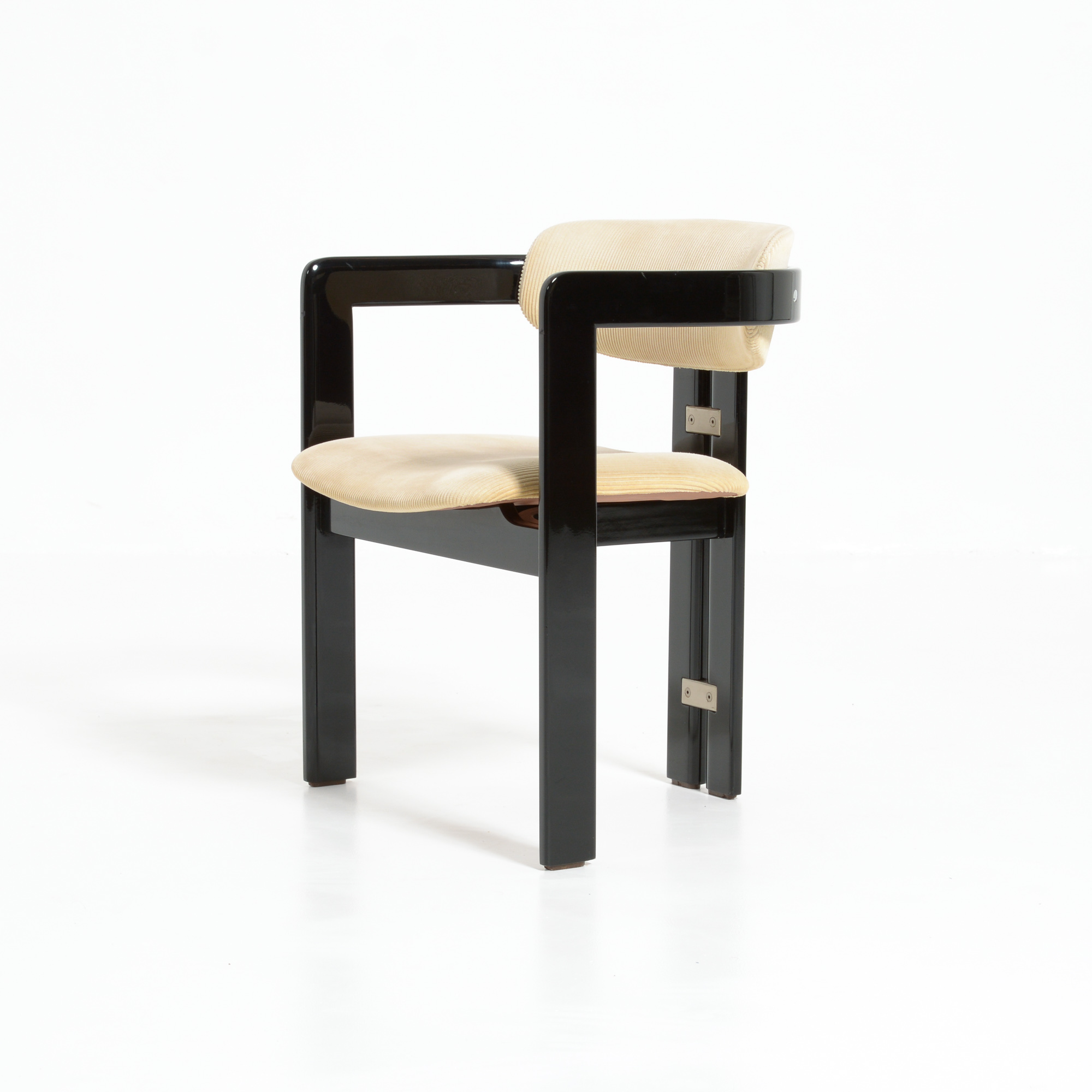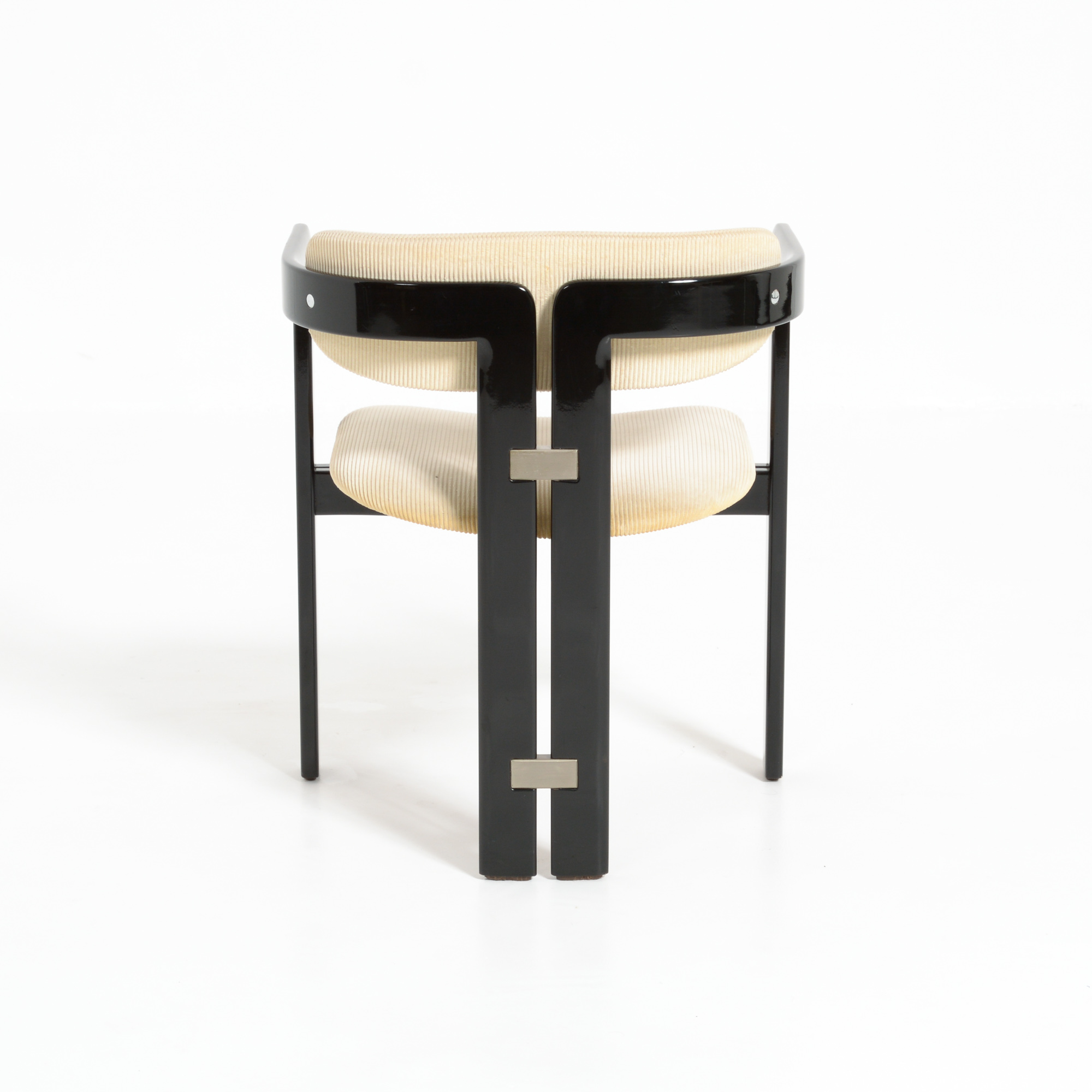 The glossy black lacquered base is finished with aluminum details. The seats in creamy white fabric are still authentic, here and there they have some small stains and there’s some discoloration.