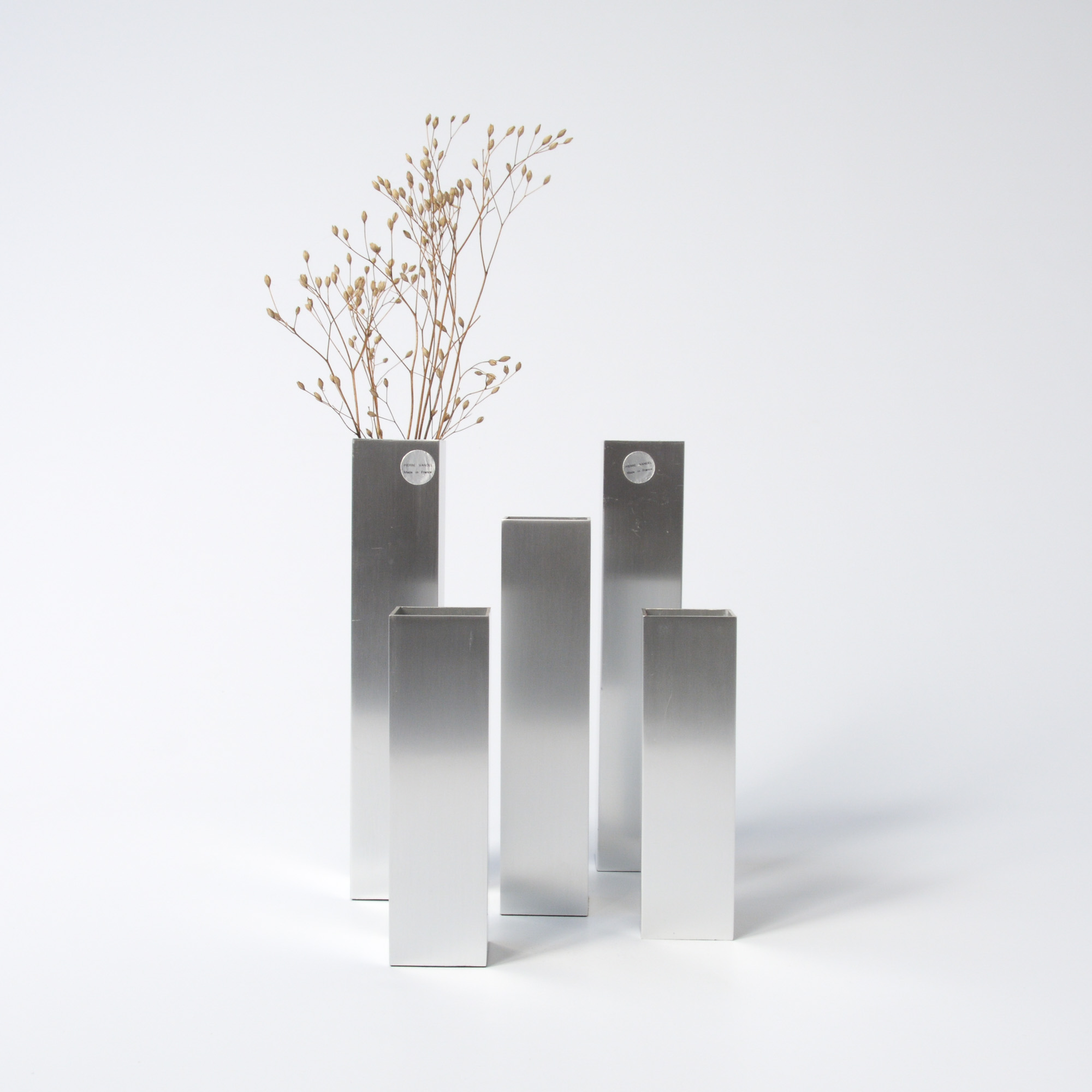 They are made of brushed aluminum. The vases are in good vintage condition.